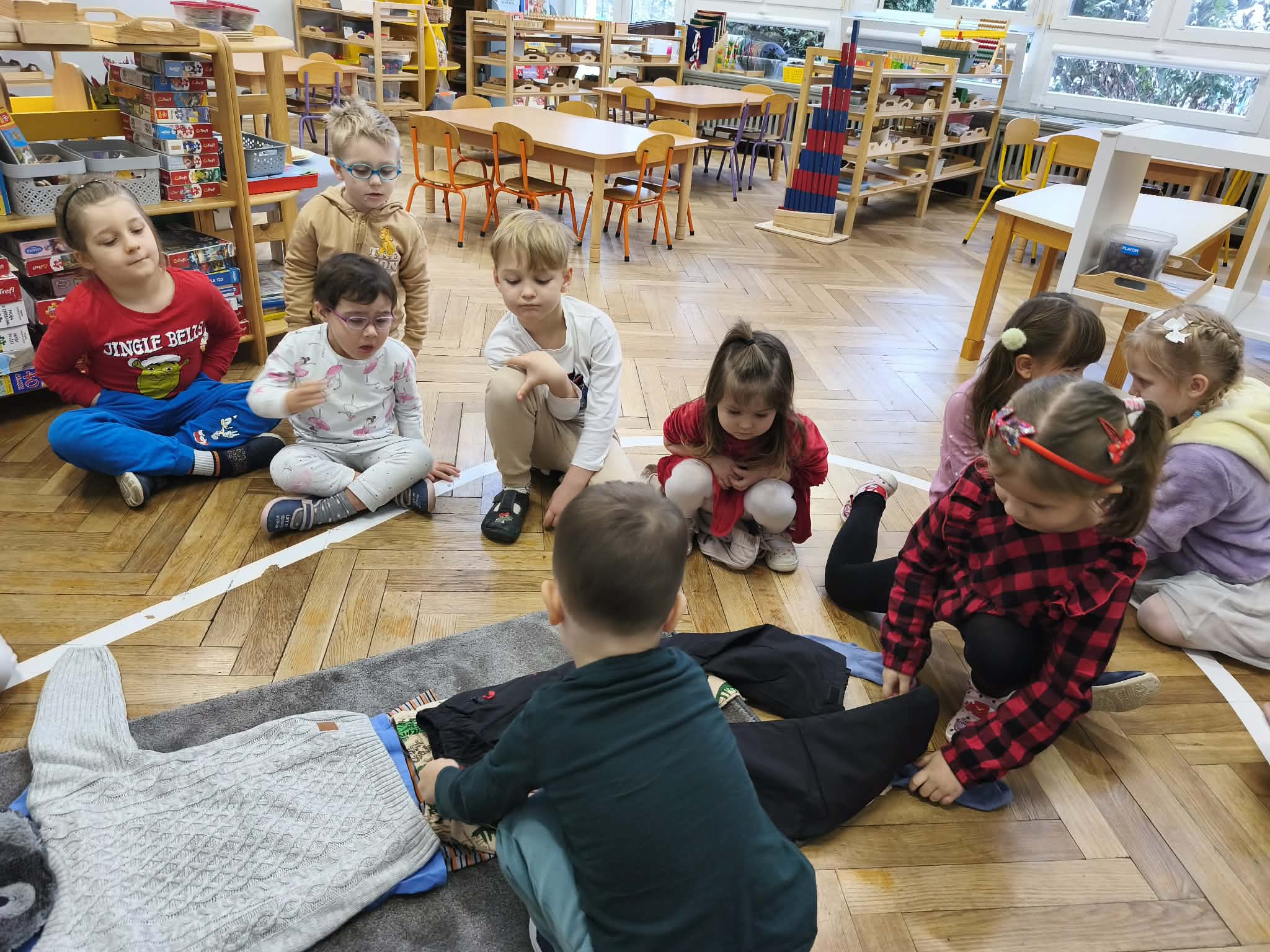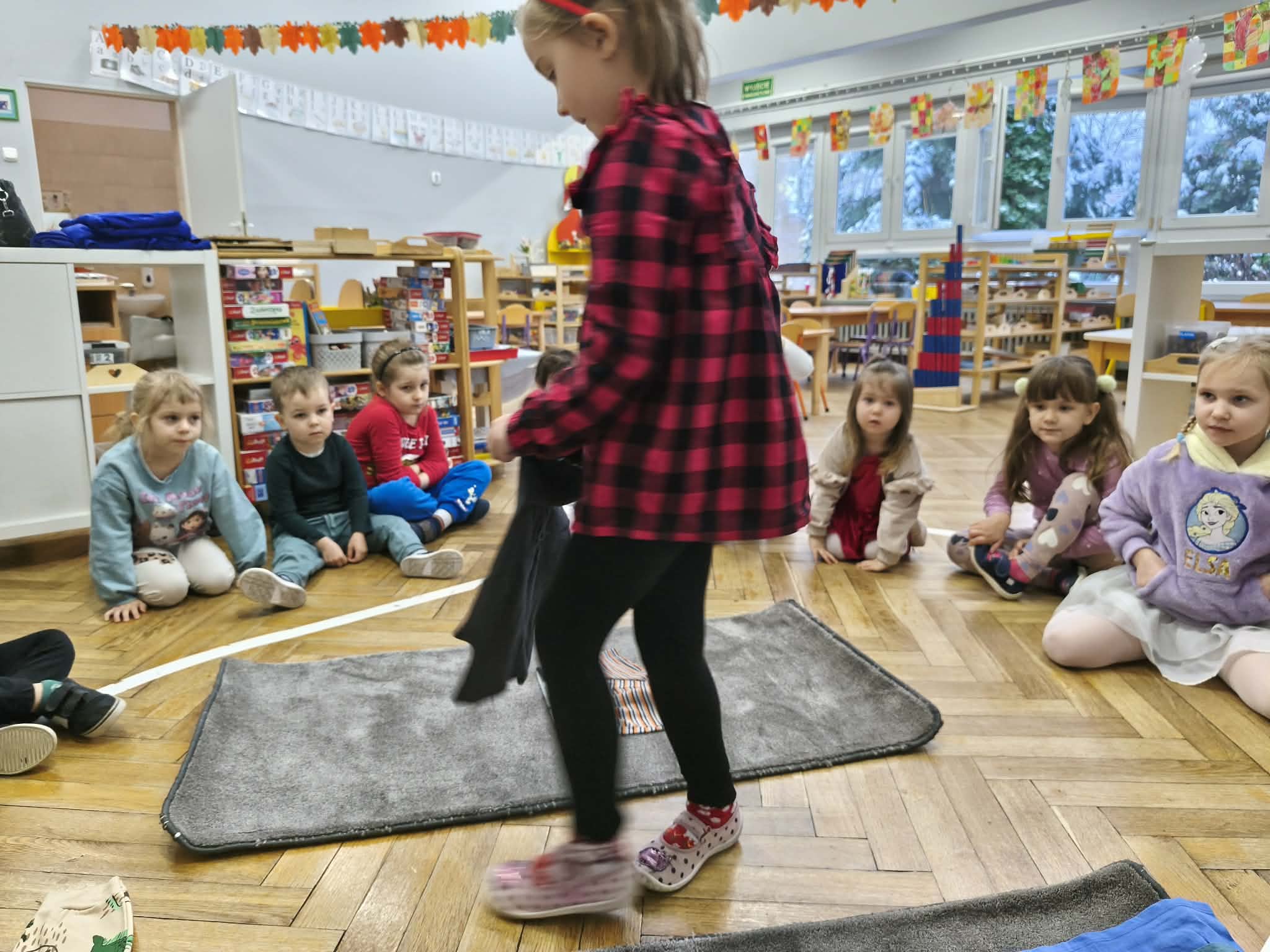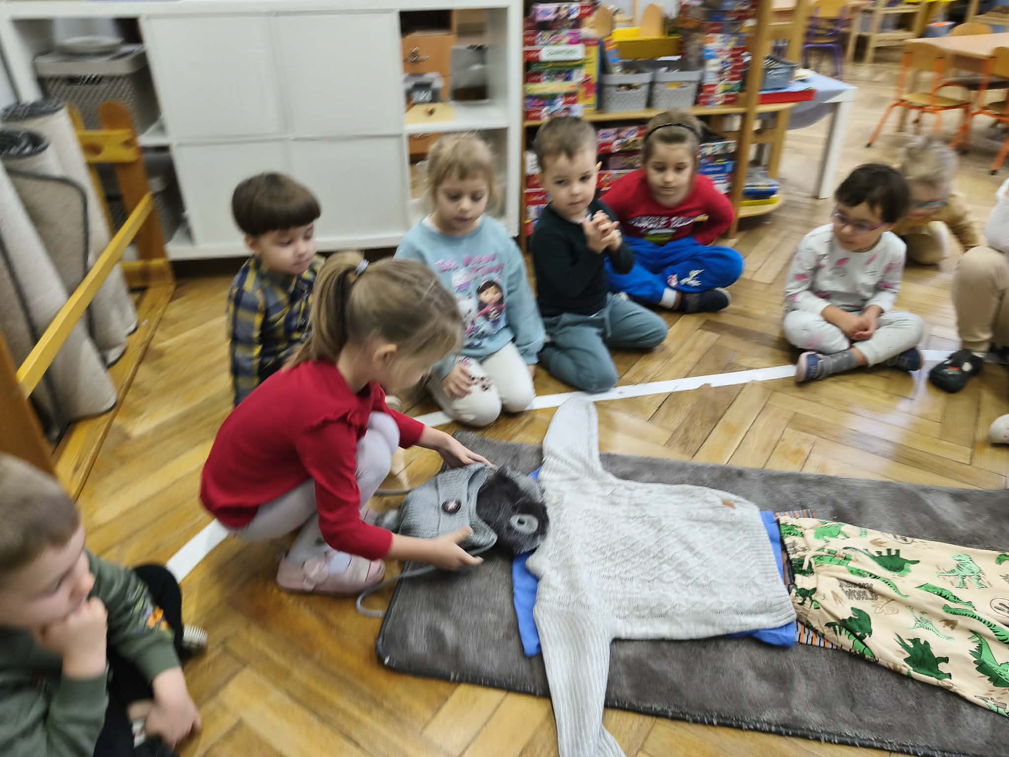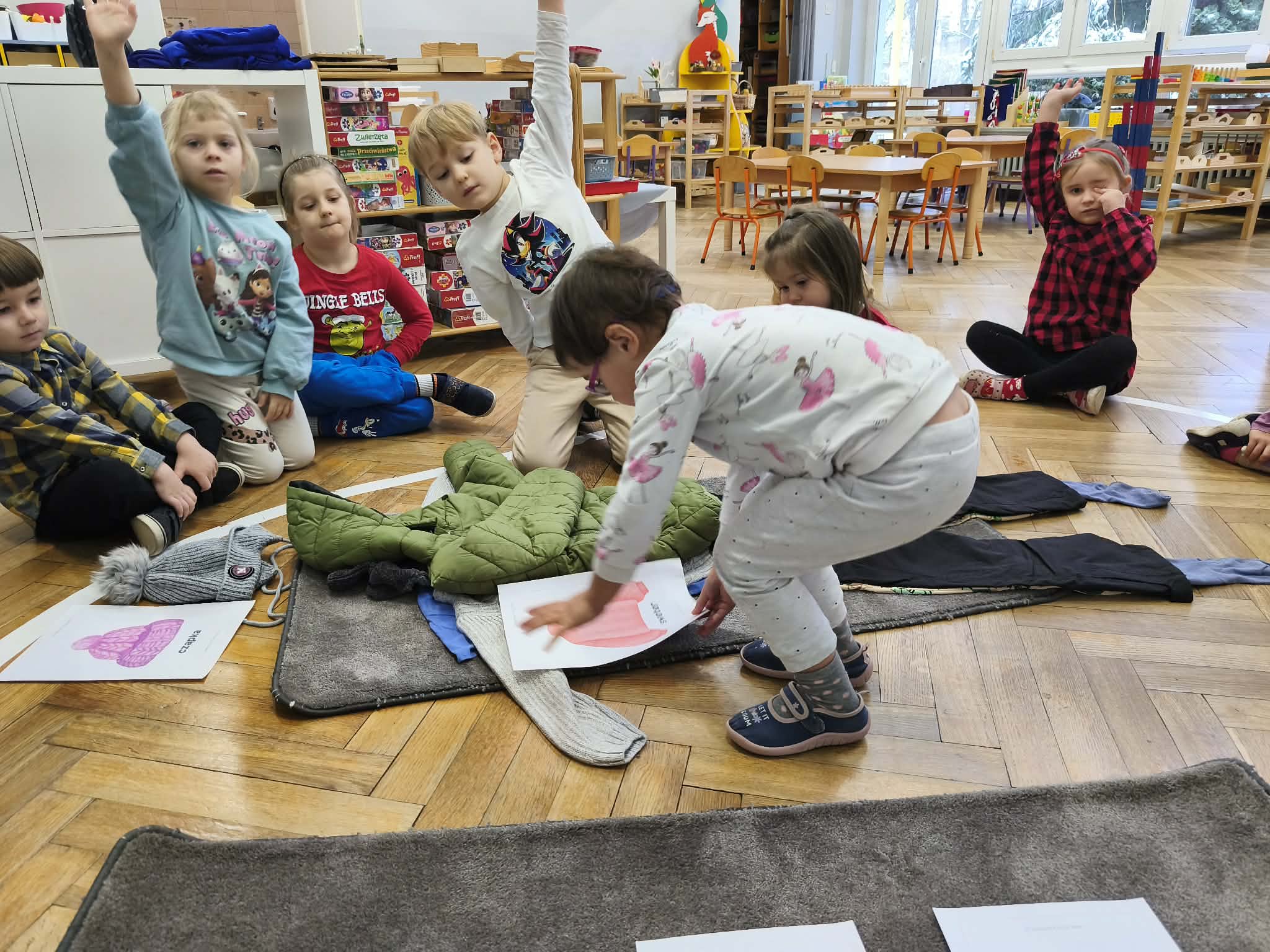 W piątek udało nam się ubrać naszego niewidzialnego gościa - Tadka. Nazywaliśmy poszczególne części garderoby, ćwiczyliśmy przy tym podział wyrazów na sylaby i głoski.
