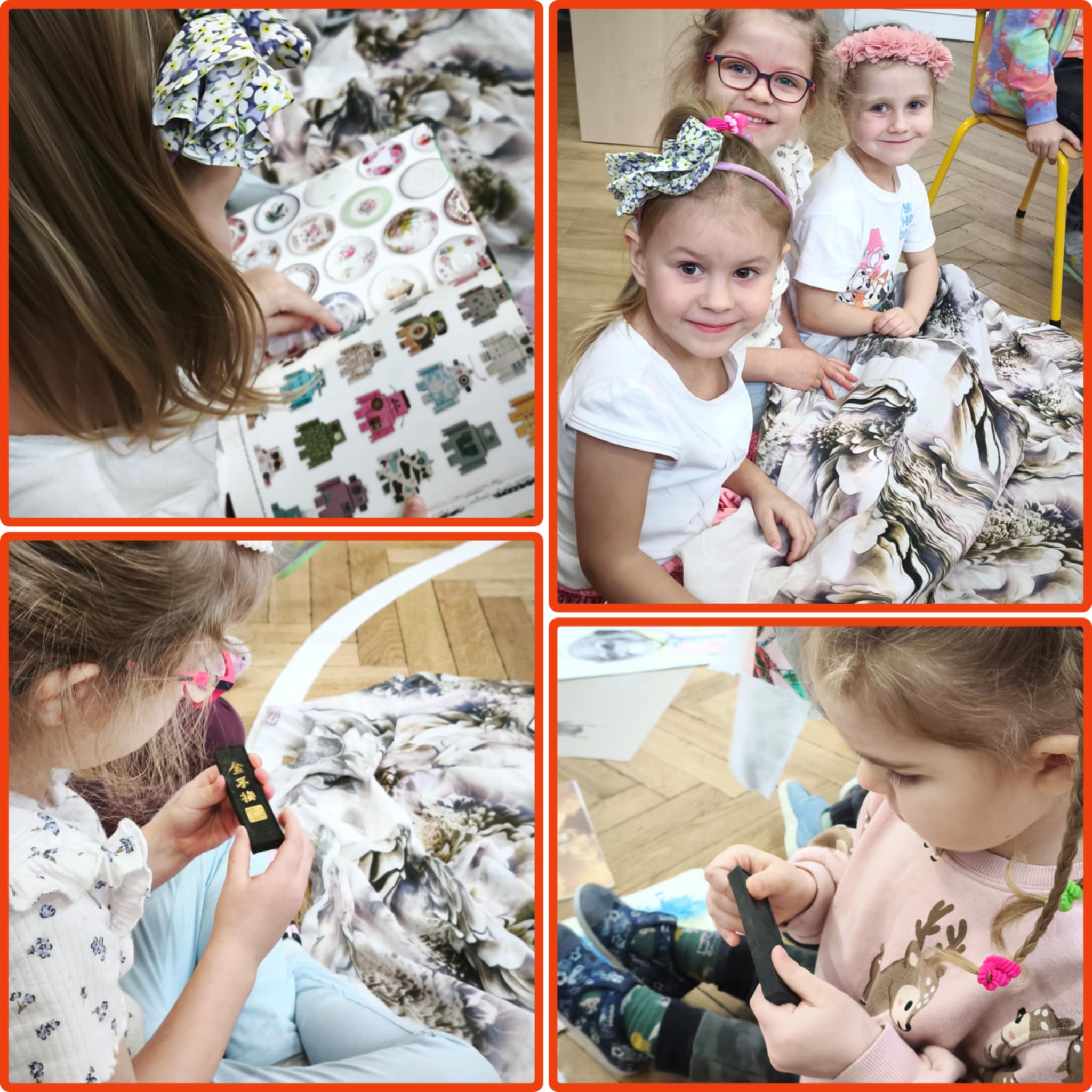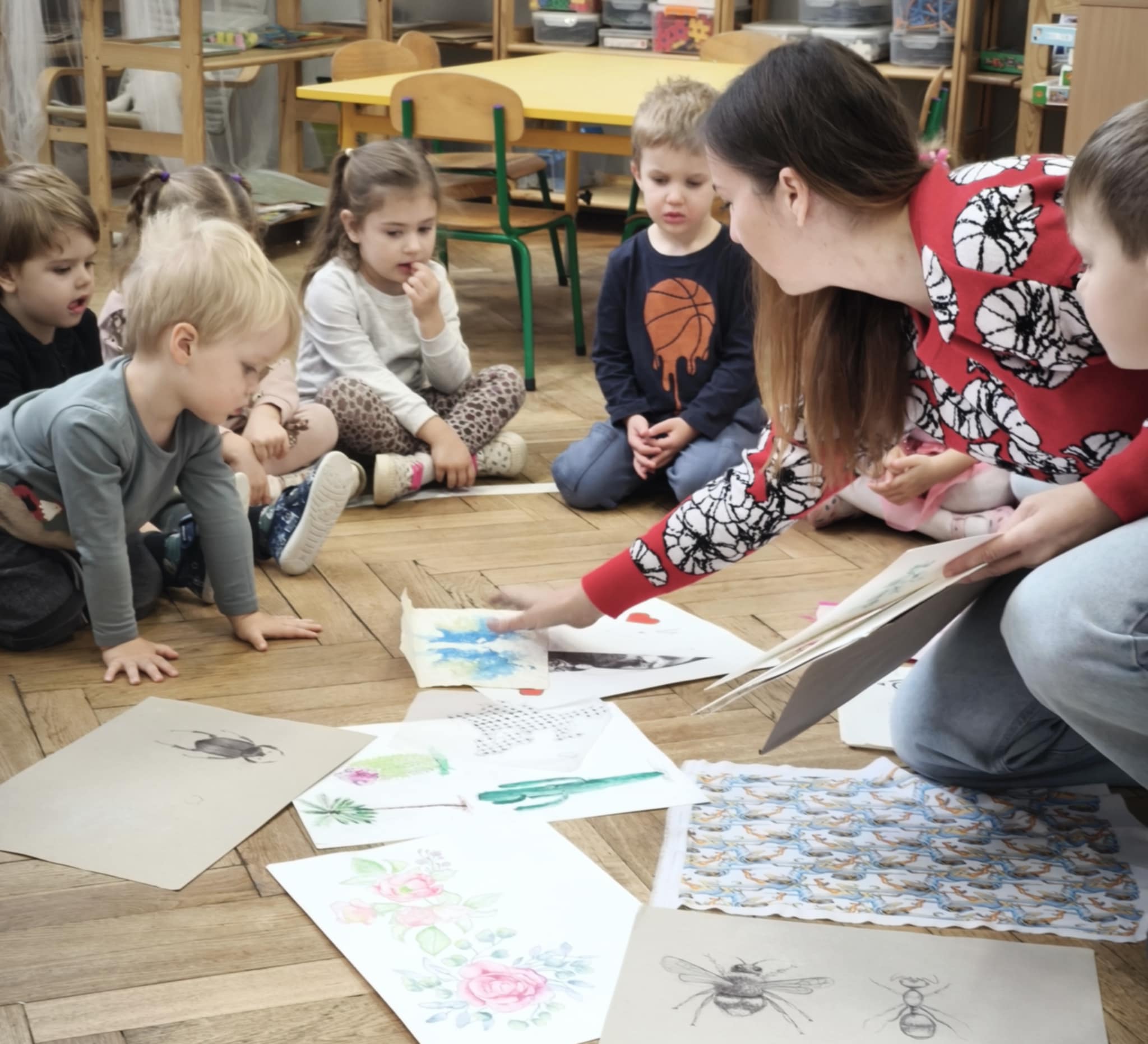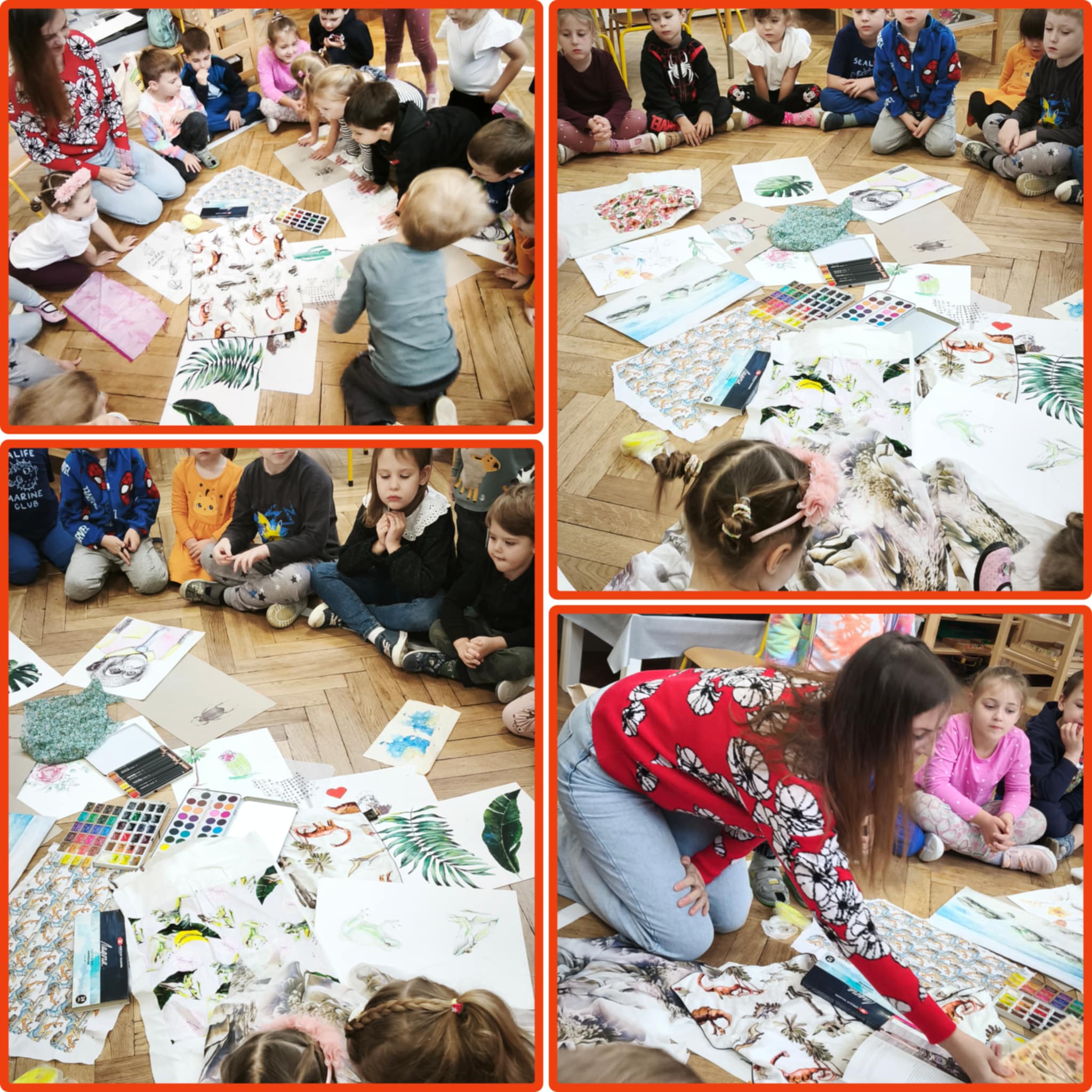 W piątek dzieci poznały kolejny ciekawy zawód - projektantka wzorów. Okazało się, że mama Aleksa projektuje oryginalne, pełne pasji wzory na tkaniny, które mogą zdobić np ubrania, poduszki, firany, obicia mebli. Dzieci oglądały tkaniny wykonane przez mamę, jej rysunki i szkice. Dowiedziały się jak projektuje się te wzory wykorzystując do tego technologie komputerową. Z ochotą wykonały obrazki przedstawiające: kwiaty (dziewczynki), roboty (chłopcy) wykorzystując do tego farby i specjalne kredki. Nasze dzieła zabrała mama Aleksa aby przygotować z nich dla nas jakąś niespodziankę...już nie możemy się doczekać.