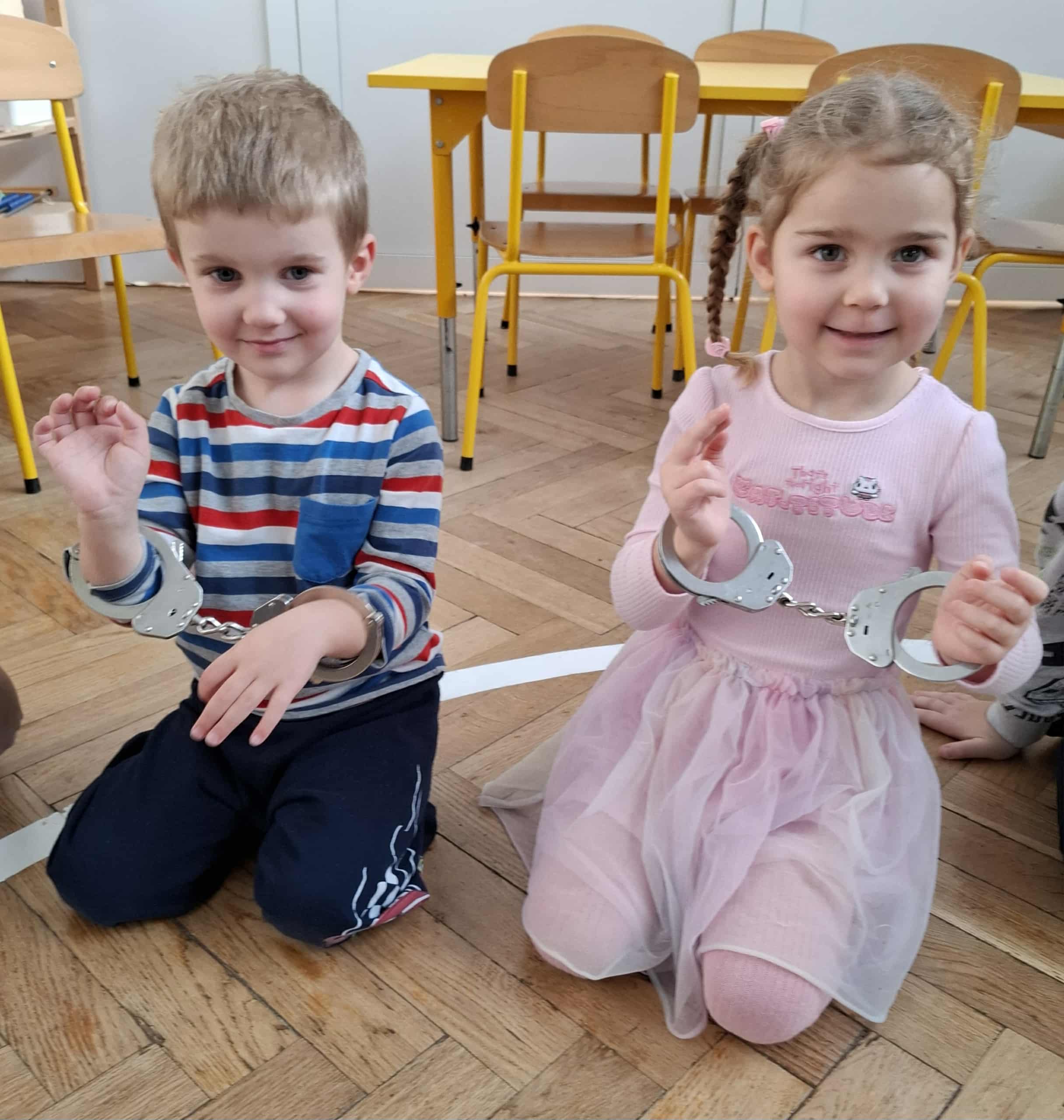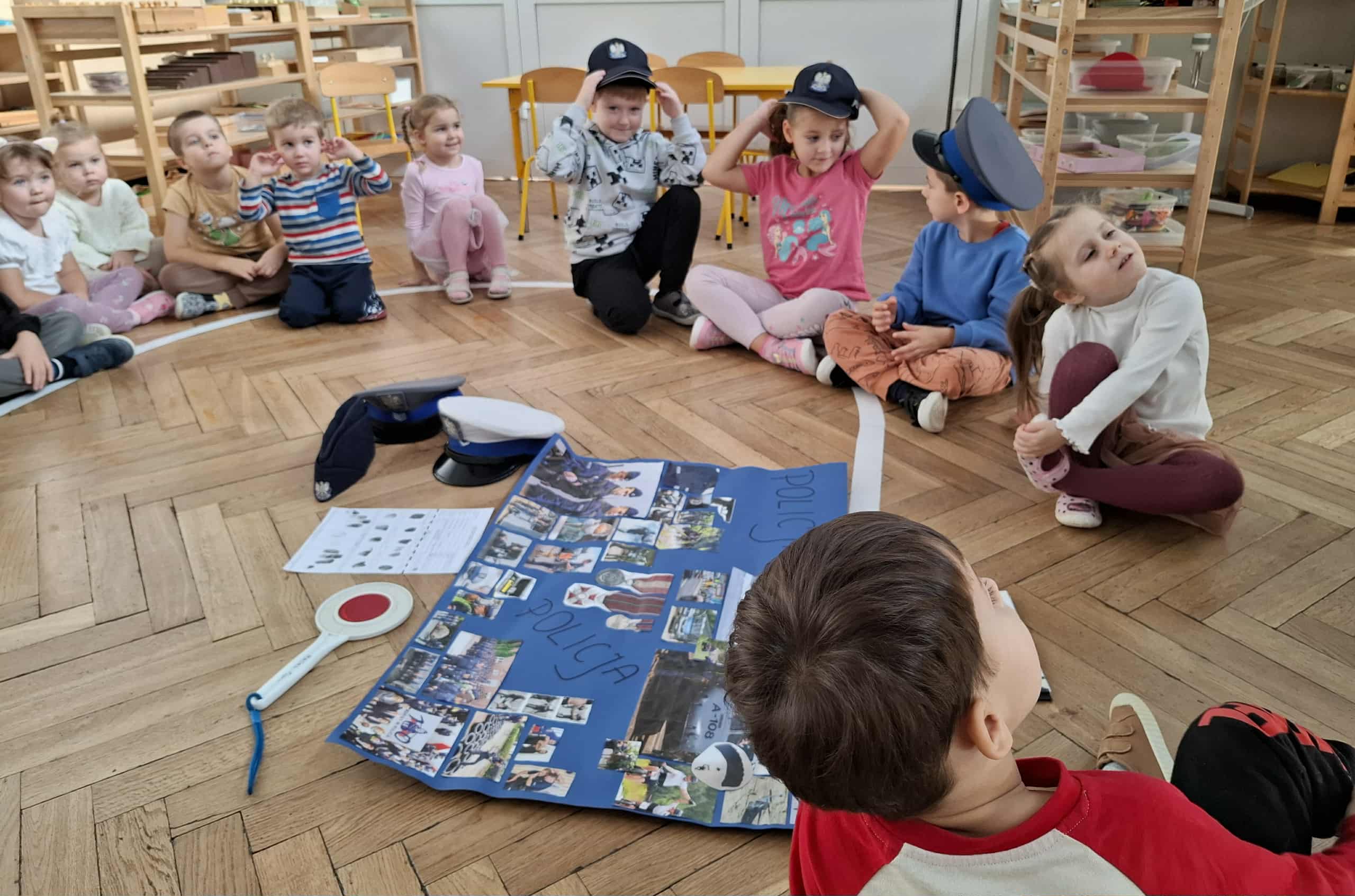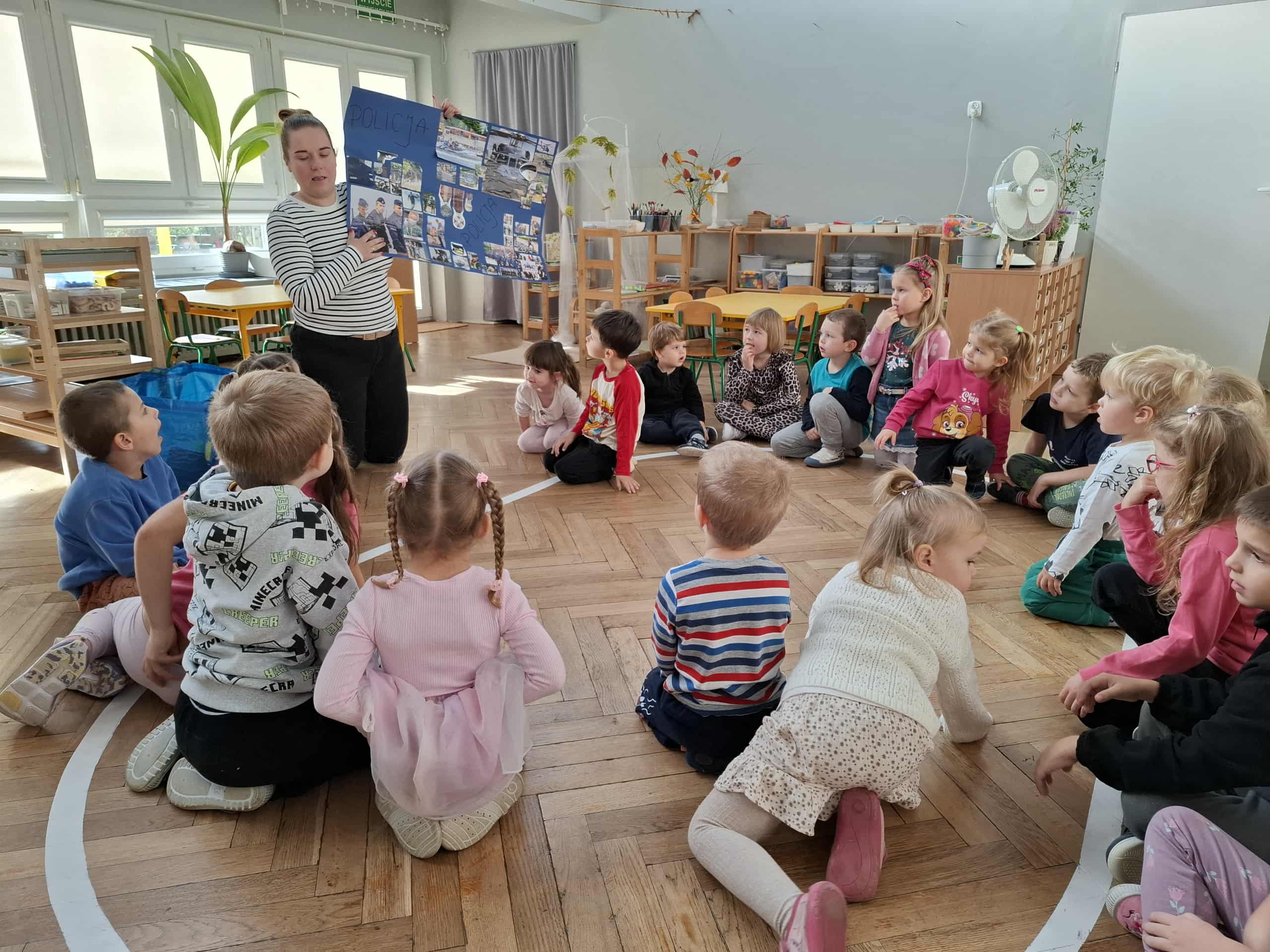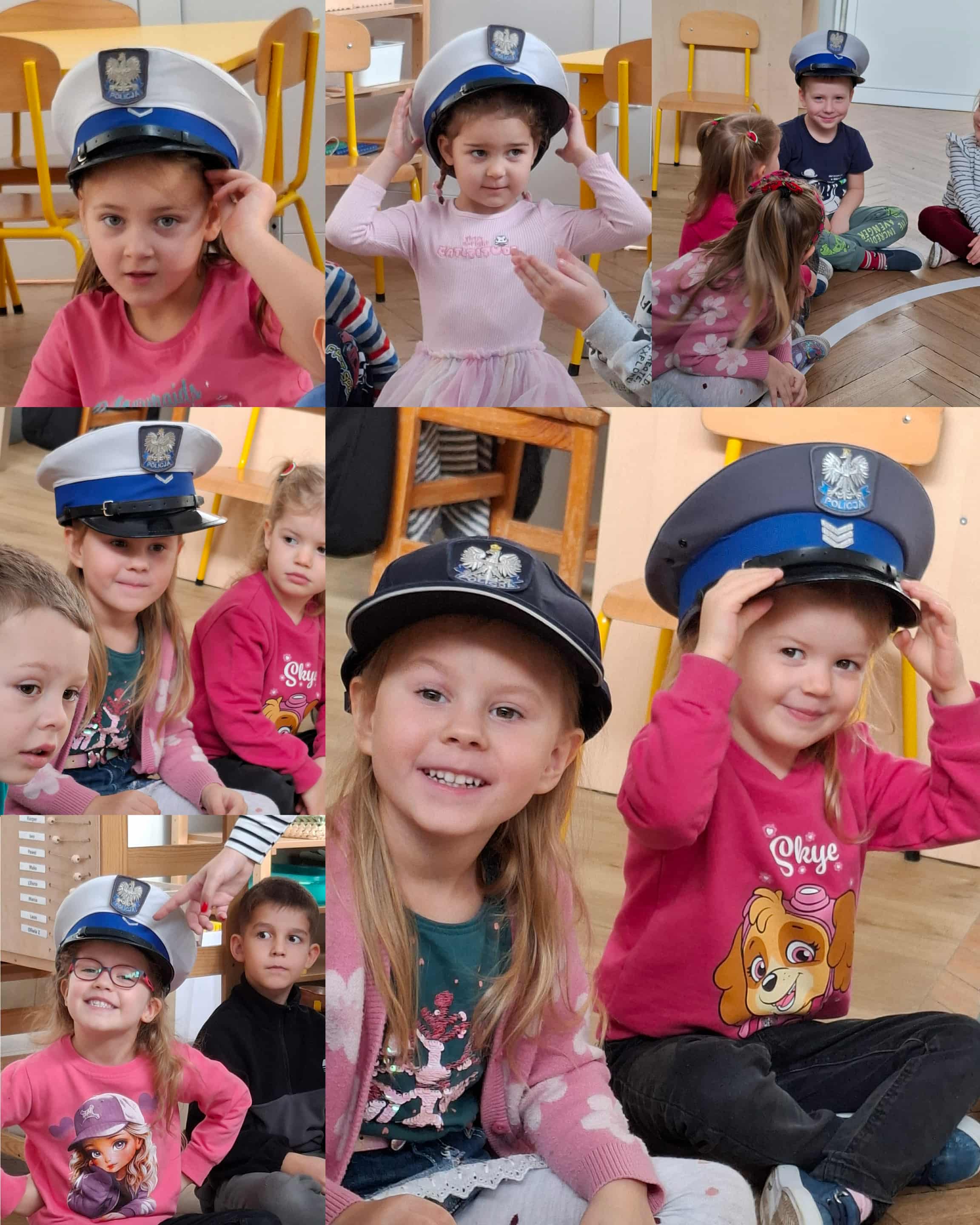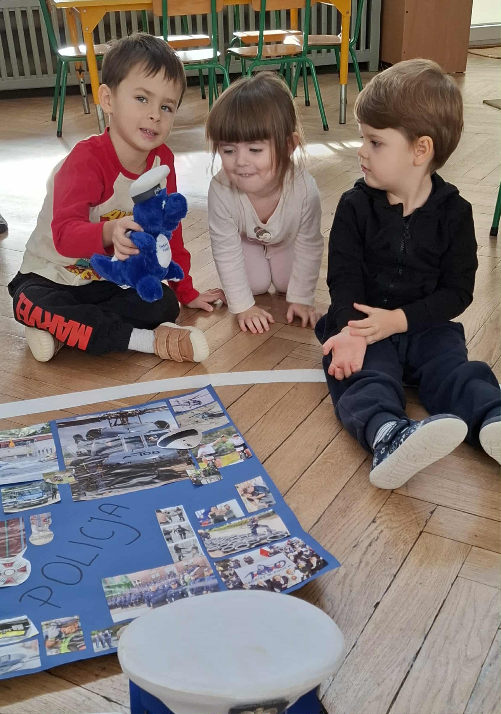 Dzięki mamie Janka mieliśmy okazję poznać zawód policjantki/ta. Specjalnie na spotkanie Mama przygotowała z Jankiem plakat, przyniosła policyjne atrybuty min: czapki, „lizaka” do zatrzymywania pojazdów, kajdanki oraz kaburę na broń. Dzieci były niezwykle zaciekawione – chętnie oglądały przyniesione przedmioty, przymierzały policyjne "gadżety", wykonały komendy "baczność, spocznij" i z uwagą słuchały opowieści o codziennej pracy funkcjonariusza.