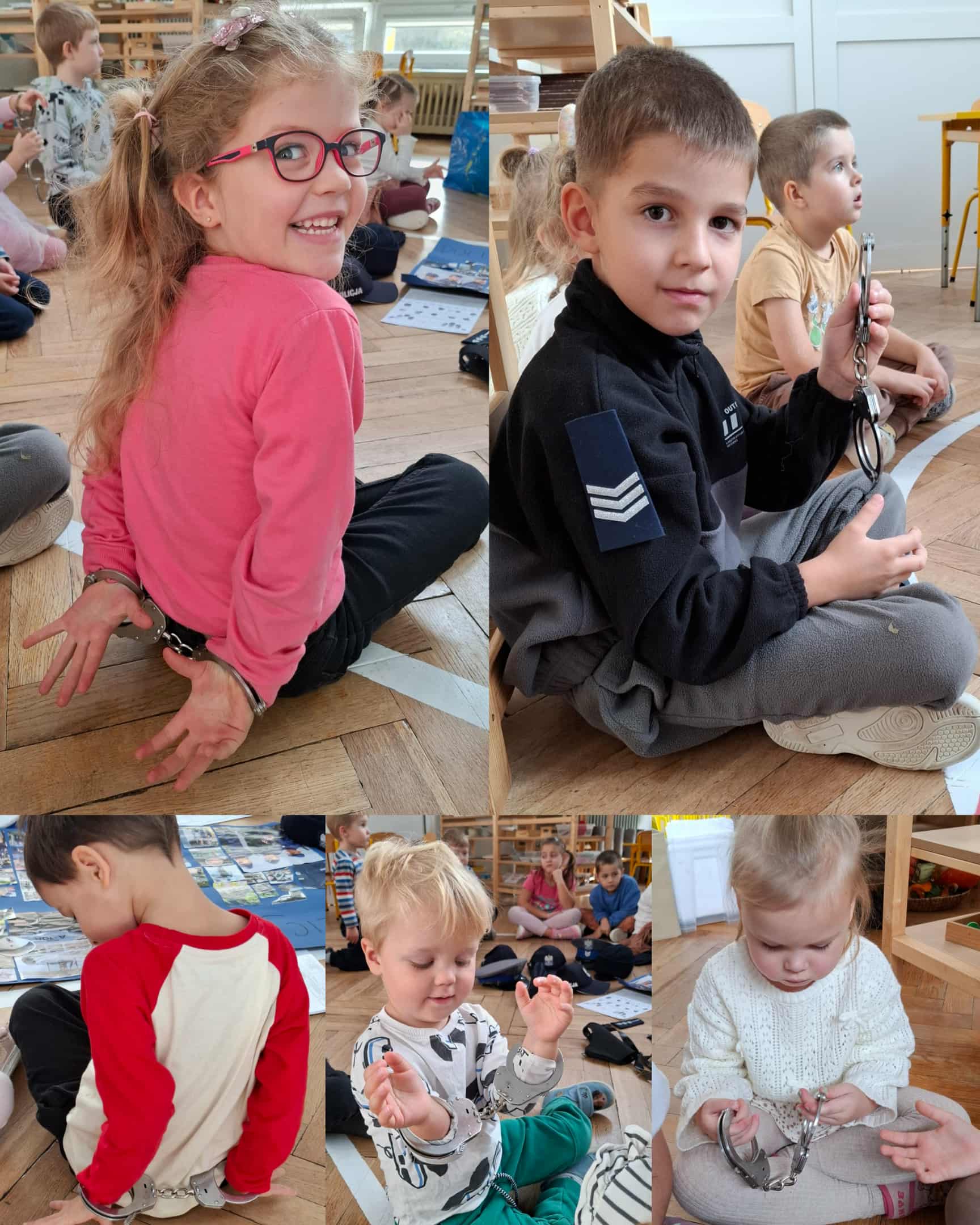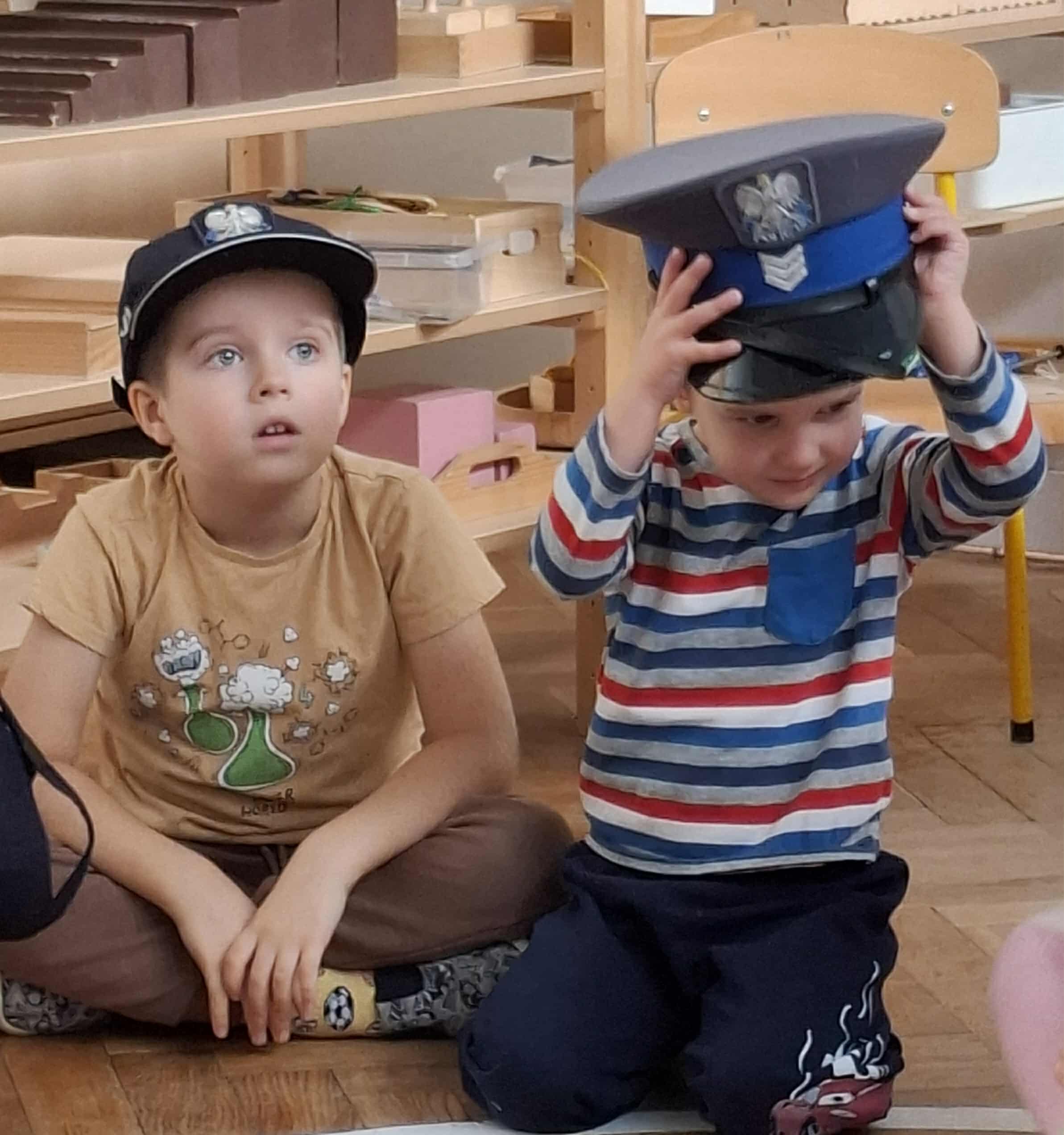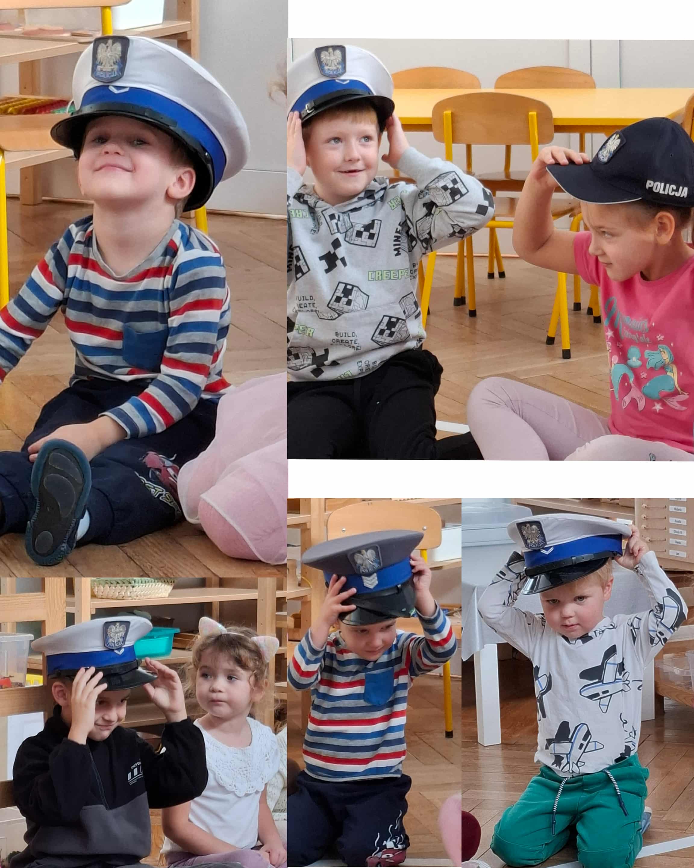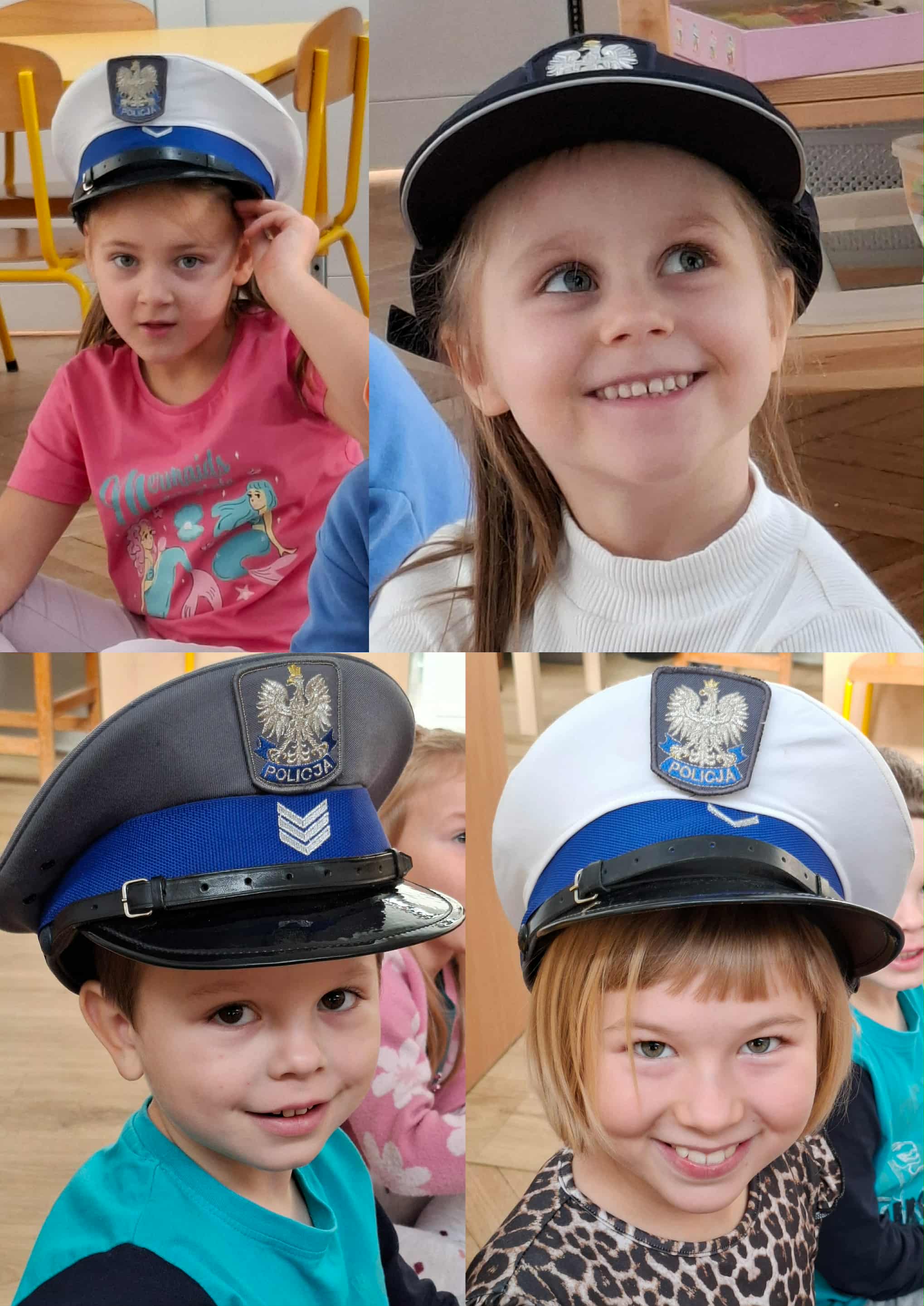 Dzięki mamie Janka mieliśmy okazję poznać zawód policjantki/ta. Specjalnie na spotkanie Mama przygotowała z Jankiem plakat, przyniosła policyjne atrybuty min: czapki, „lizaka” do zatrzymywania pojazdów, kajdanki oraz kaburę na broń. Dzieci były niezwykle zaciekawione – chętnie oglądały przyniesione przedmioty, przymierzały policyjne "gadżety", wykonały komendy "baczność, spocznij" i z uwagą słuchały opowieści o codziennej pracy funkcjonariusza.