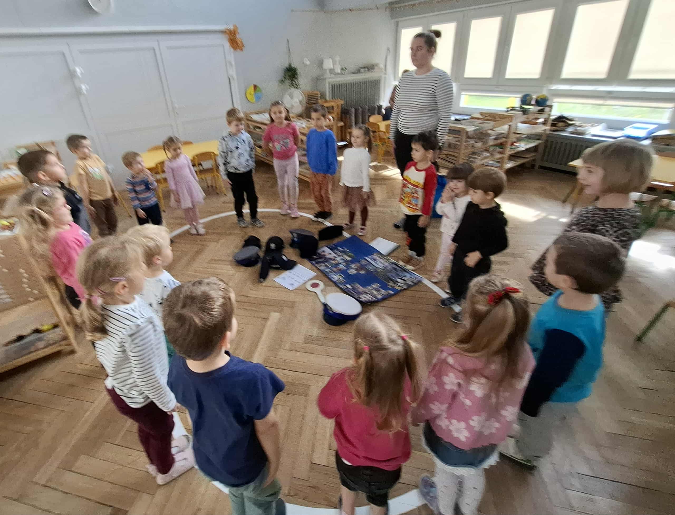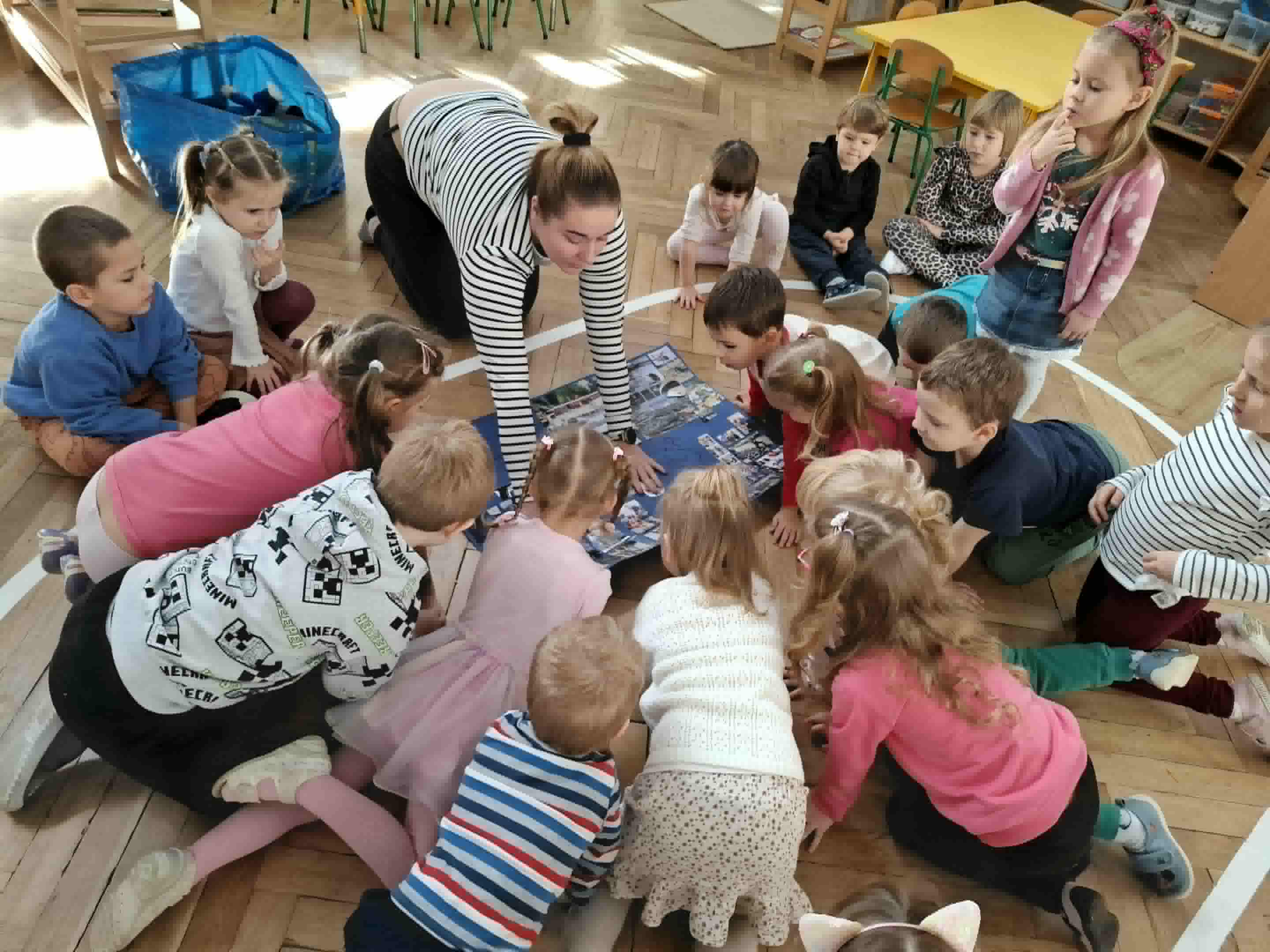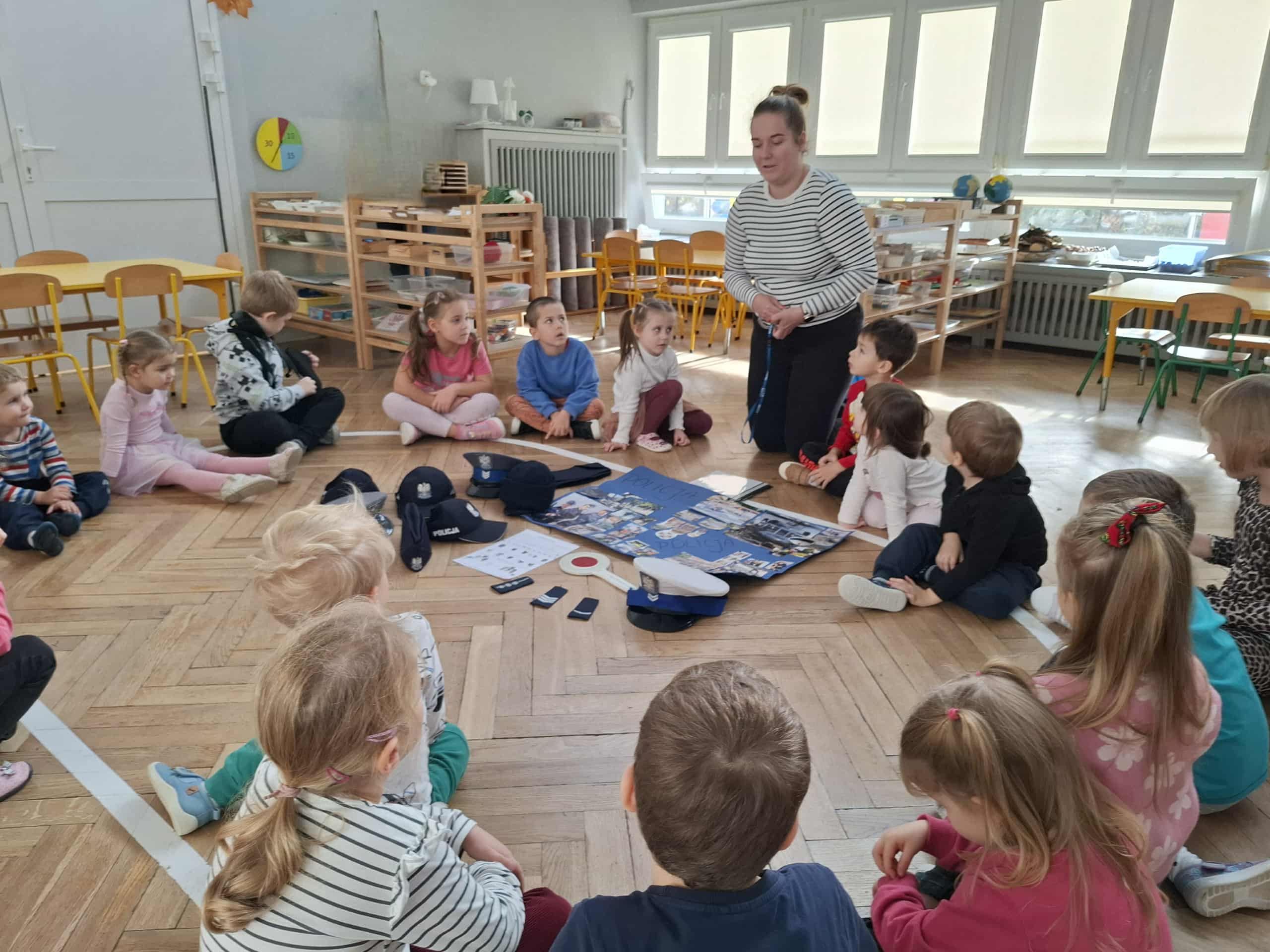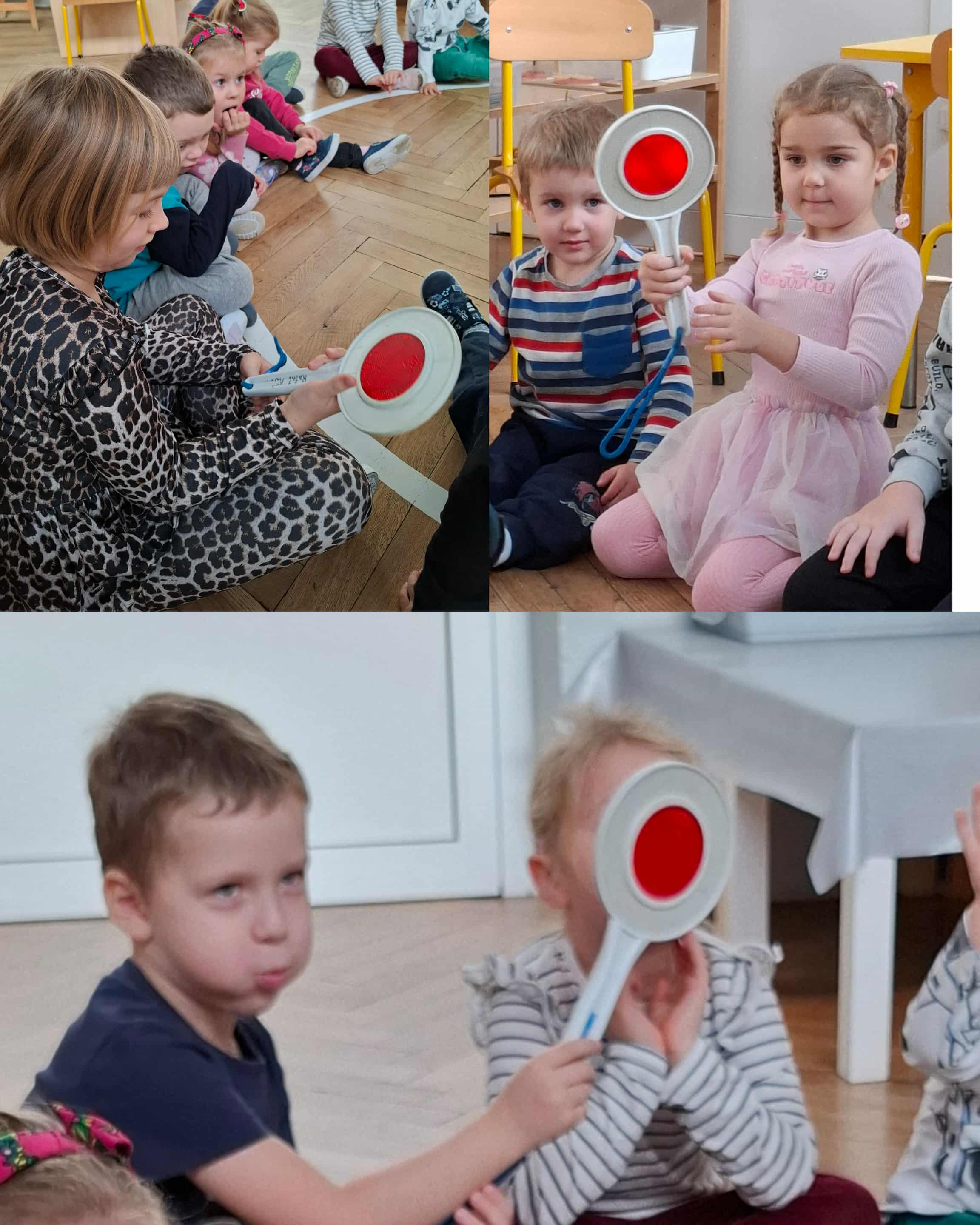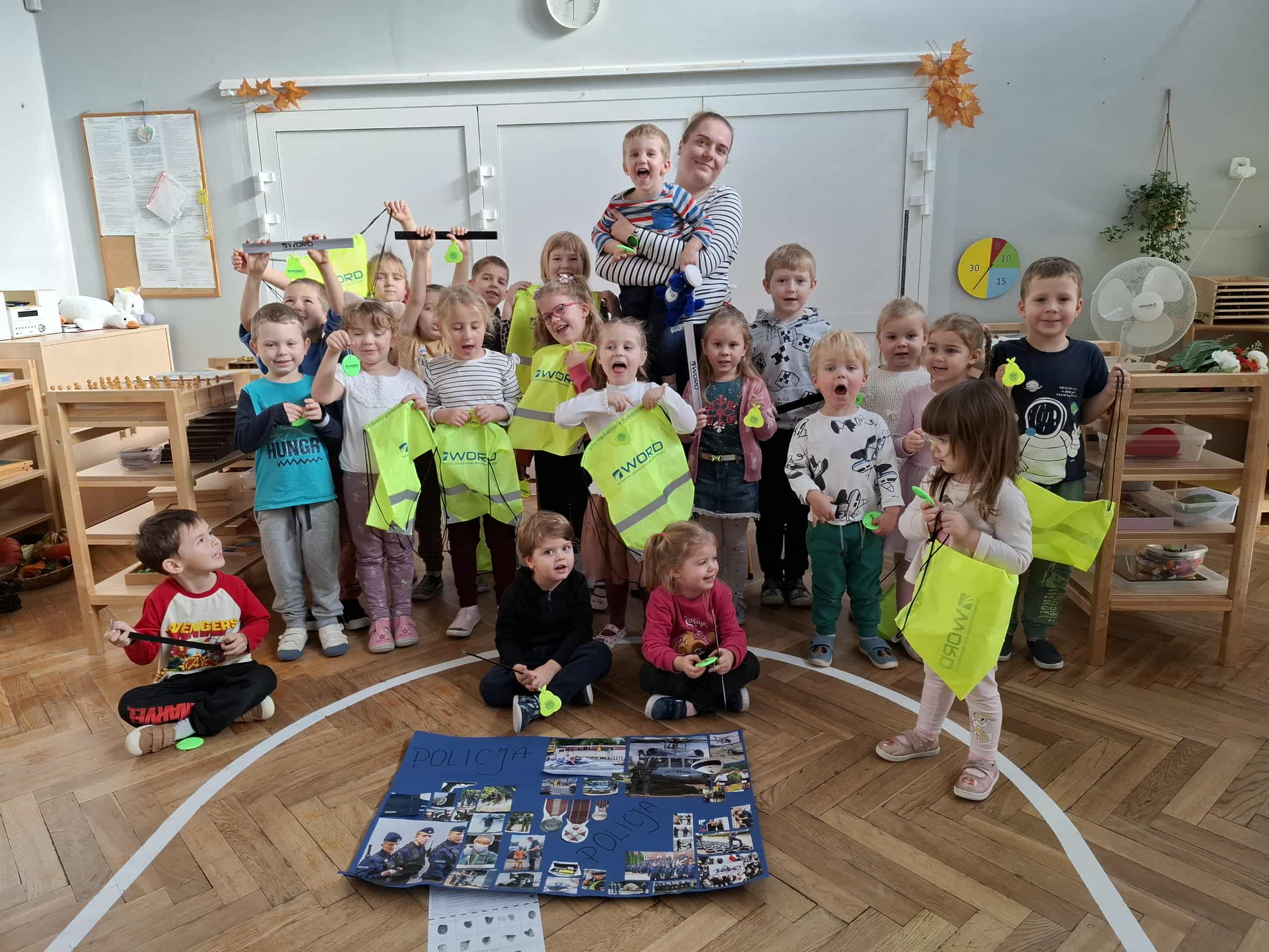 Dzięki mamie Janka mieliśmy okazję poznać zawód policjantki/ta. Specjalnie na spotkanie Mama przygotowała z Jankiem plakat, przyniosła policyjne atrybuty min: czapki, „lizaka” do zatrzymywania pojazdów, kajdanki oraz kaburę na broń. Dzieci były niezwykle zaciekawione – chętnie oglądały przyniesione przedmioty, przymierzały policyjne "gadżety", wykonały komendy "baczność, spocznij" i z uwagą słuchały opowieści o codziennej pracy funkcjonariusza.