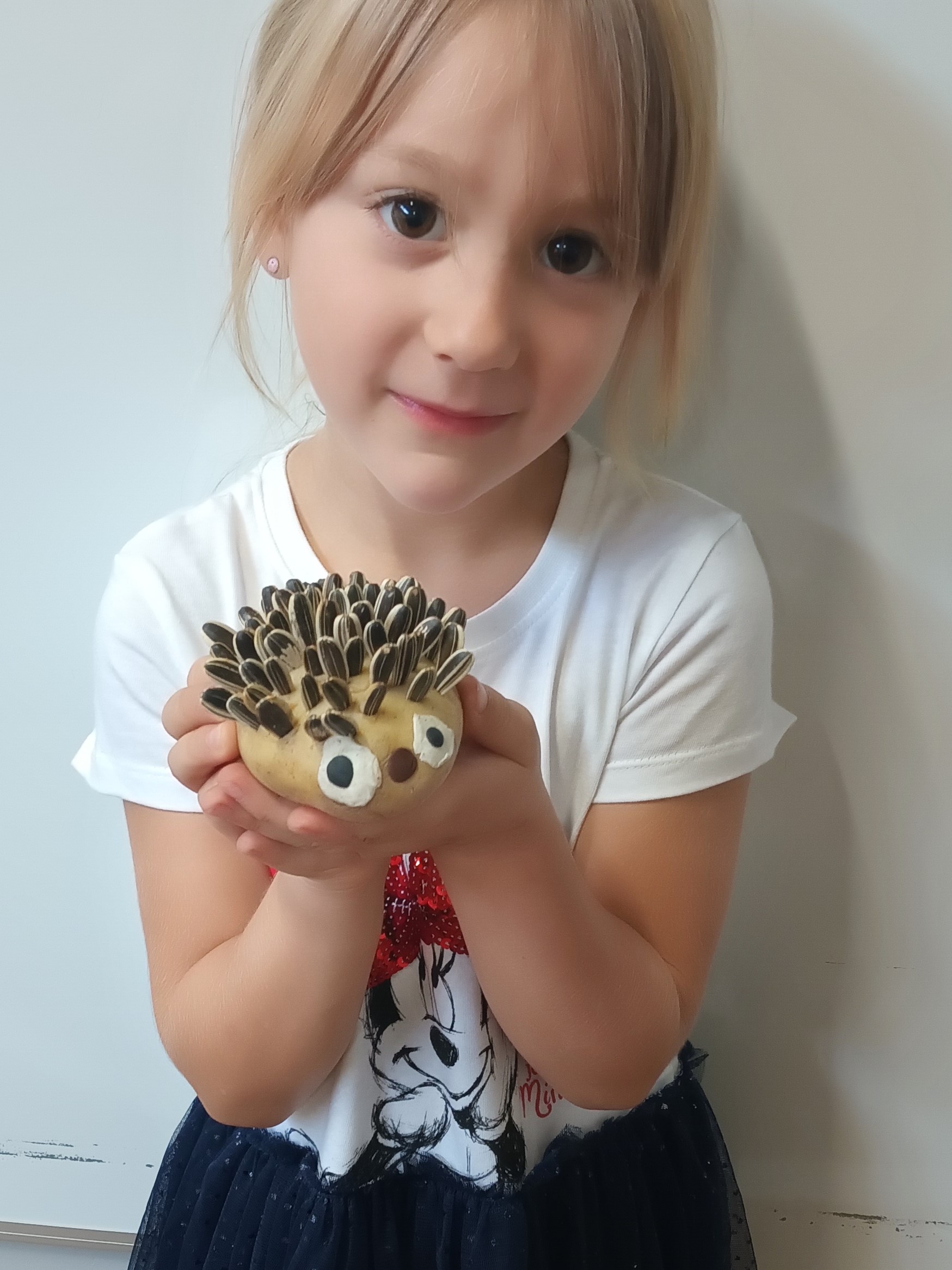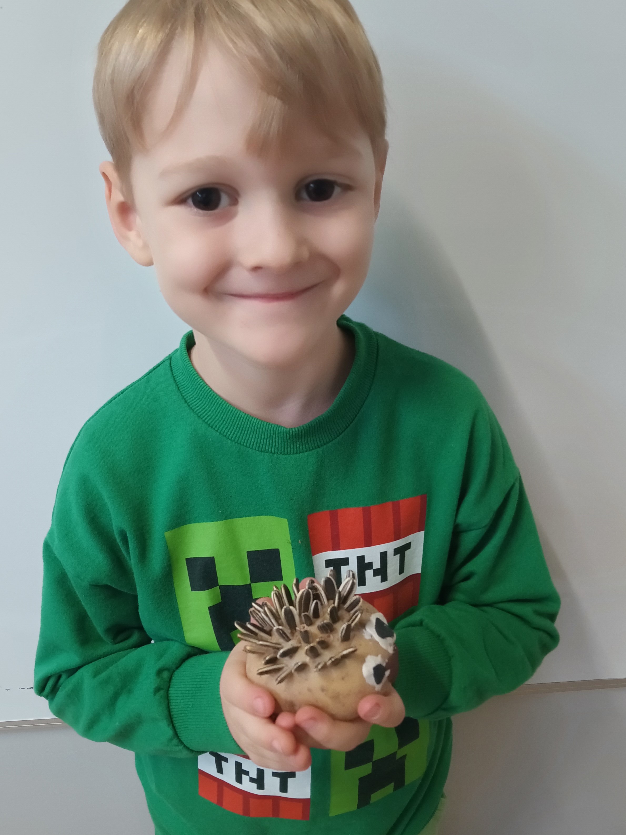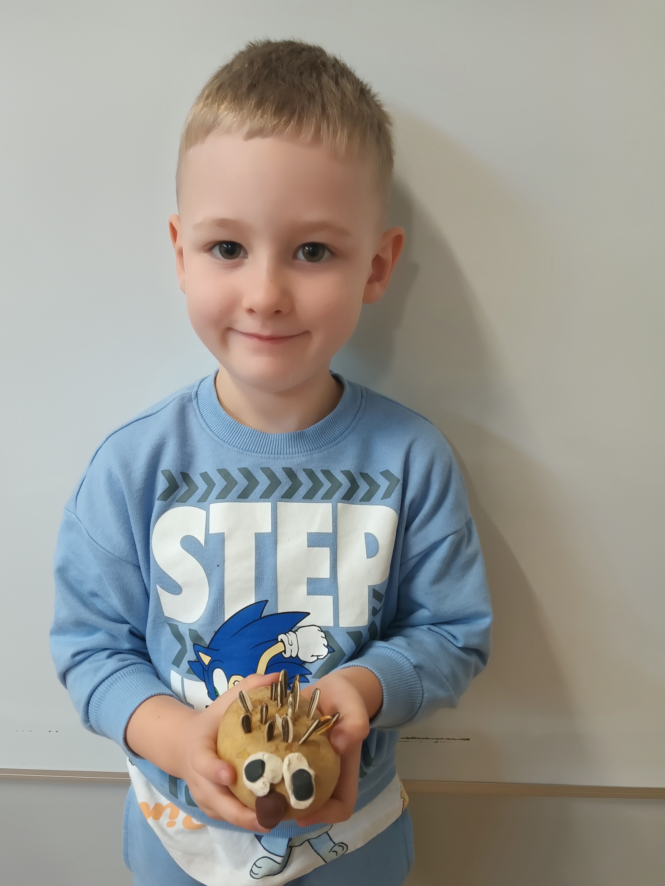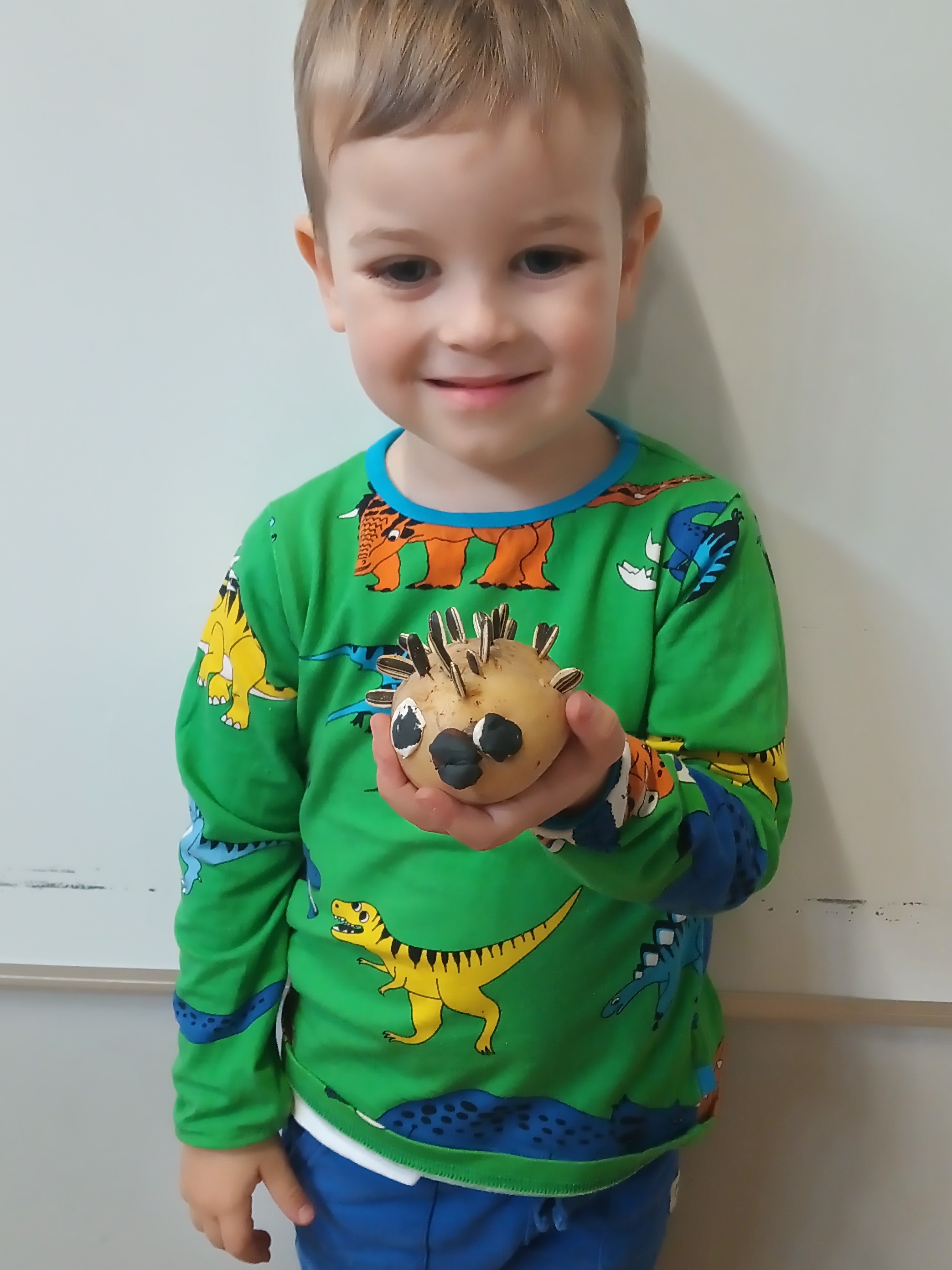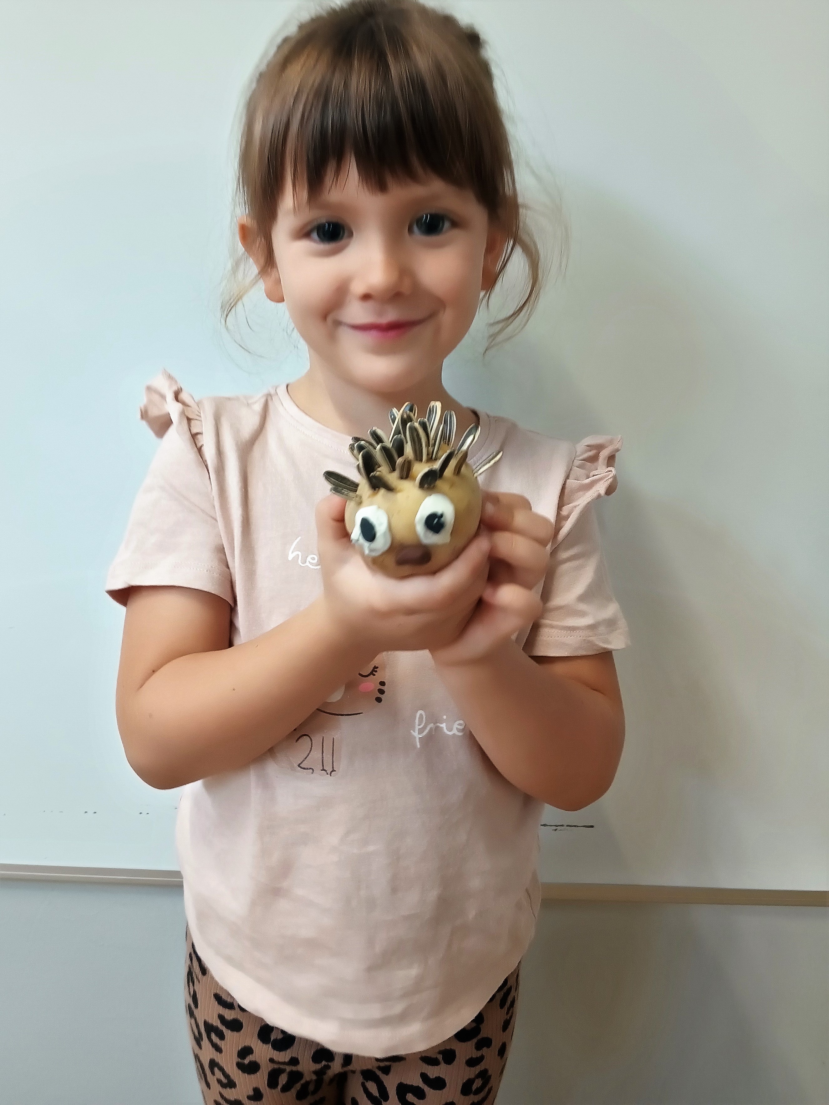 We wtorek poznawaliśmy zwierzęta, które możemy spotkać w lesie. Uczyliśmy się ich nazw w języku angielskim. Graliśmy w memory obrazkowe ze zwierzątkami. Jak za pomocą czarodziejskiej różdżki zamieniliśmy ziemniaki w jeżyki.