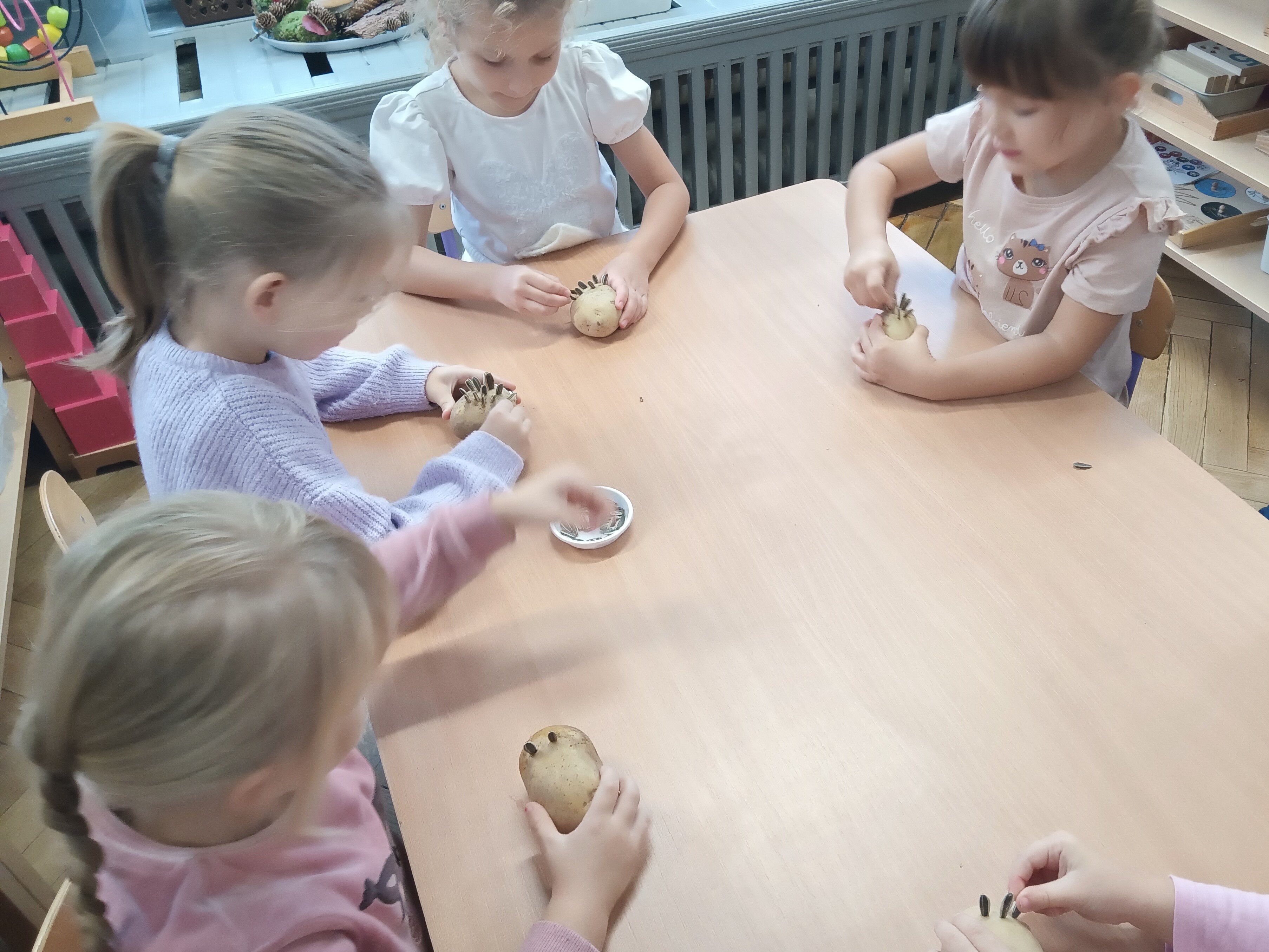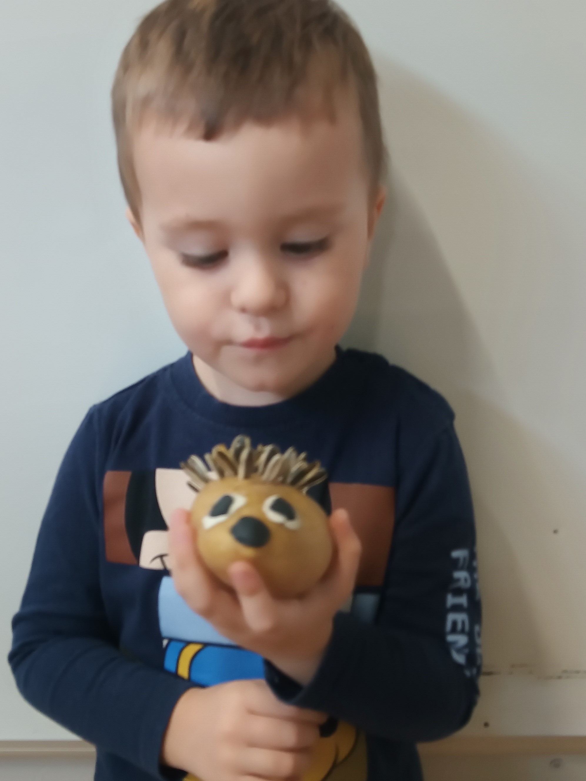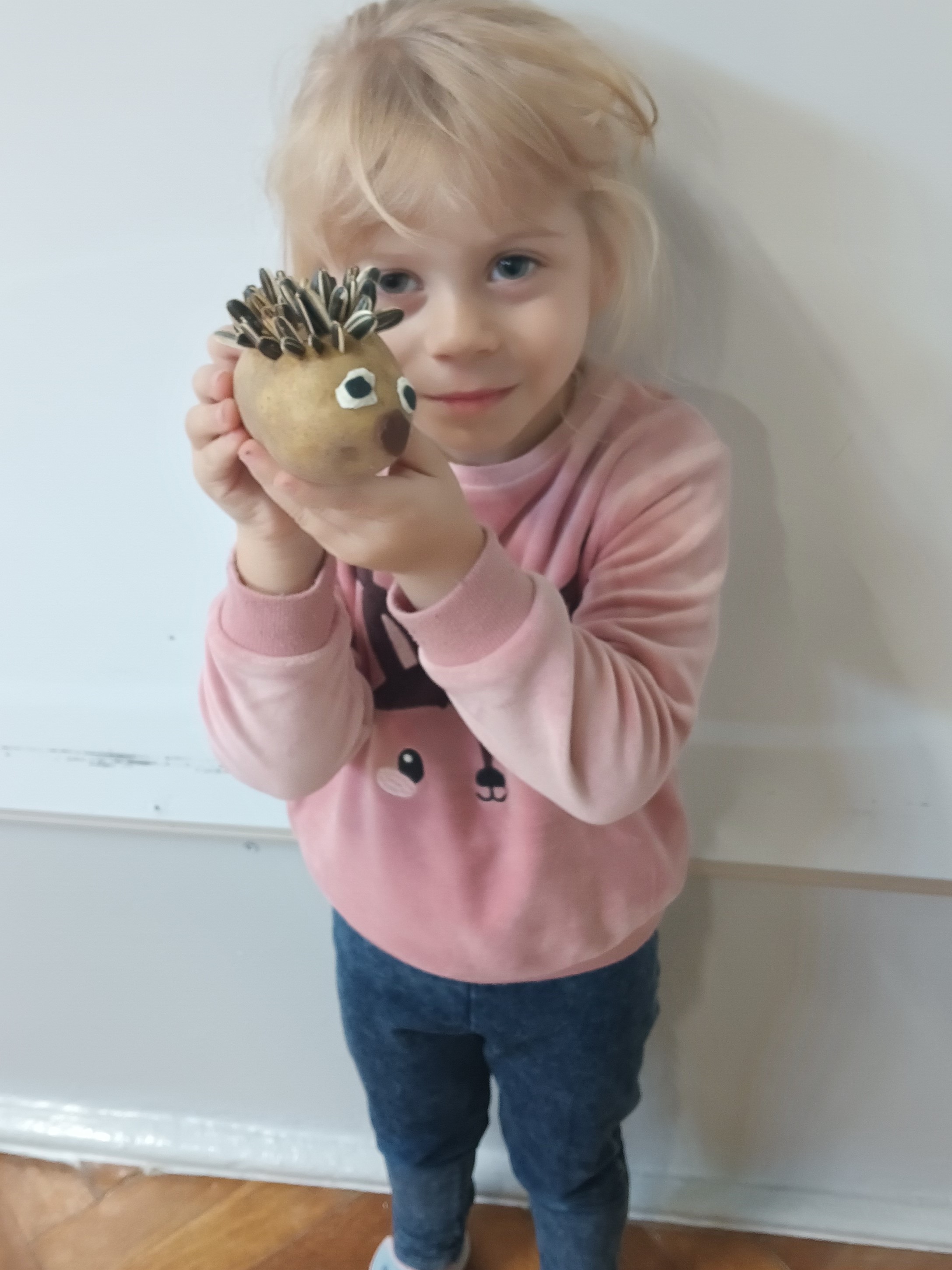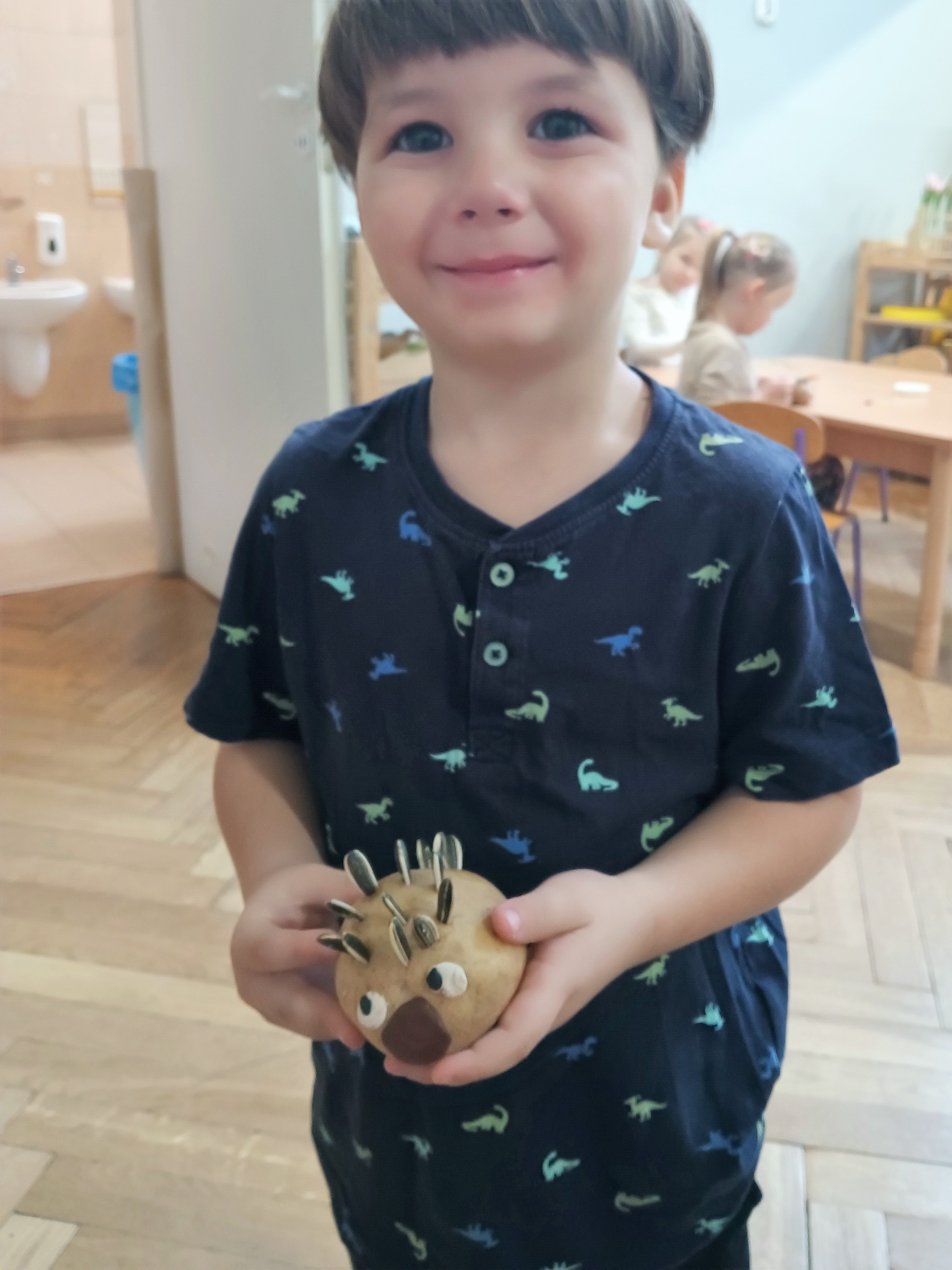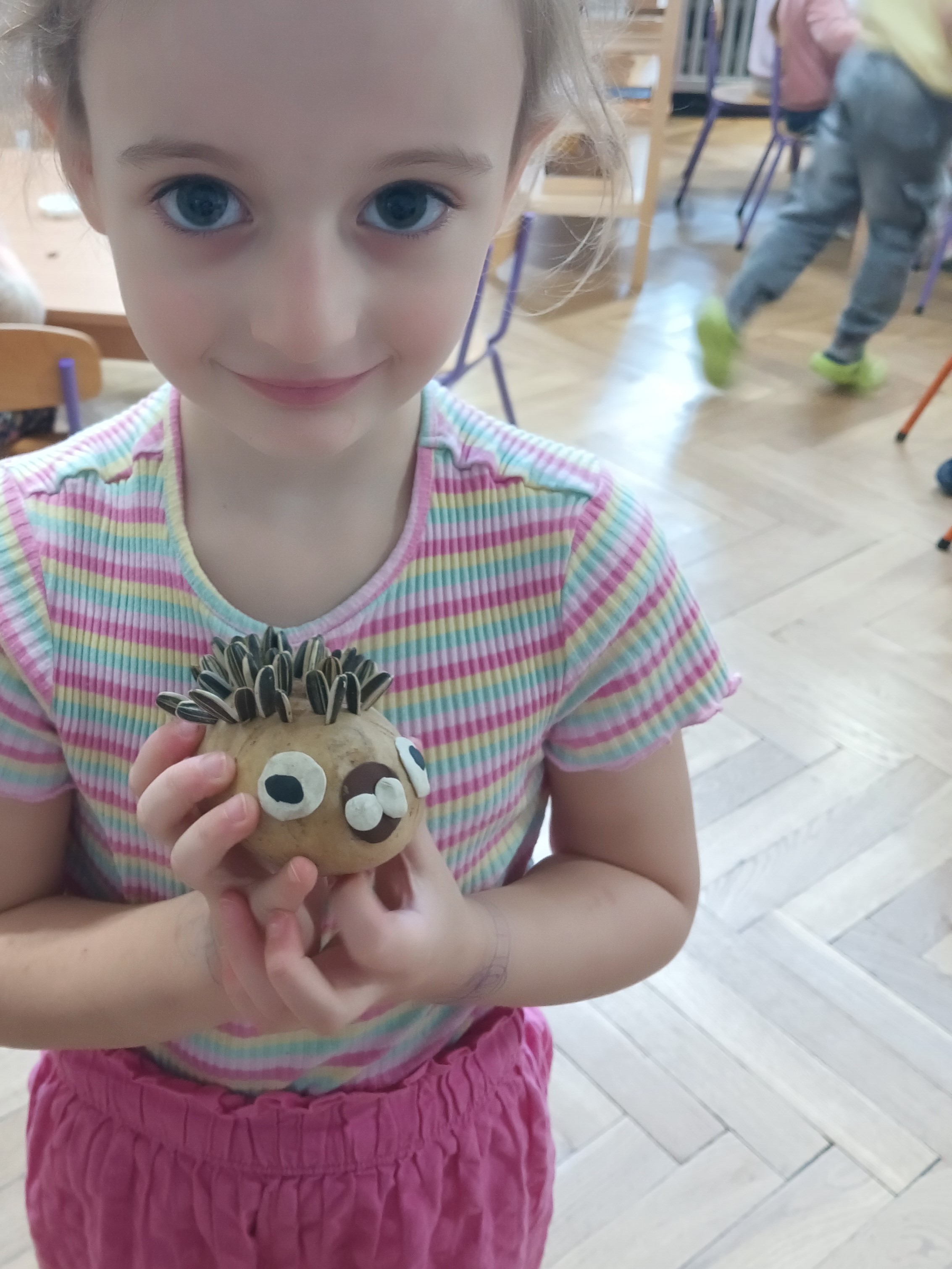 We wtorek poznawaliśmy zwierzęta, które możemy spotkać w lesie. Uczyliśmy się ich nazw w języku angielskim. Graliśmy w memory obrazkowe ze zwierzątkami. Jak za pomocą czarodziejskiej różdżki zamieniliśmy ziemniaki w jeżyki.