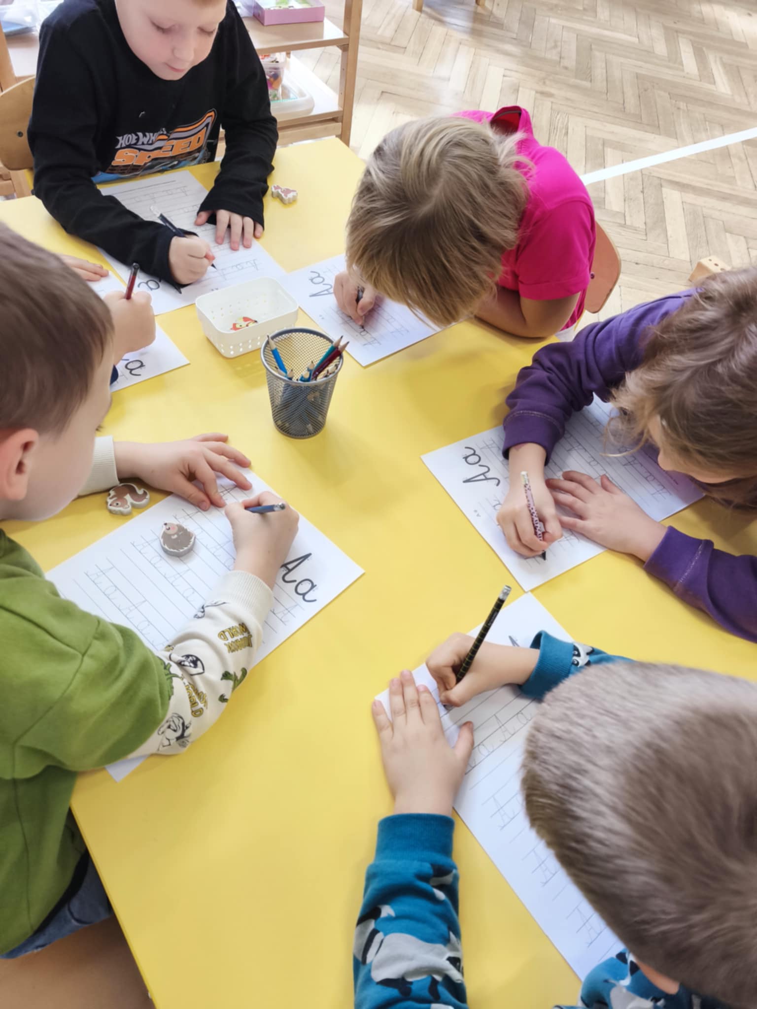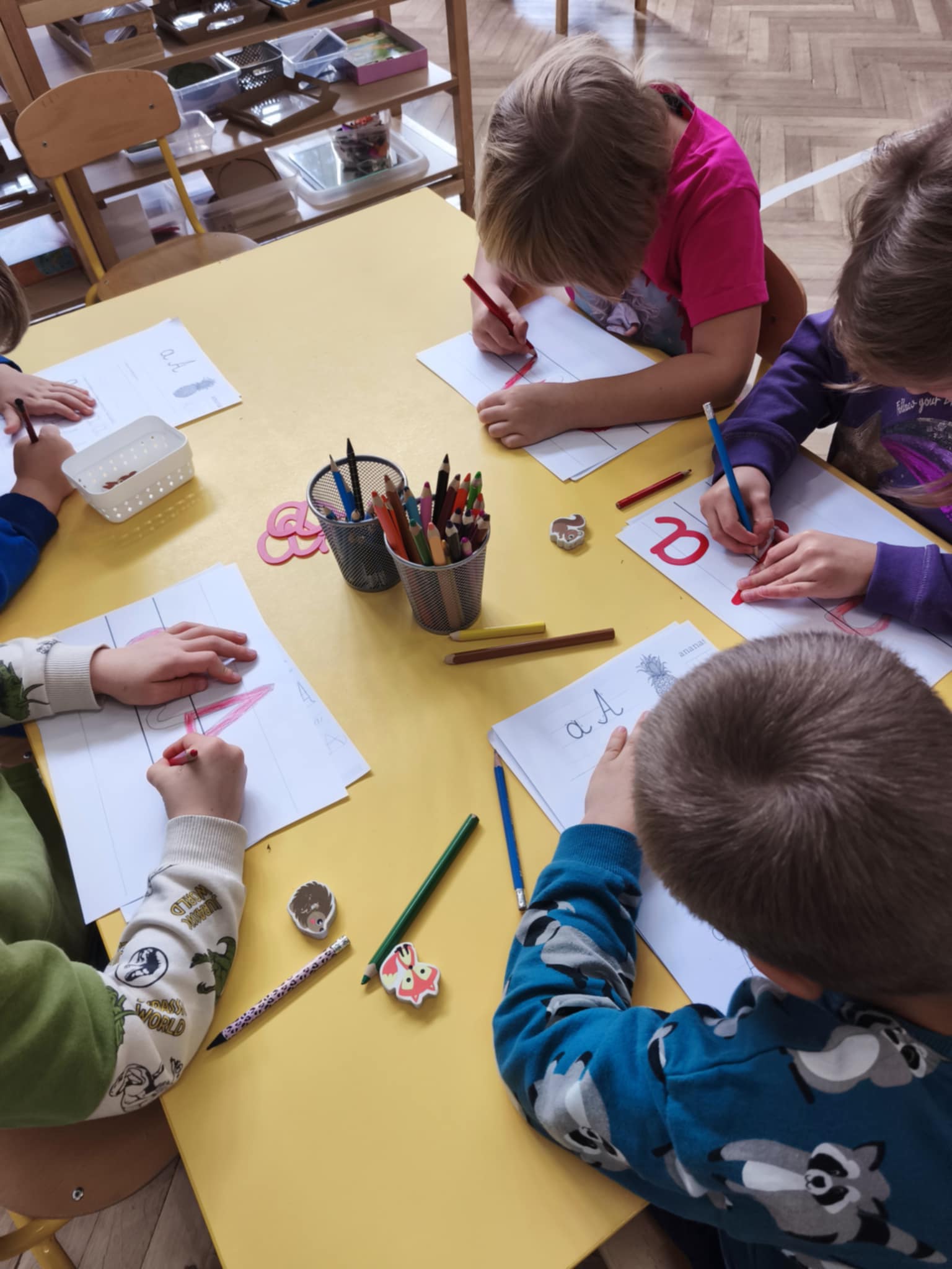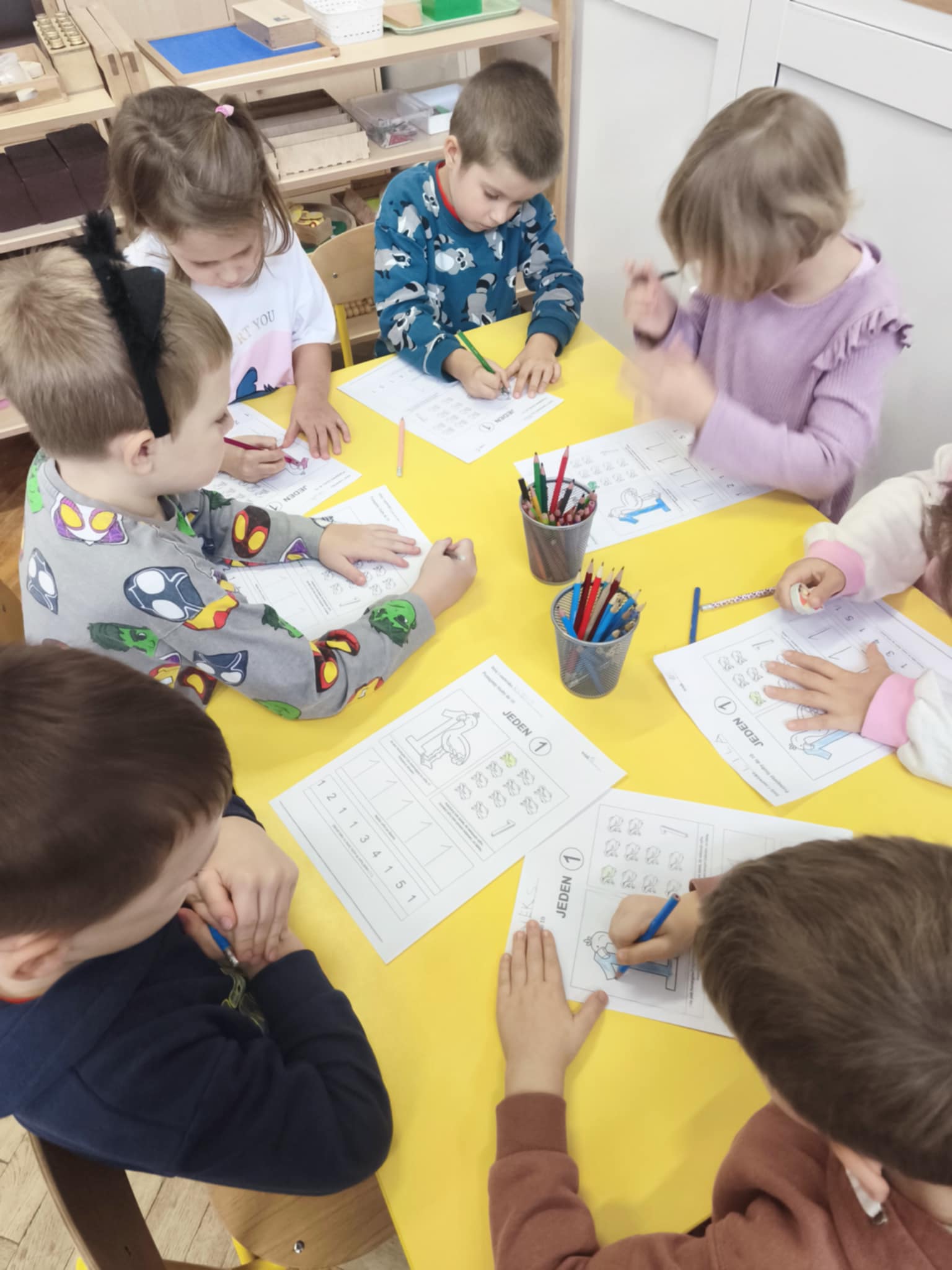 Przygotowanie do podjęcia obowiązku szkolnego zaczyna się już u 3 letniego dziecka, które w specjalnie przygotowanym otoczeniu zgodnie z koncepcją M Montessori uczy się poprze zabawę wielu cennych zagadnień. Utrwalając wiedzę, przygotowując do systemu szkolnego, nauka odbywa się także z wykorzystaniem kart pracy. Nasza grupa latków chętnie podejmuje się tych działań i cześć czasu przeznaczonego na pracę własną poświęca na dodatkowe zadania.