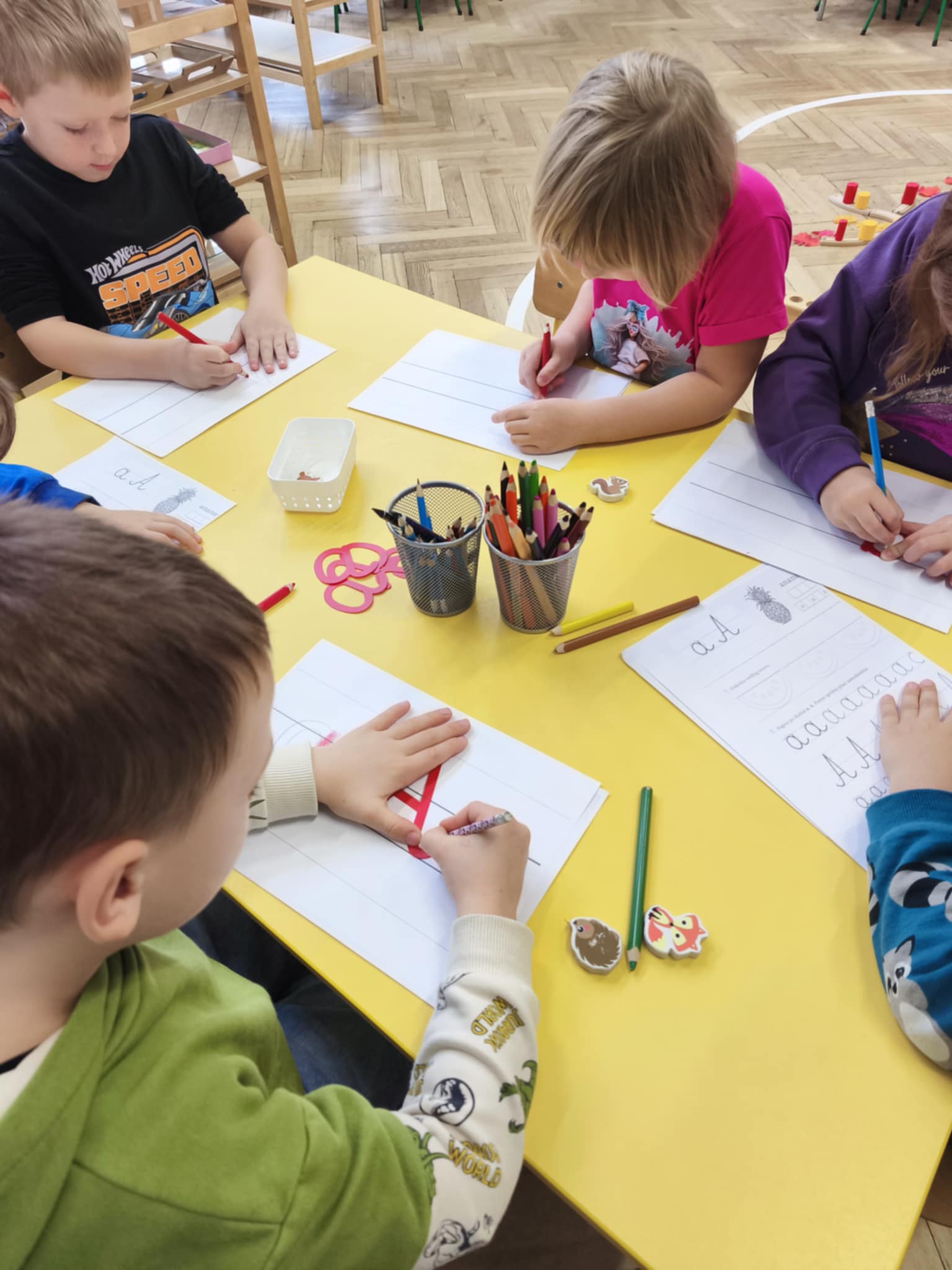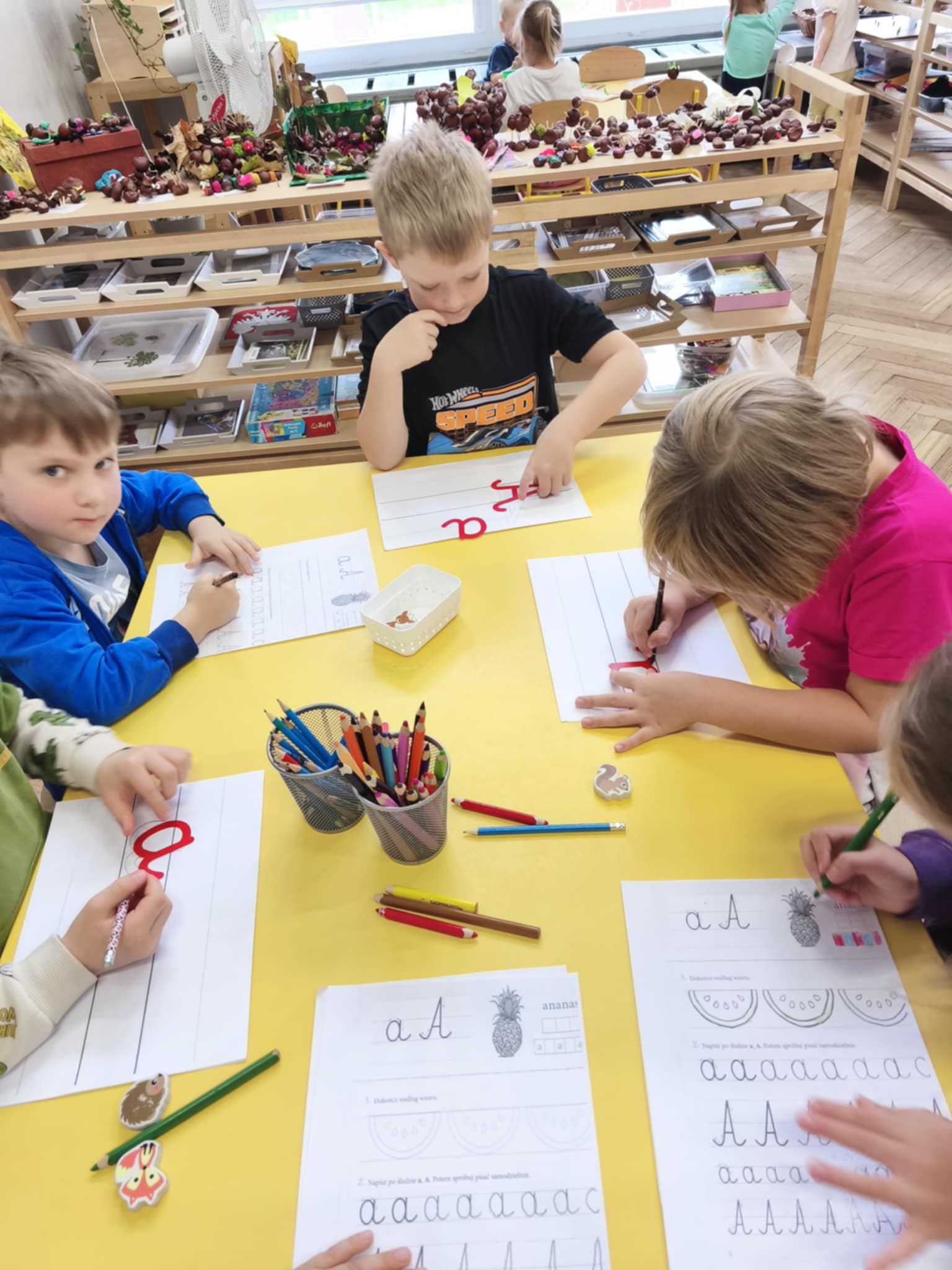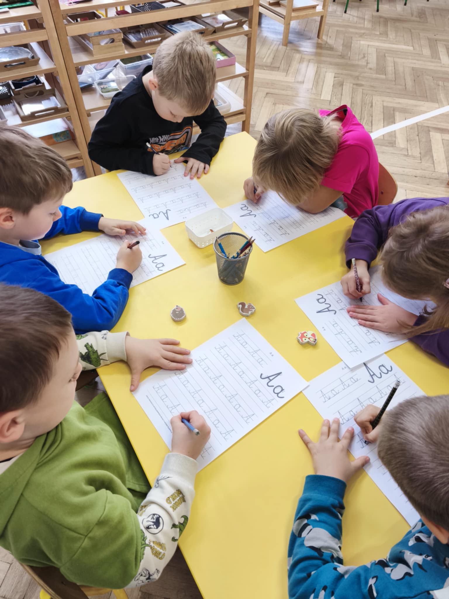 Przygotowanie do podjęcia obowiązku szkolnego zaczyna się już u 3 letniego dziecka, które w specjalnie przygotowanym otoczeniu zgodnie z koncepcją M Montessori uczy się poprze zabawę wielu cennych zagadnień. Utrwalając wiedzę, przygotowując do systemu szkolnego, nauka odbywa się także z wykorzystaniem kart pracy. Nasza grupa latków chętnie podejmuje się tych działań i cześć czasu przeznaczonego na pracę własną poświęca na dodatkowe zadania.