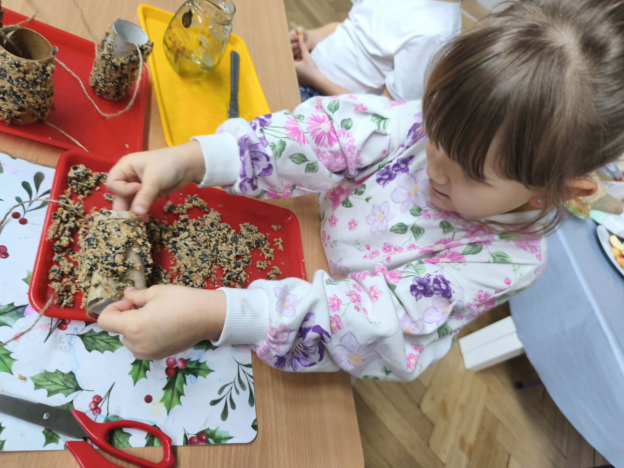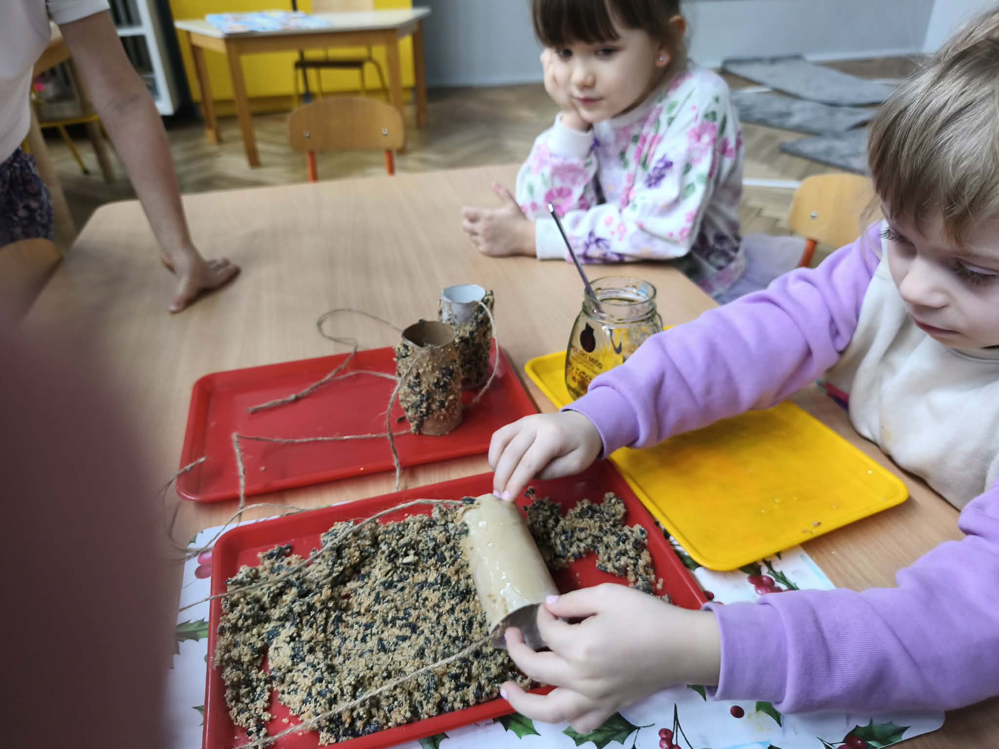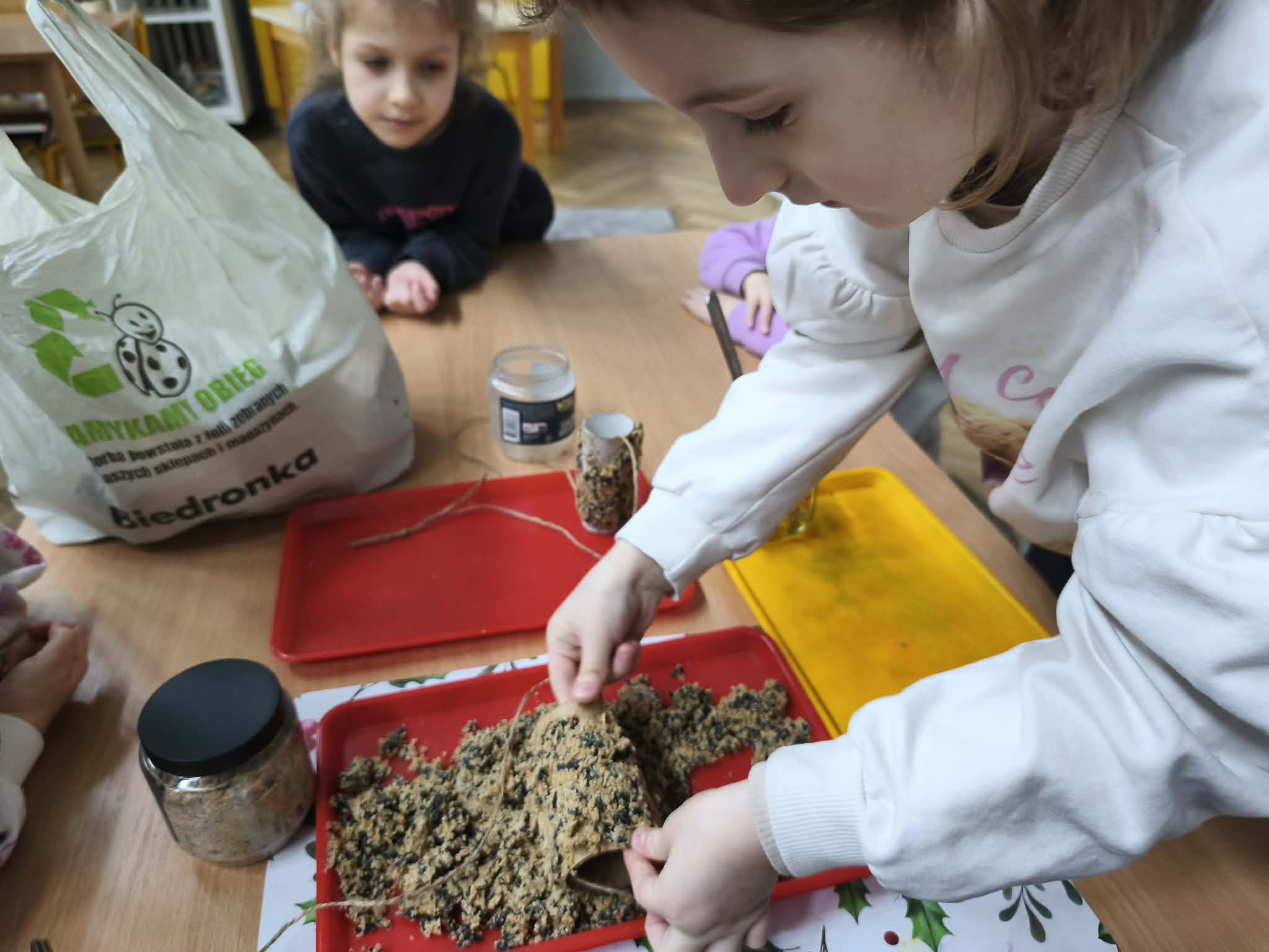 W ramach dzisiejszych zajęć przedszkolaki poznały zasady bezpiecznego dokarmiania - dowiedziały się, dlaczego nie wolno dawać ptakom chleba i co jest dla nich najzdrowsze. Stworzyły ekologiczne karmniki z rolek po papierze, wykorzystując naturalne ziarna i zdrowe tłuszcze.