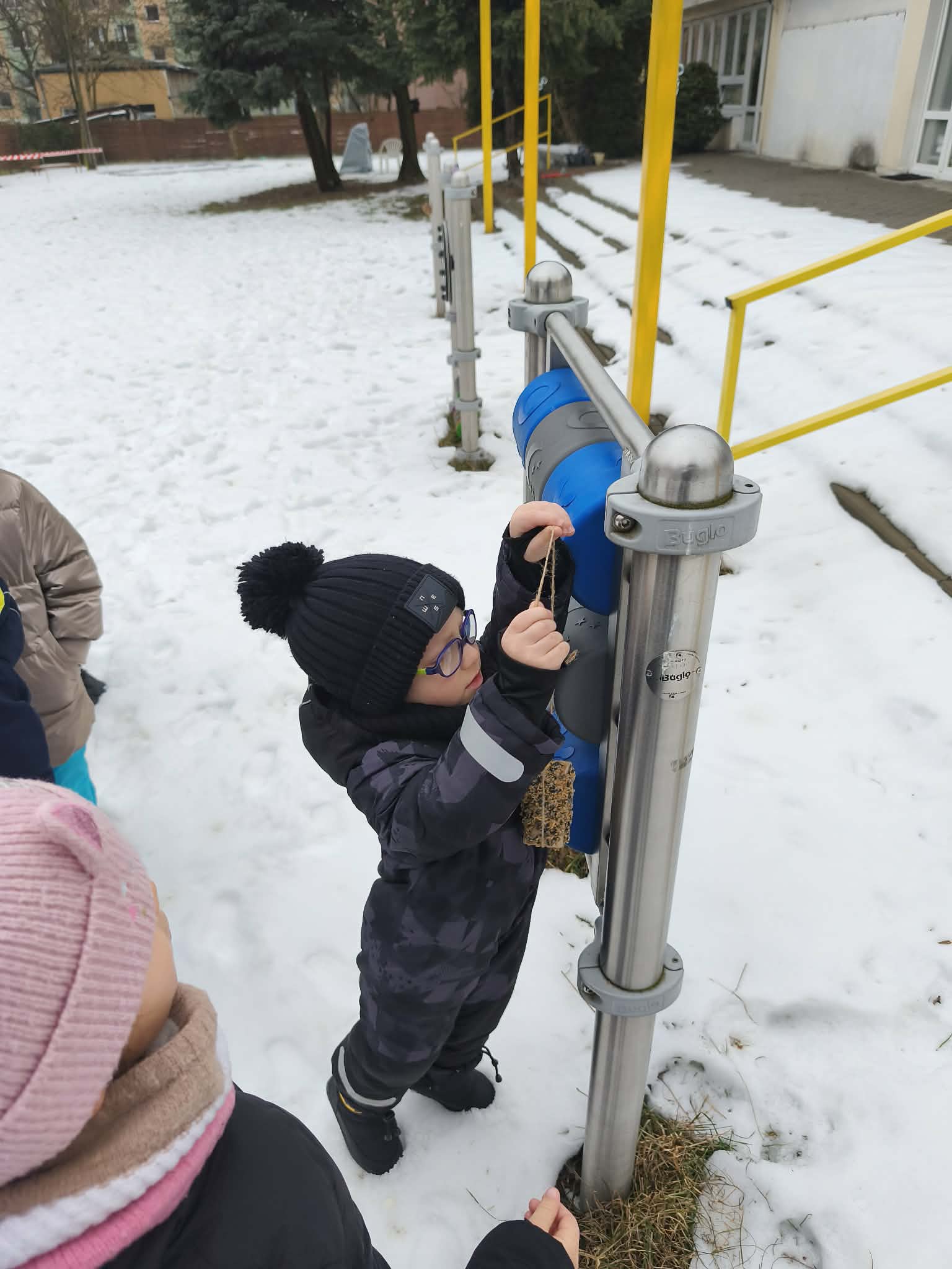 Na koniec udaliśmy się z przygotowanymi karminami i ziarnami do naszego ogrodu, gdzie samodzielnie rozwieszaliśmy przygotowane smakołyki na drzewach, karmnikach, itp.