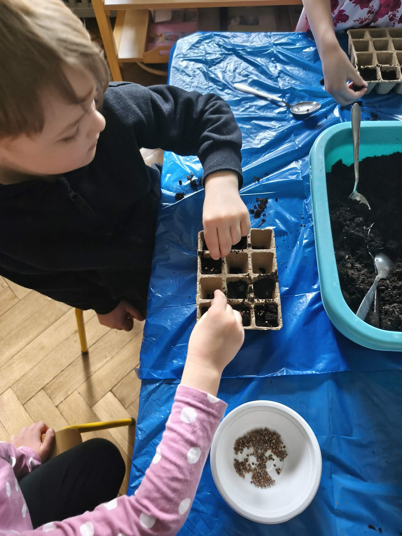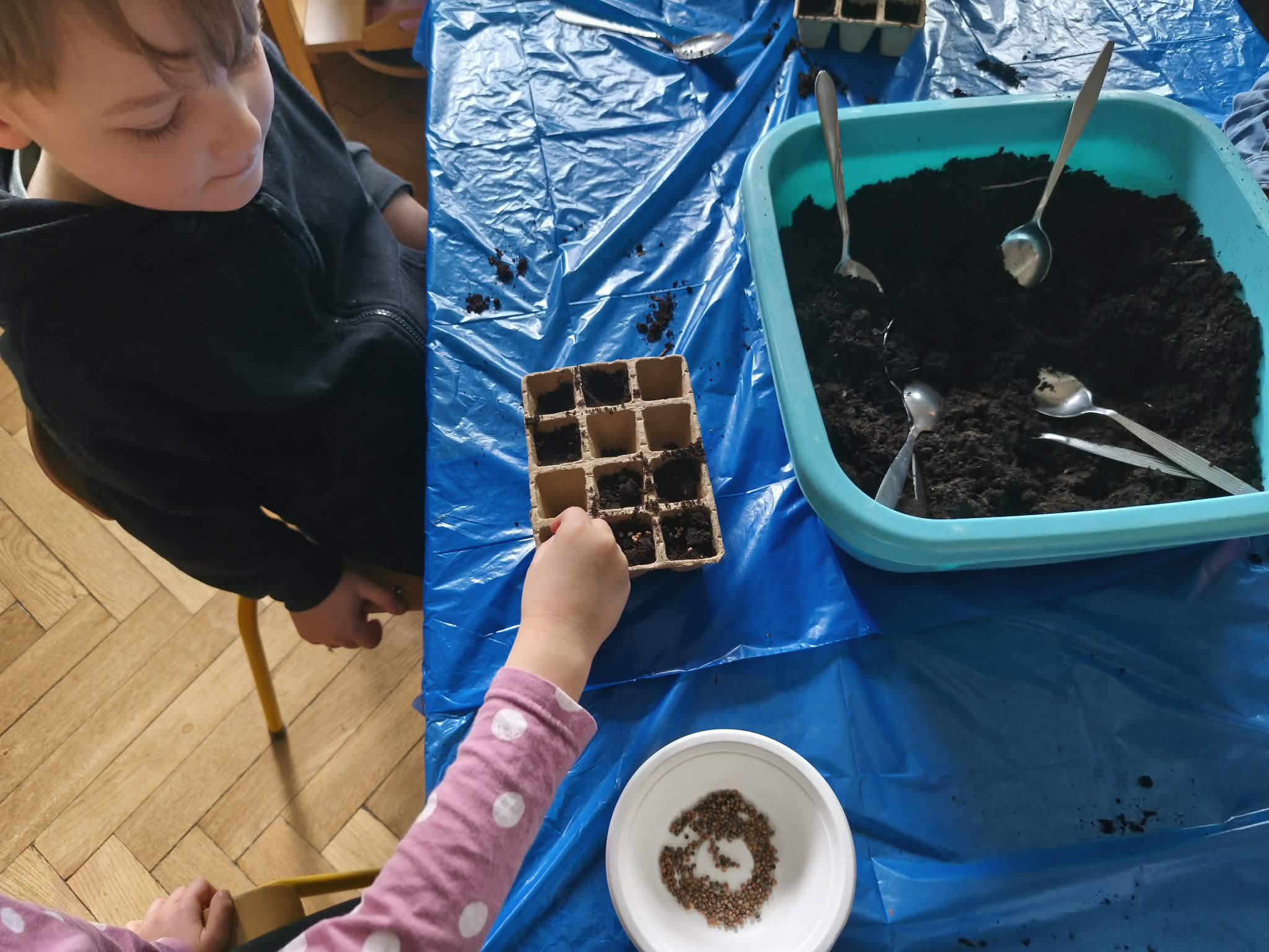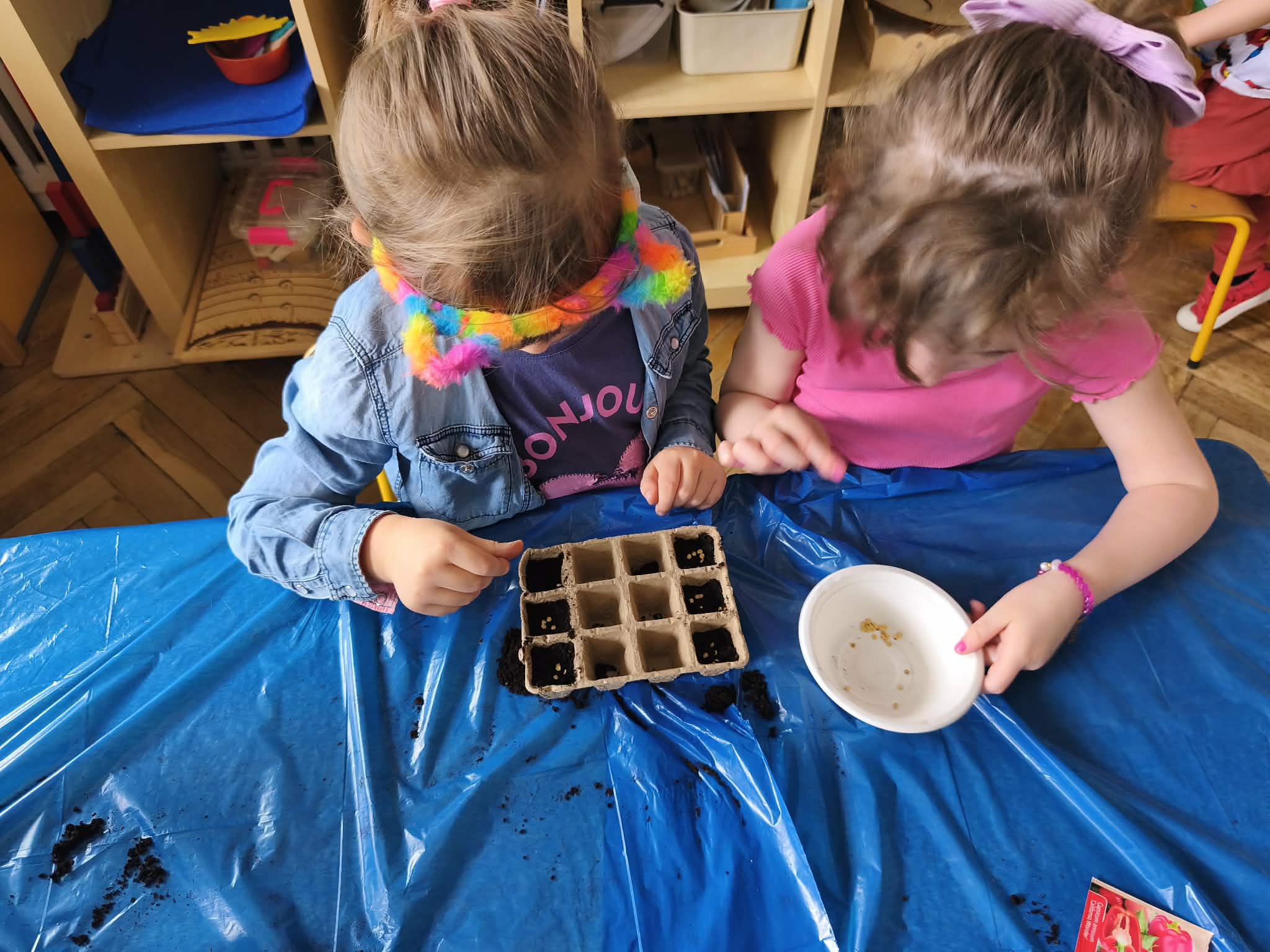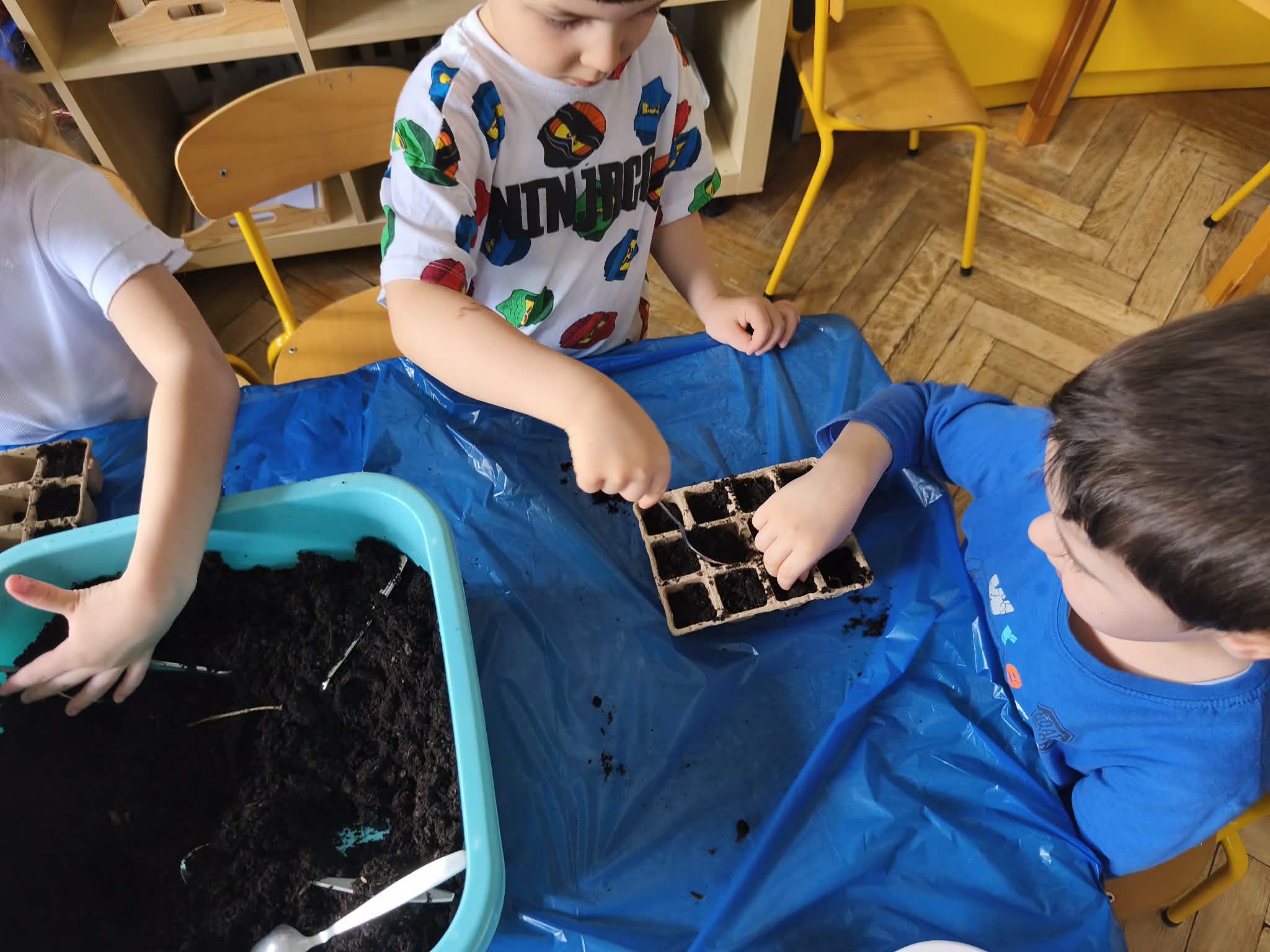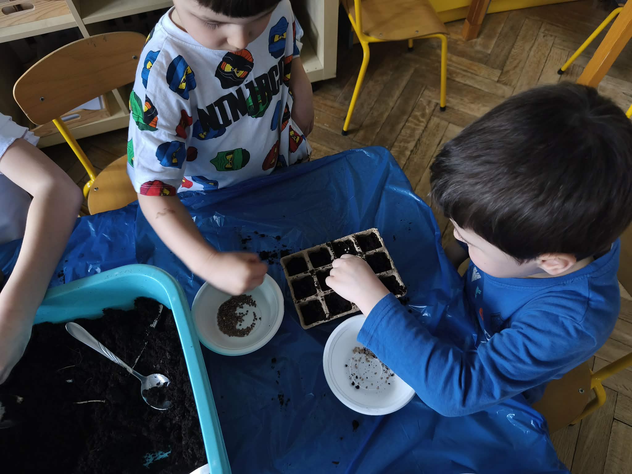 Zanim nasionka trafiły do ziemi, dzieci uważnie je badały – wąchały i obserwowały ziarenka od okrągłej i podłużnej rzodkiewki, po paprykę i pomidorki. Po części badawczej nadszedł czas na działanie – z wielką starannością posialiśmy nasze warzywa, mając nadzieję, że będzie to początek nowemu życiu w naszym ogrodzie.