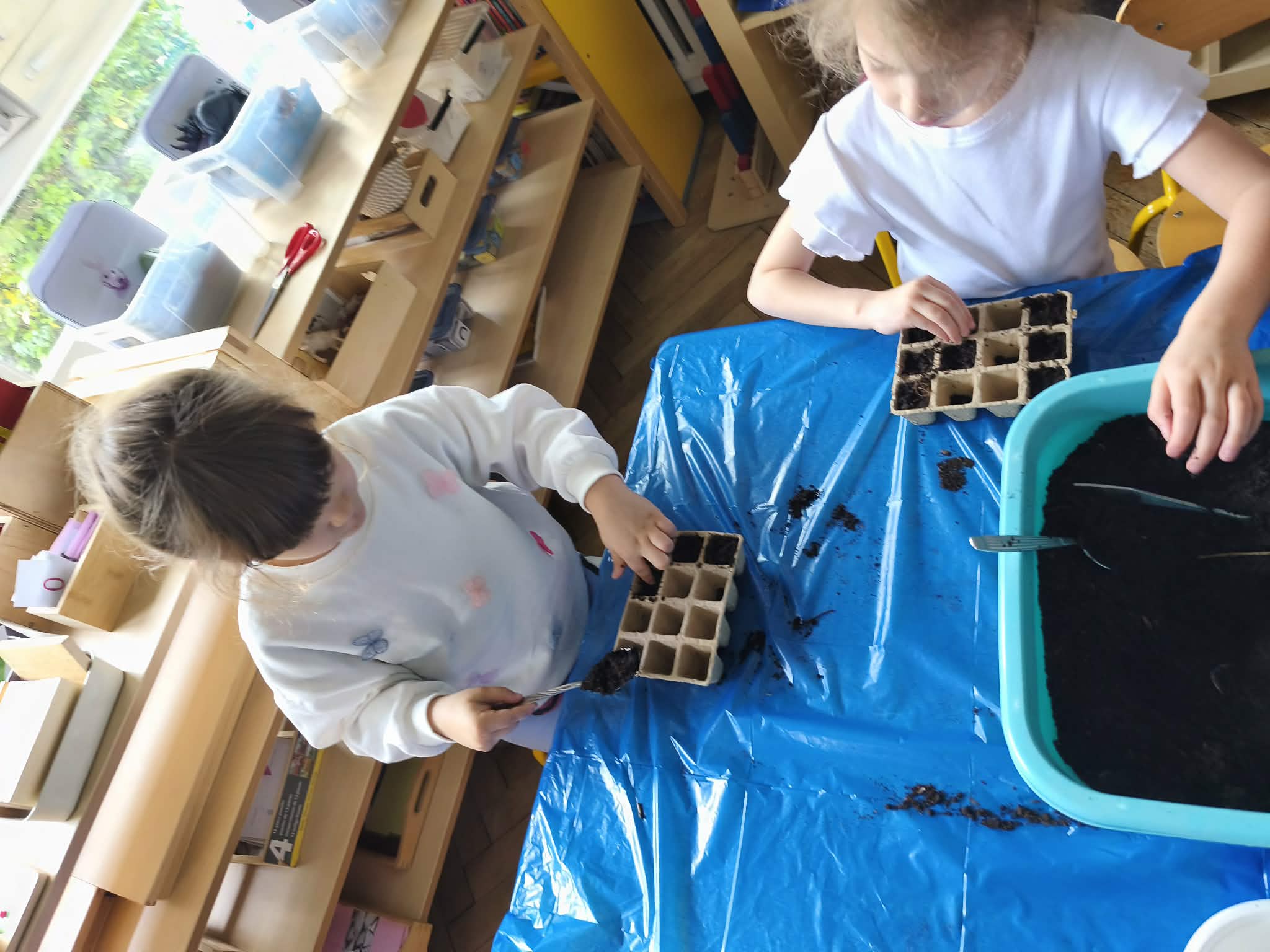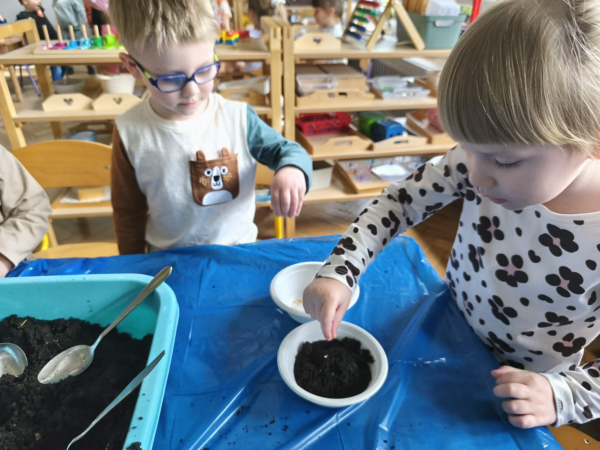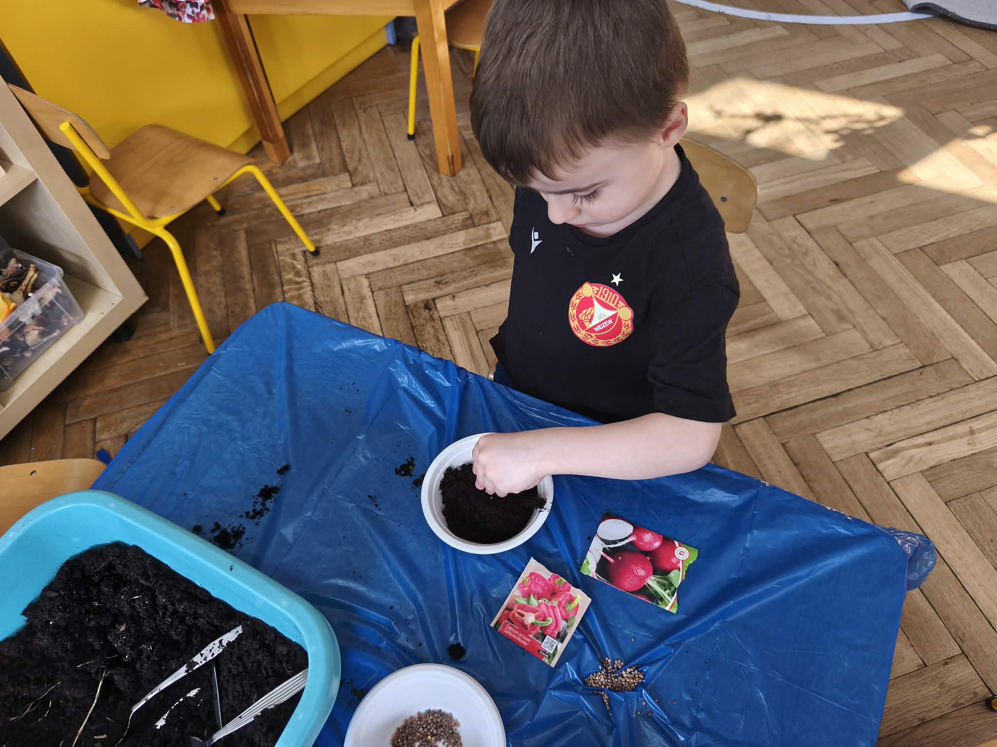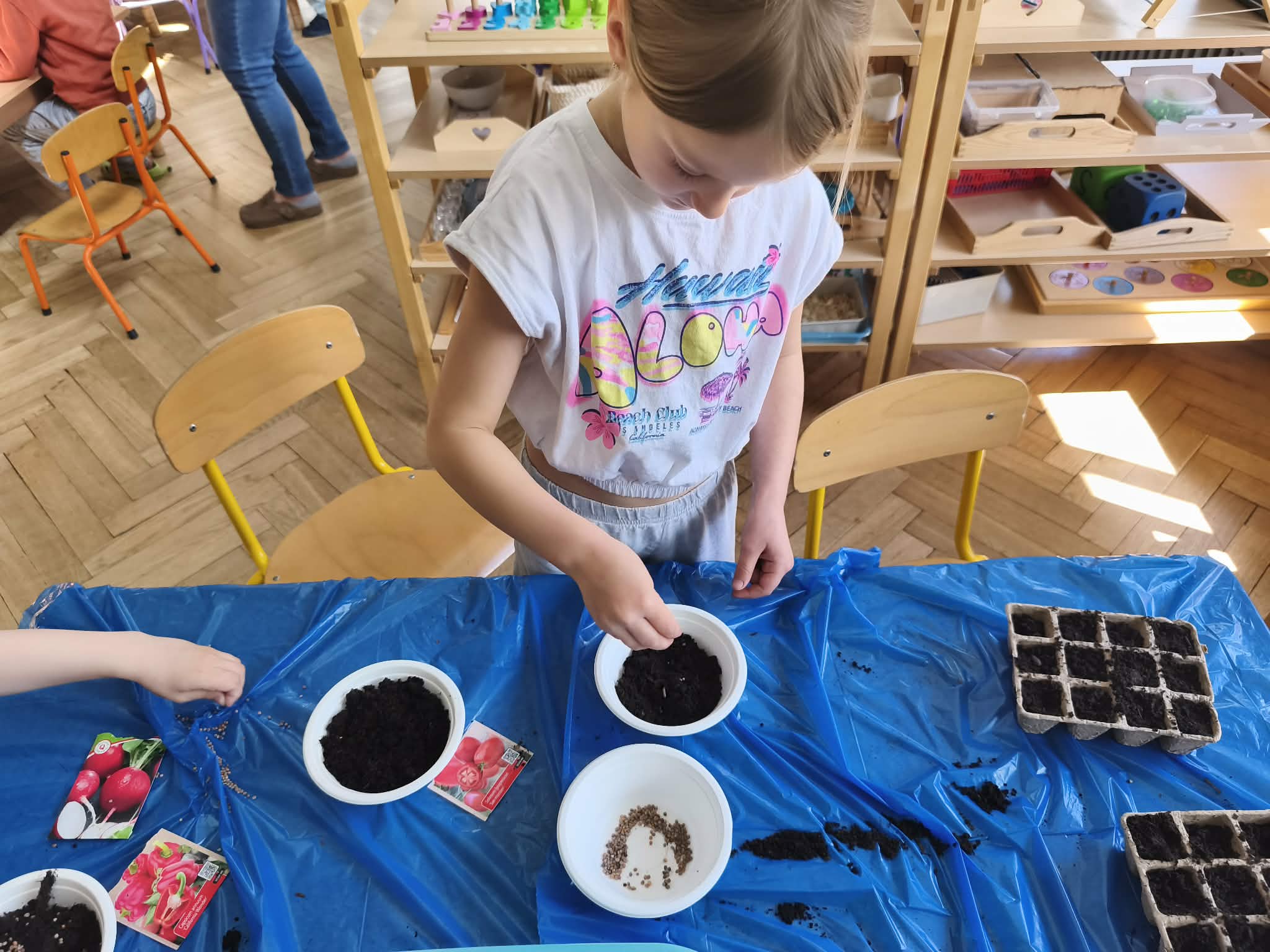 Zanim nasionka trafiły do ziemi, dzieci uważnie je badały – wąchały i obserwowały ziarenka od okrągłej i podłużnej rzodkiewki, po paprykę i pomidorki. Po części badawczej nadszedł czas na działanie – z wielką starannością posialiśmy nasze warzywa, mając nadzieję, że będzie to początek nowemu życiu w naszym ogrodzie.