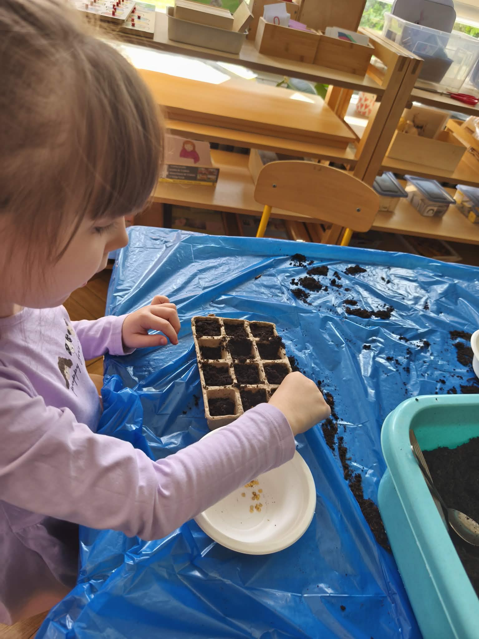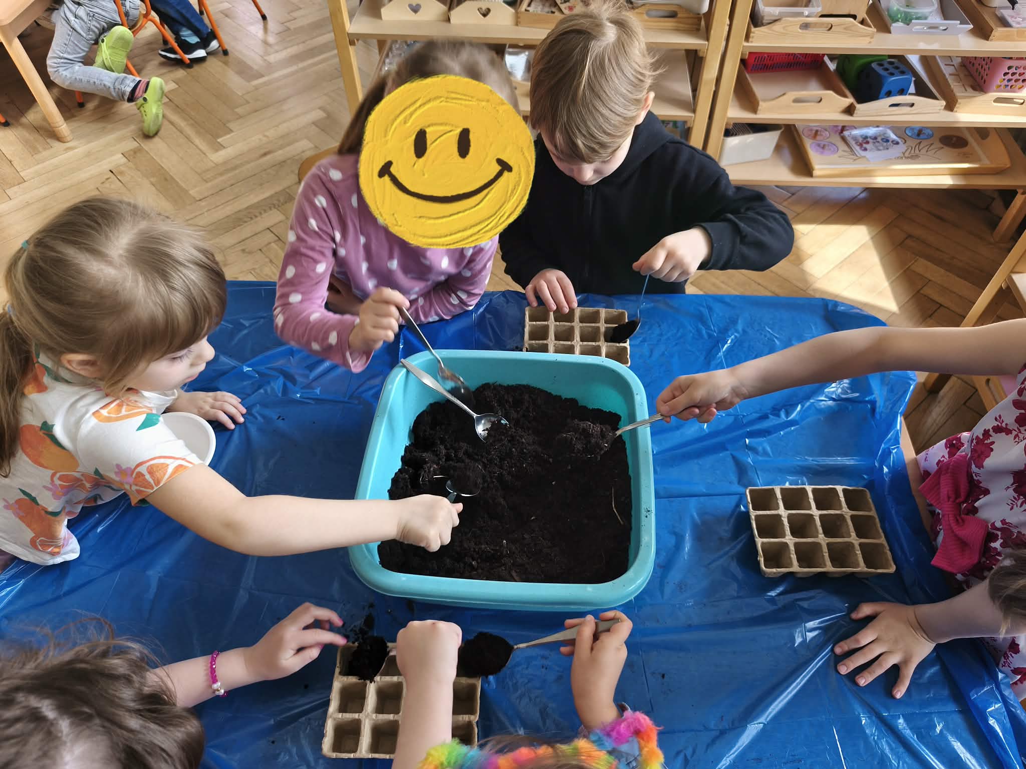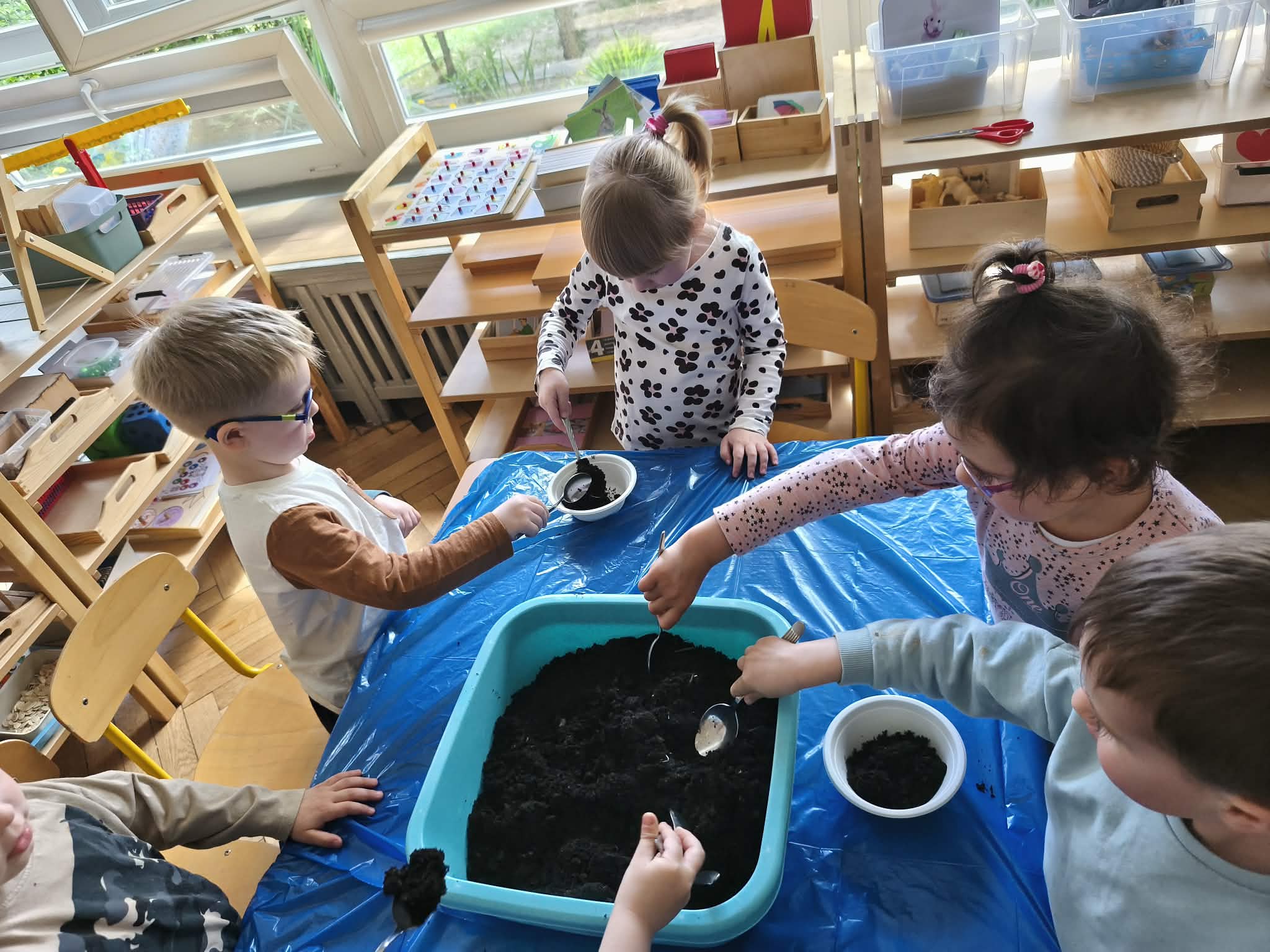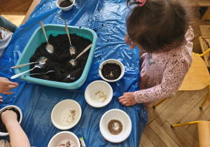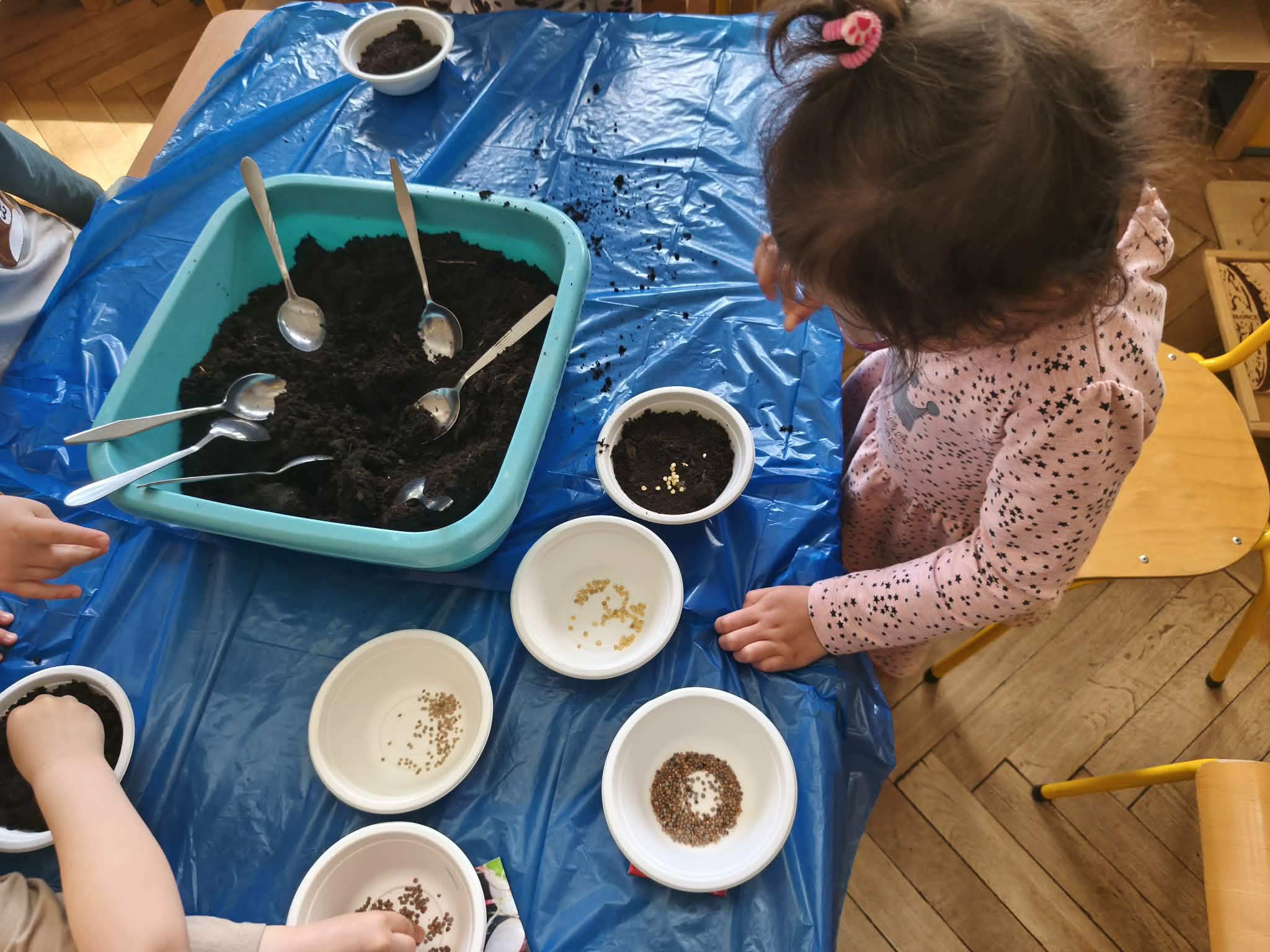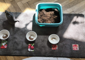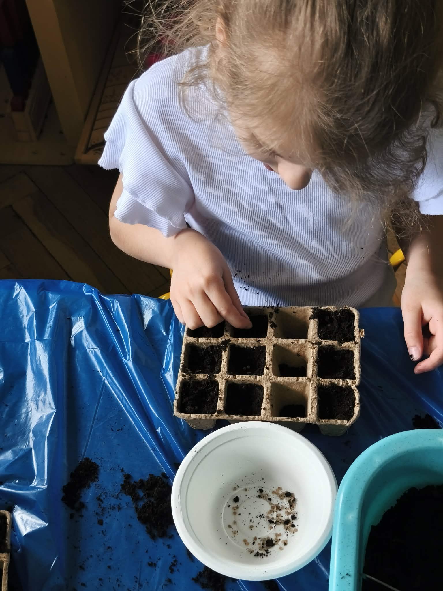 Zanim nasionka trafiły do ziemi, dzieci uważnie je badały – wąchały i obserwowały ziarenka od okrągłej i podłużnej rzodkiewki, po paprykę i pomidorki. Po części badawczej nadszedł czas na działanie – z wielką starannością posialiśmy nasze warzywa, mając nadzieję, że będzie to początek nowemu życiu w naszym ogrodzie.