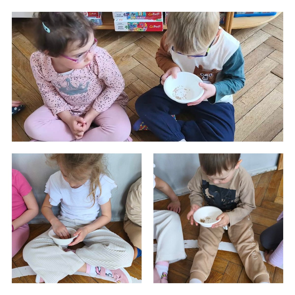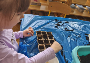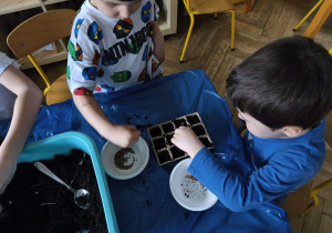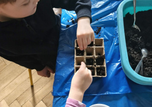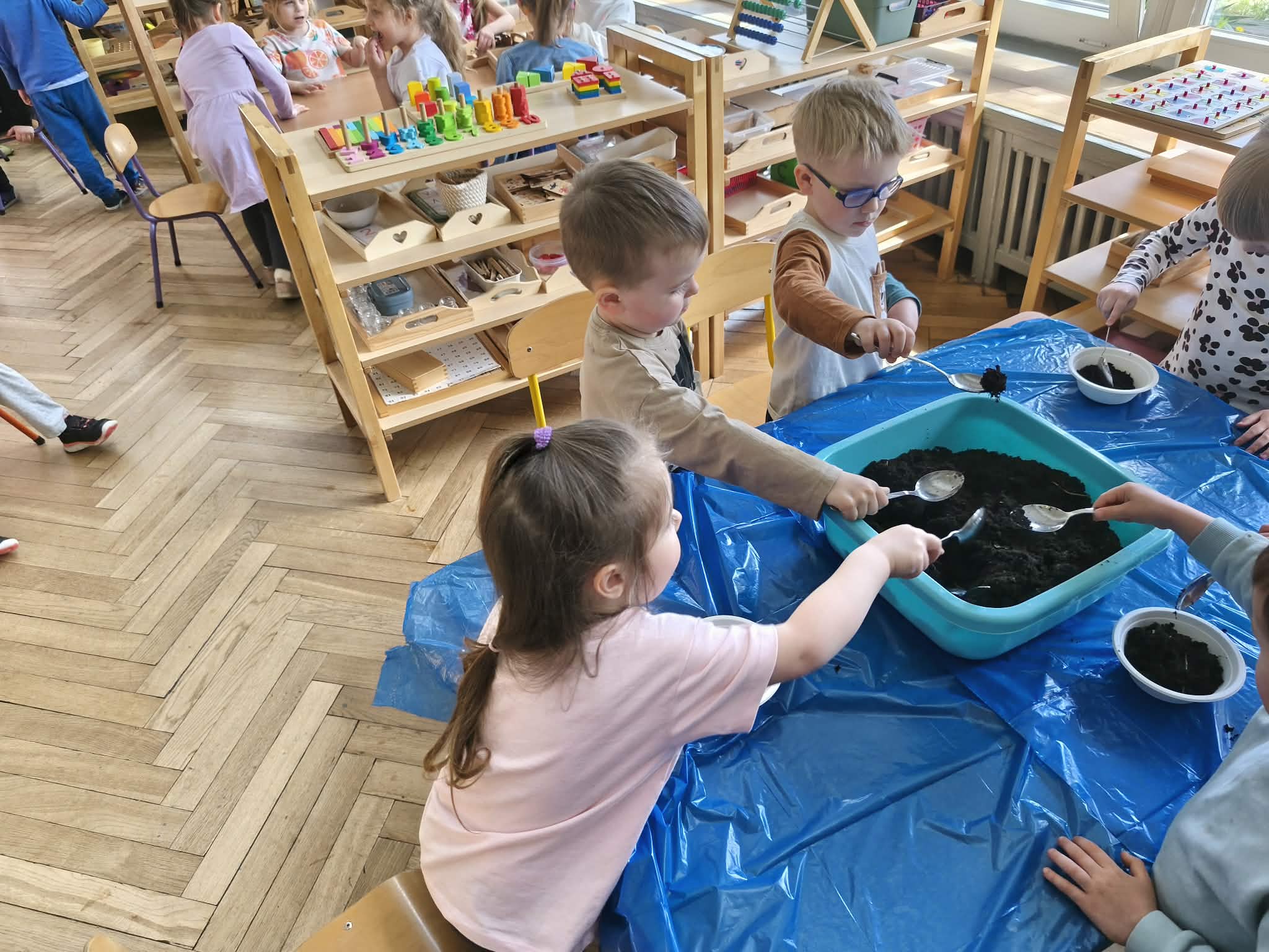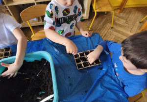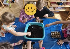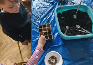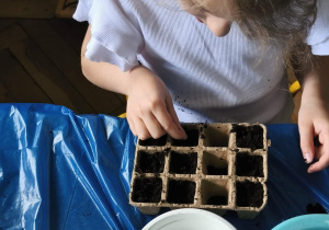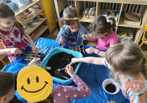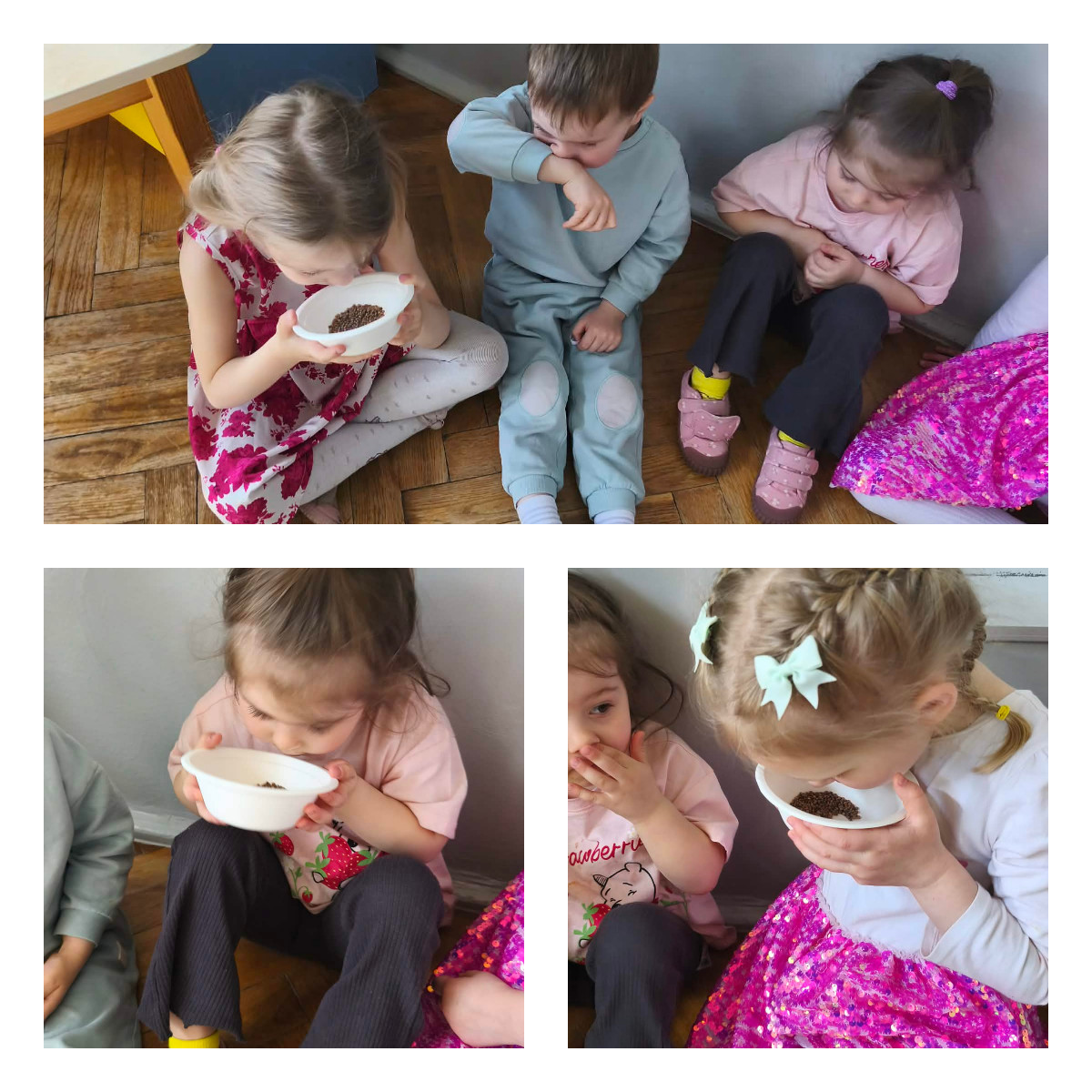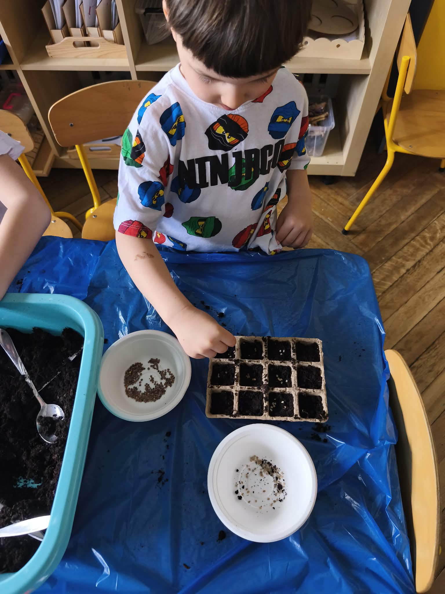 Zanim nasionka trafiły do ziemi, dzieci uważnie je badały – wąchały i obserwowały ziarenka od okrągłej i podłużnej rzodkiewki, po paprykę i pomidorki. Po części badawczej nadszedł czas na działanie – z wielką starannością posialiśmy nasze warzywa, mając nadzieję, że będzie to początek nowemu życiu w naszym ogrodzie.