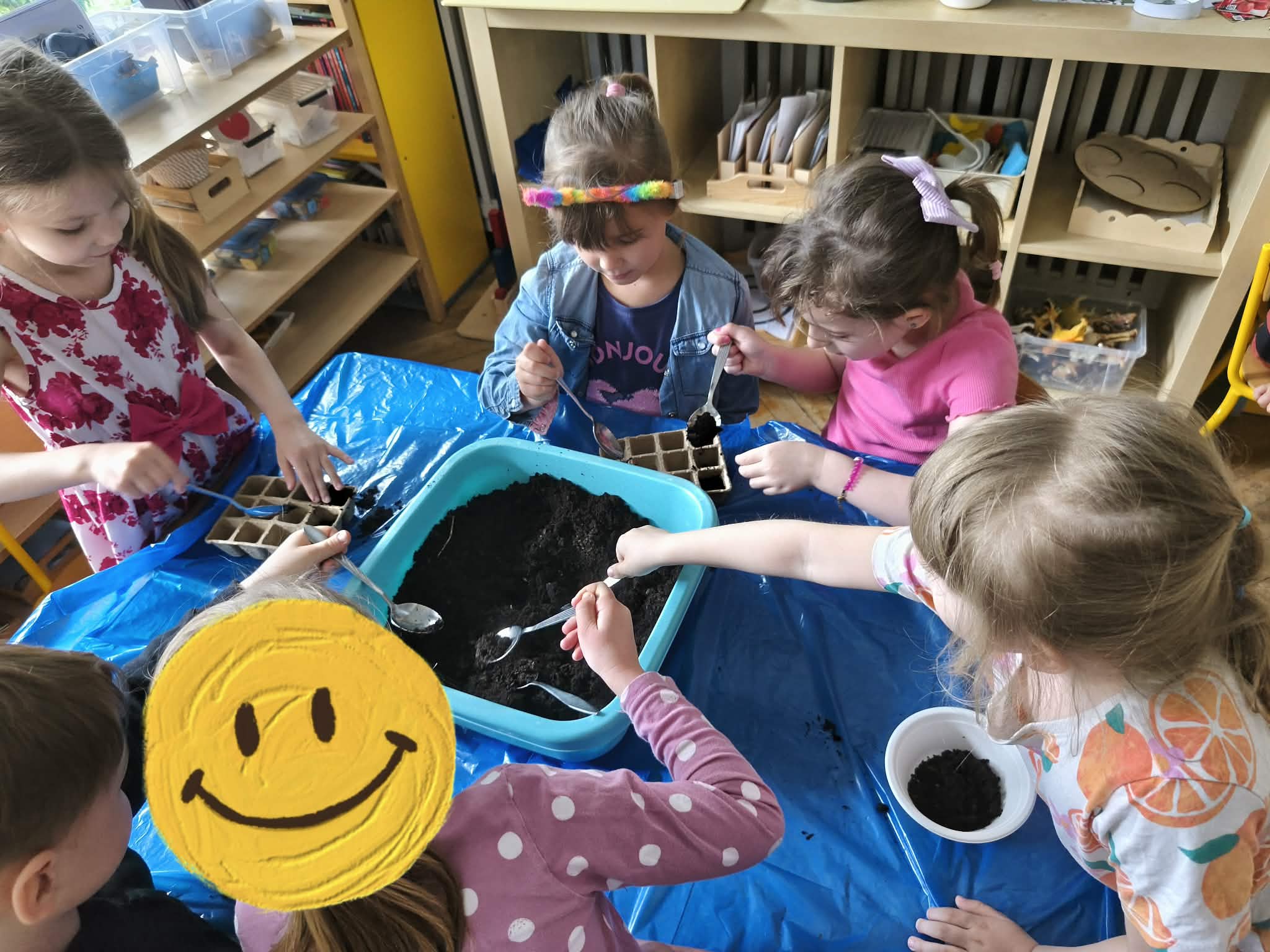 Wiosna w pełni, dlatego nasze przedszkolaki z zapałem zamieniły się w małych ogrodników. Zanim przystąpiliśmy do pracy, odkryliśmy różnice między sianiem a sadzeniem oraz przypomnieliśmy sobie, czego roślina potrzebuje do życia: słońca, wody, ziemi i naszej troski.