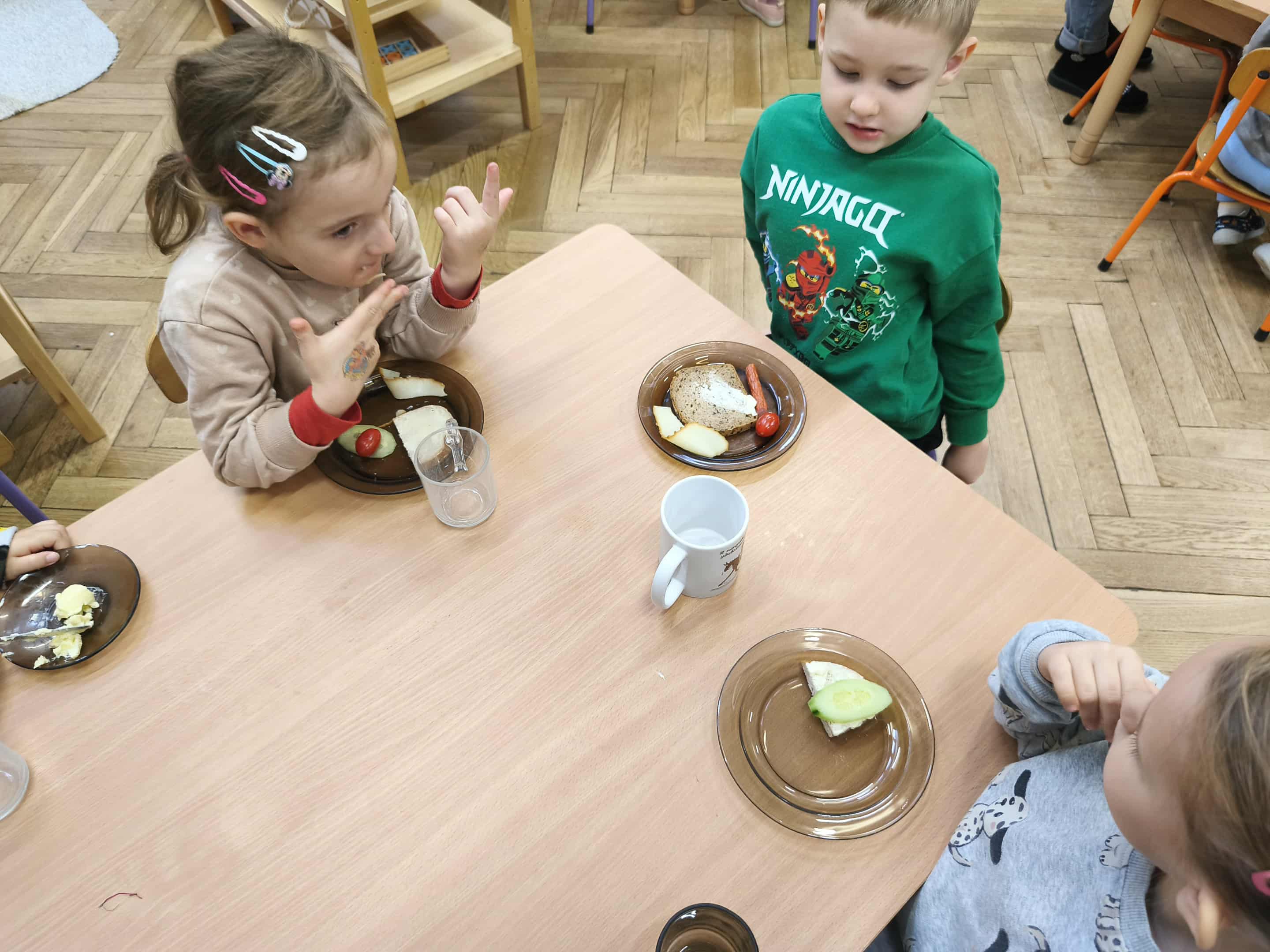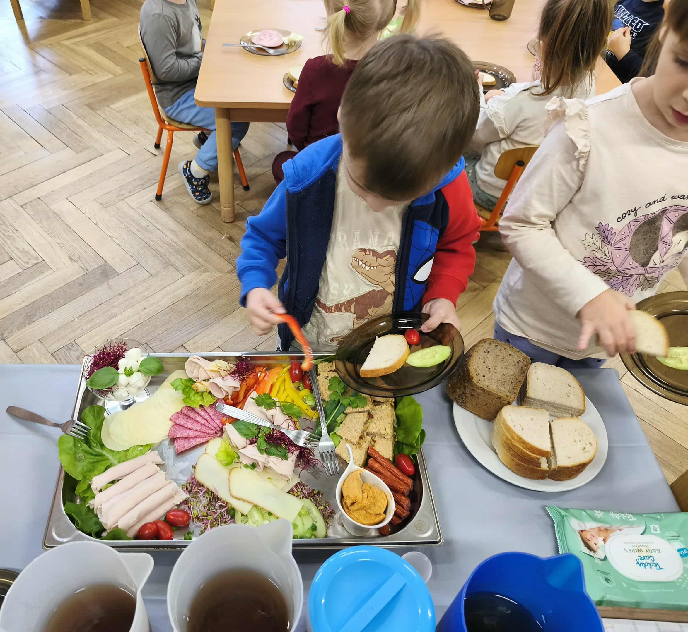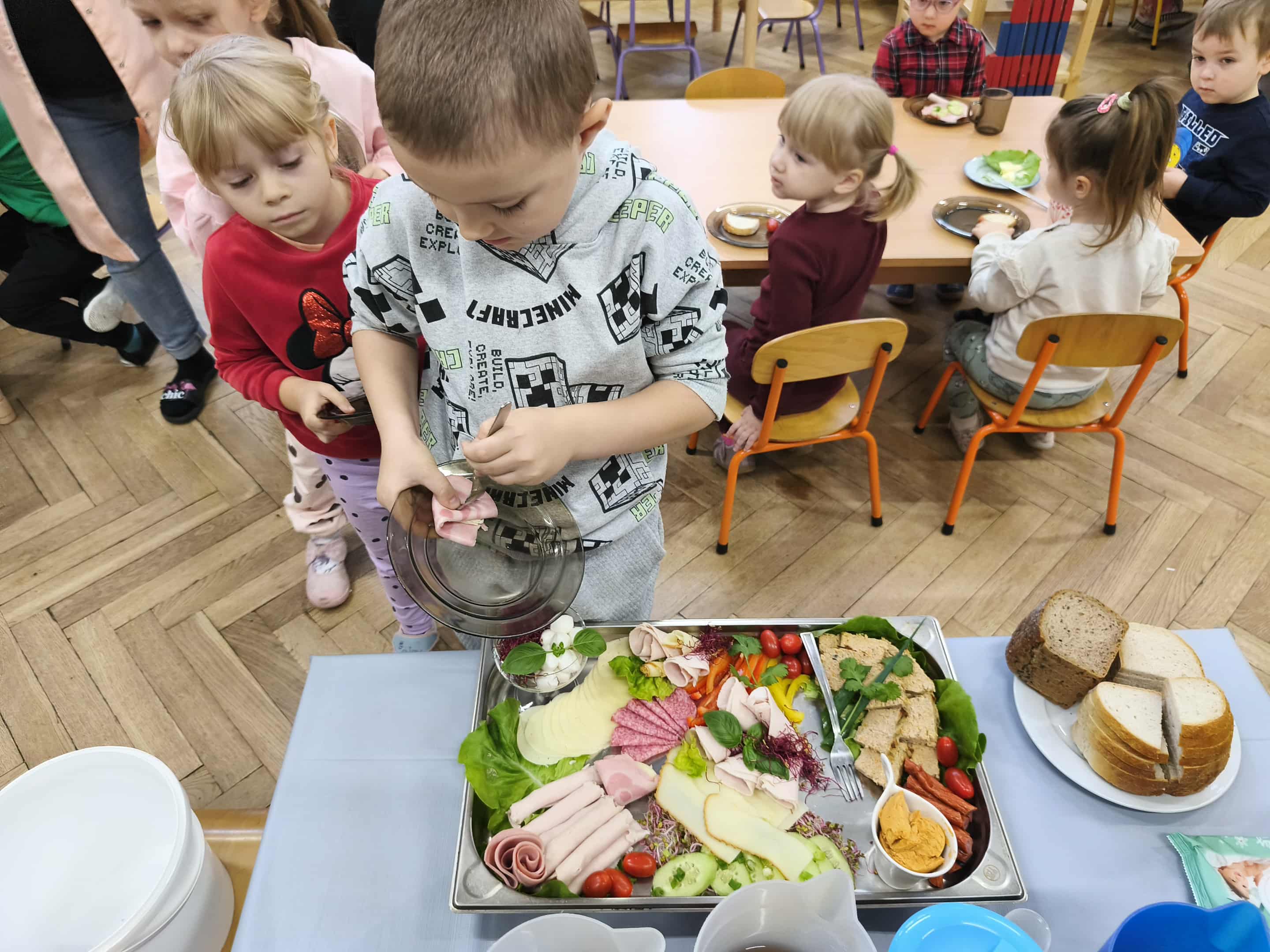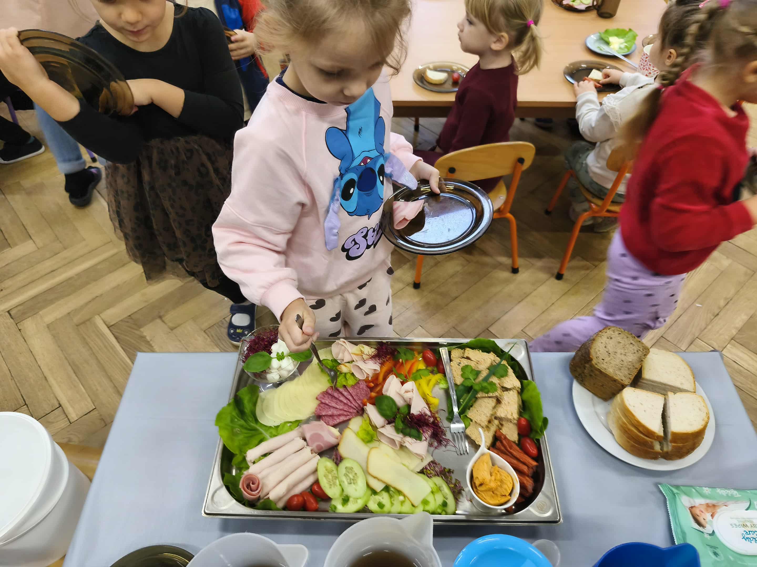 Od miesiąca października co czwartek nasze śniadania będą podawane w postaci szwedzkiego stołu. Dzieci podczas niego będą ćwiczyć oraz doskonalić swoją sprawność manualną - smarując samodzielnie chleb masłem. Wszystkim bardzo taki sposób podania się podoba, gdyż mają oni wtedy wybór i samodzielnie decydują, o tym co zjedzą.