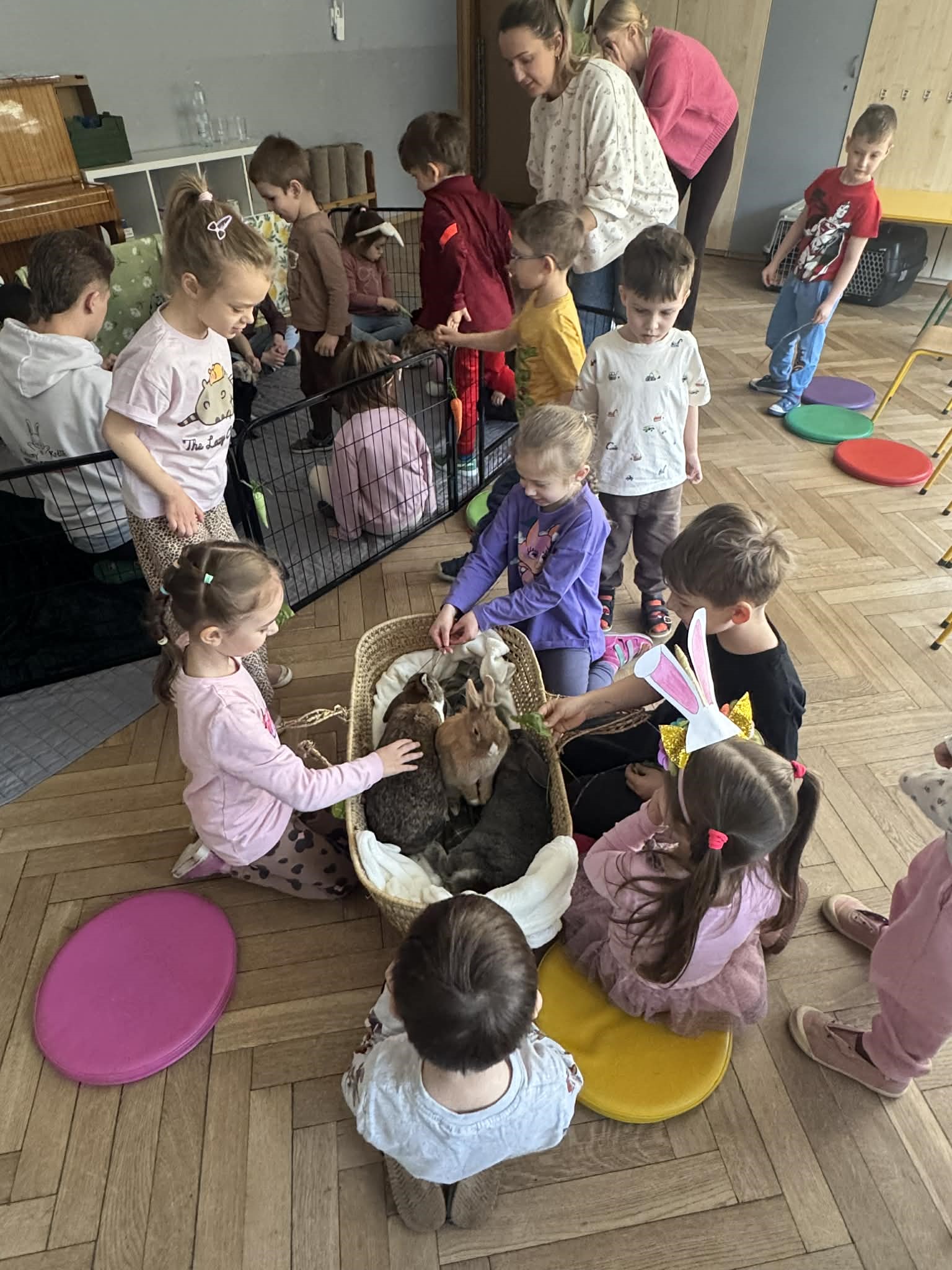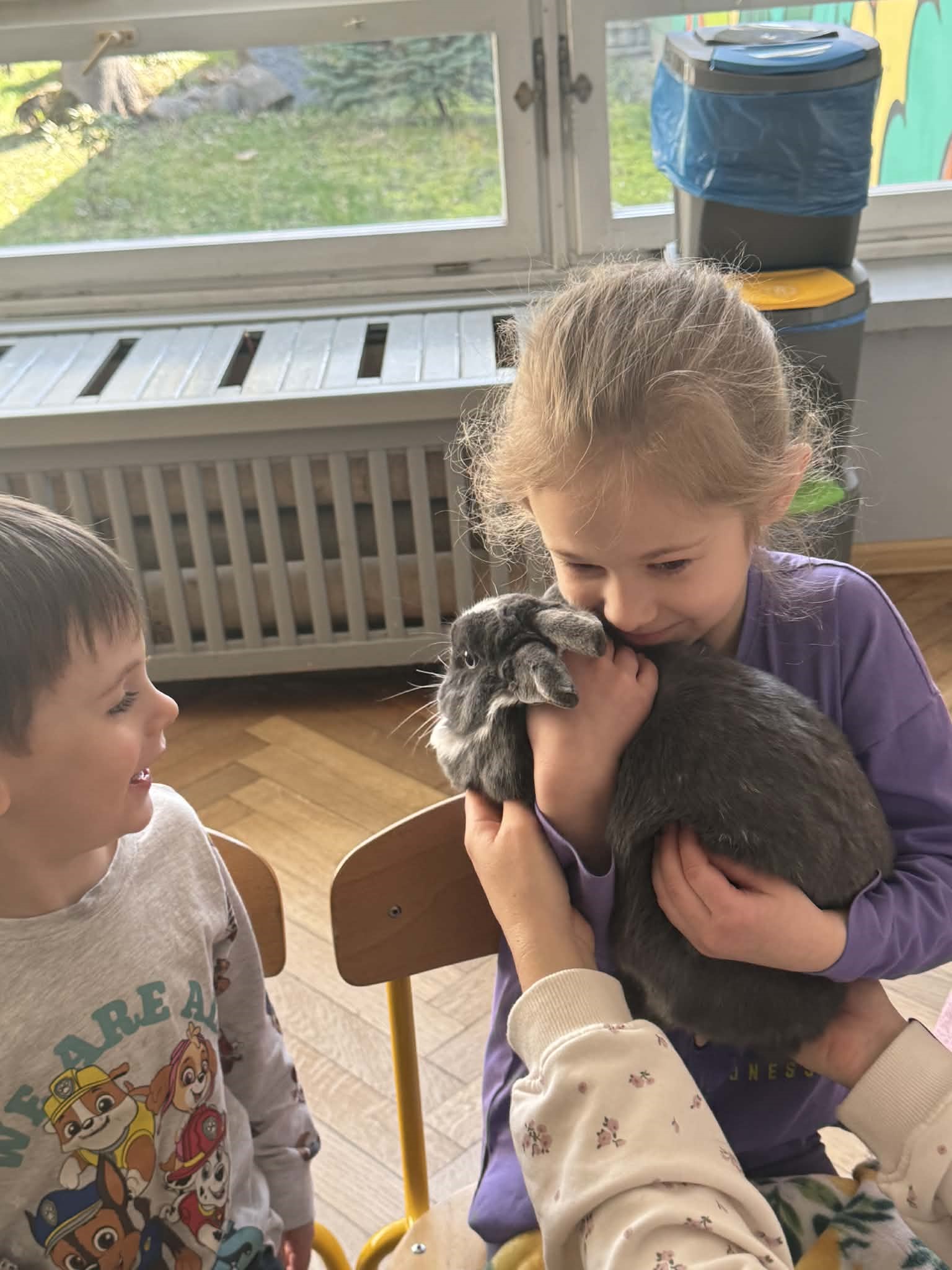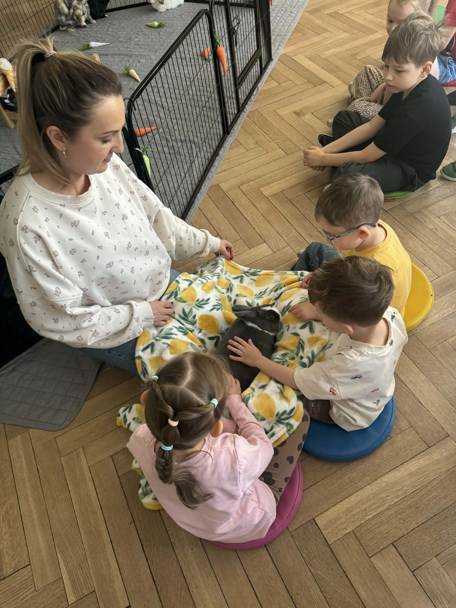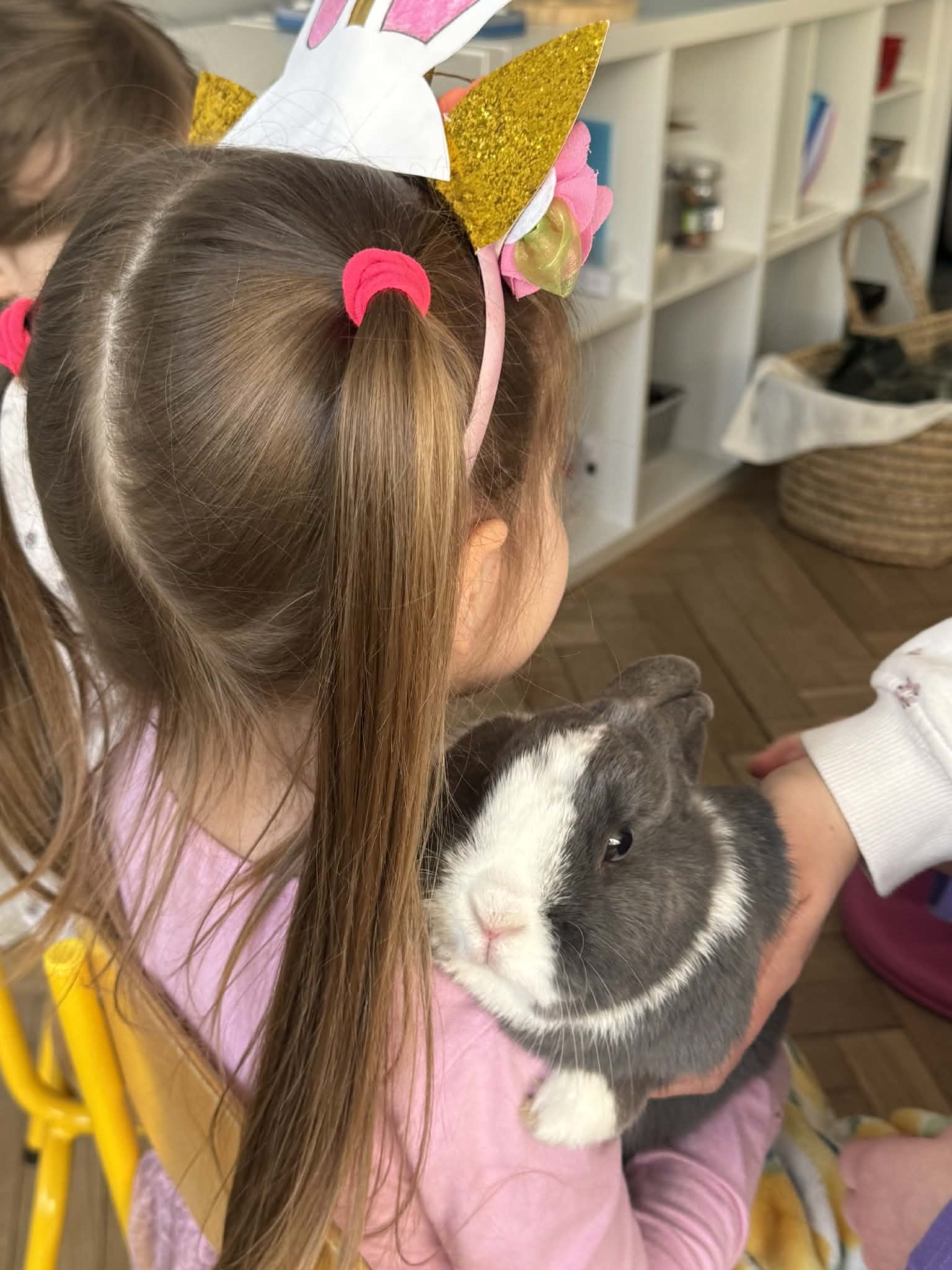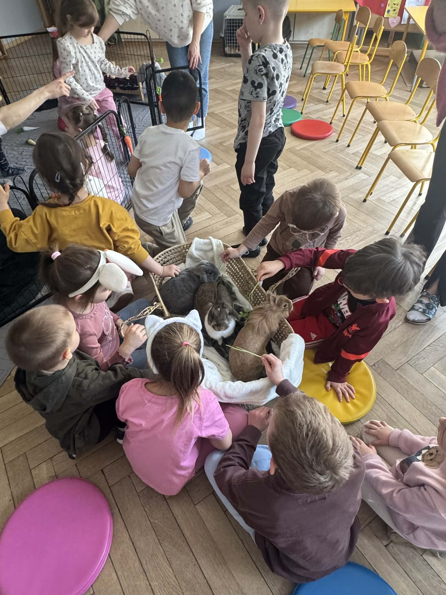Dziś dzieci miały okazje spotkać się z cudownymi, puchatymi królikami. Podczas warsztatów dowiedziały się jak żyją króliki, co lubią a czego nie, czym można je karmić i jak lubią spędzać czas. Dodatkowo mogły wziąć je na ręce, pogłaskać i przytulić się do nich. Każde dziecko miało innego faworyta. Trudno powiedzieć, który z nich był najfajniejszy.