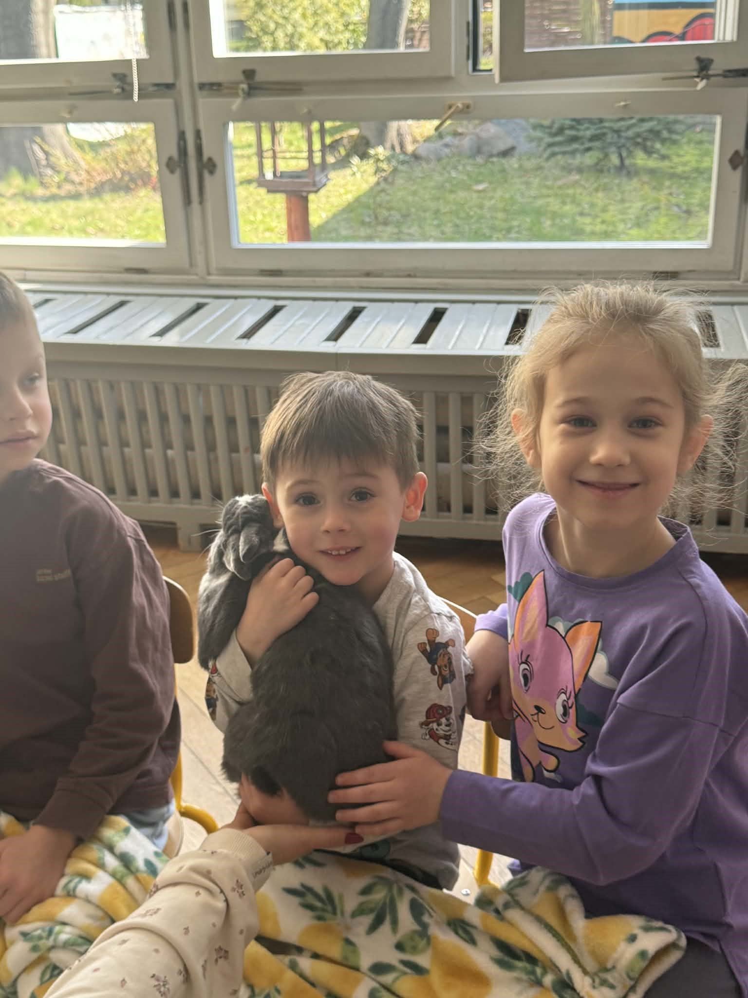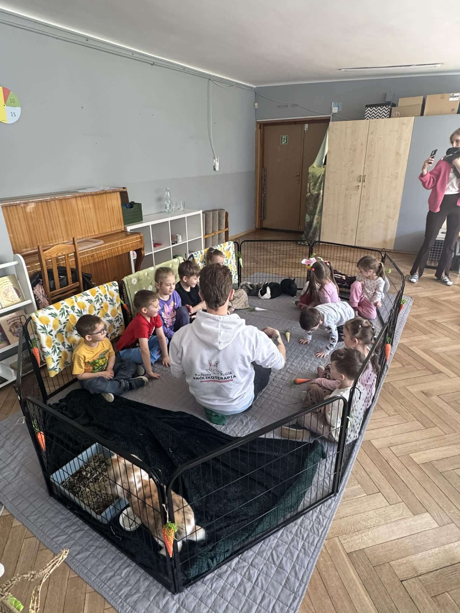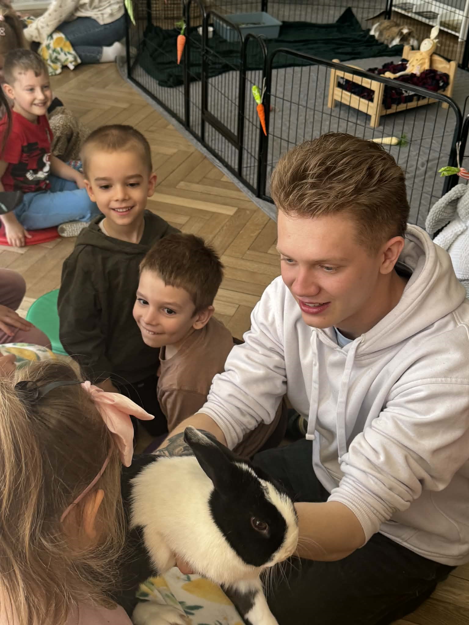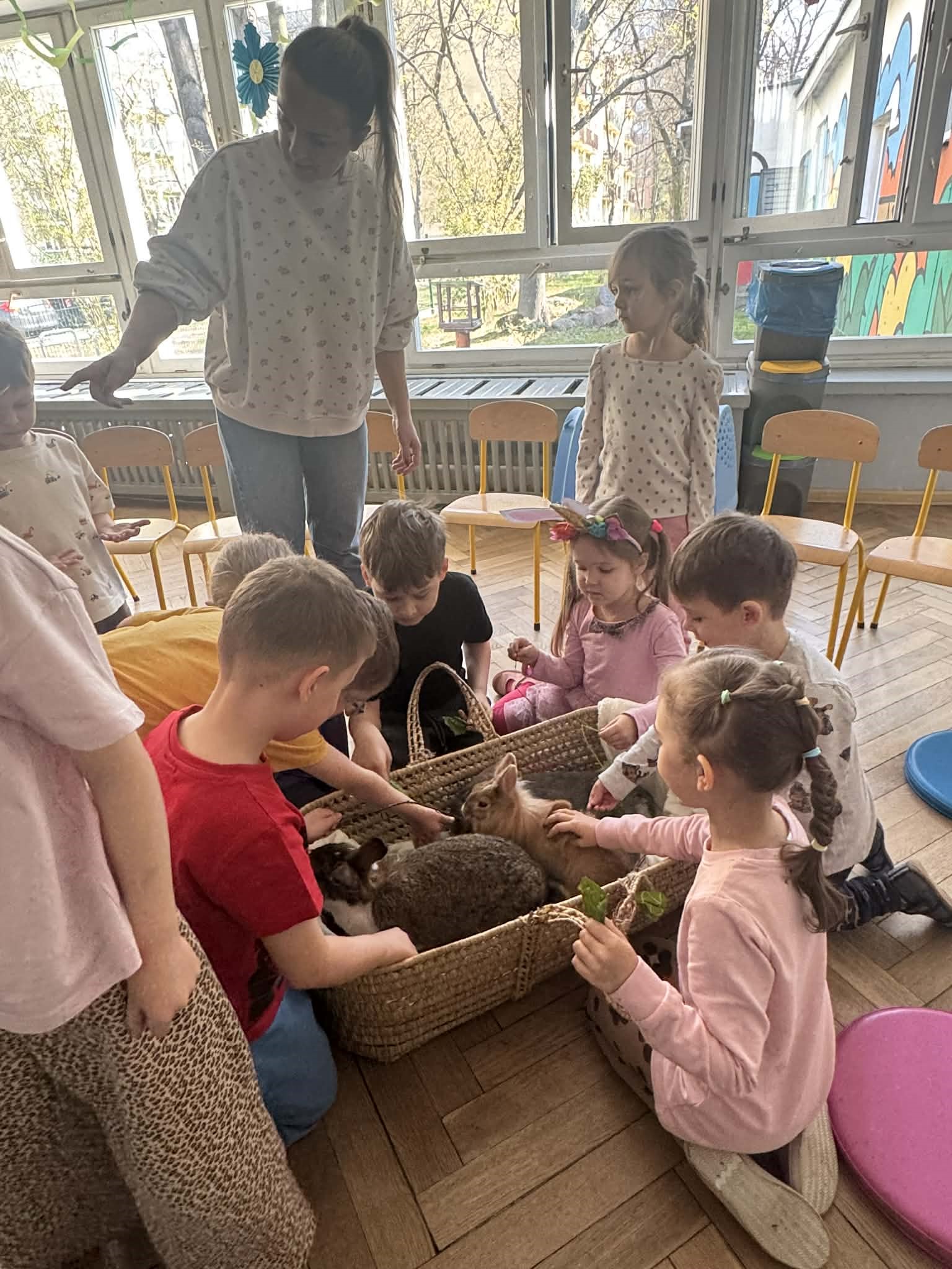 Dziś dzieci miały okazje spotkać się z cudownymi, puchatymi królikami. Podczas warsztatów dowiedziały się jak żyją króliki, co lubią a czego nie, czym można je karmić i jak lubią spędzać czas. Dodatkowo mogły wziąć je na ręce, pogłaskać i przytulić się do nich. Każde dziecko miało innego faworyta. Trudno powiedzieć, który z nich był najfajniejszy.