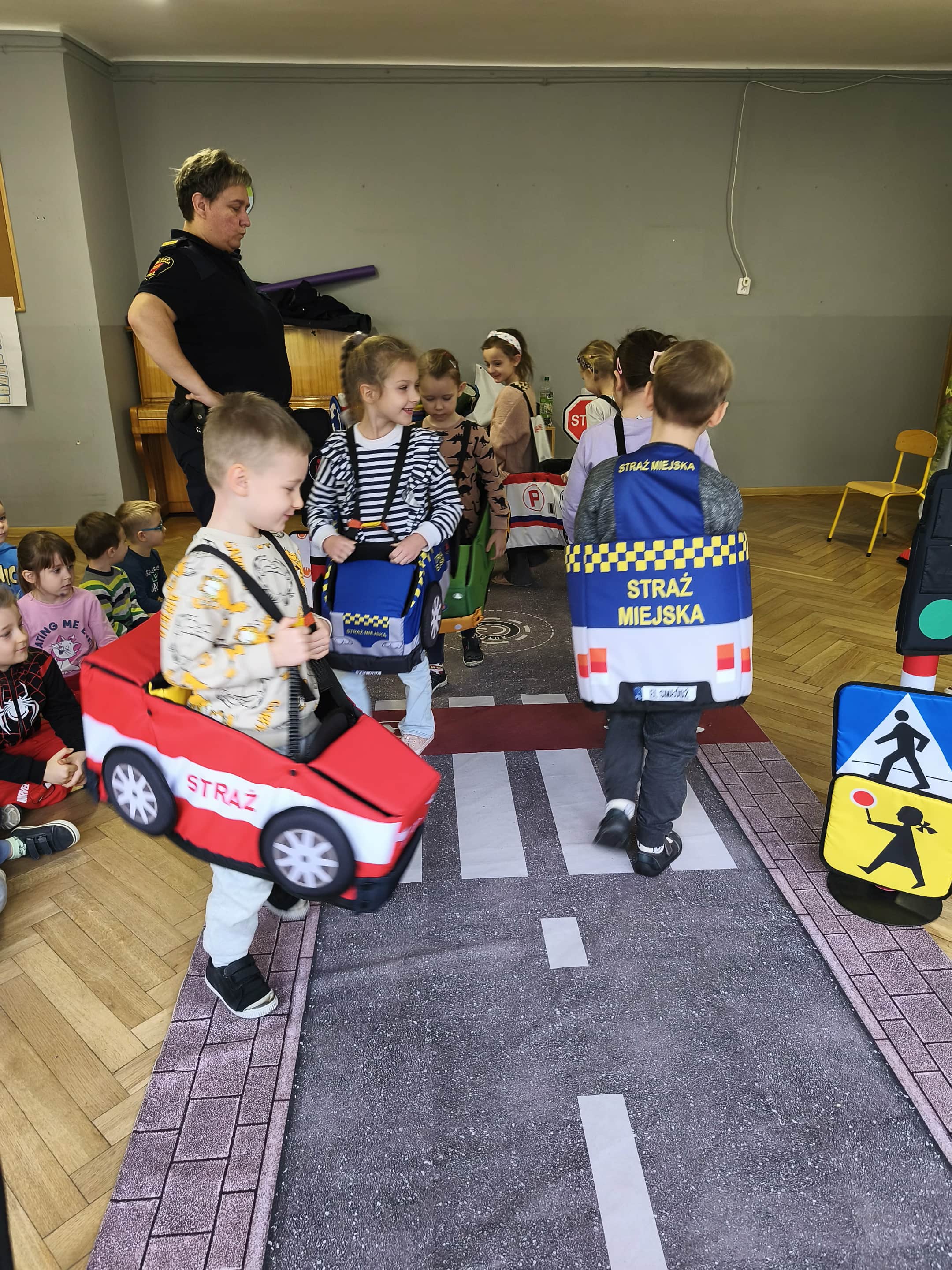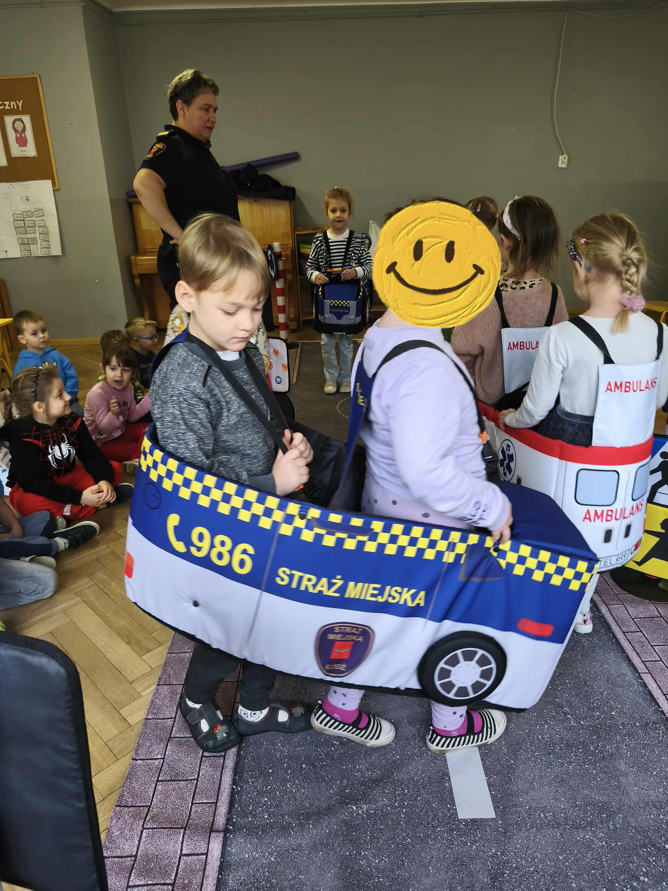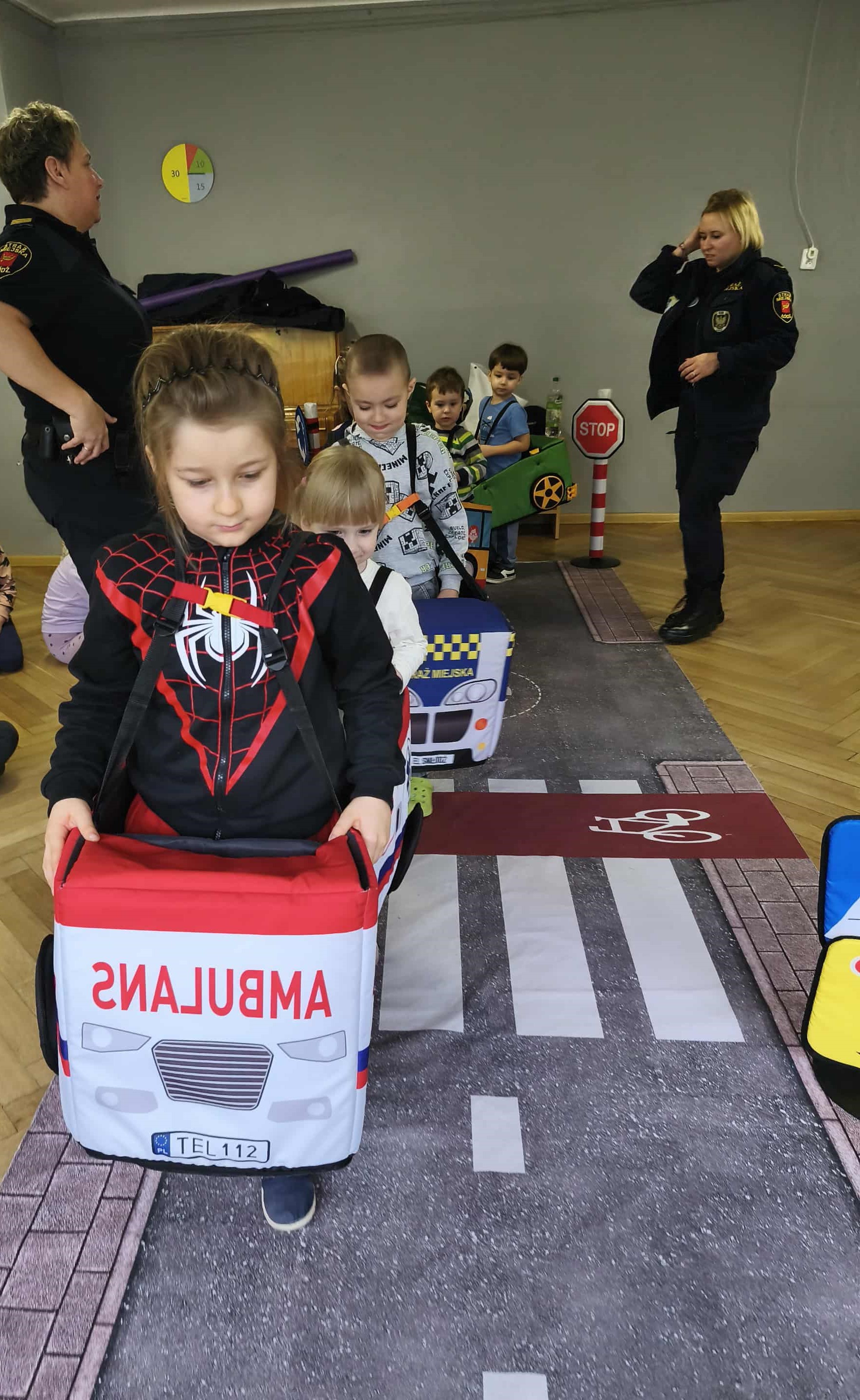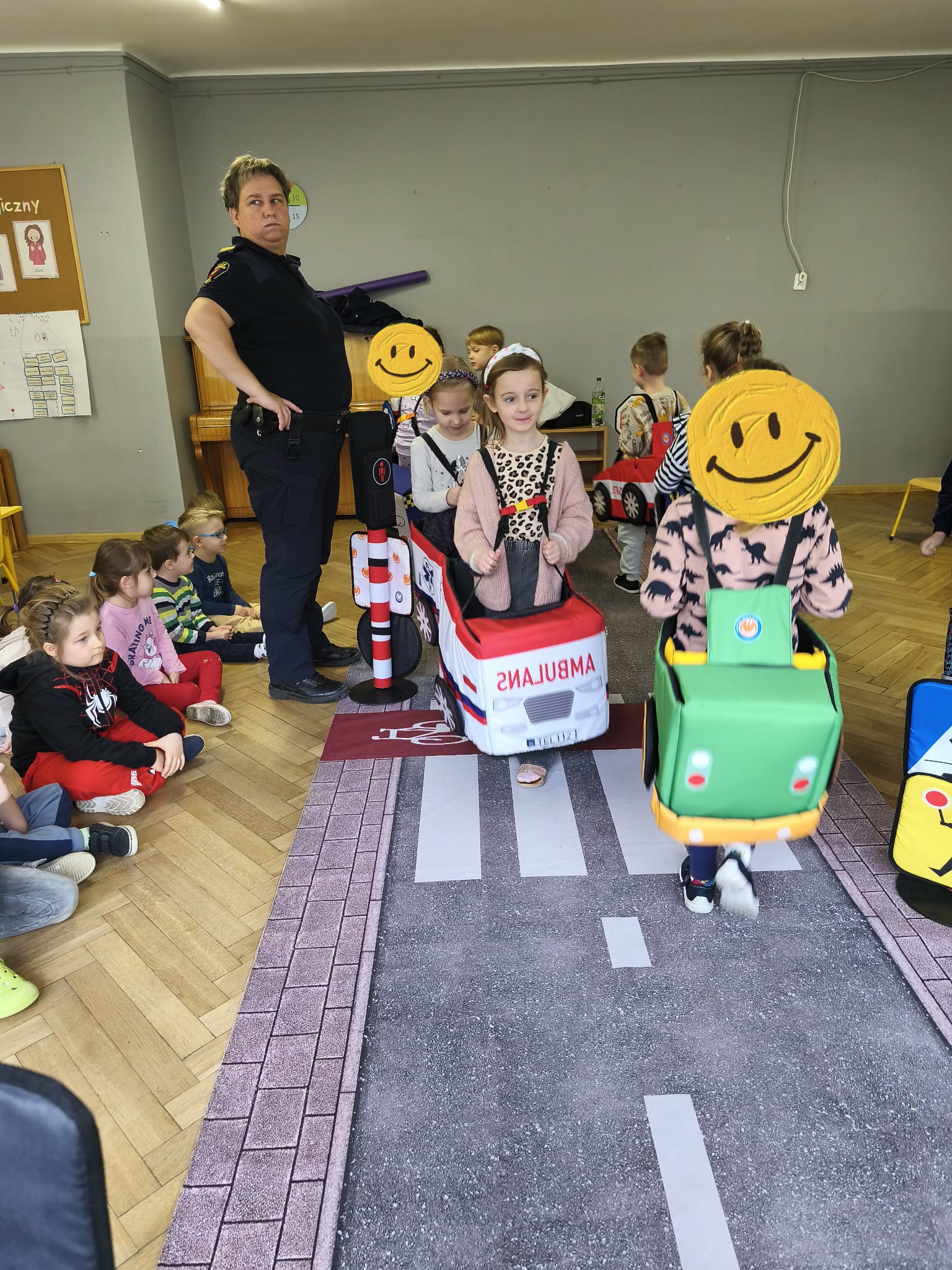 Dzisiejszego dnia zaraz po śniadaniu uczestniczyliśmy w zajęciach edukacyjnych o tematyce "Bezpieczny Przedszkolak". Zajęcia prowadziły dwie panie ze Straży Miejskiej w Łodzi. Odpowiadaliśmy na pytania dotyczące nie tylko bezpieczeństwa na drodze, ale także bezpieczeństwa w domu, na placu zabaw, podczas pobytu np. z rodzicami w sklepie - gdy się zgubimy, itp. Wiedzieliśmy, że np. z obcą osobą nie możemy rozmawiać, wziąć od niej cukierka. Na zakończenie przypomnieliśmy sobie bezpieczeństwo w ruchu drogowym. Mieliśmy możliwość bycia autami jeżdżącymi po drodze i pieszymi przechodzącymi przez ulicę. Wymagało to od nas wielkiego skupienia, koncentracji i obserwacji zmieniających się świateł.