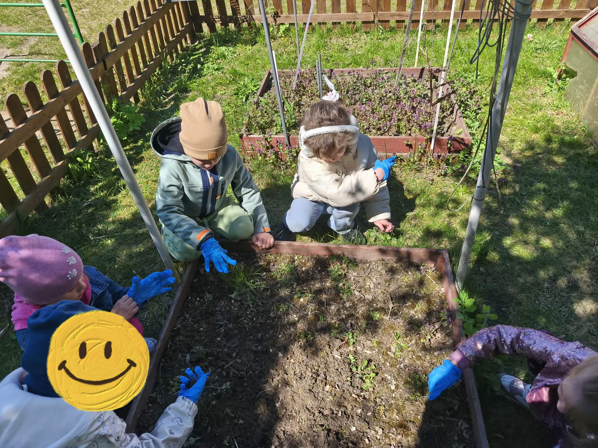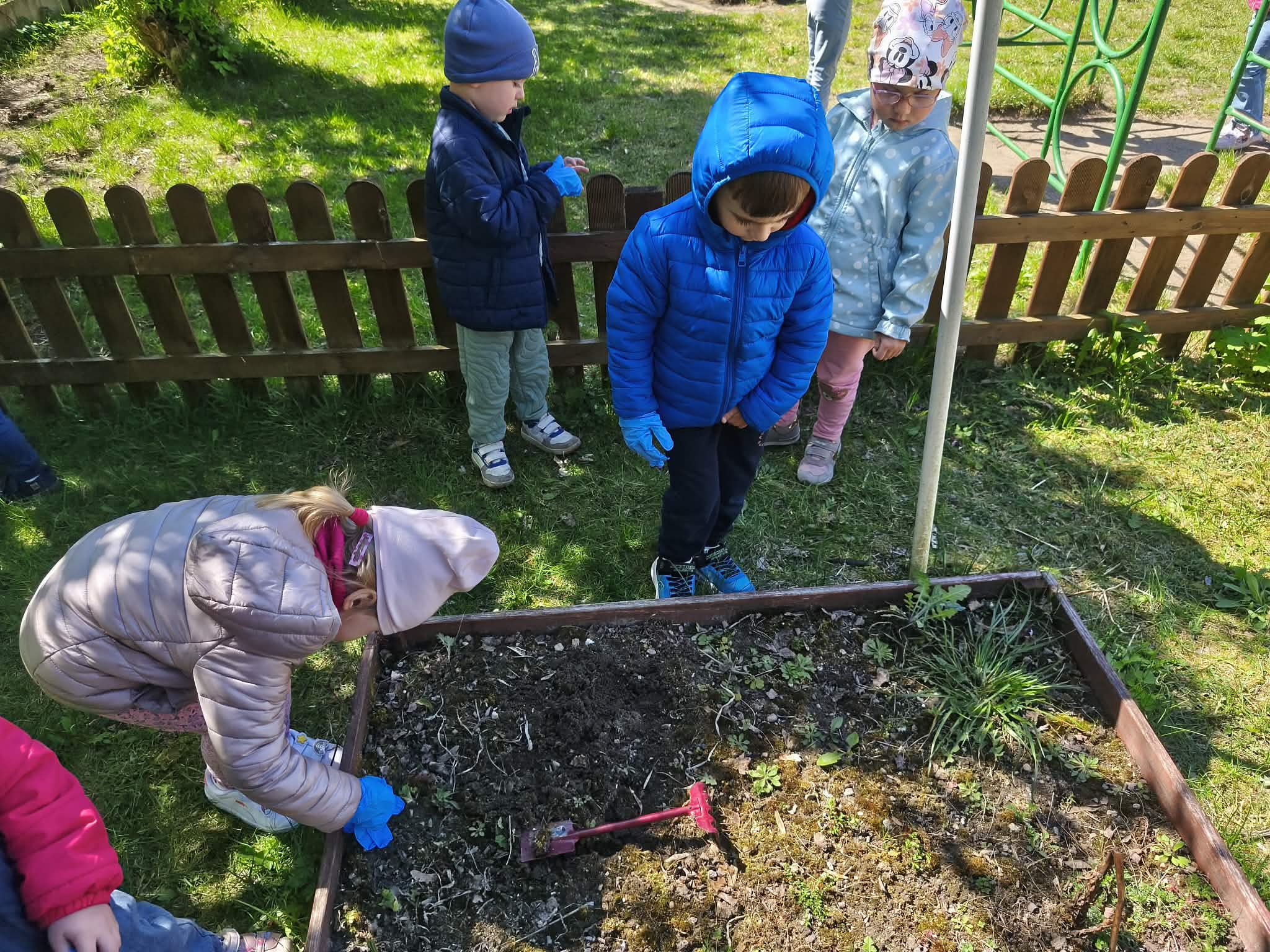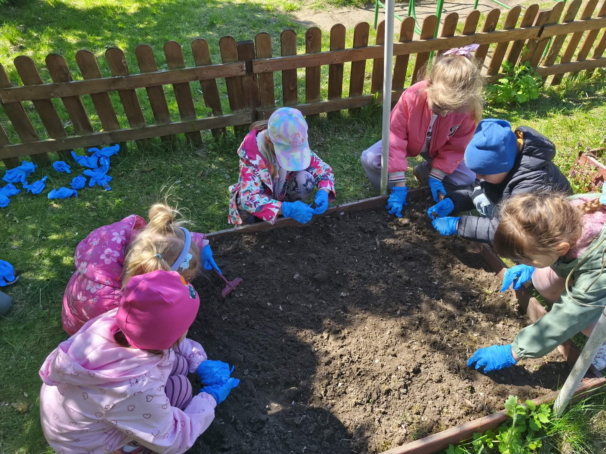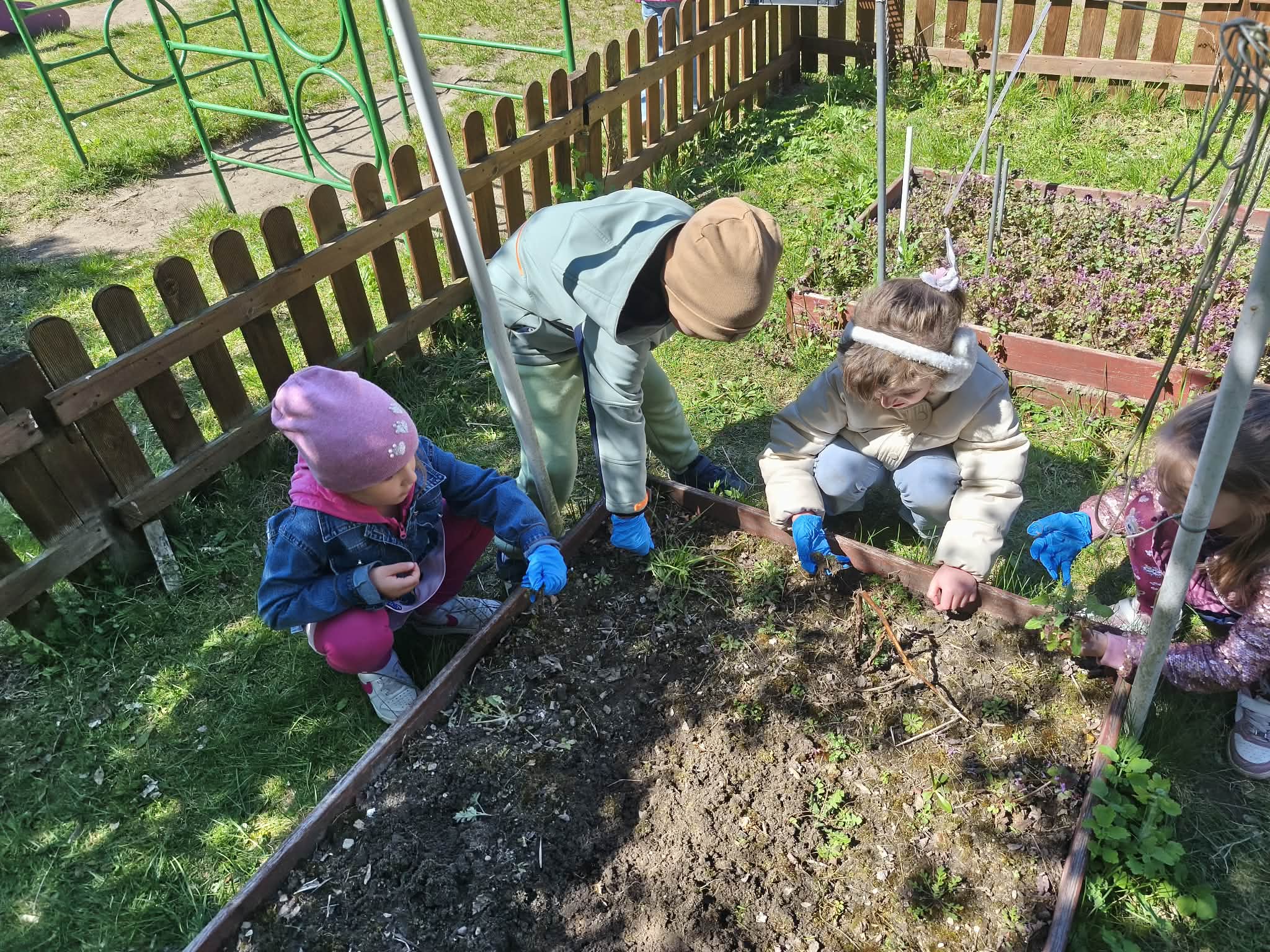 Teorię natychmiast przekuliśmy w praktykę. W ramach dbania o czystość naszej planety ruszyliśmy do ogródka, gdzie wspólnie pieliliśmy chwasty, trawę i mech. Dzięki pracowitym rączkom dzieci nasz zielony zakątek odzyskał blask, a przedszkolaki dowiedziały się, że każdy, nawet najmniejszy gest, ma ogromne znaczenie dla dobra Ziemi.