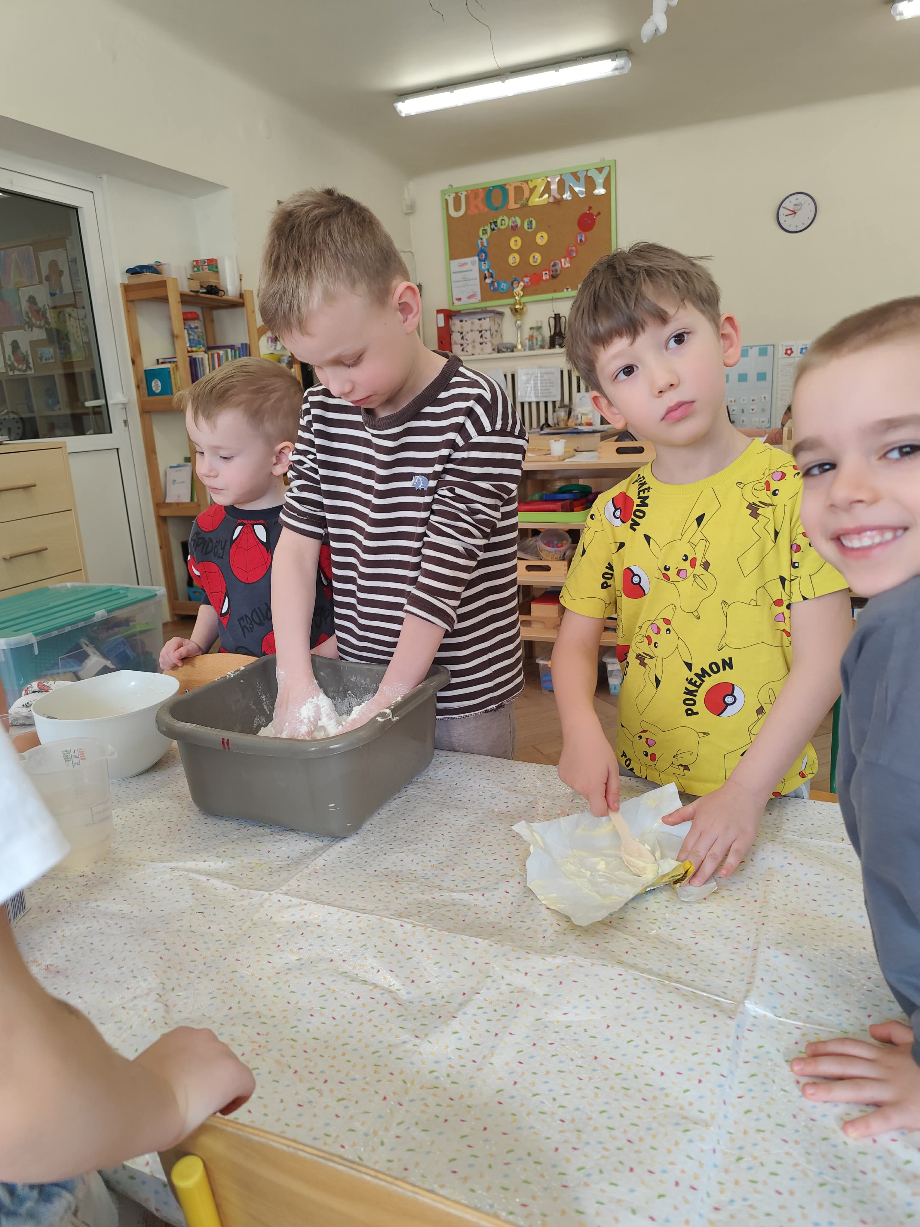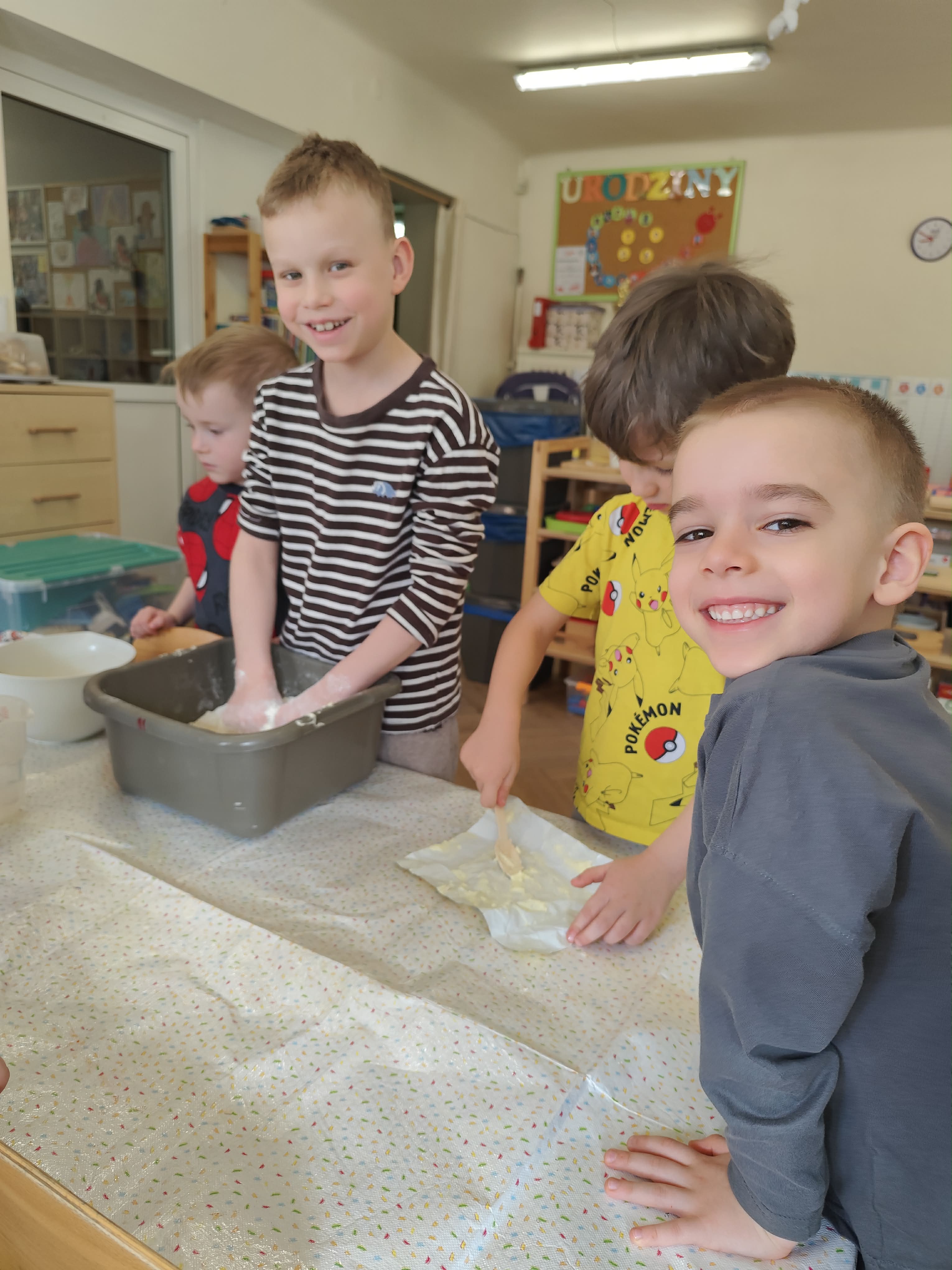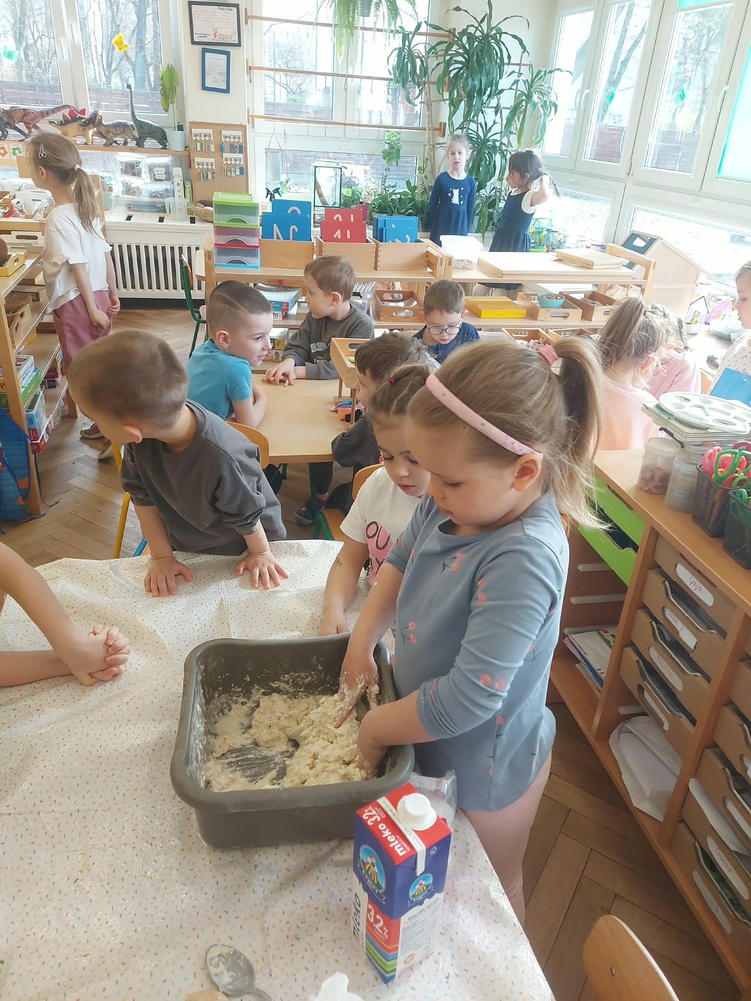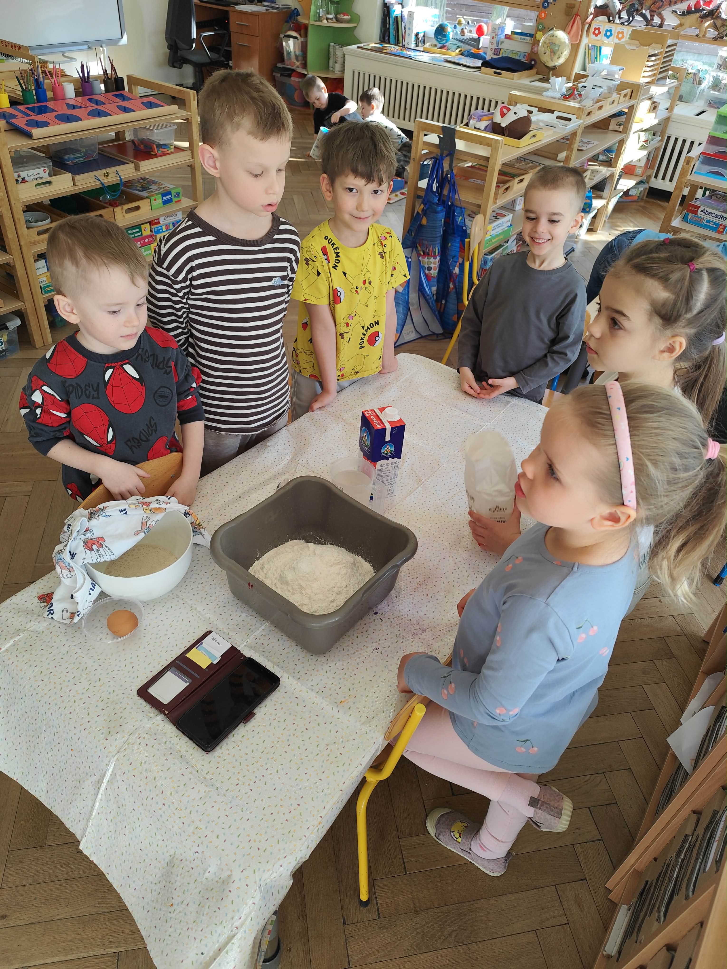 W okresie przygotowań do Świąt Wielkanocnych w naszym przedszkolu pielęgnujemy piękne, polskie tradycji. Jedną z nich jest wypiek chleba do koszyczka wielkanocnego, który symbolizuje dostatek ,dobrobyt i ciężką pracę. Podczas zajęć dzieci miały okazję poznać proces poznawania chleba, odmierzały składniki, wyrabiały ciasto, formowały małe bochenki. Obierały słonecznik do posypania. Po upieczeniu dzieci miały okazję pobawić się w sklep. Przypomnieliśmy sobie nazwę - piekarnia, była kasa, pieniądze do płacenia. Gotowe wypieki dzieci zabrały do domu do koszyczka wielkanocnego.
