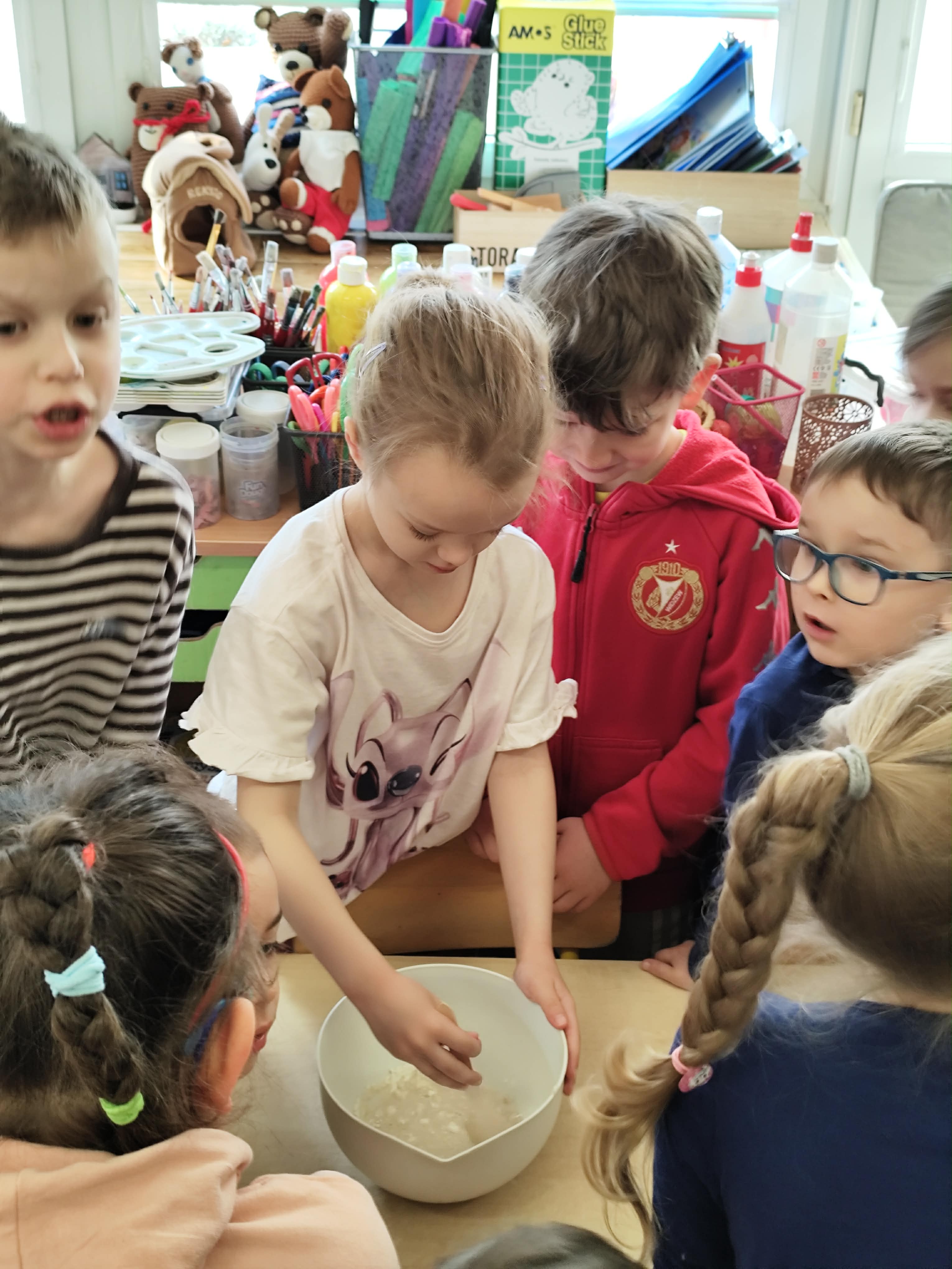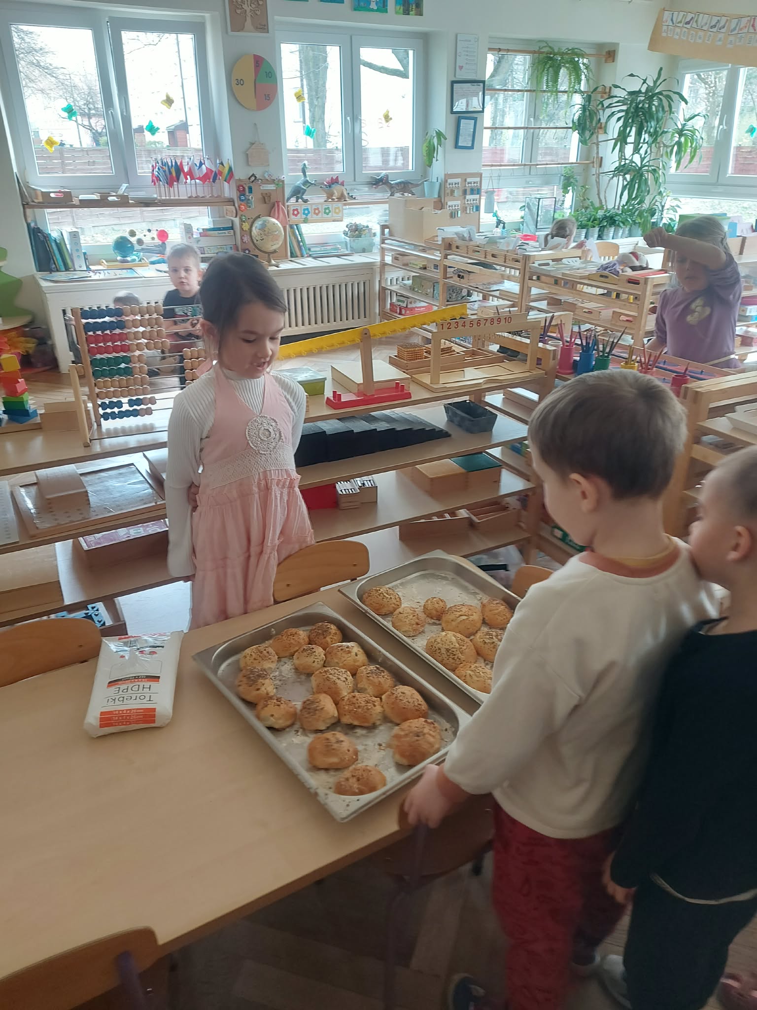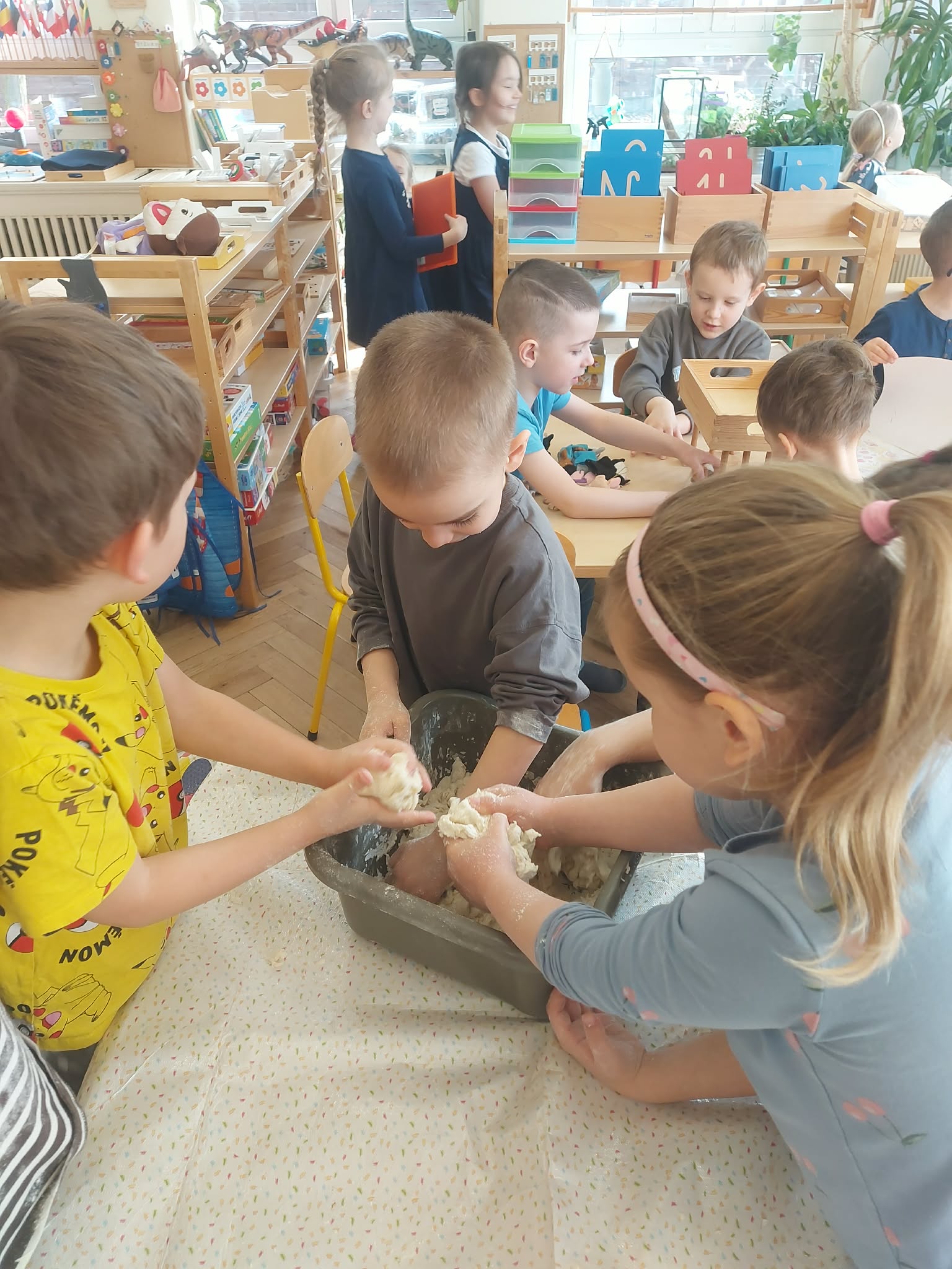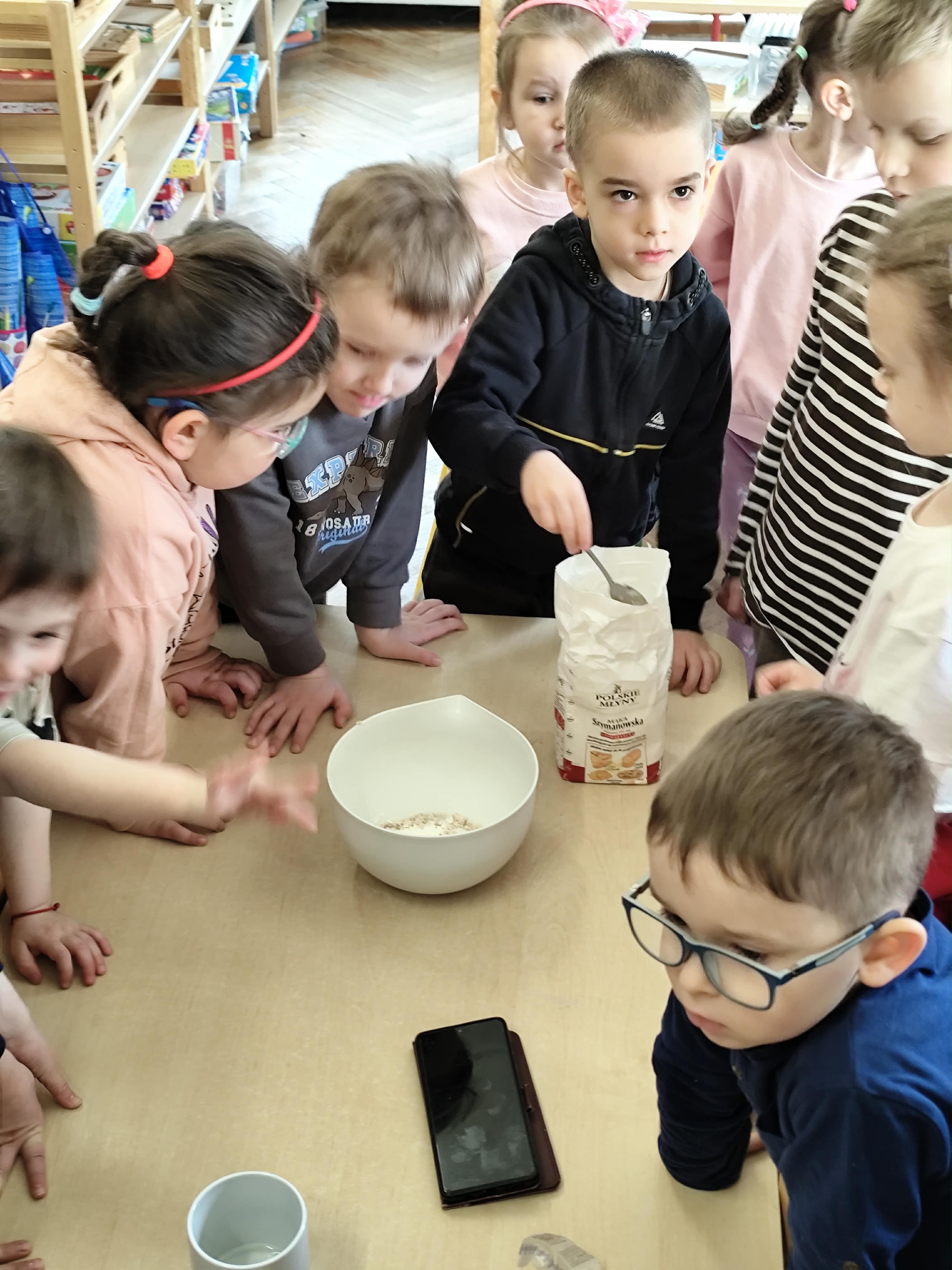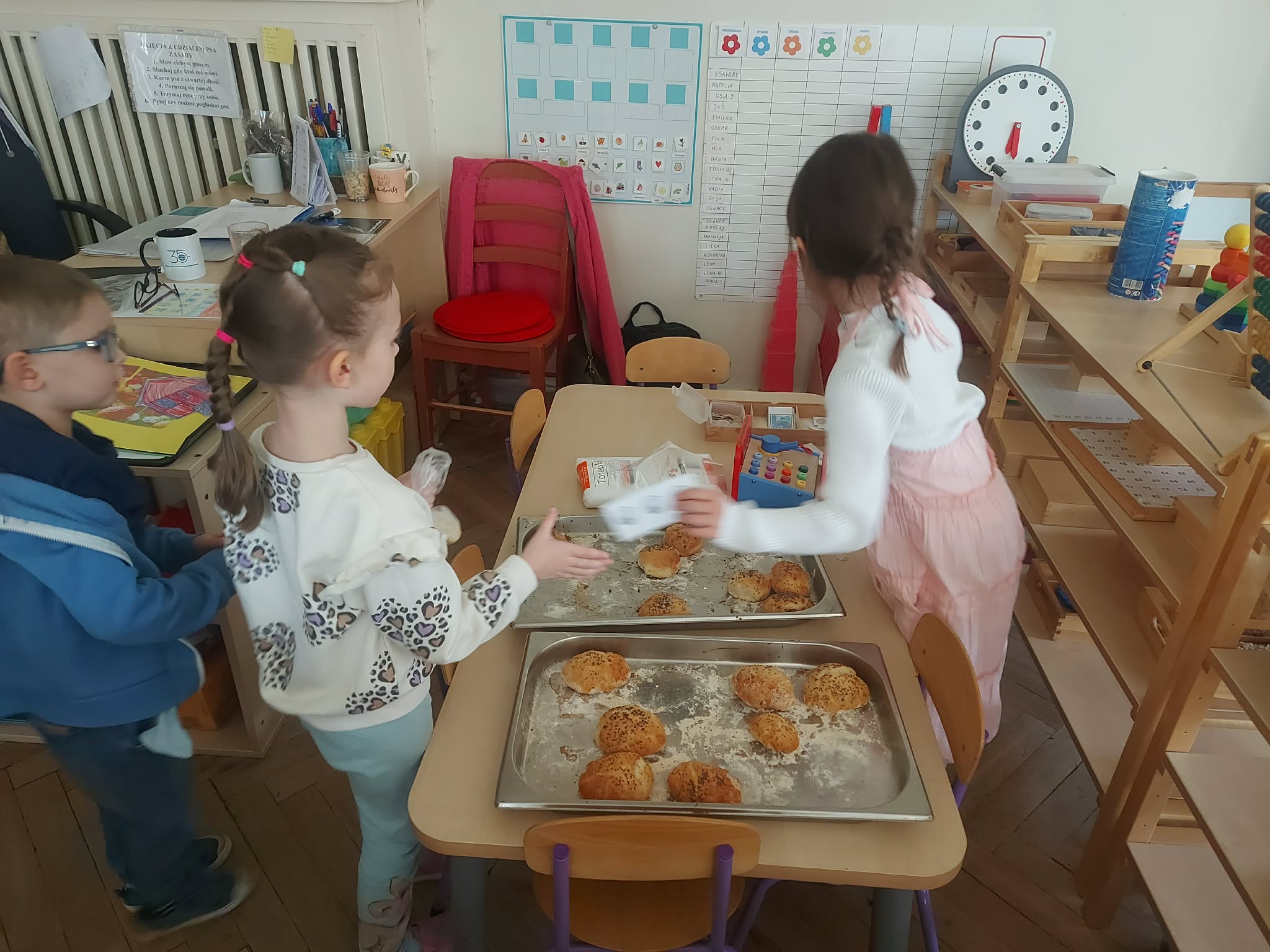 W okresie przygotowań do Świąt Wielkanocnych w naszym przedszkolu pielęgnujemy piękne, polskie tradycji. Jedną z nich jest wypiek chleba do koszyczka wielkanocnego, który symbolizuje dostatek ,dobrobyt i ciężką pracę. Podczas zajęć dzieci miały okazję poznać proces poznawania chleba, odmierzały składniki, wyrabiały ciasto, formowały małe bochenki. Obierały słonecznik do posypania. Po upieczeniu dzieci miały okazję pobawić się w sklep. Przypomnieliśmy sobie nazwę - piekarnia, była kasa, pieniądze do płacenia. Gotowe wypieki dzieci zabrały do domu do koszyczka wielkanocnego.