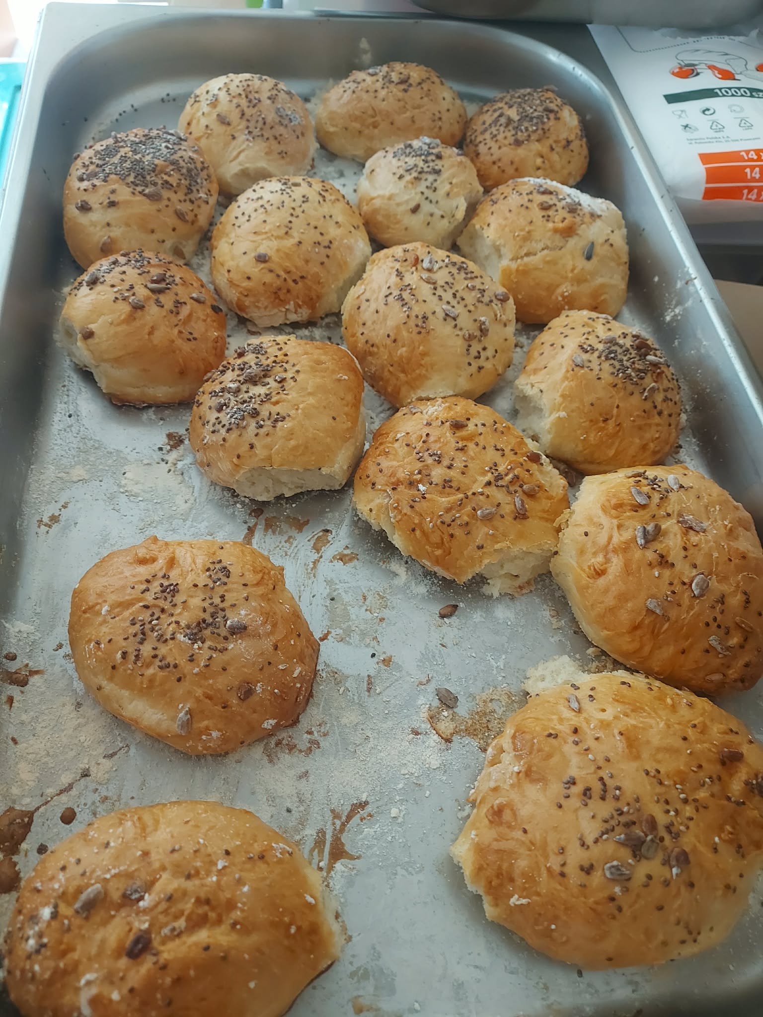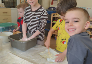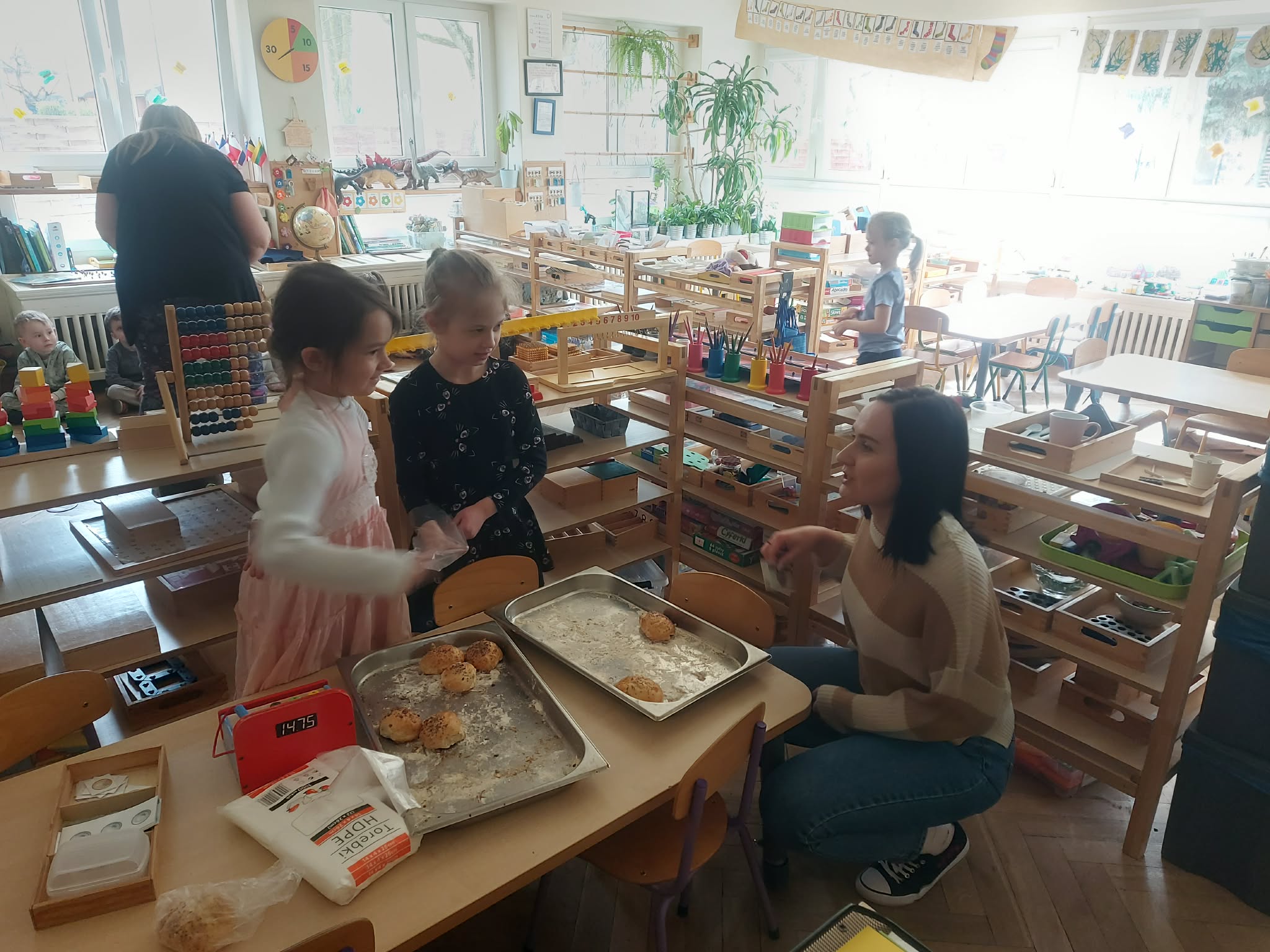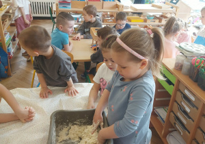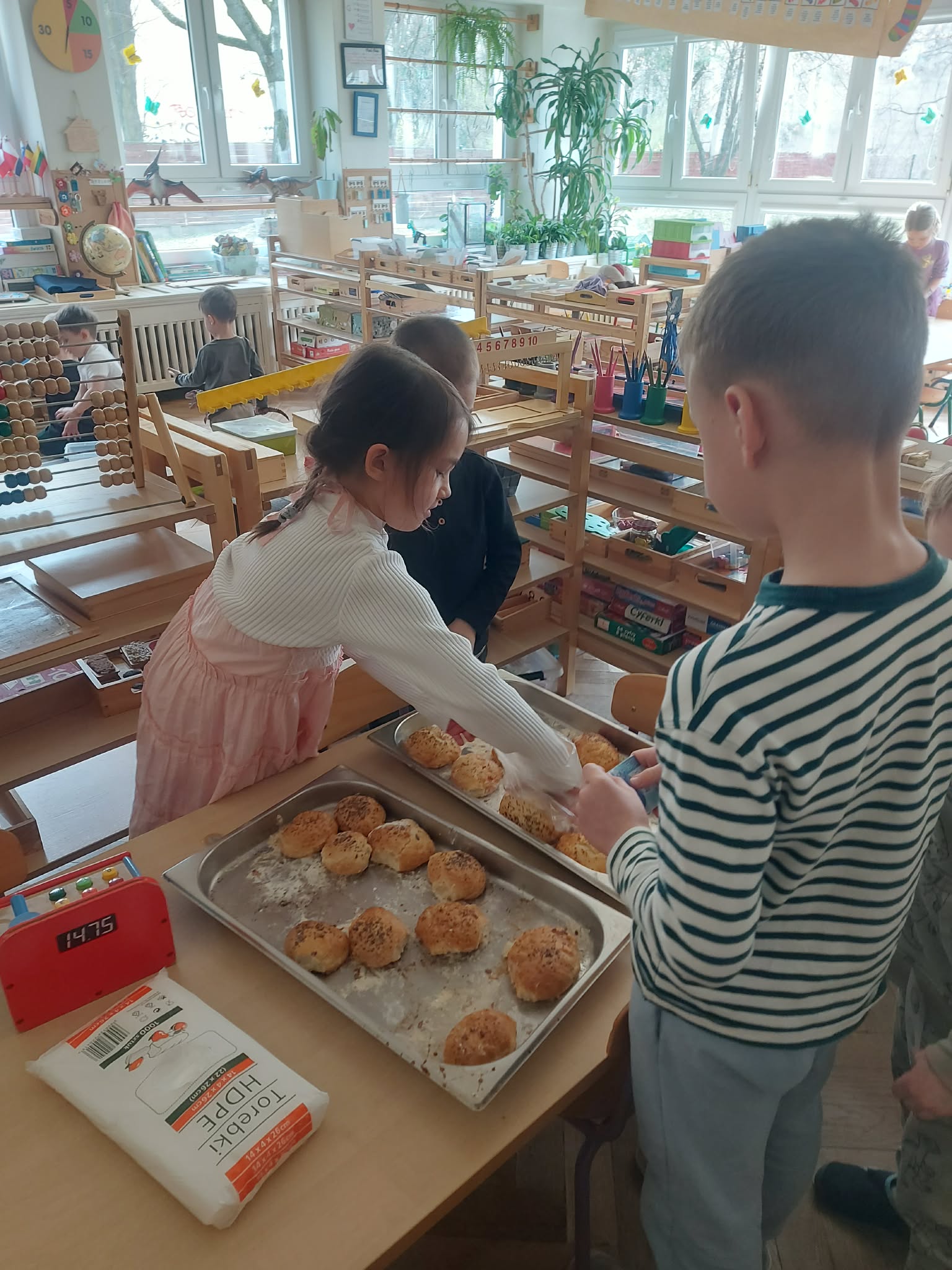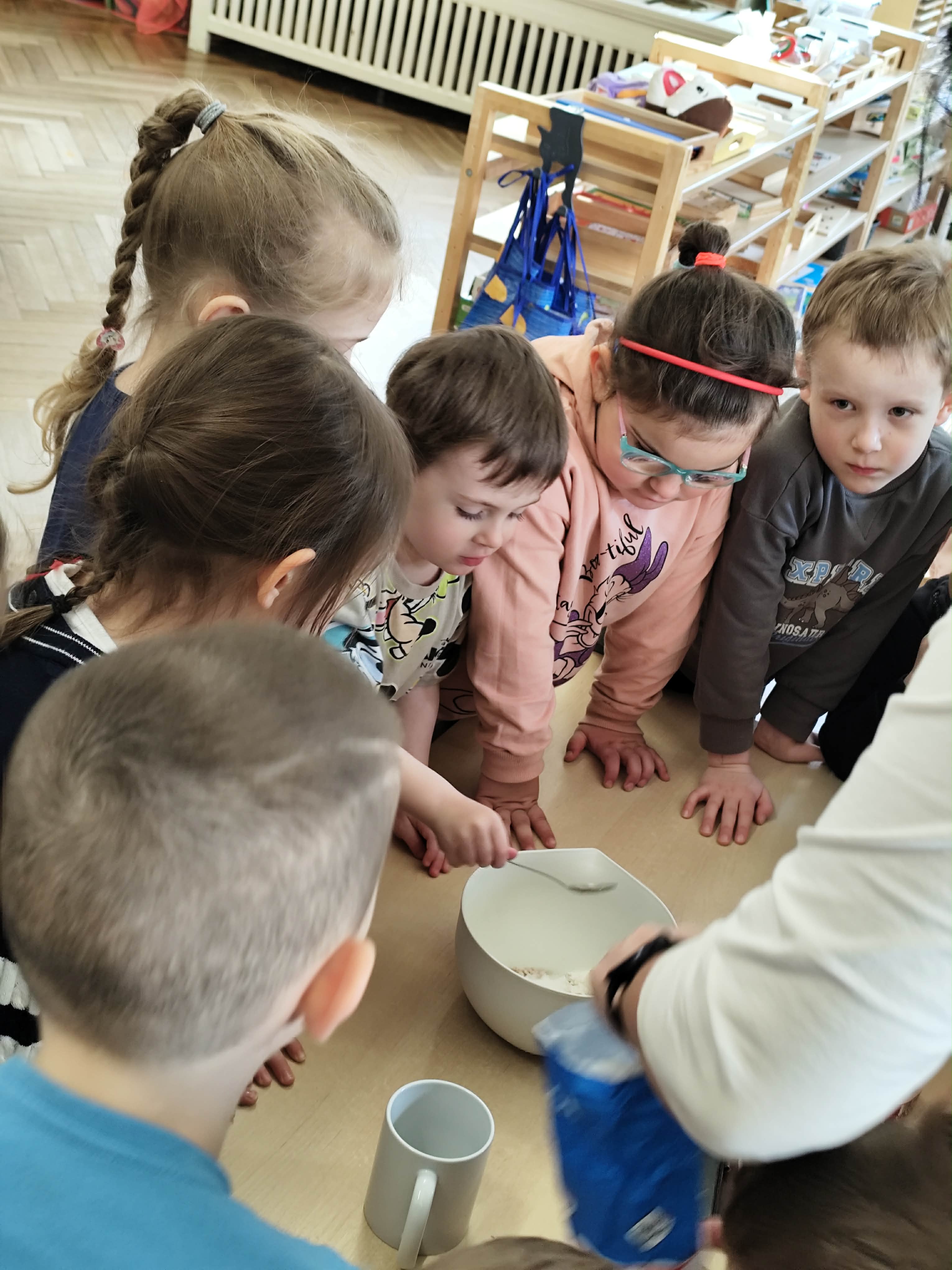 W okresie przygotowań do Świąt Wielkanocnych w naszym przedszkolu pielęgnujemy piękne, polskie tradycji. Jedną z nich jest wypiek chleba do koszyczka wielkanocnego, który symbolizuje dostatek ,dobrobyt i ciężką pracę. Podczas zajęć dzieci miały okazję poznać proces poznawania chleba, odmierzały składniki, wyrabiały ciasto, formowały małe bochenki. Obierały słonecznik do posypania. Po upieczeniu dzieci miały okazję pobawić się w sklep. Przypomnieliśmy sobie nazwę - piekarnia, była kasa, pieniądze do płacenia. Gotowe wypieki dzieci zabrały do domu do koszyczka wielkanocnego.