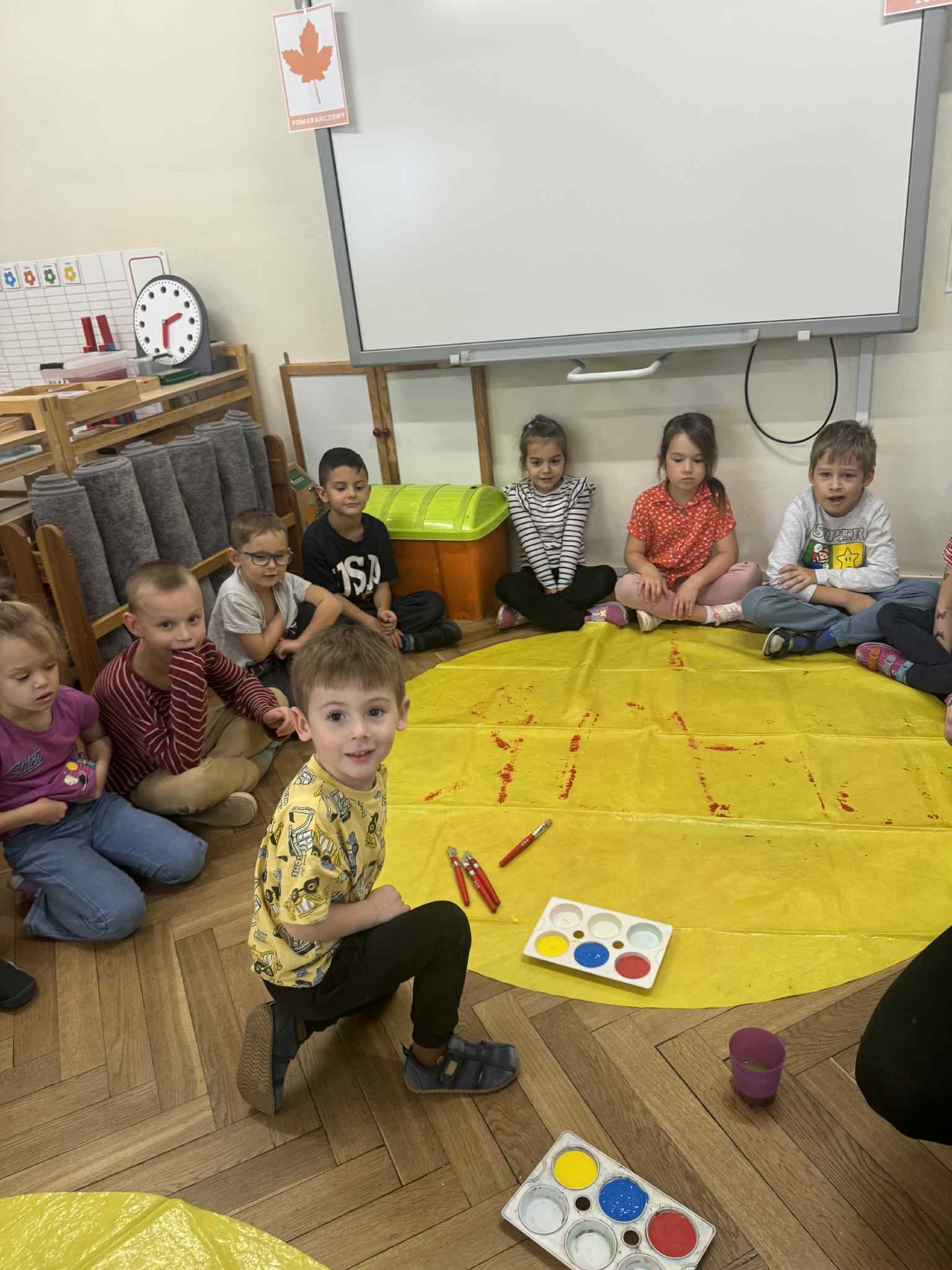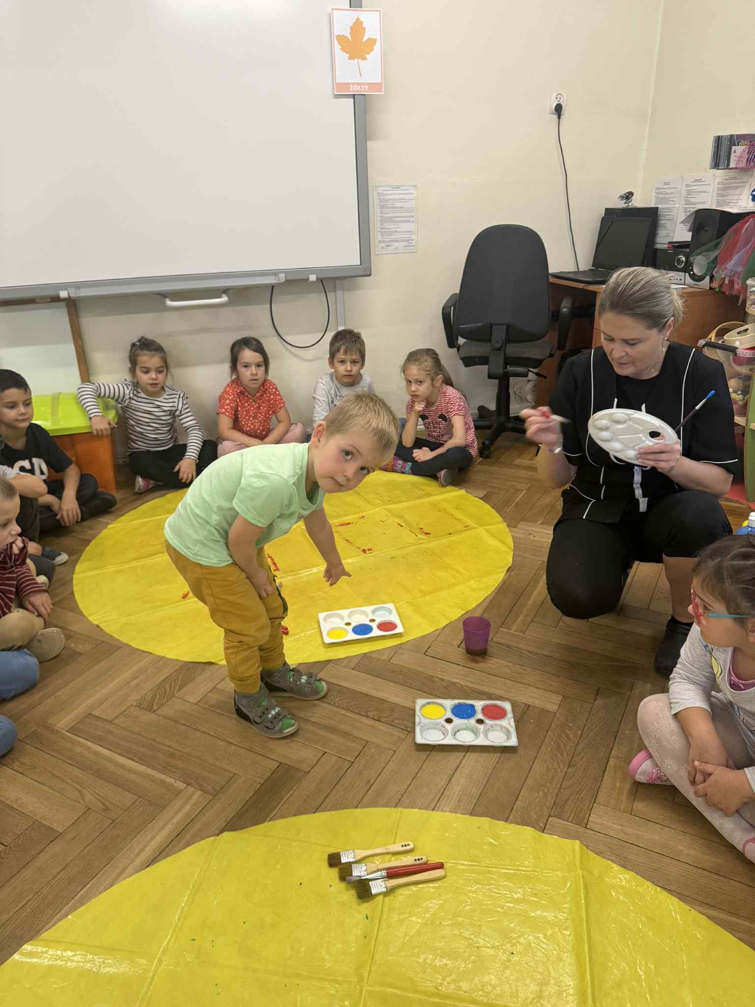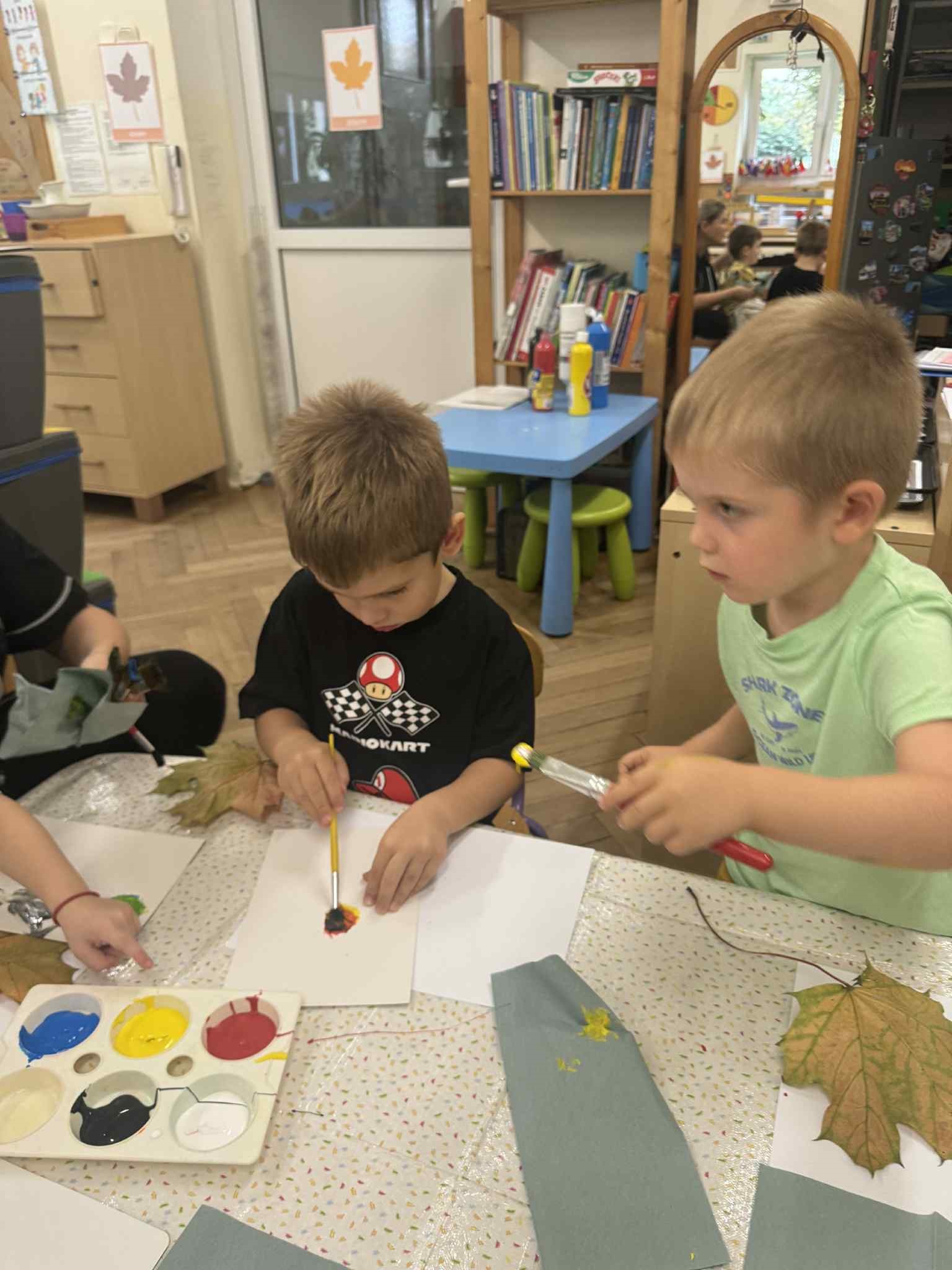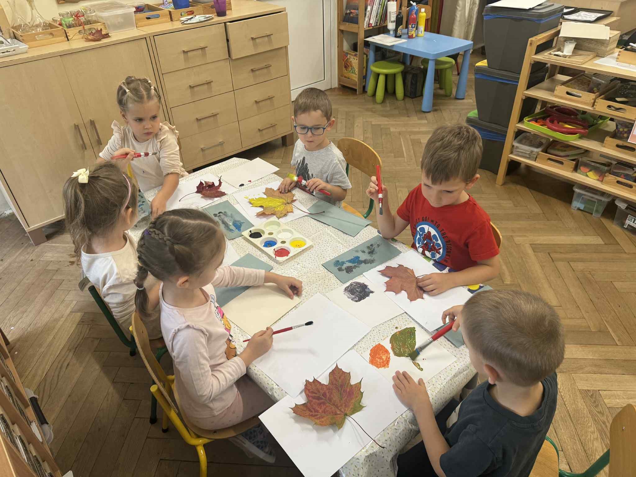 Zainspirowani kolorami jesieni, postanowiliśmy sami je stworzyć. Każdy zamienił się w Artystę i wykorzystując różne barwy, tworzył własne. Następnie malowaliśmy nimi liście, które odciskaliśmy na kartonie. Powstałe dzieła udekorowały naszą salę. Przy okazji utrwalaliśmy kolory podstawowe i pochodne.