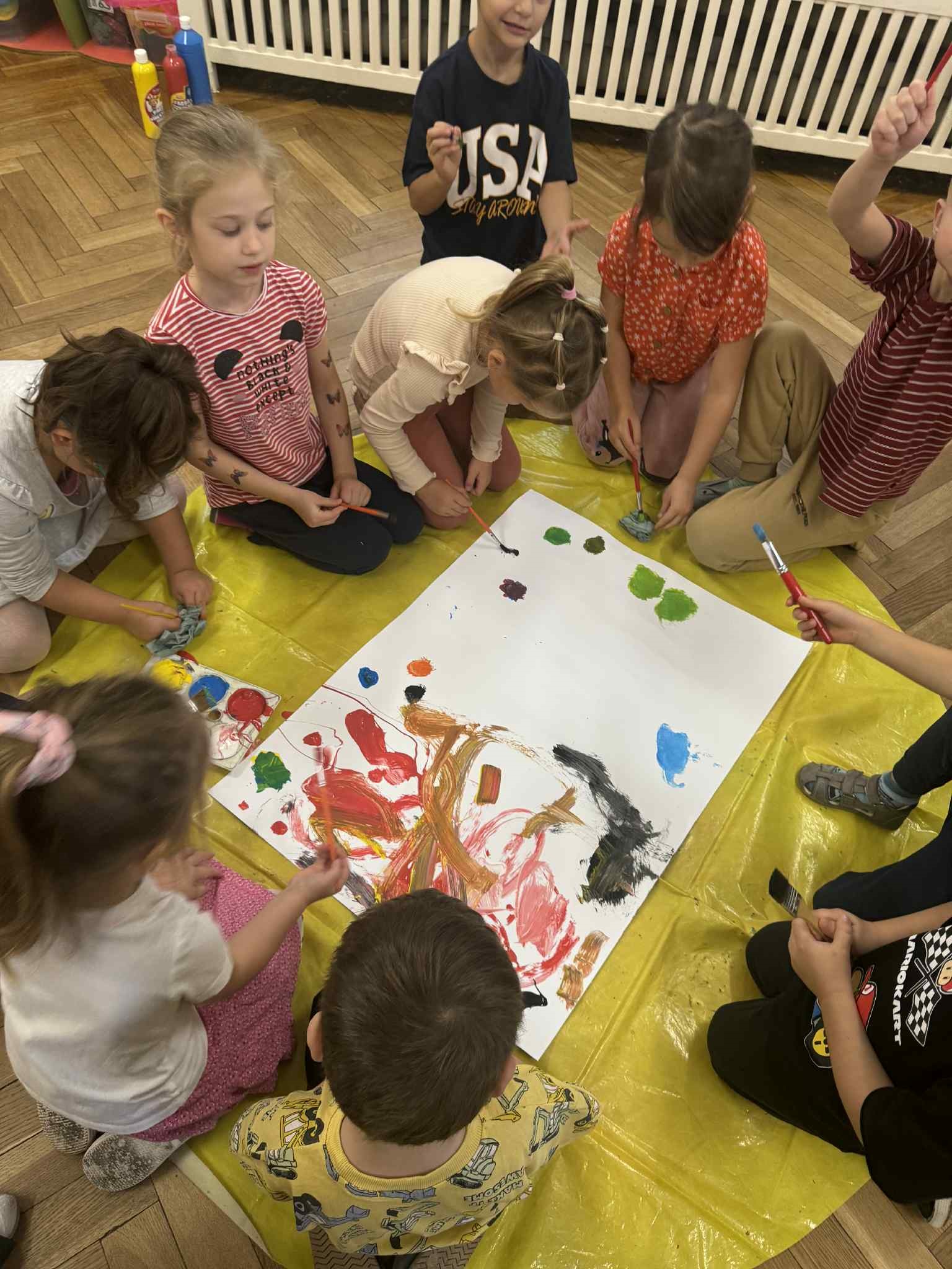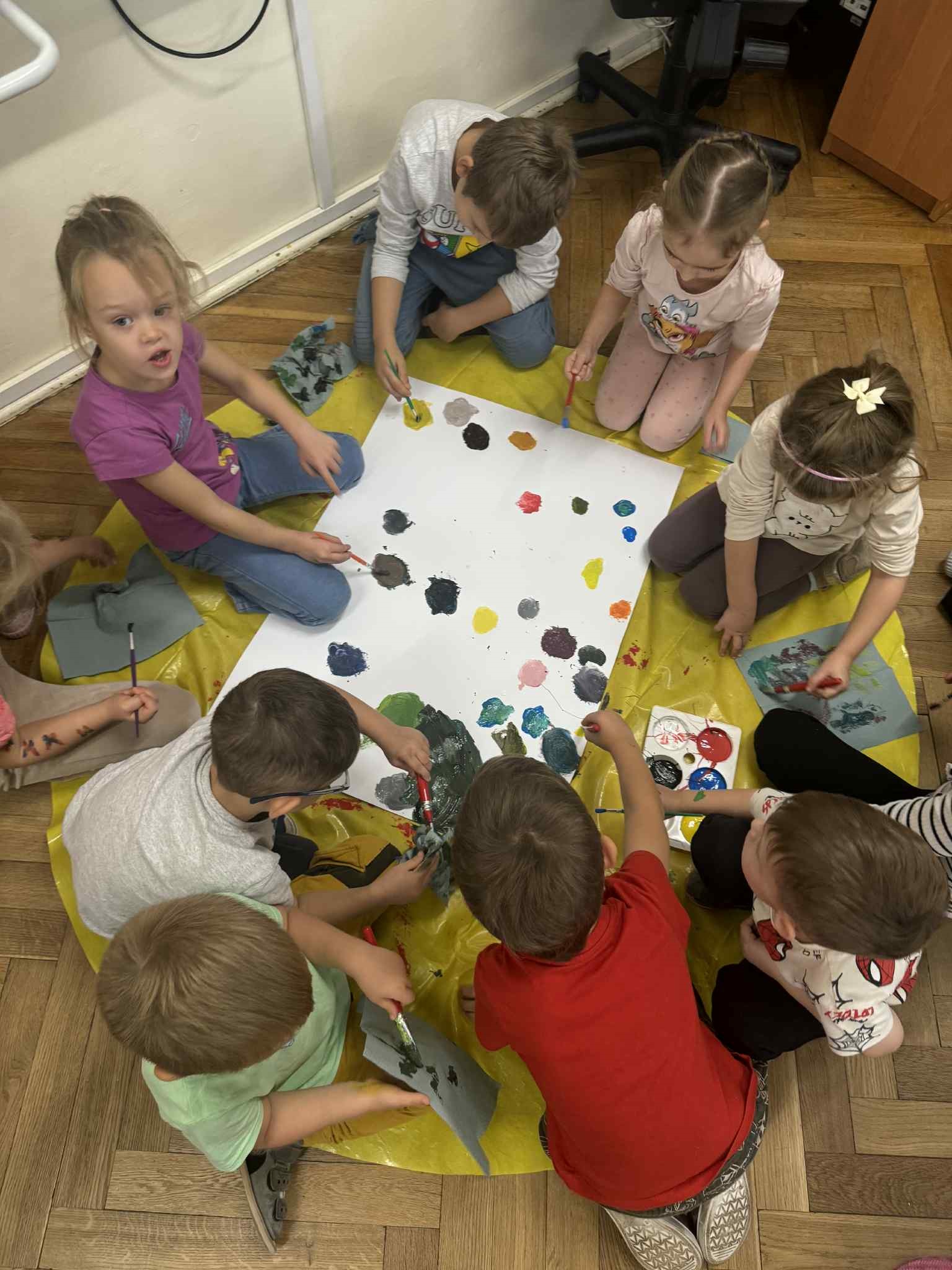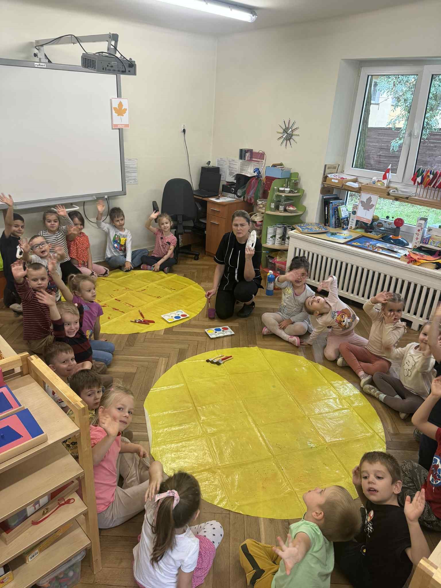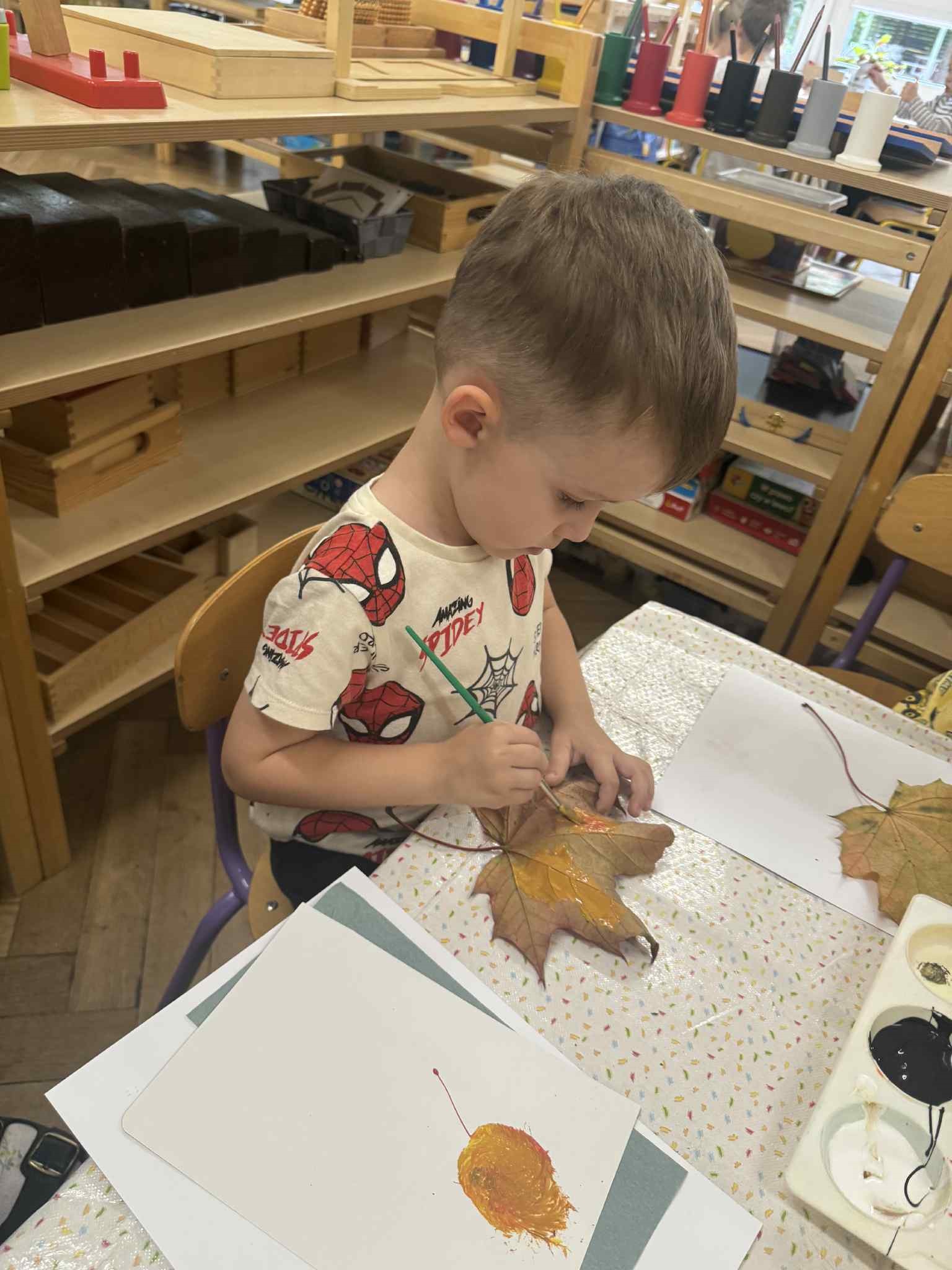 Zainspirowani kolorami jesieni, postanowiliśmy sami je stworzyć. Każdy zamienił się w Artystę i wykorzystując różne barwy, tworzył własne. Następnie malowaliśmy nimi liście, które odciskaliśmy na kartonie. Powstałe dzieła udekorowały naszą salę. Przy okazji utrwalaliśmy kolory podstawowe i pochodne.
