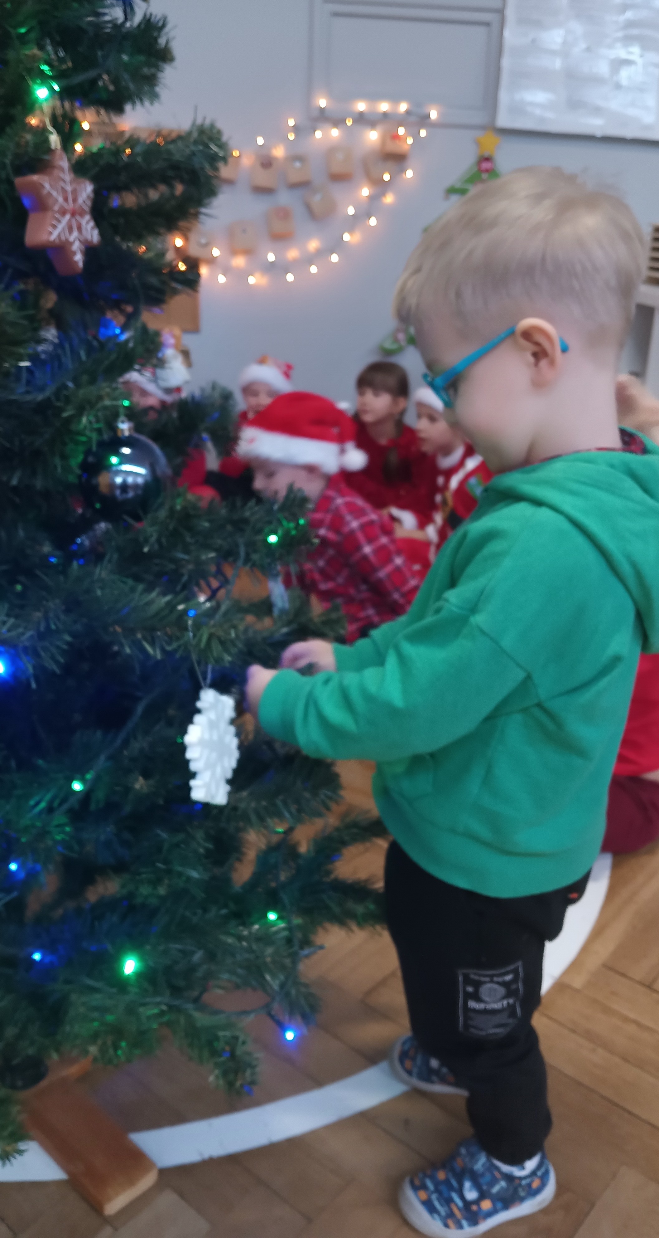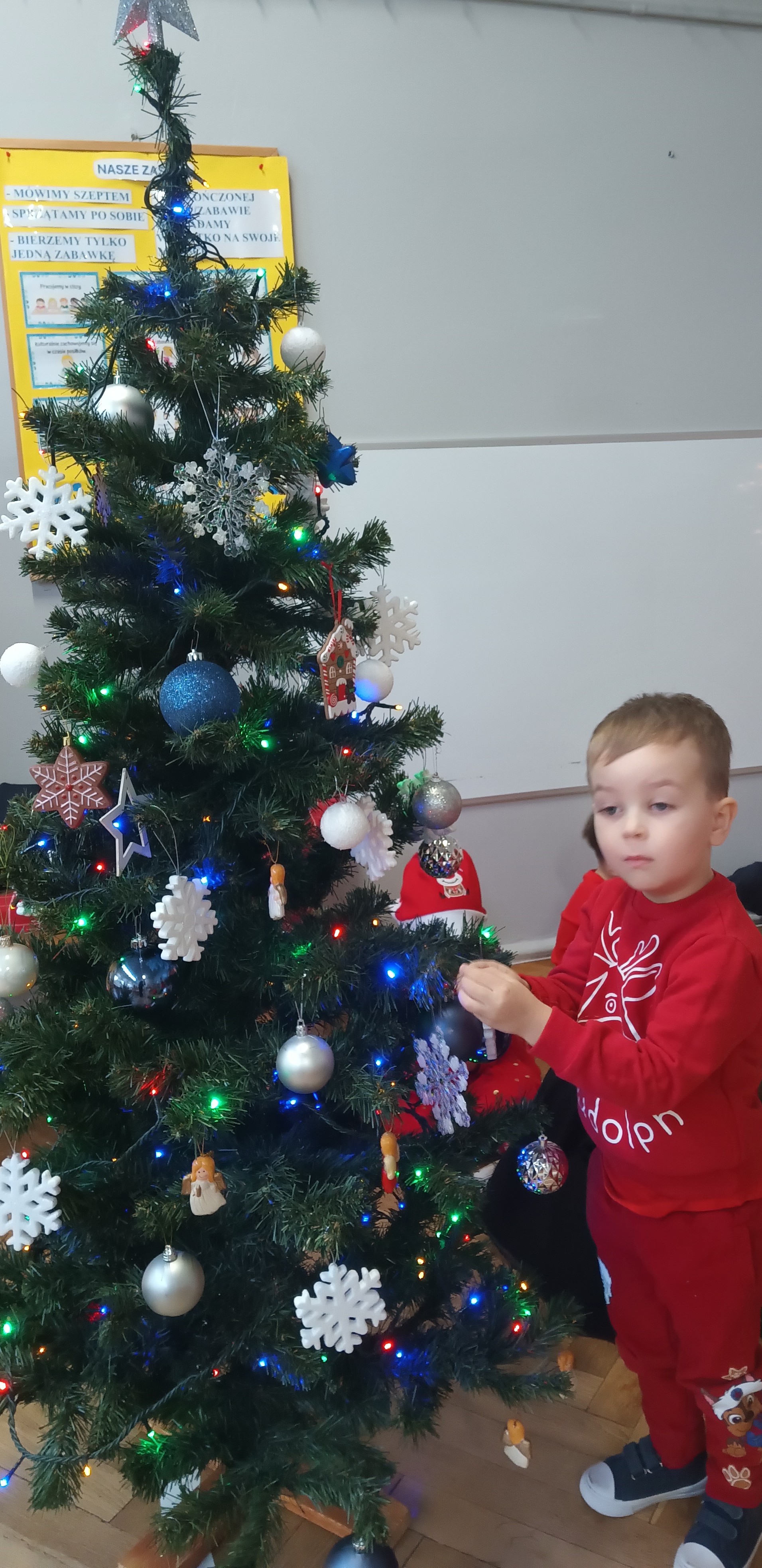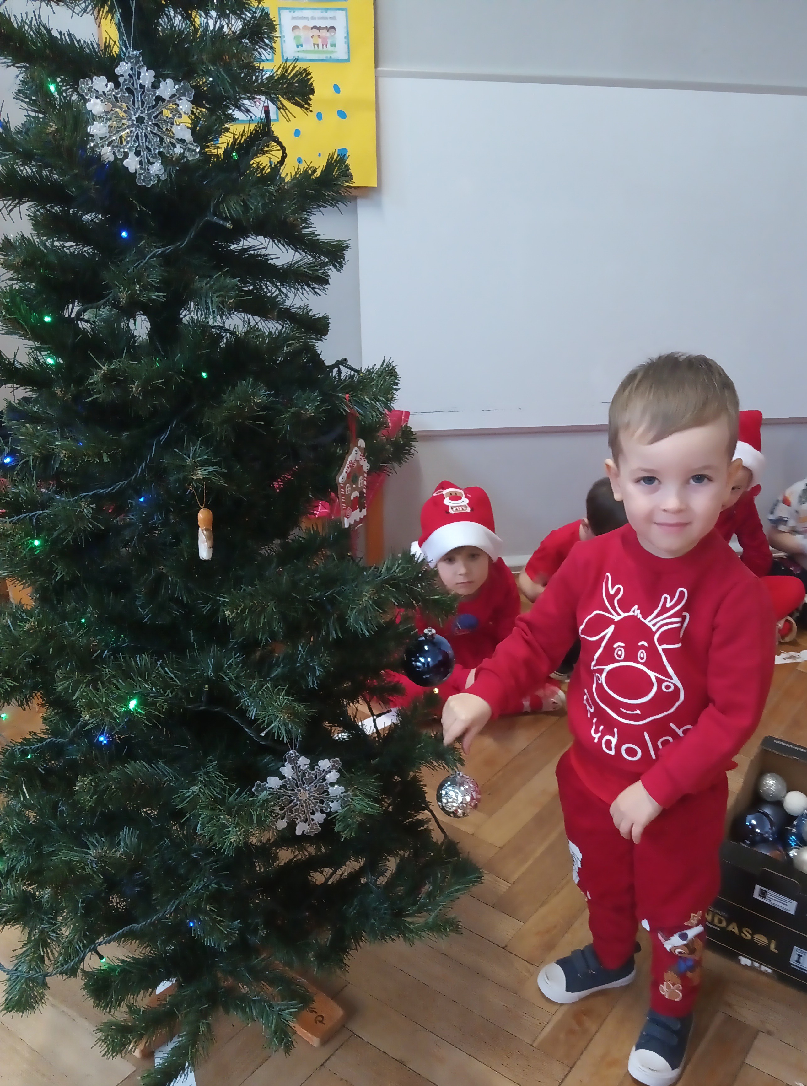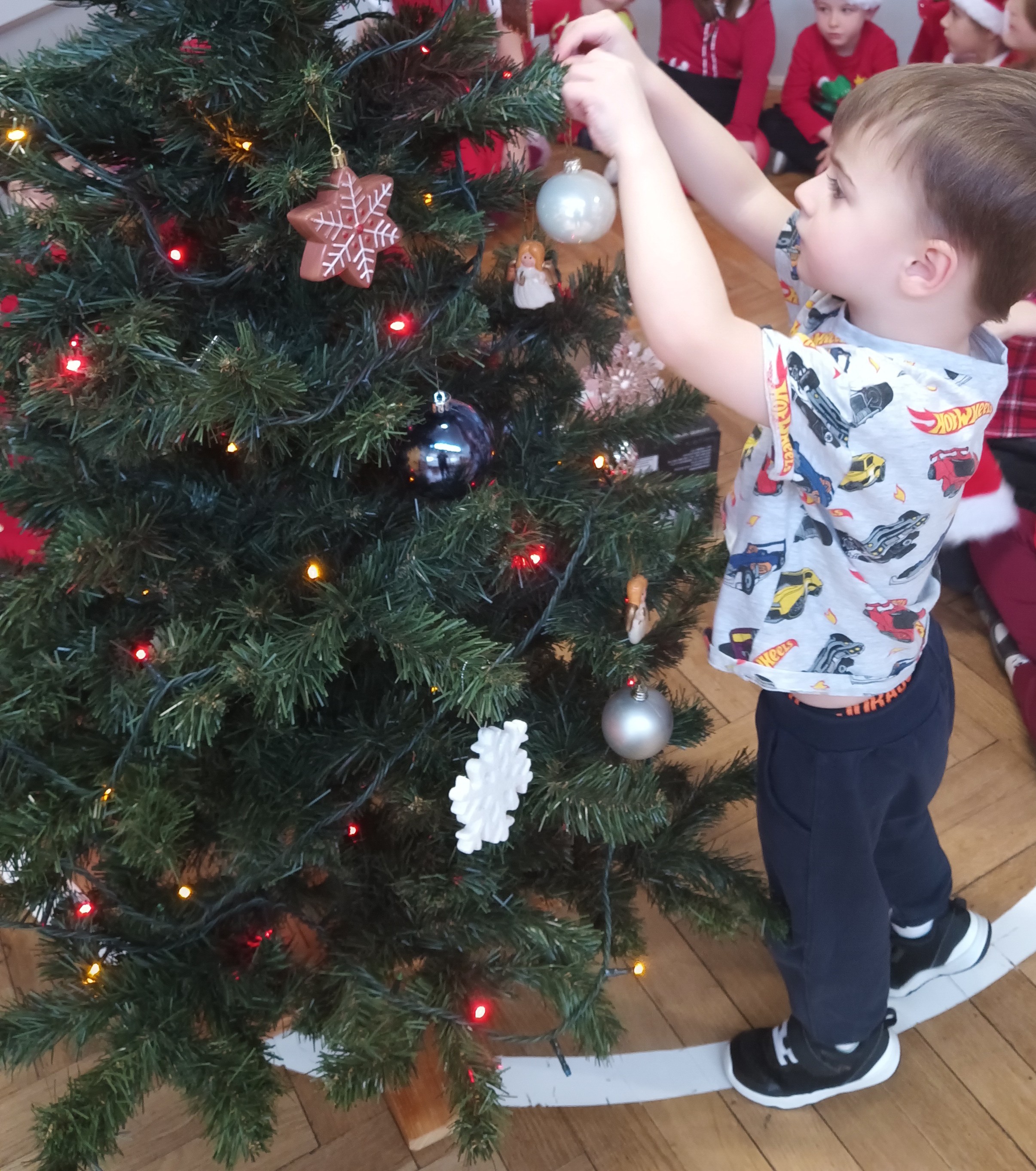 Z okazji zbliżających się Mikołajek postanowiliśmy ozdobić świątecznie naszą salę i ubrać wspólnie choinkę. Każde dziecko miało możliwość zawiesić wybraną przez siebie ozdobę na choince.