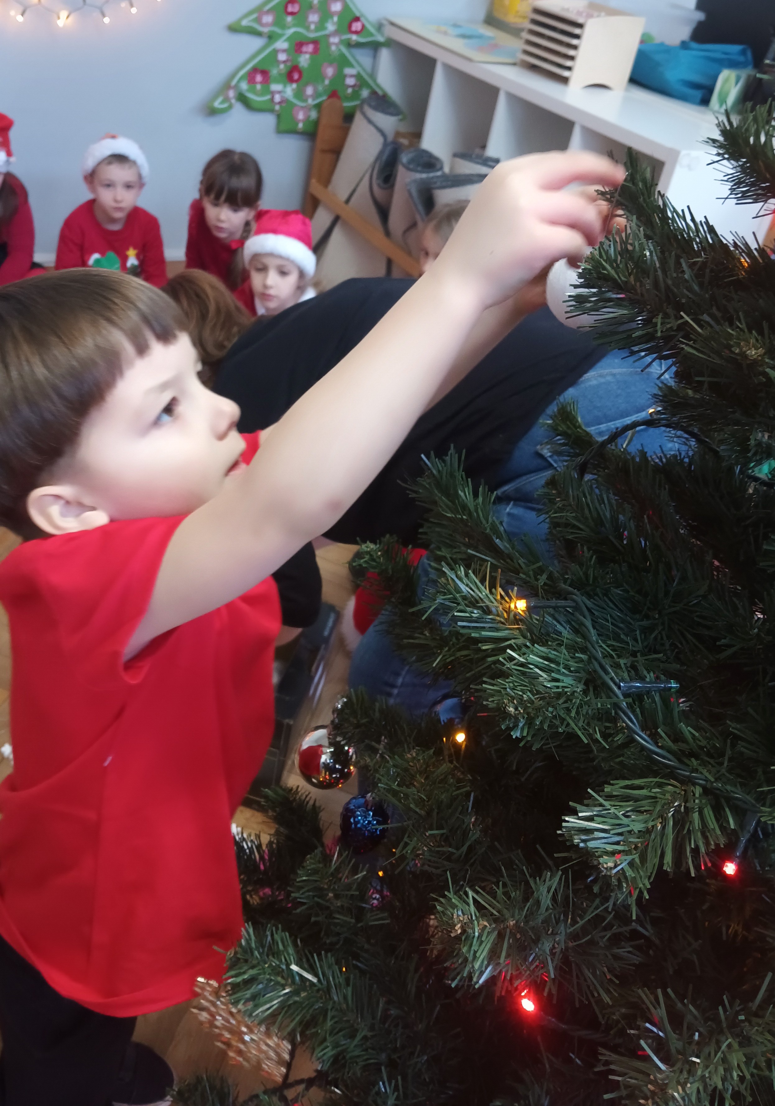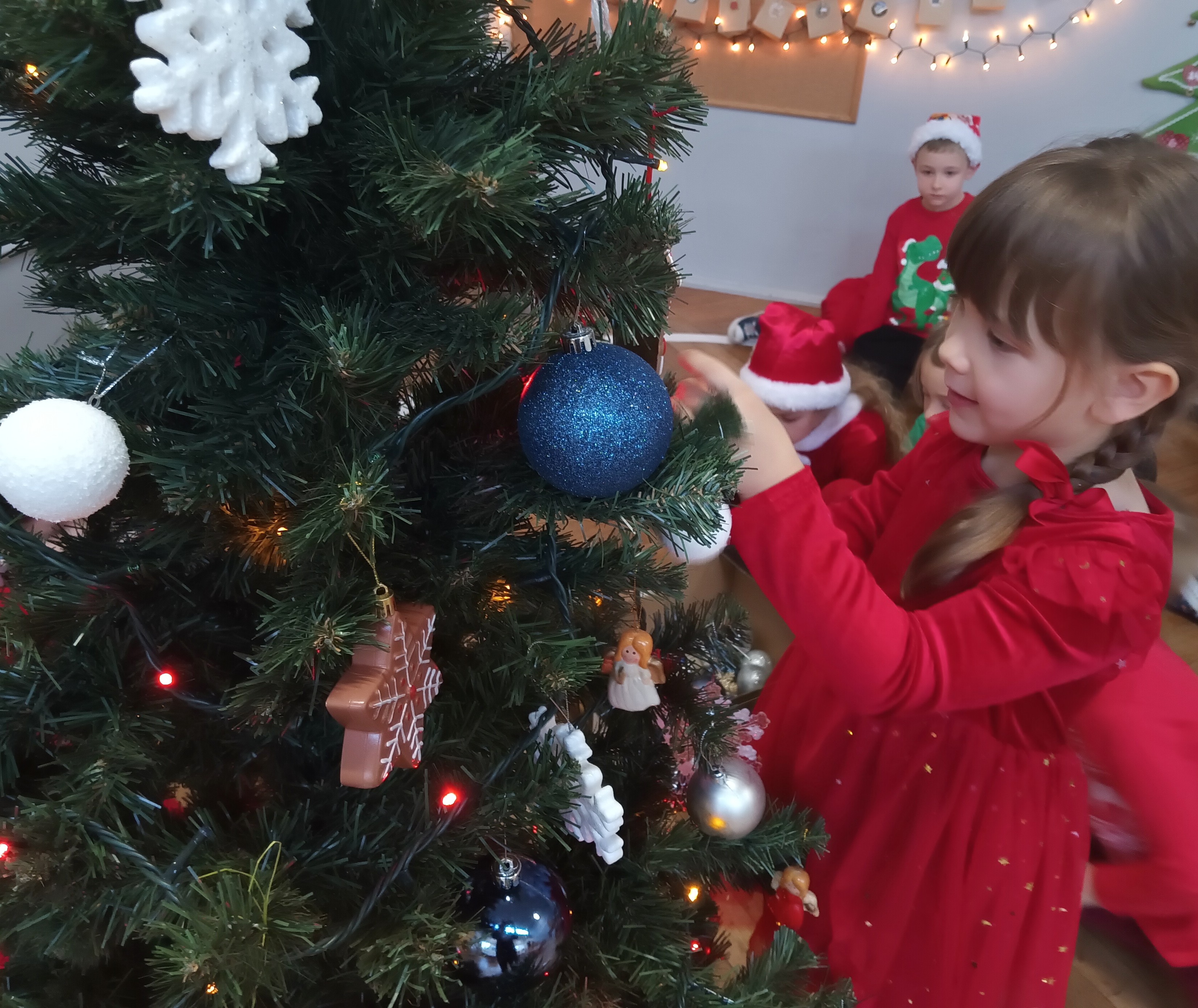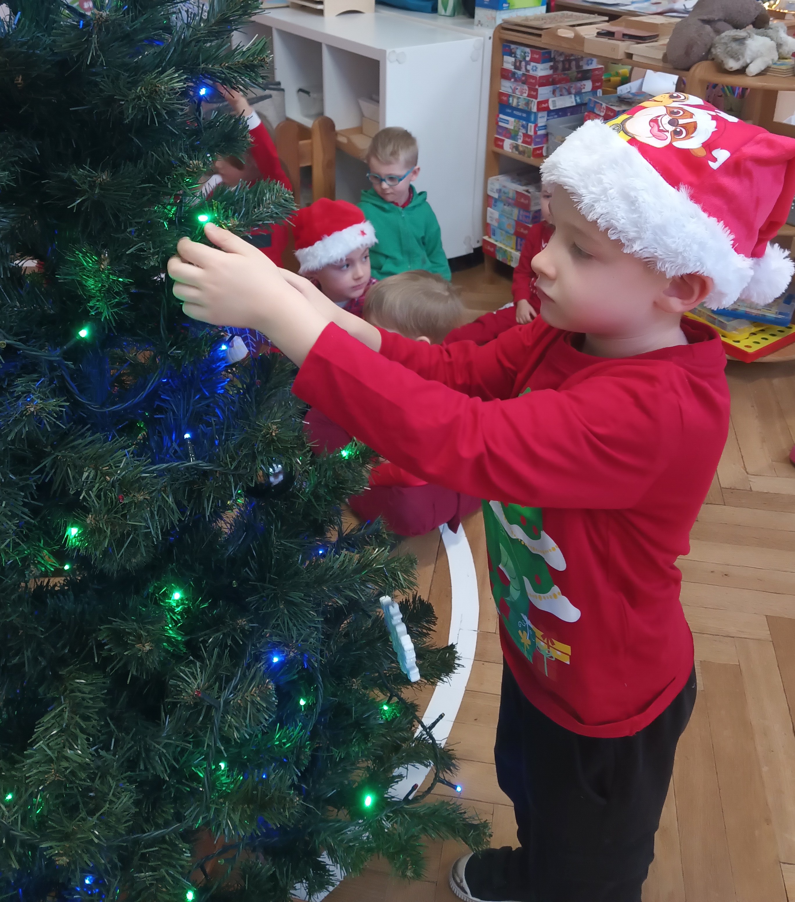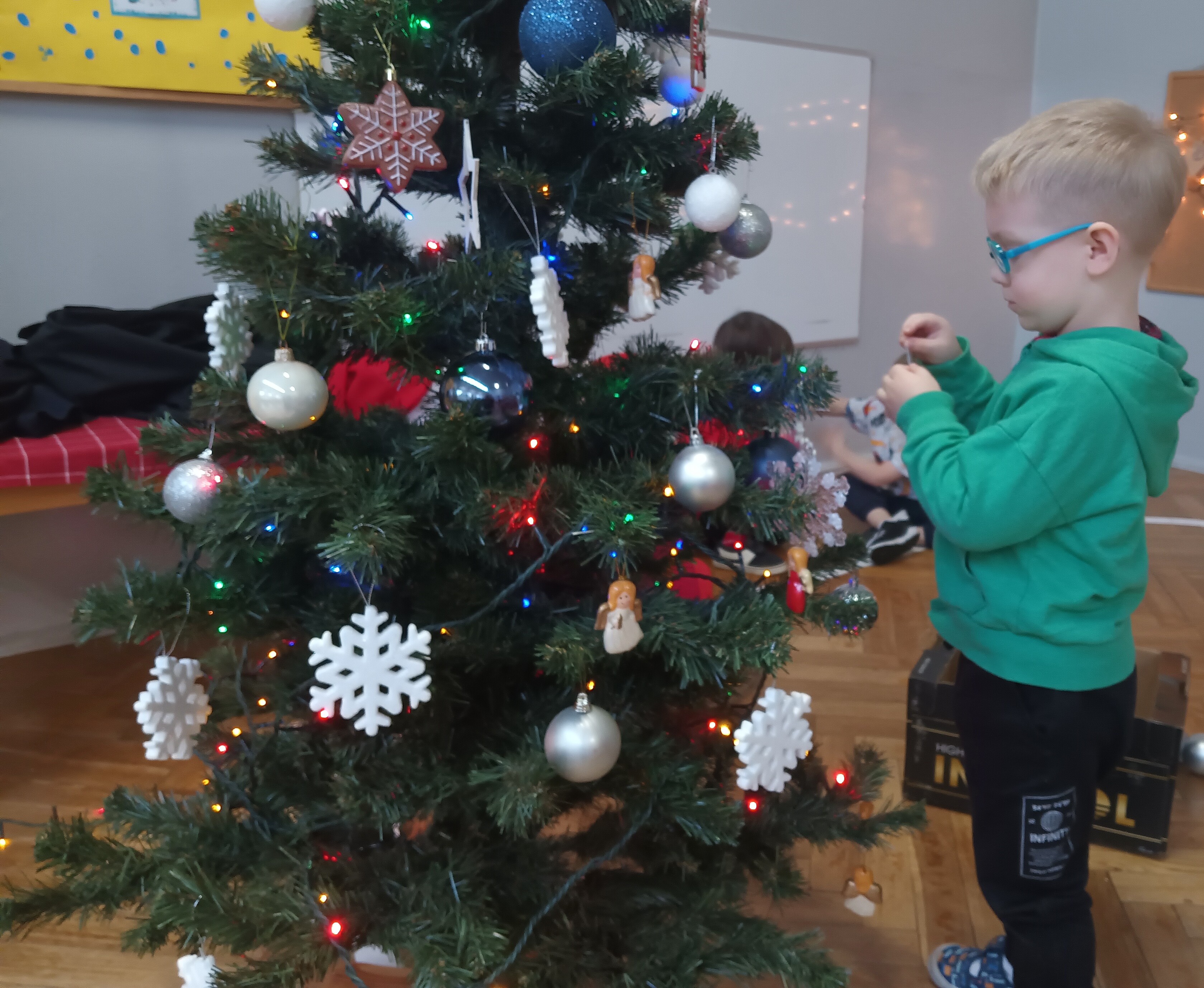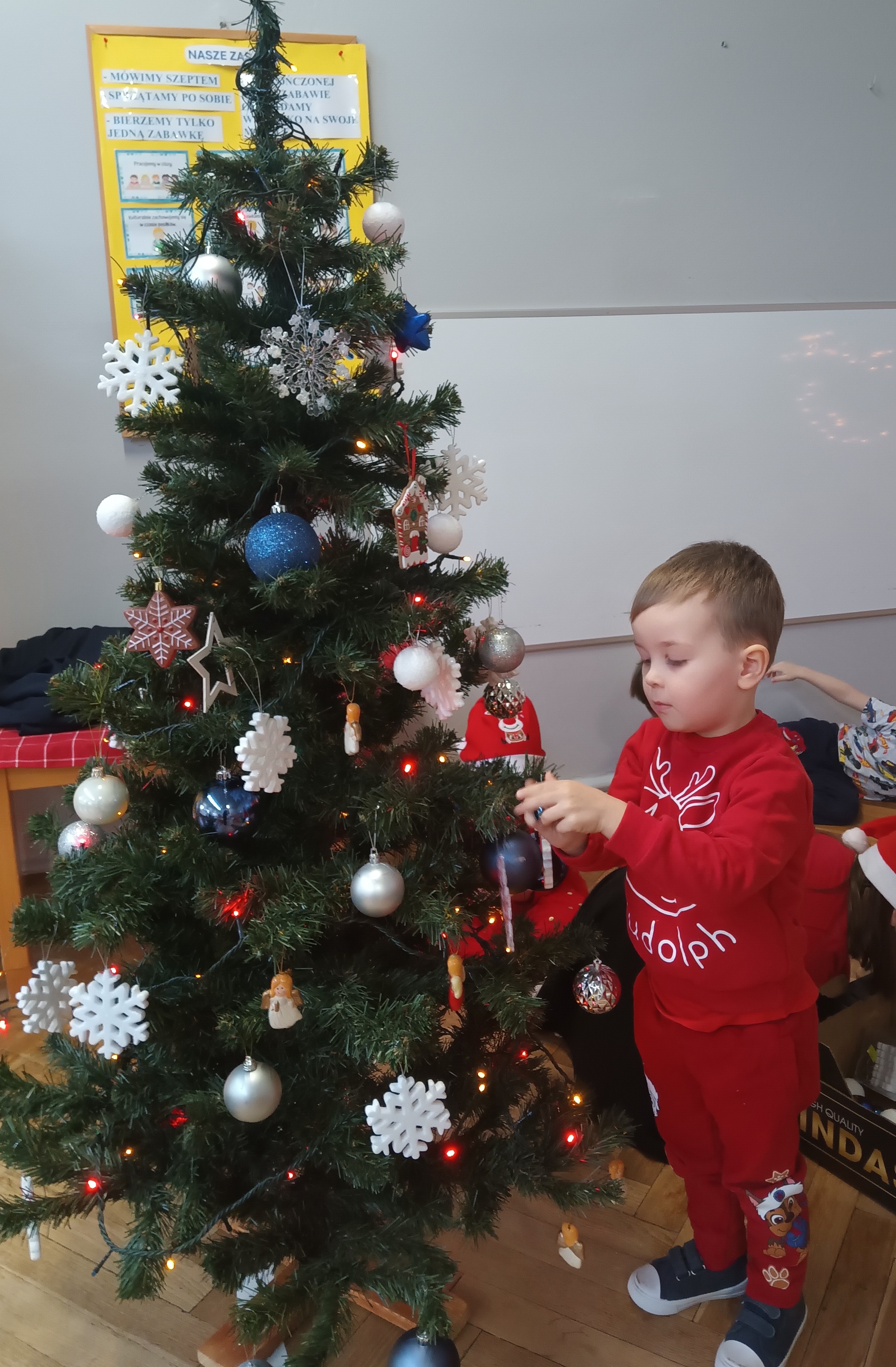 Z okazji zbliżających się Mikołajek postanowiliśmy ozdobić świątecznie naszą salę i ubrać wspólnie choinkę. Każde dziecko miało możliwość zawiesić wybraną przez siebie ozdobę na choince.