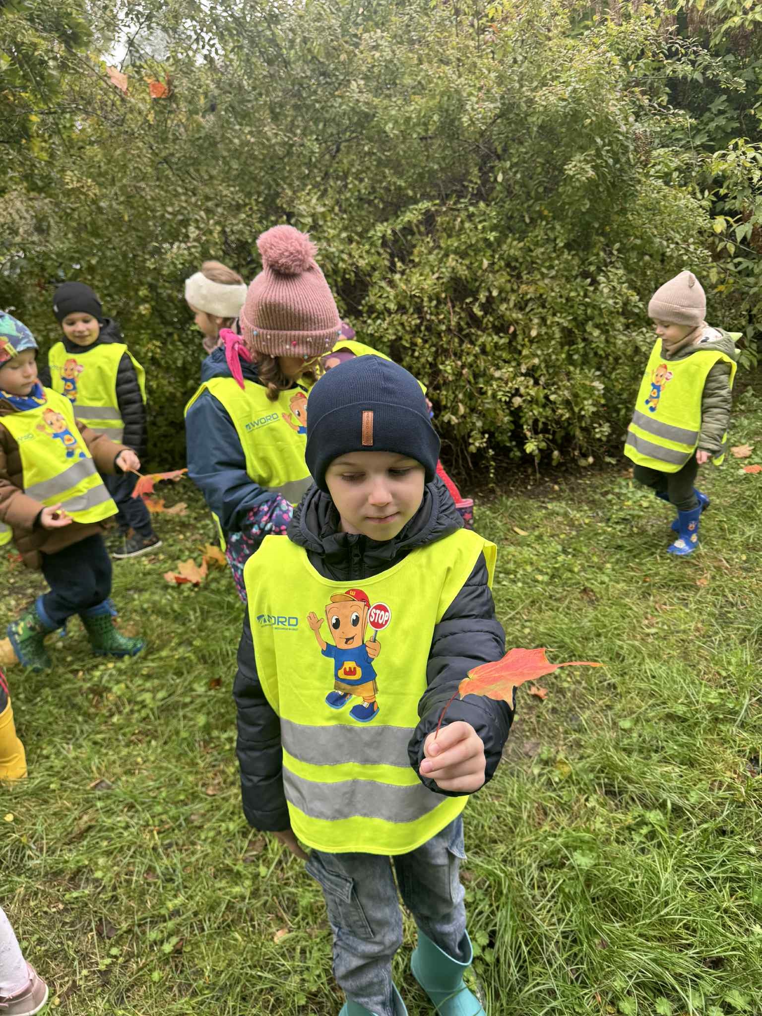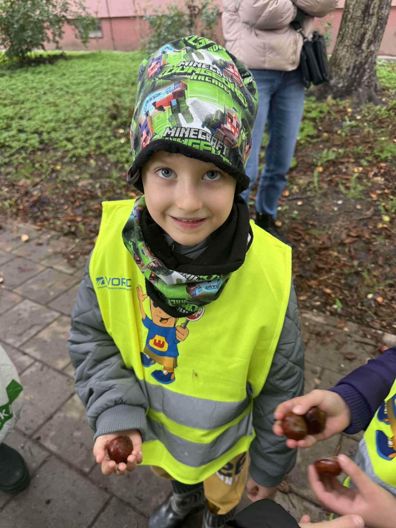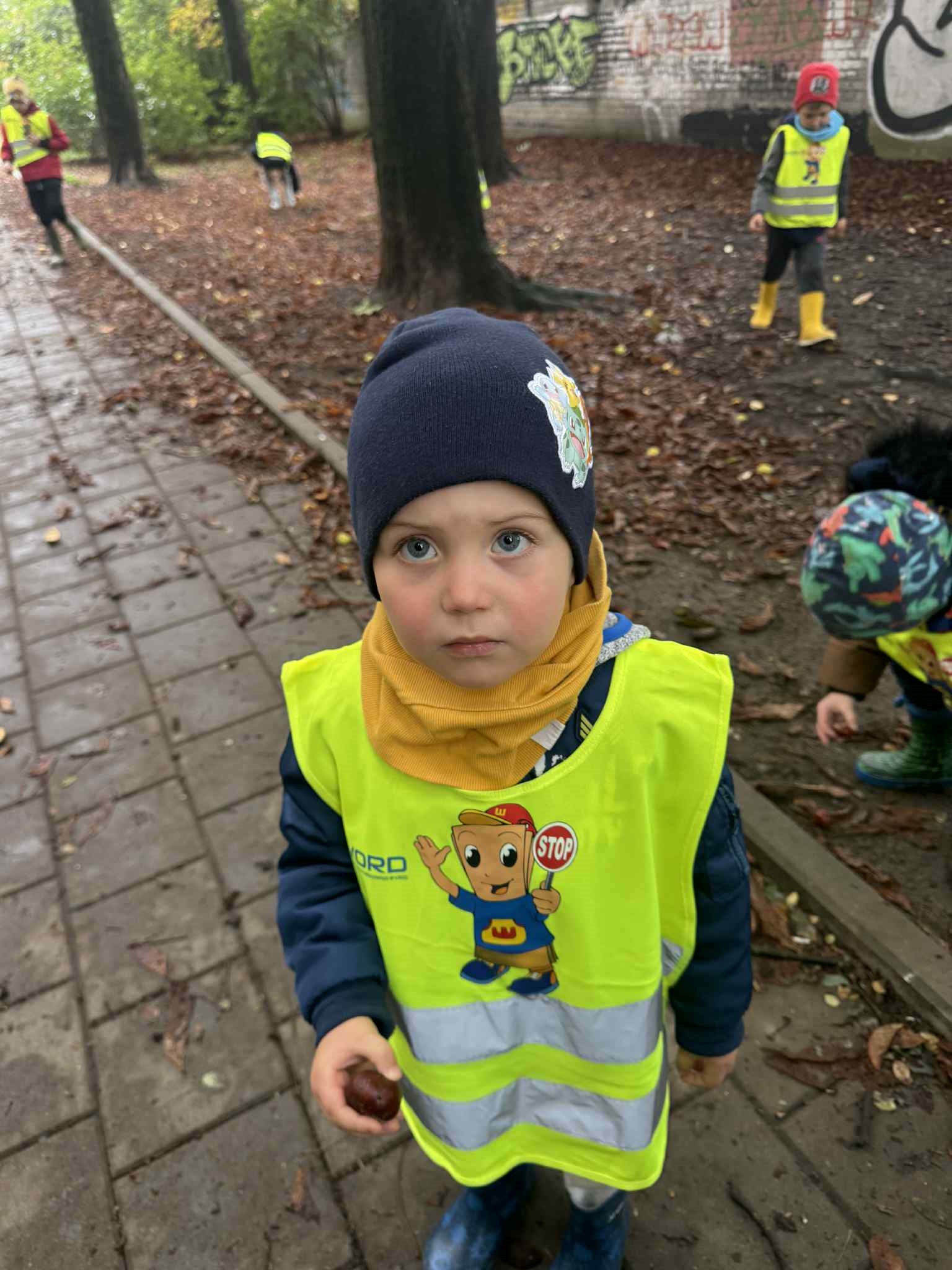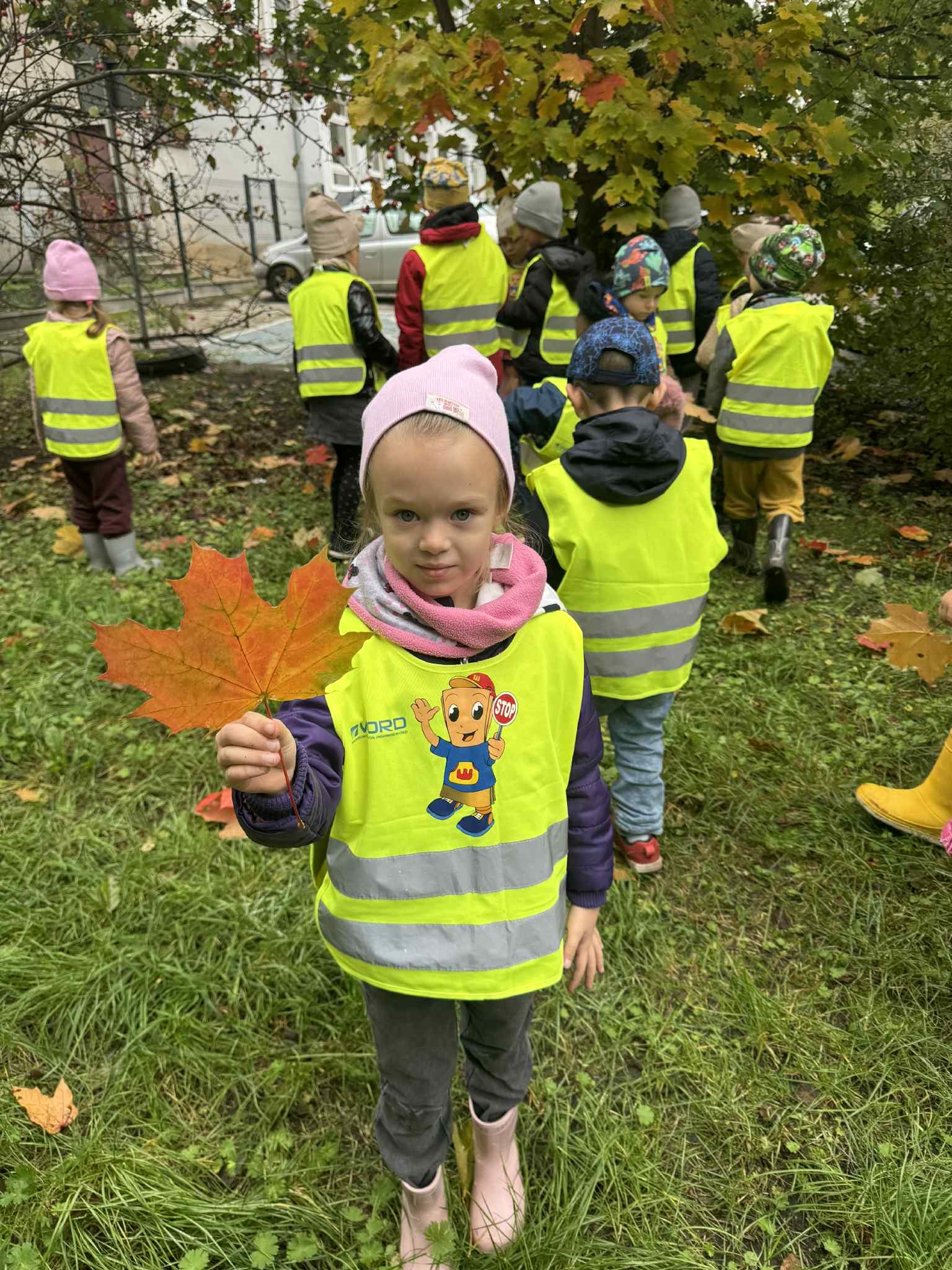 Dziś, zaraz po śniadaniu, wybraliśmy się na spacer po okolicy wokół przedszkola, by poobserwować zmieniającą się przyrodę i poszukać darów jesieni. Dzieci starały się być cicho i nasłuchiwały czy nadal śpiewają ptaki. Do przedszkola wróciliśmy z całą torbą kasztanów i bukietem kolorowych liści.