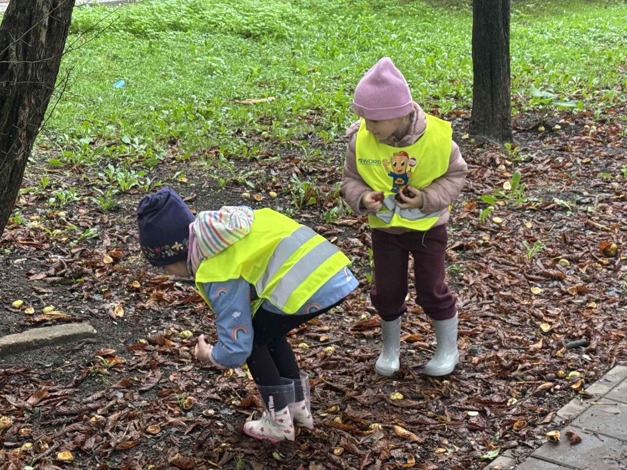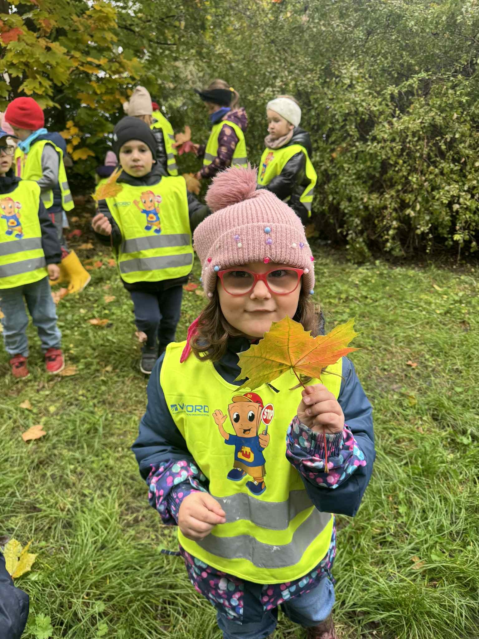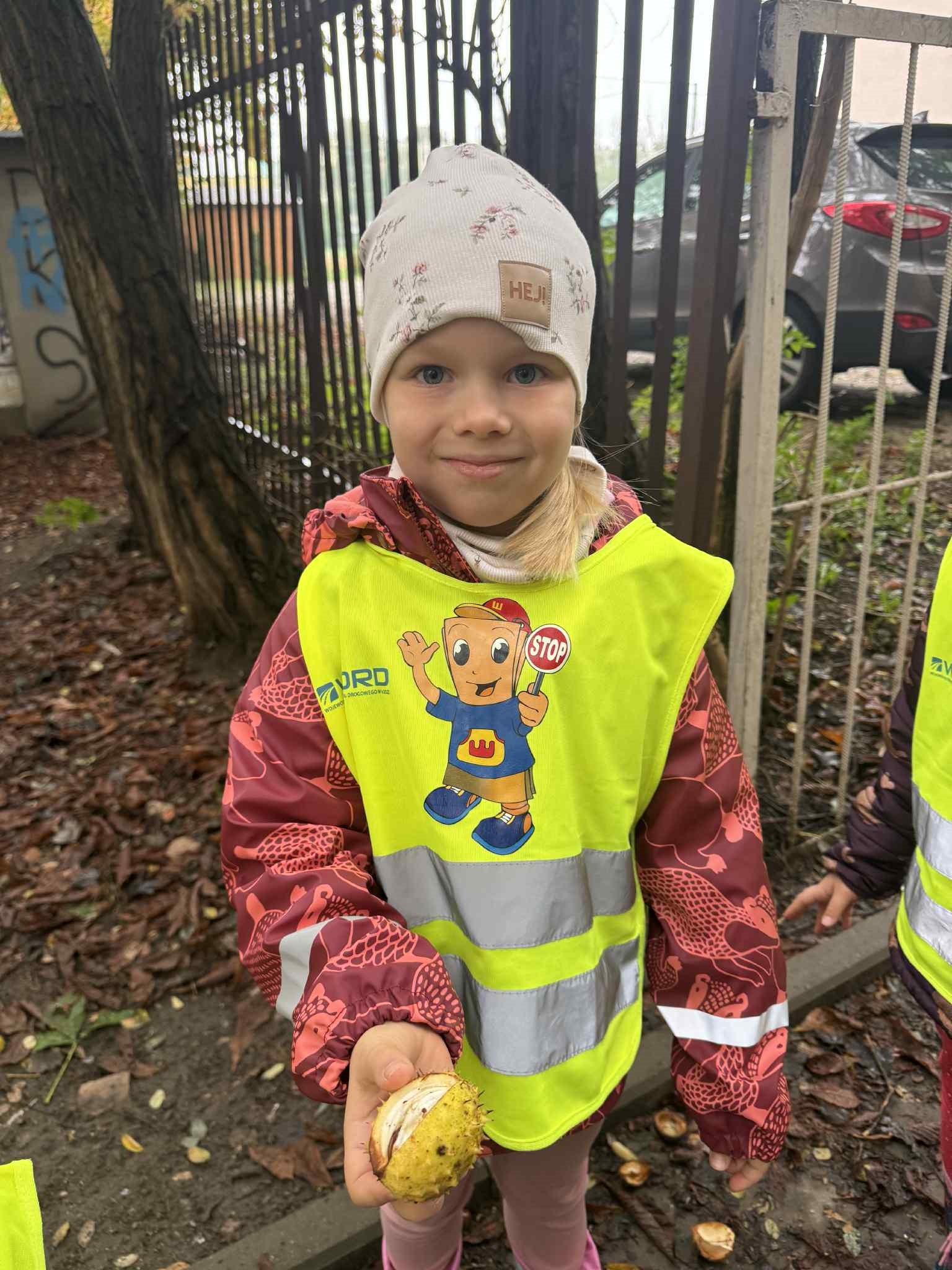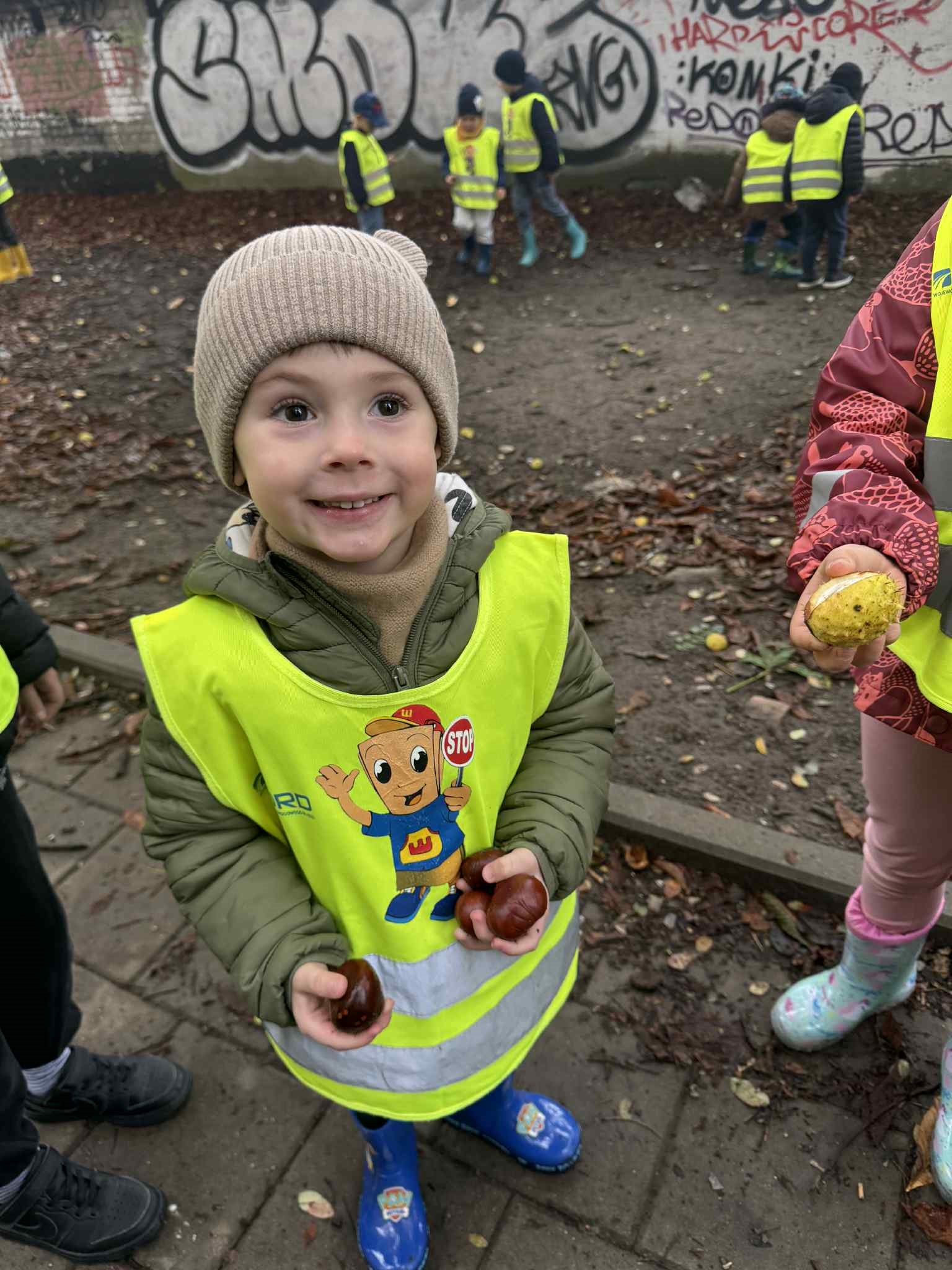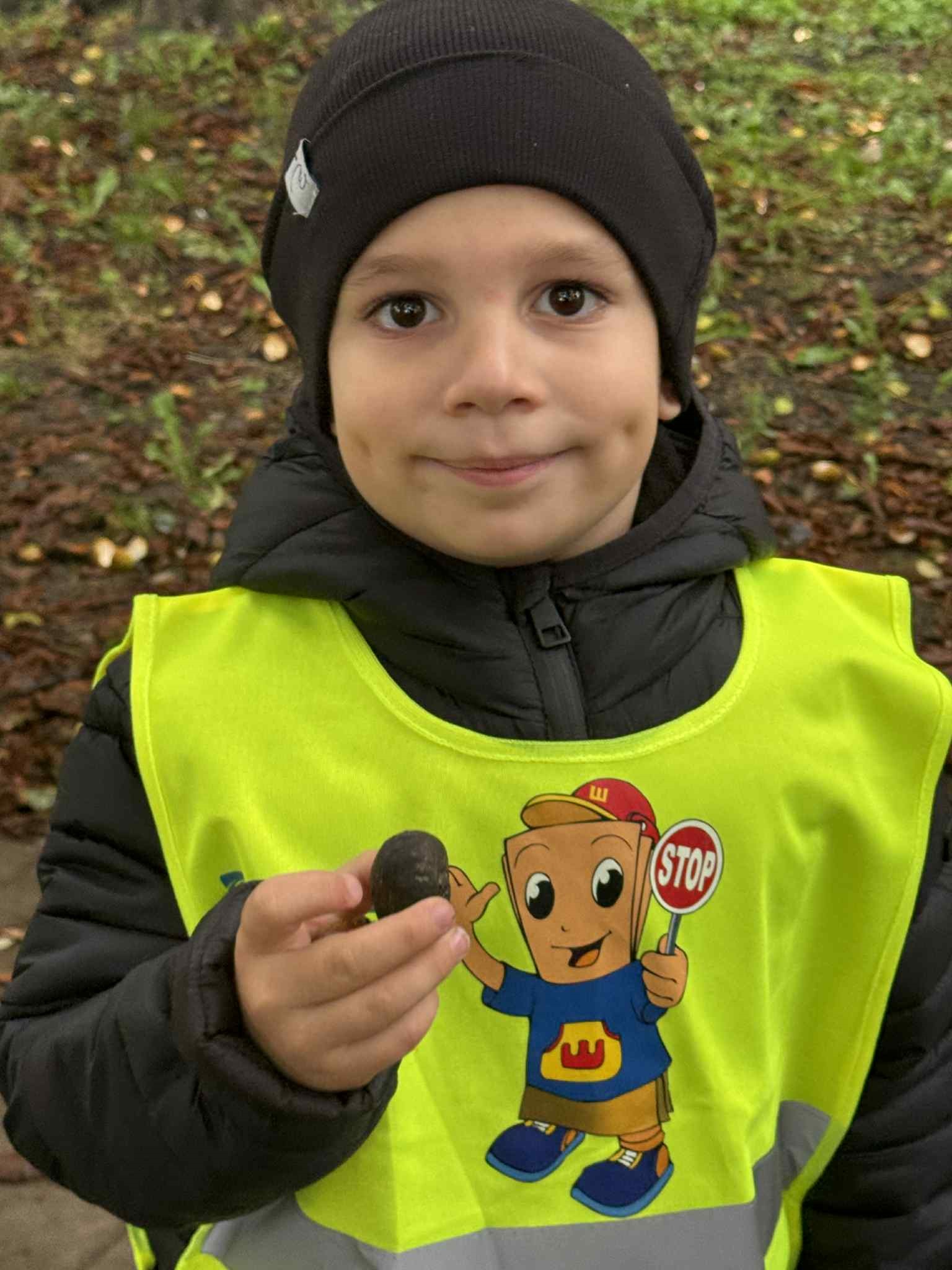Dziś, zaraz po śniadaniu, wybraliśmy się na spacer po okolicy wokół przedszkola, by poobserwować zmieniającą się przyrodę i poszukać darów jesieni. Dzieci starały się być cicho i nasłuchiwały czy nadal śpiewają ptaki. Do przedszkola wróciliśmy z całą torbą kasztanów i bukietem kolorowych liści.