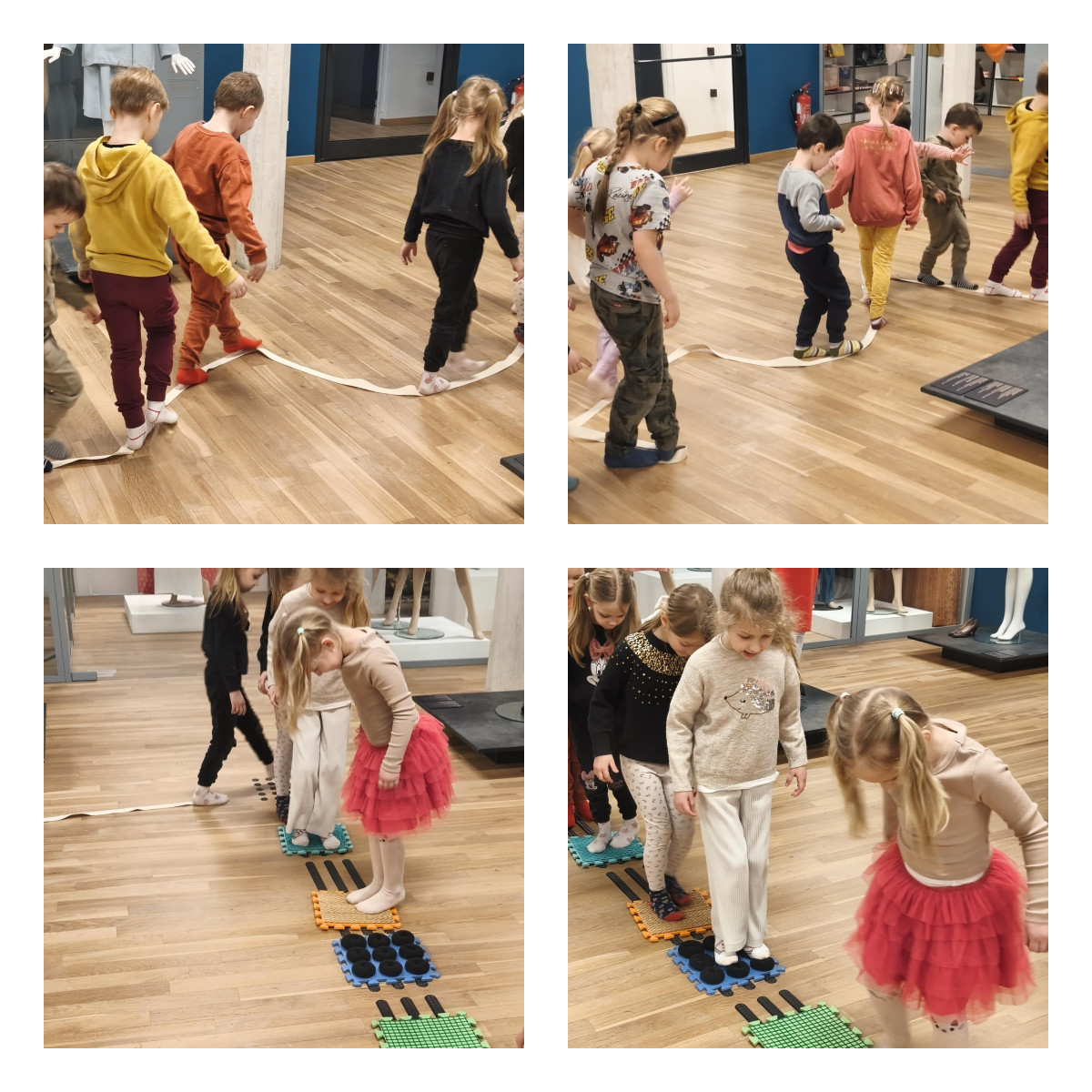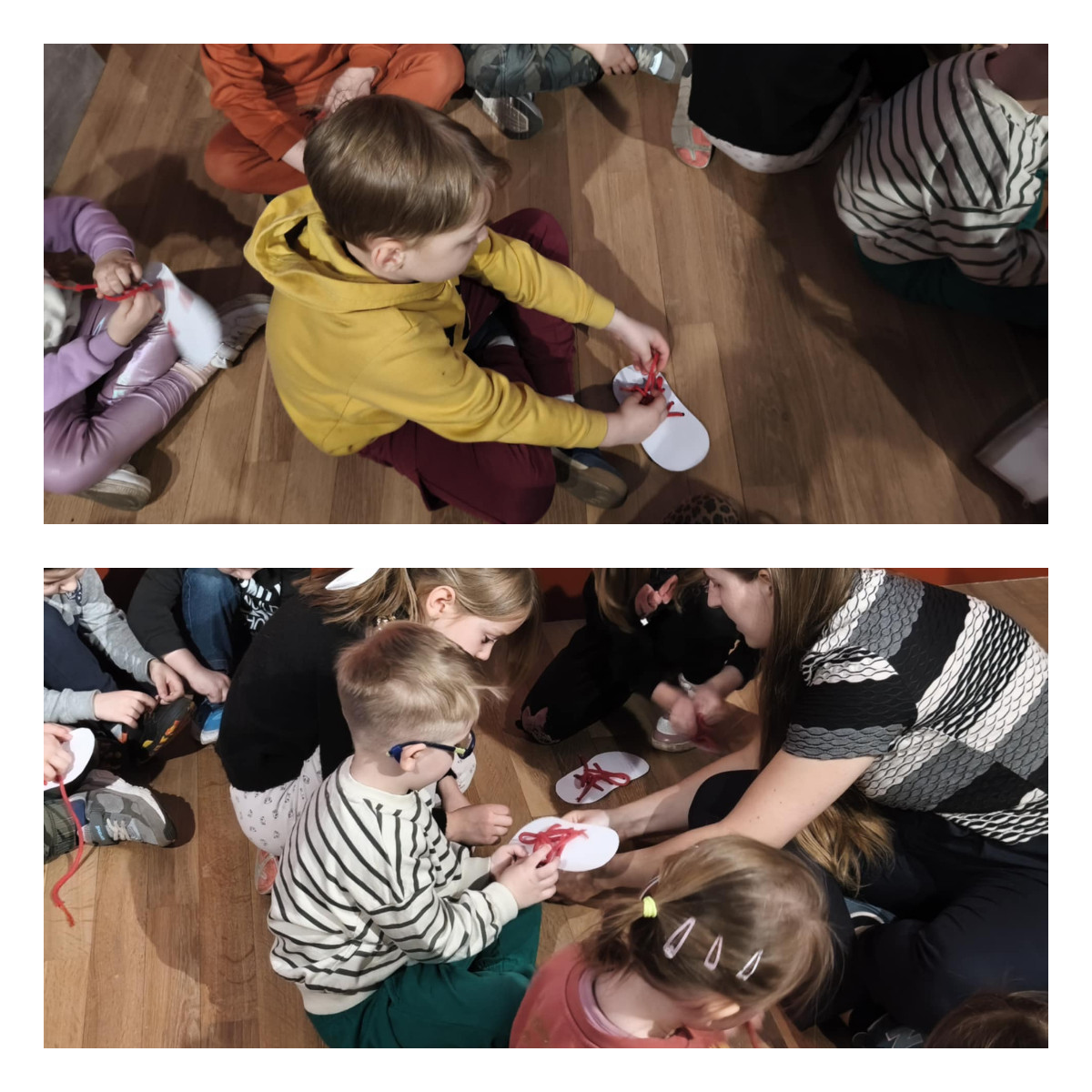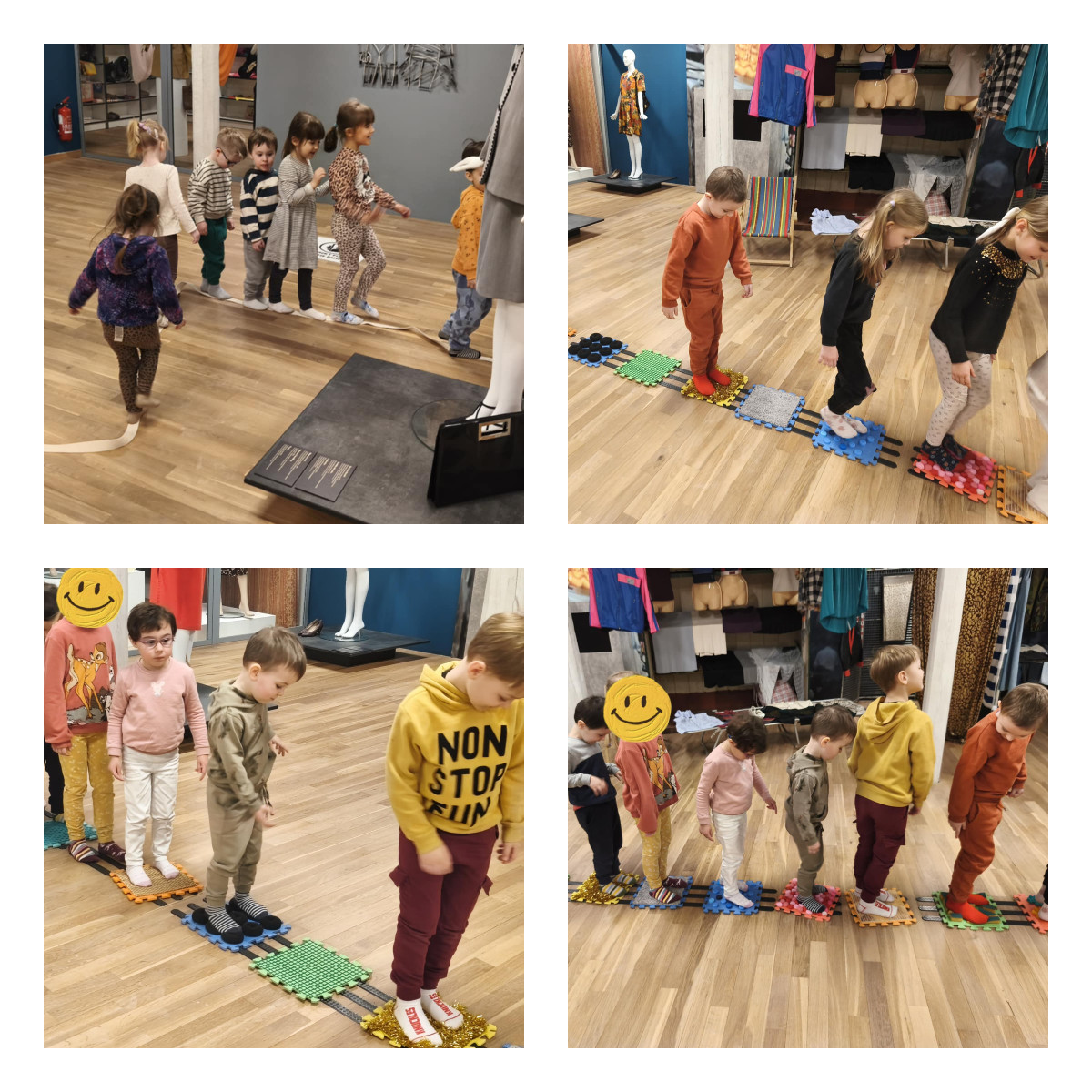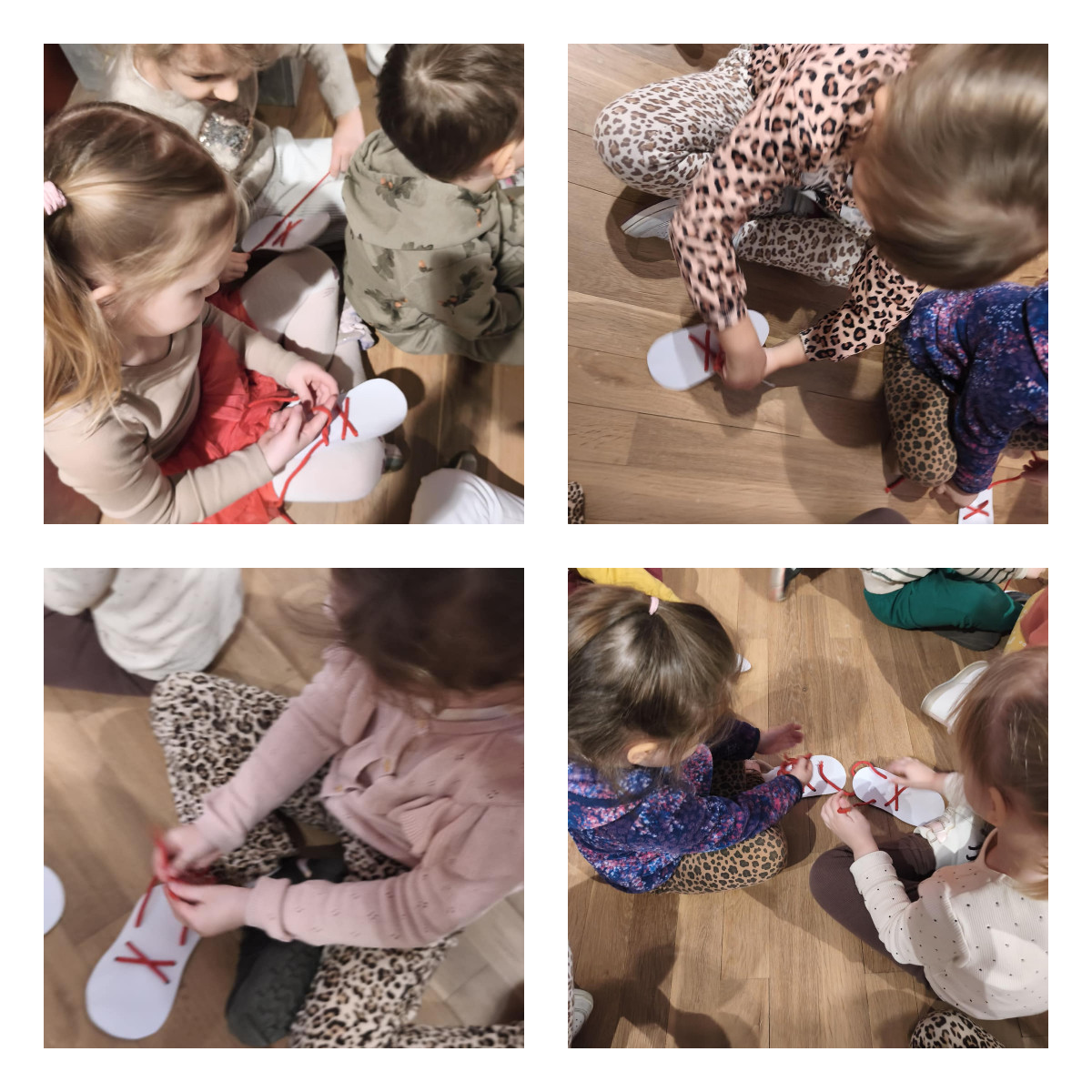 Podczas zajęć m.in.: trenowaliśmy naszą cierpliwość i zręczność, mierząc się z nauką wiązania sznurowadeł. Sprawdzaliśmy, czy nasze stopy są tak samo zwinne jak dłonie. Przekładaliśmy przedmioty, testowaliśmy różne sposoby chodzenia, a także badaliśmy różnorodne faktury i powierzchnie, odkrywając świat zupełnie nowych wrażeń dotykowych.