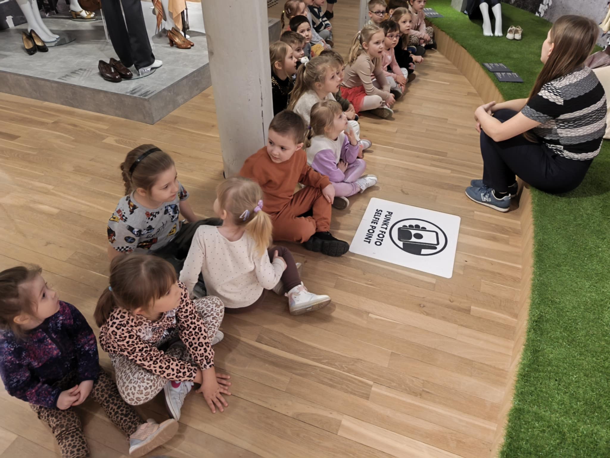 Pod opieką pani Karoliny udaliśmy się na wystawę „Miasto – Moda – Maszyna”, gdzie czekały na nas niezwykłe eksponaty. Podziwialiśmy eleganckie szpilki i buty robocze, zastanawiając się wspólnie, jak dobrać obuwie do pogody i naszych przygód.