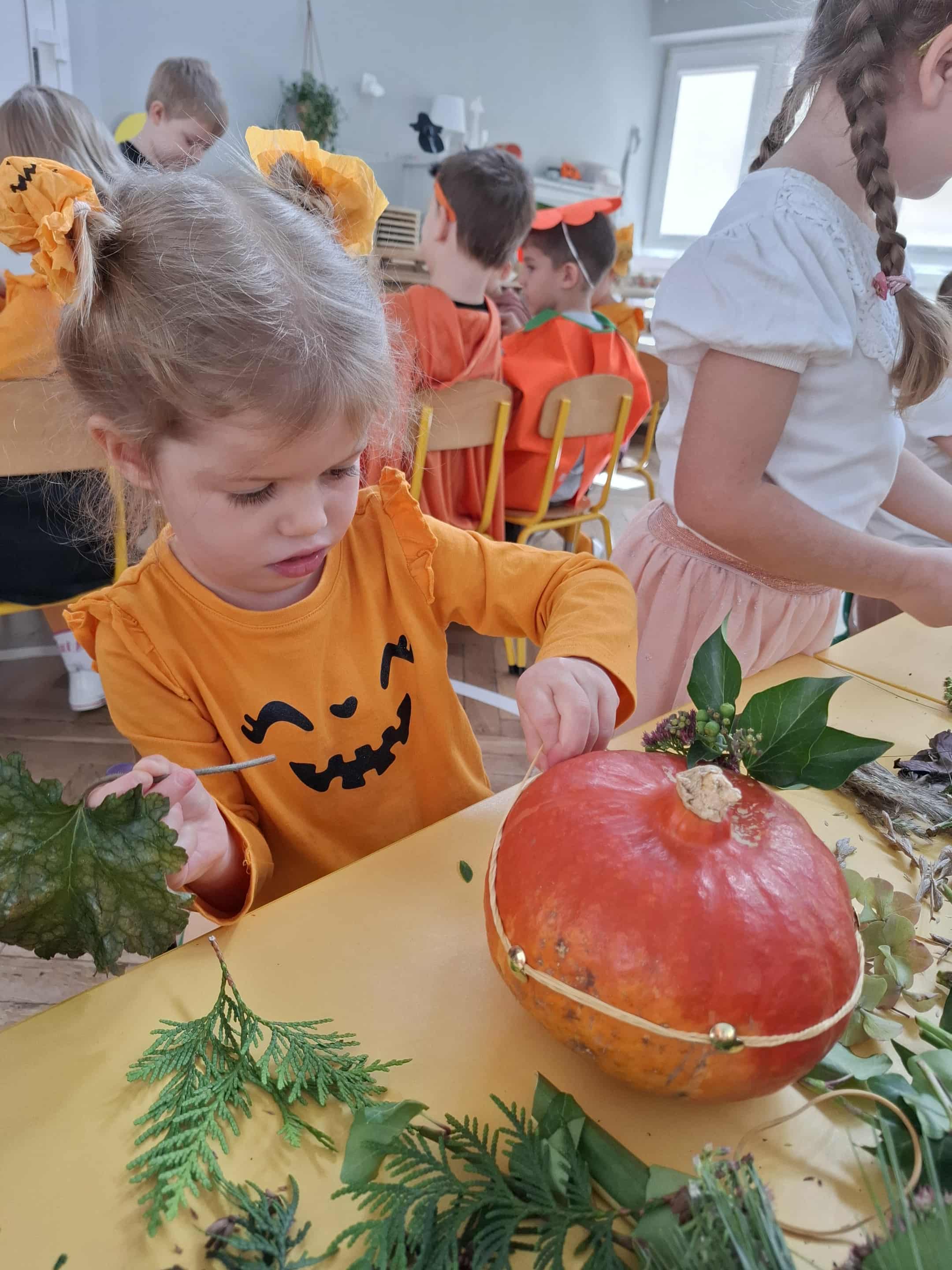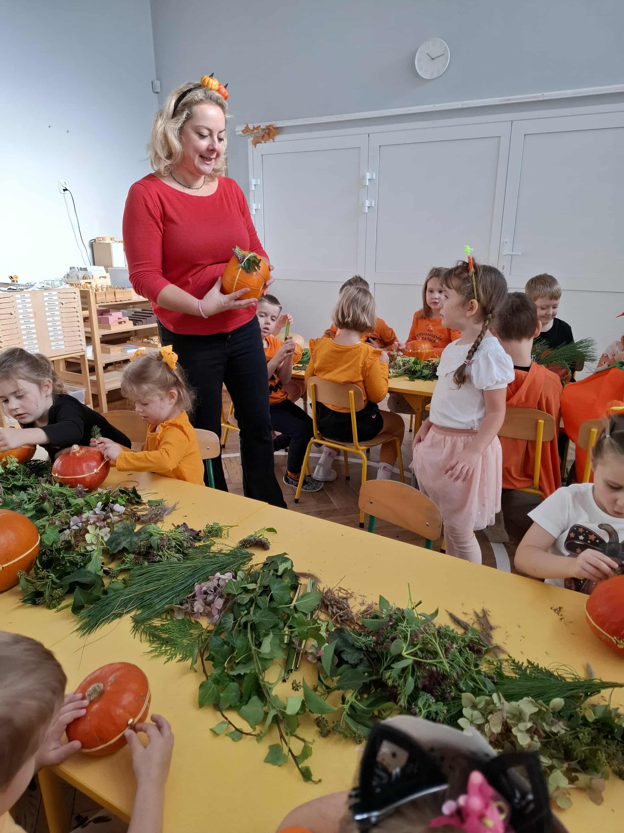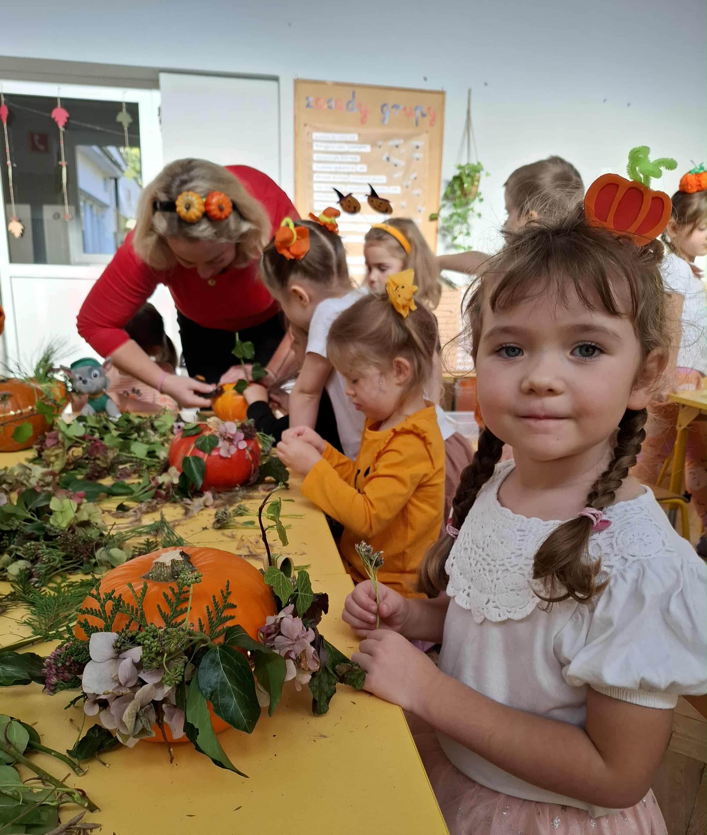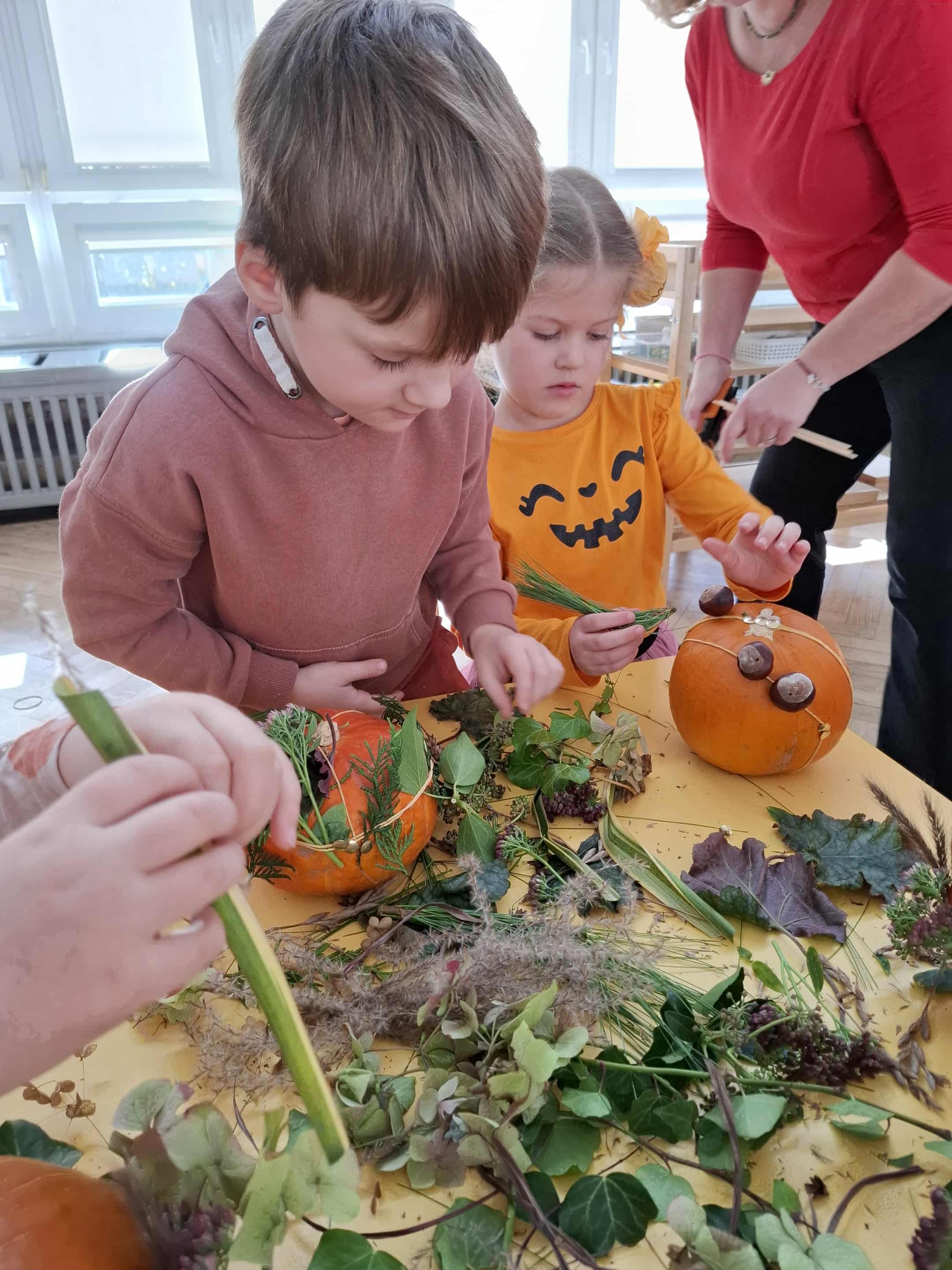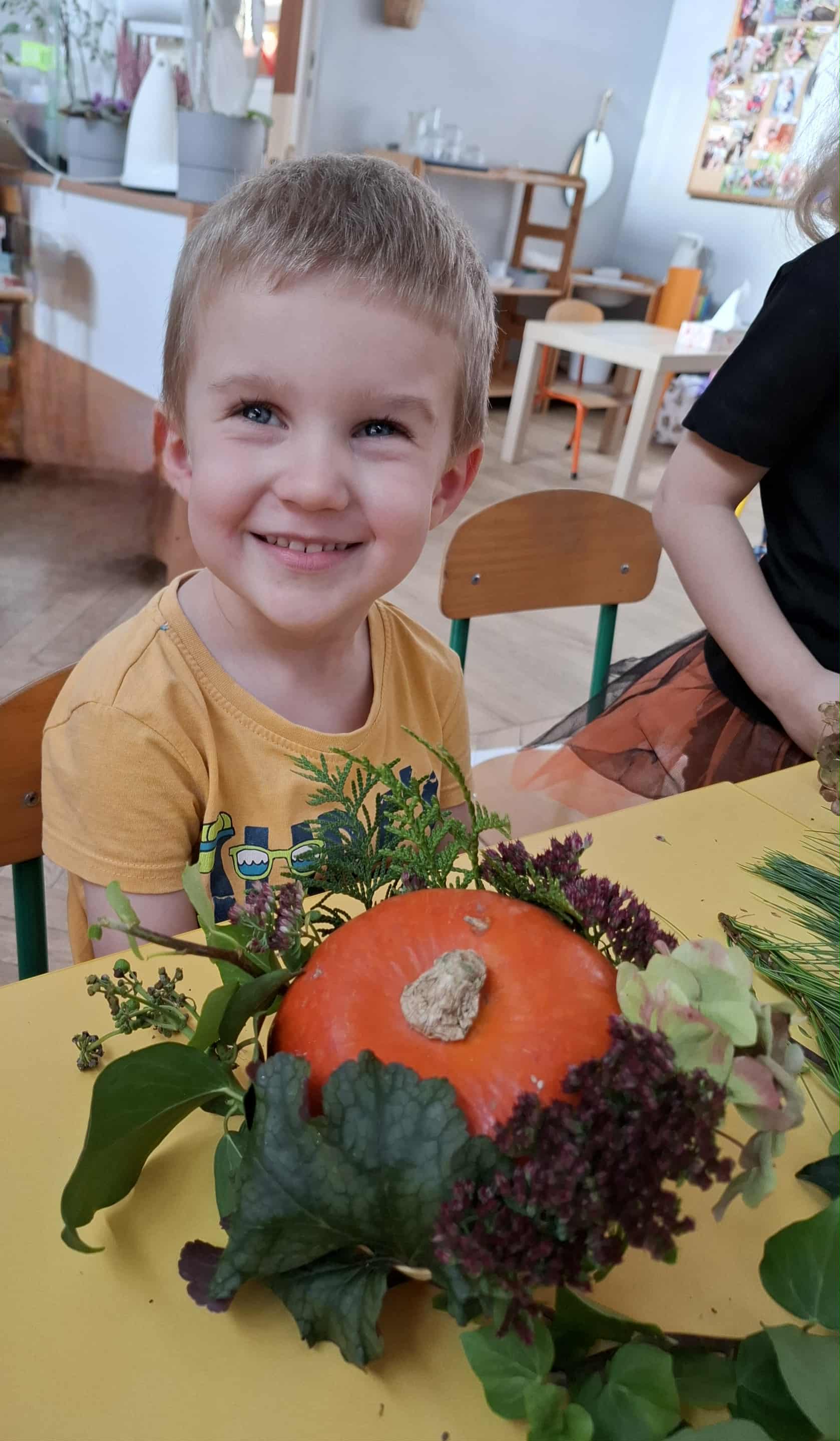Podczas warsztatów z mamą Zosi przenieśliśmy się do świata roślin i kolorów! W roli głównej wystąpiła oczywiście dynia – piękna, pachnąca i gotowa na nowe stylizacje. Dzieci z ogromnym zapałem ozdabiały swoje dynie, tworząc prawdziwe, jesienne arcydzieła z liści, kwiatów i innych roślin. Każda praca była inna, wyjątkowa – dokładnie tak jak nasi mali artyści! Na koniec każdy z dumą zabrał swoją dynię do domu, by dalej roztaczała jesienny urok. Mamie Zosi serdecznie dziękujemy i nie możemy doczekać się kolejnego spotkania.