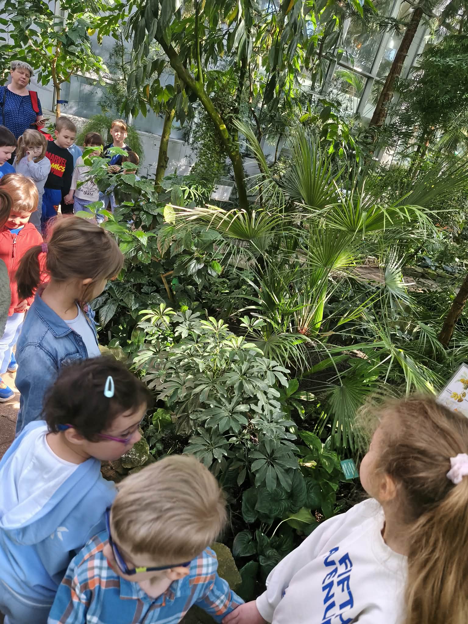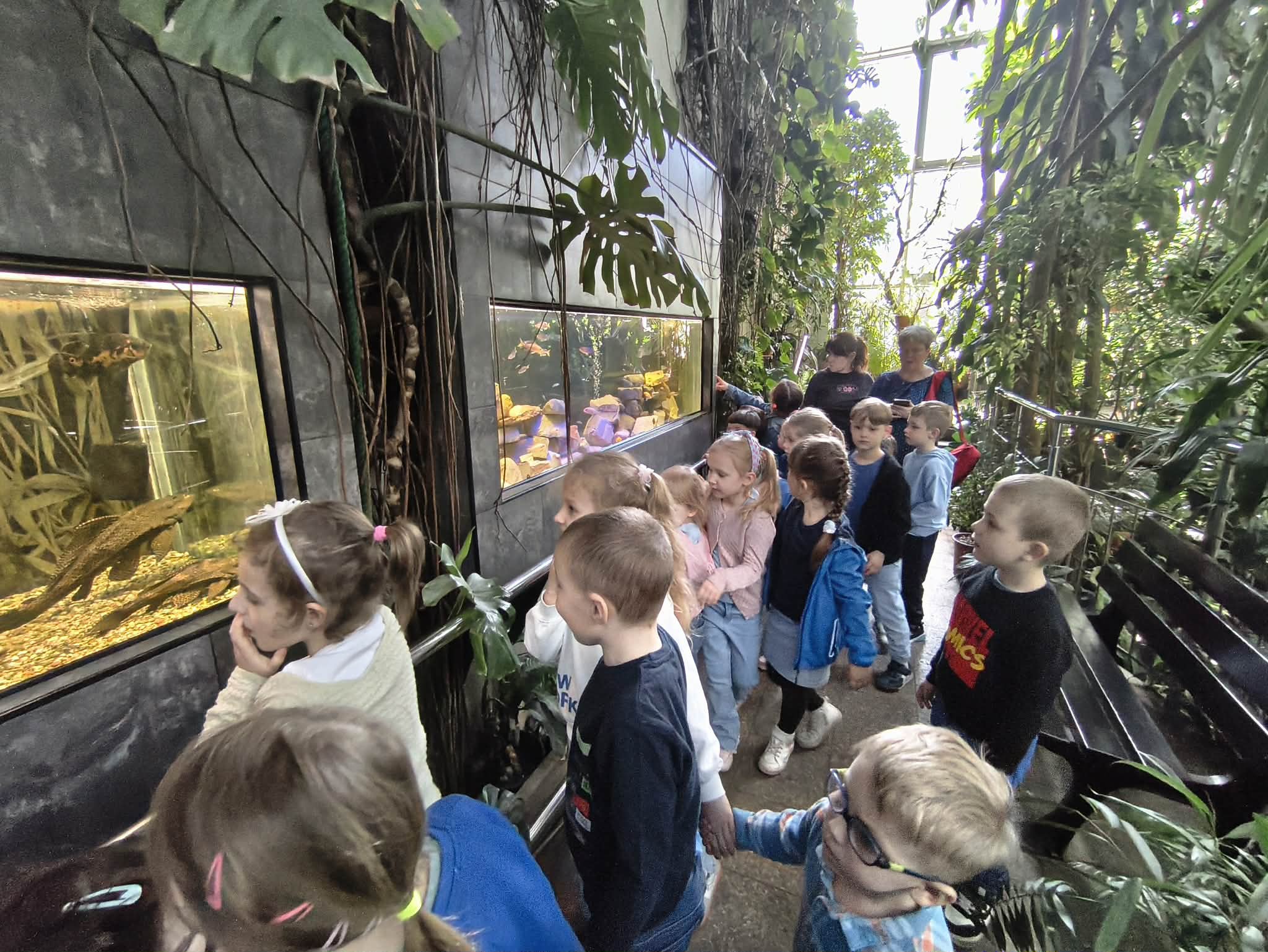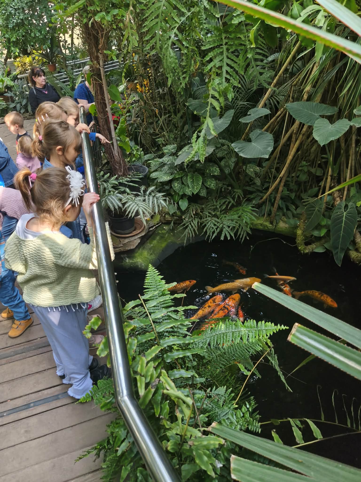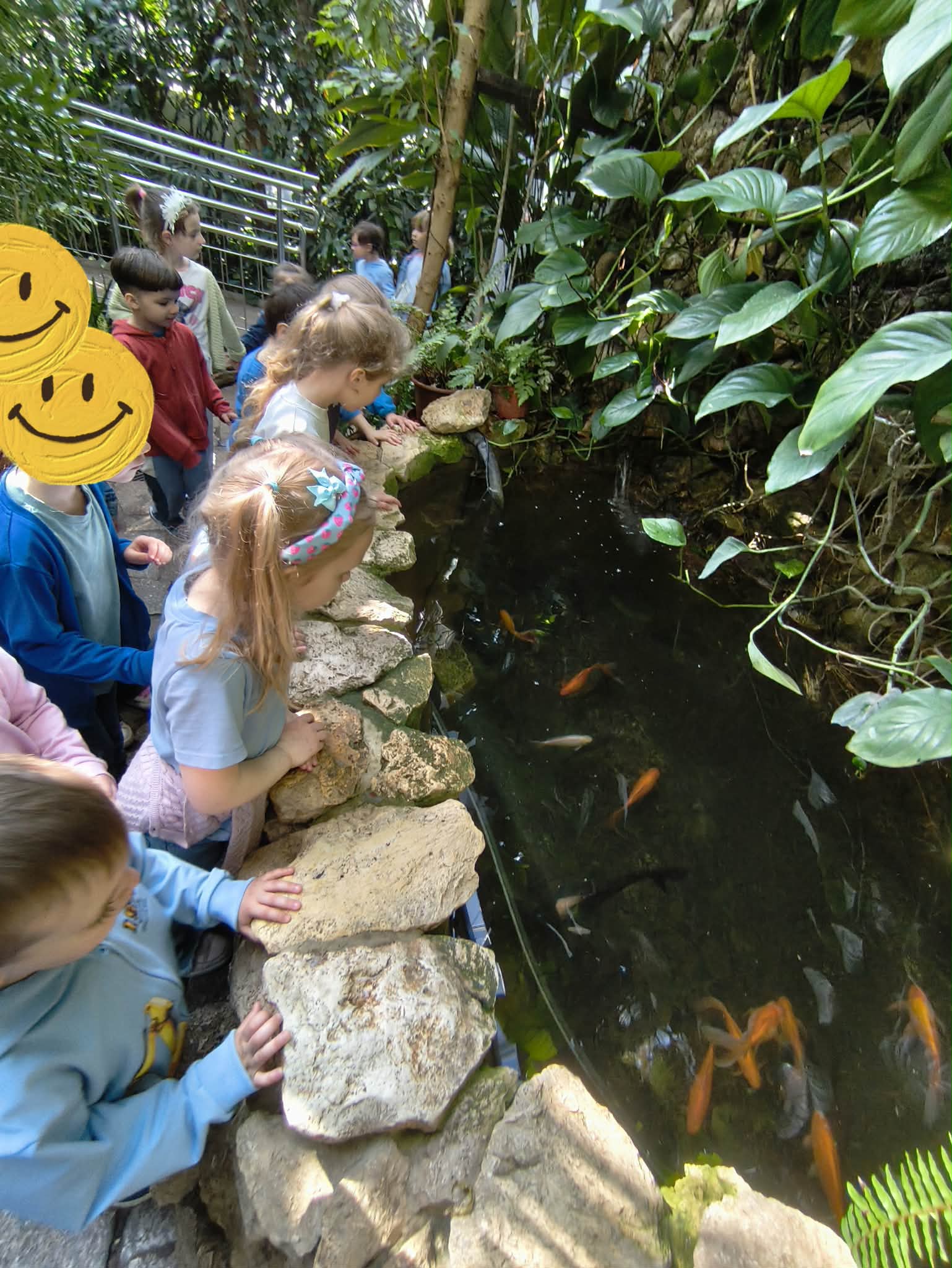 Podczas spaceru poznawaliśmy ciekawostki o różnych strefach klimatycznych i obserwowaliśmy, jak rośliny przystosowują się do życia w tropikach. Wielką atrakcją okazały się wielkie akwaria i oczka wodne, w których pływały różnobarwne ryby – w tym „złota rybka”.