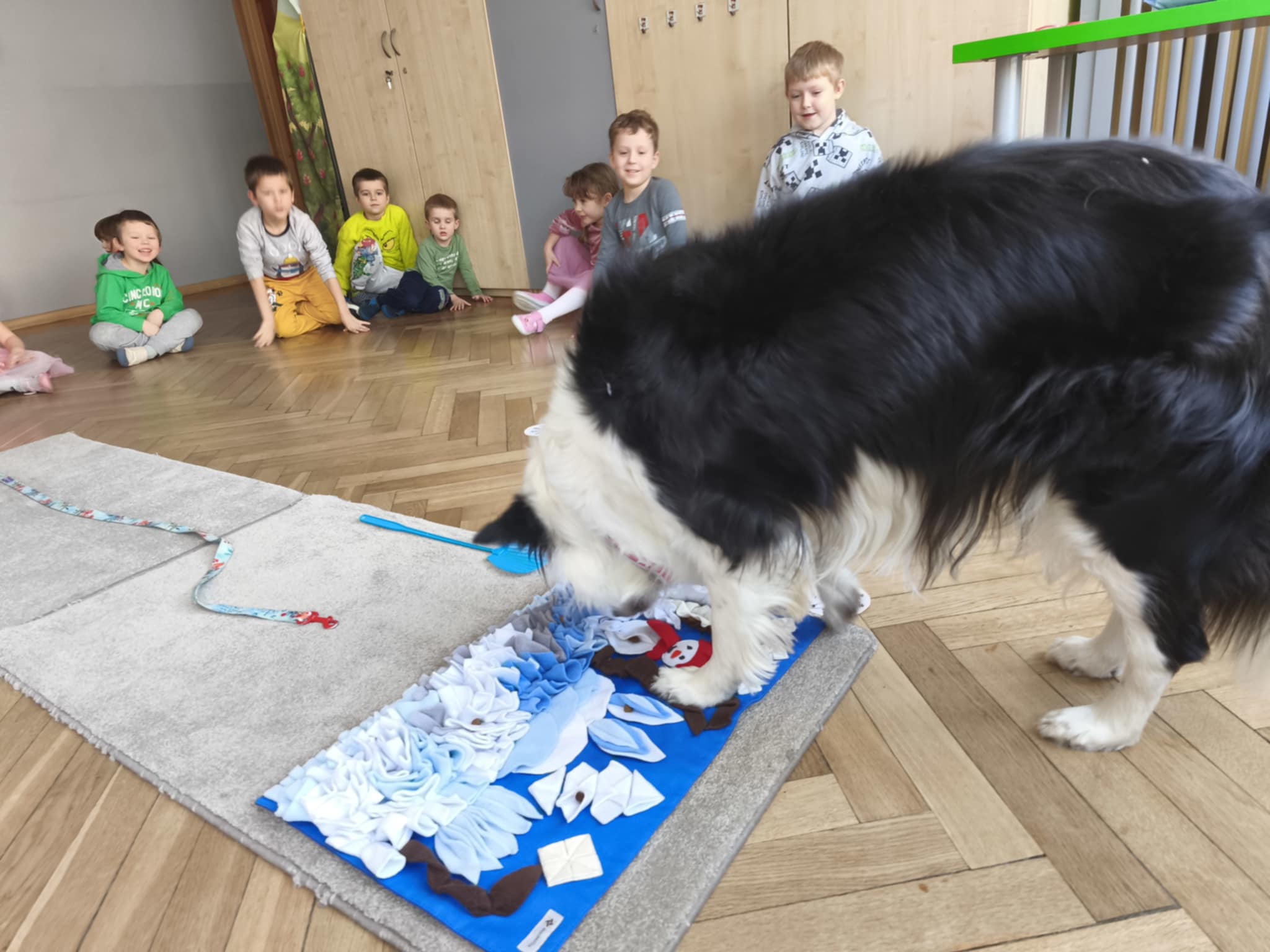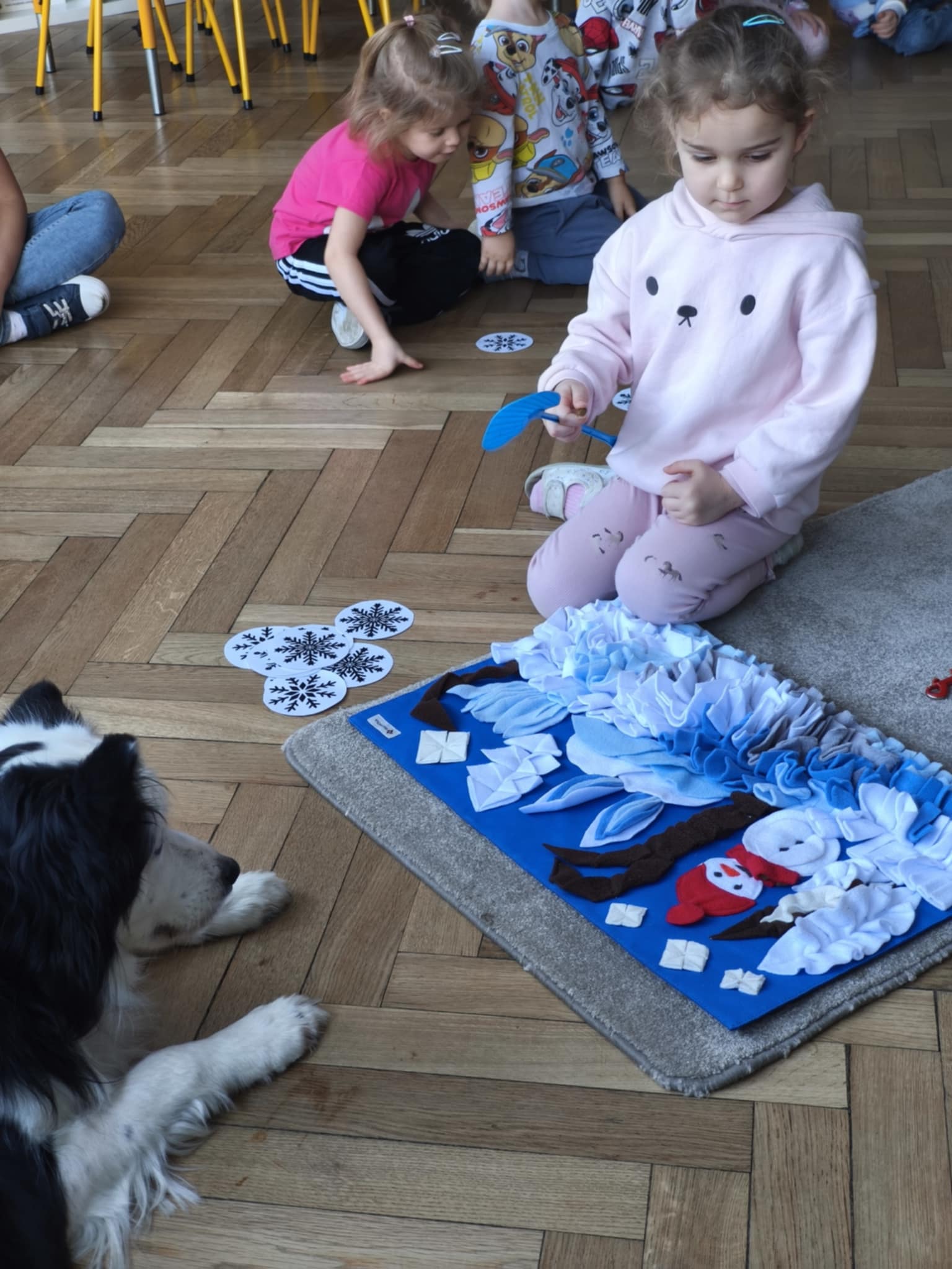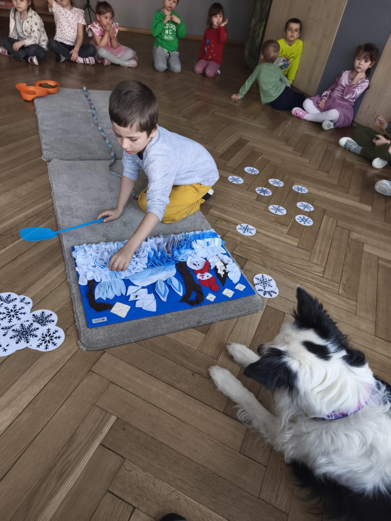 Zima wkoło więc podczas dzisiejszego spotkania z Lili również rozmawialiśmy o zimie a ona bardzo chętnie odpoczywała w towarzystwie dzieci. Dzieci szykowały psu smaczki w macie węchowej według poleceń ukrytych na śnieżynkach, ćwicząc koncentrację i równowagę. Jak zawsze bardzo jej kibicowały aby udało się jej wszystko odszukać. Lili wykazała się nie tylko dobrym węchem ale również umiejętnością pokonywania tunelu :-)