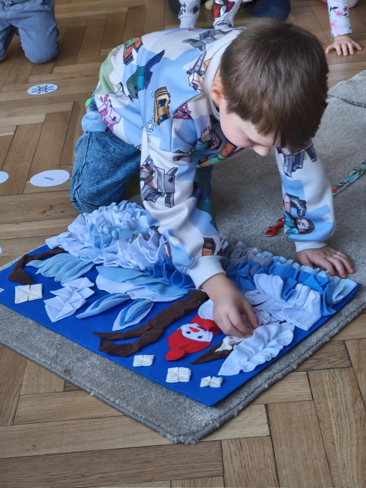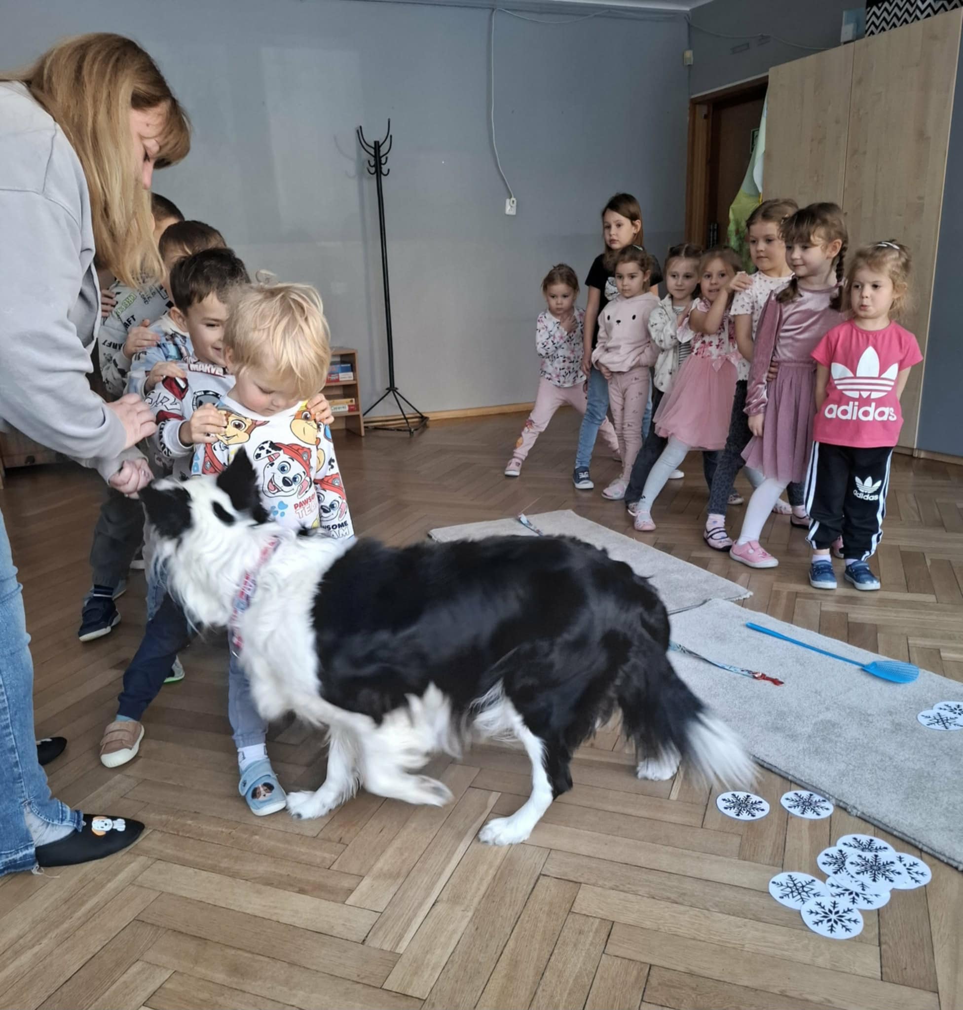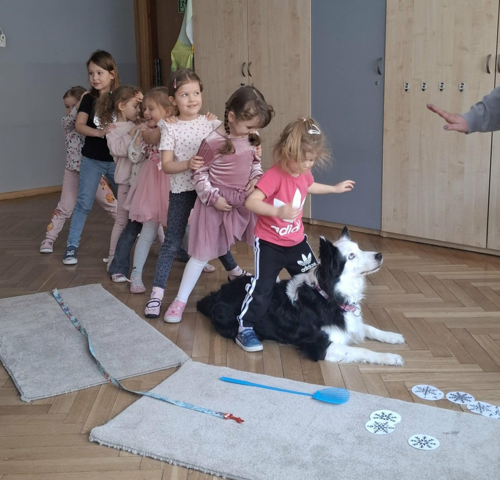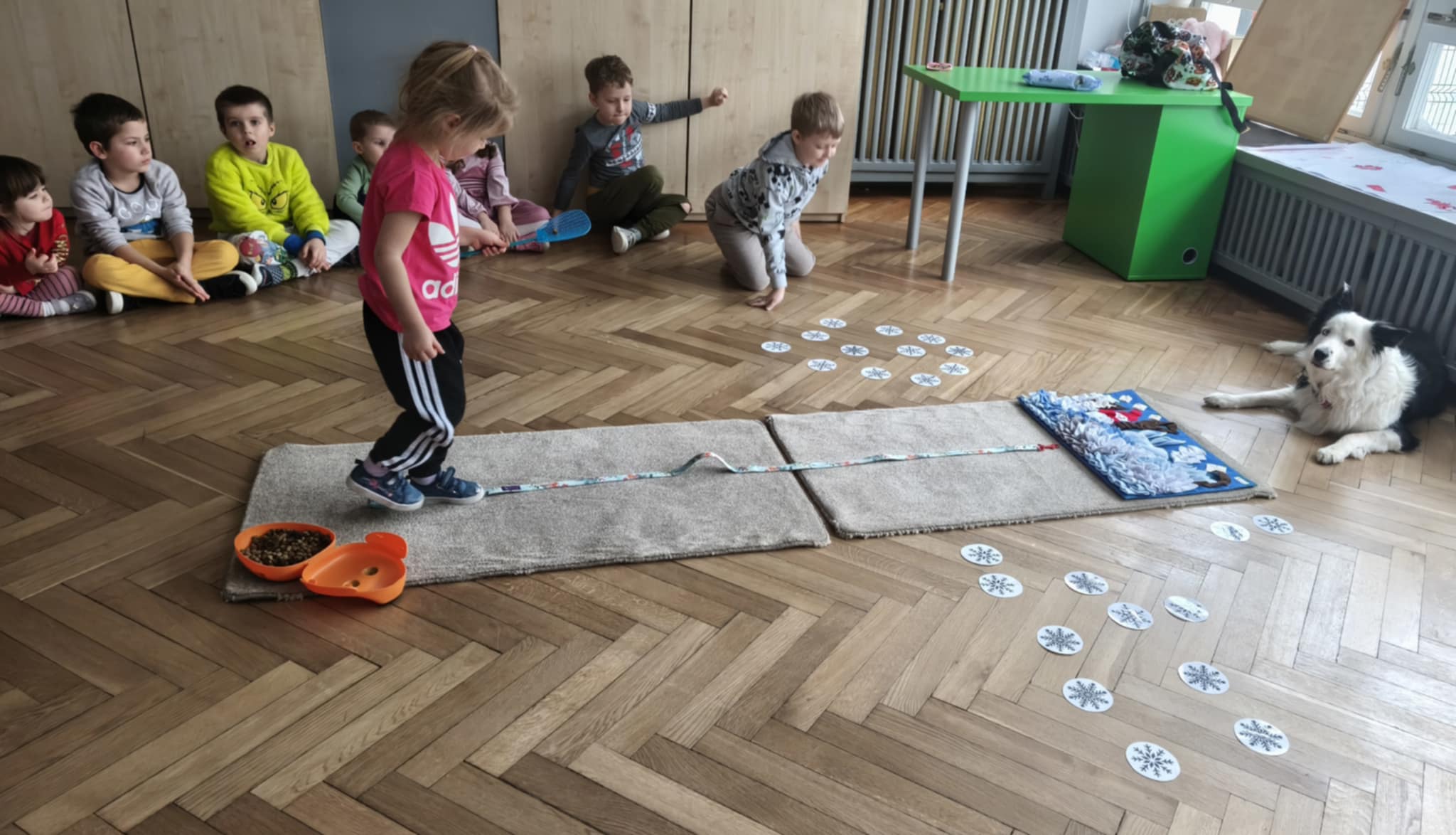 Zima wkoło więc podczas dzisiejszego spotkania z Lili również rozmawialiśmy o zimie a ona bardzo chętnie odpoczywała w towarzystwie dzieci. Dzieci szykowały psu smaczki w macie węchowej według poleceń ukrytych na śnieżynkach, ćwicząc koncentrację i równowagę. Jak zawsze bardzo jej kibicowały aby udało się jej wszystko odszukać. Lili wykazała się nie tylko dobrym węchem ale również umiejętnością pokonywania tunelu :-)