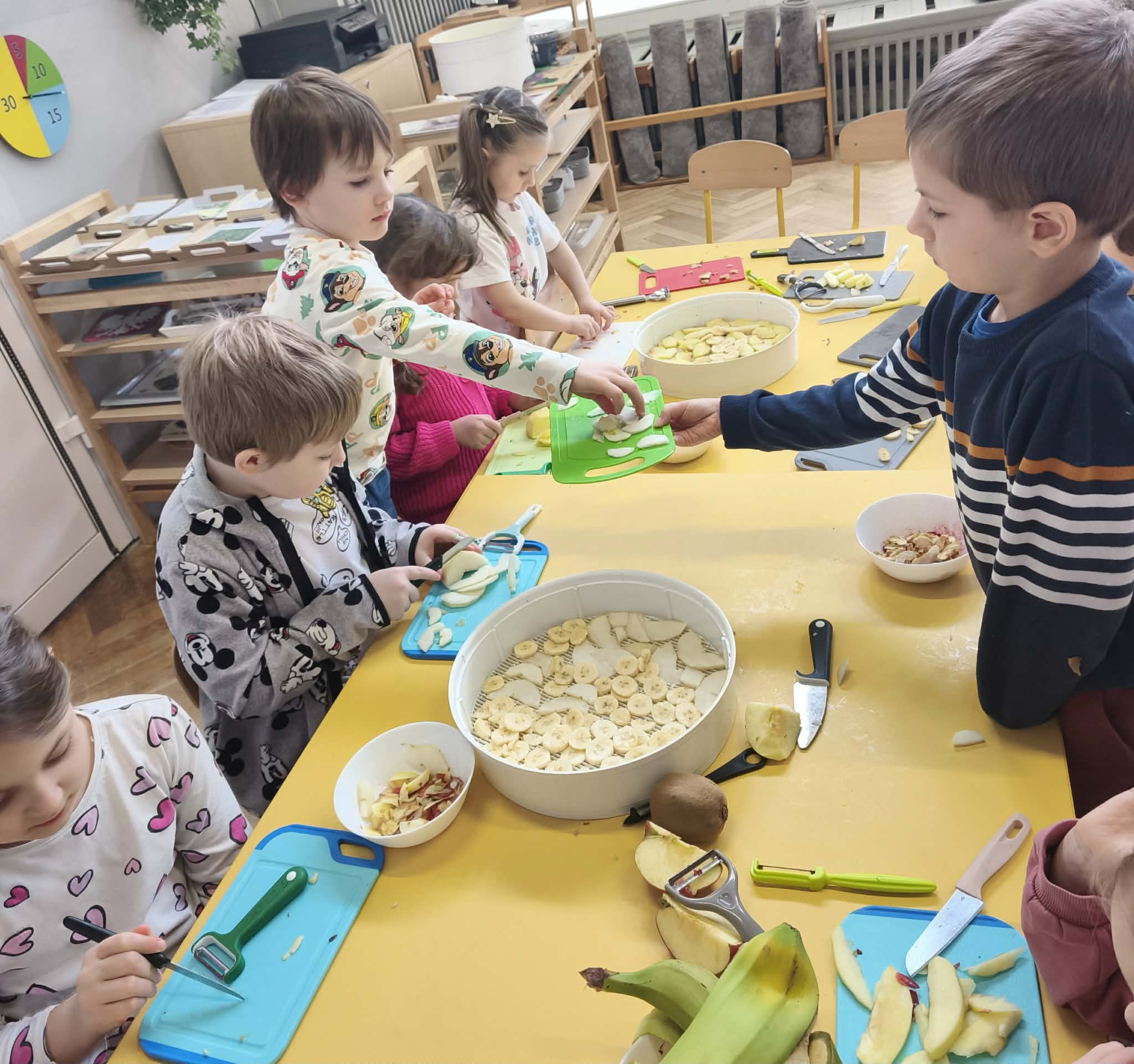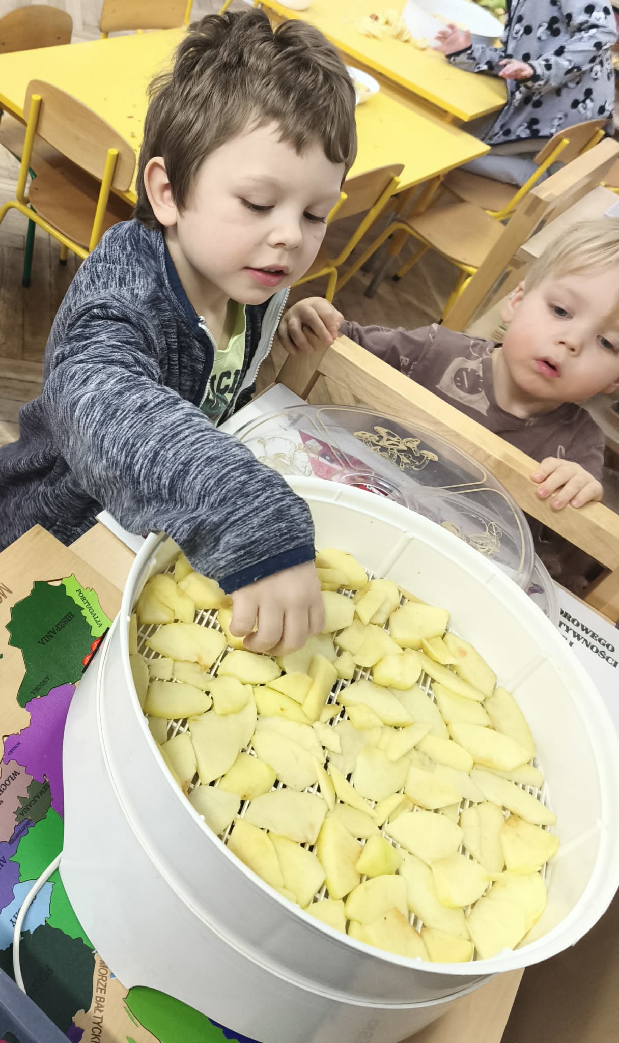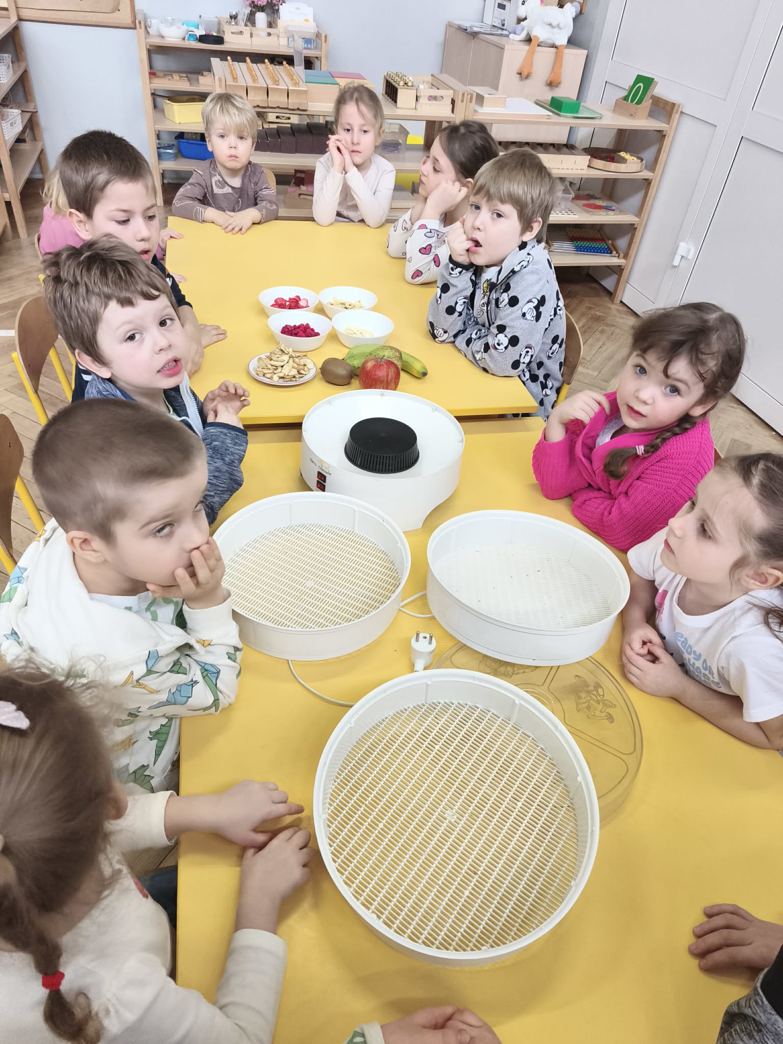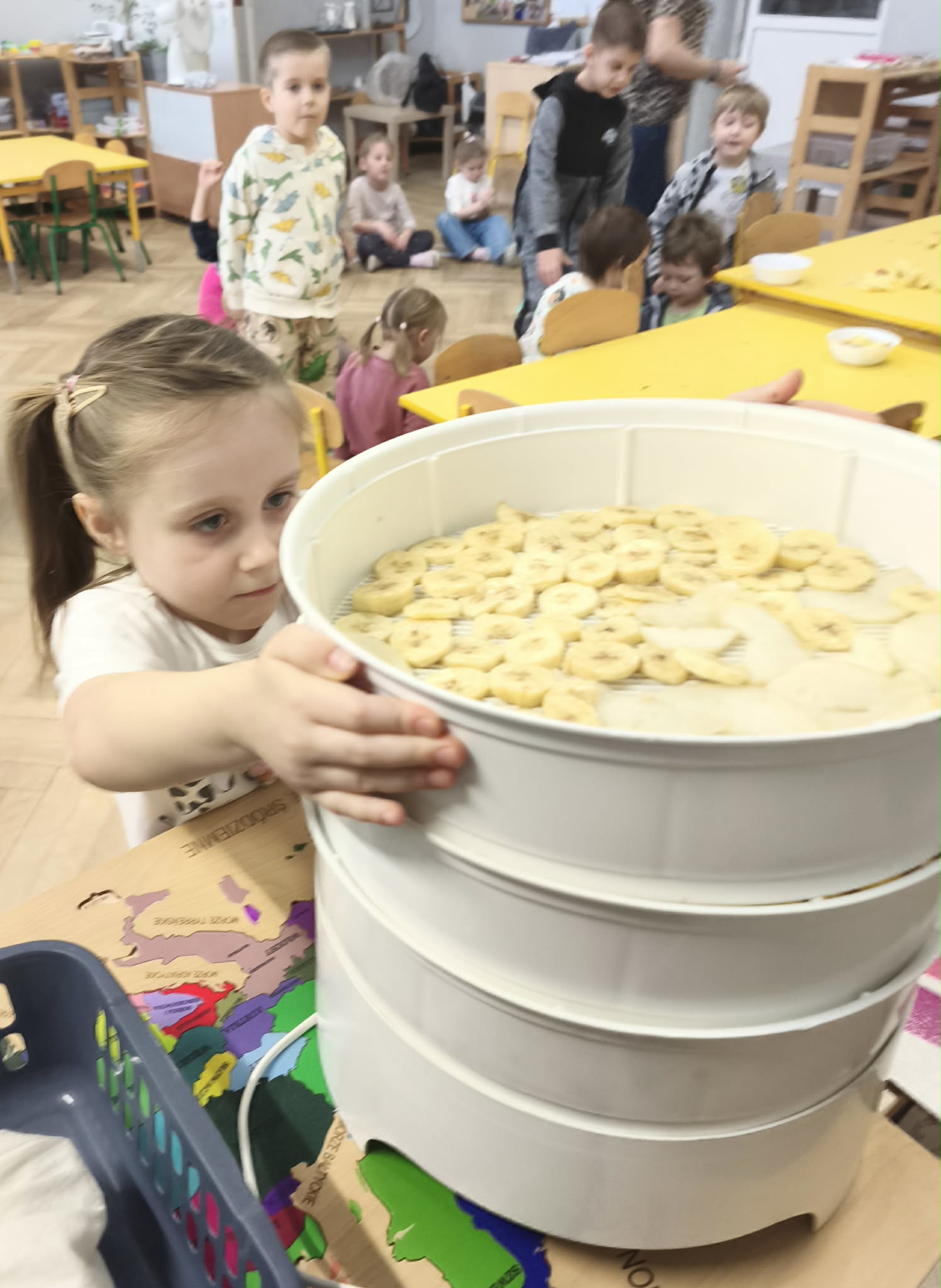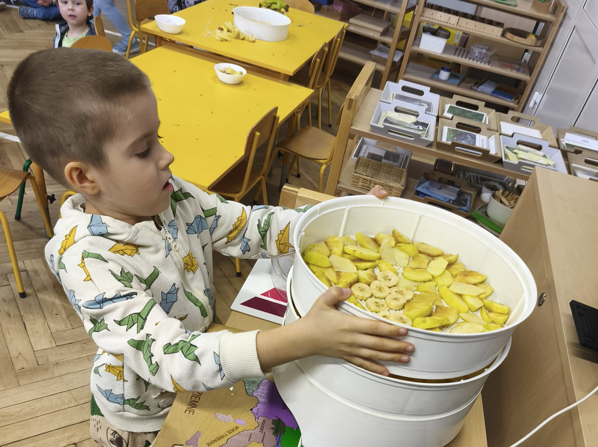 Suszenie owoców w przedszkolu to świetna, edukacyjna zabawa kulinarna ucząca zdrowych nawyków (zdrowe przekąski) i cierpliwości. W naszym działaniu sprawdziła się elektryczna suszarka do żywności. Dzieci poznały zasady jej działania i po obraniu owoców i przygotowaniu ich, układały je na poszczególnych piętrach suszarki. Nie obyło się również bez degustacji (w oczekiwaniu na nasze przekąski) suszonych, truskawek, mali, ananasa i jabłek. Nowe smaki - nowe doświadczenia. Kilka jabłek zostało nawleczone na sznurek do wysuszenia, metodą tradycyjną. Po obserwacji naszych owoców jak się zmieniają, w kolejnym dniu odbyła się degustacja.