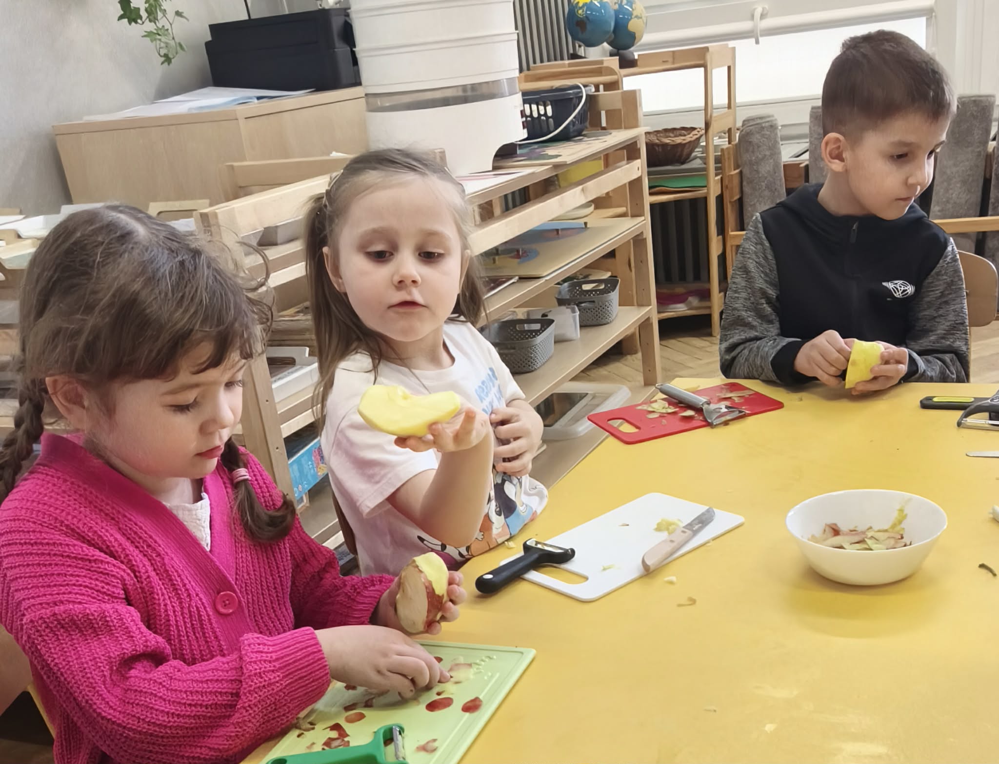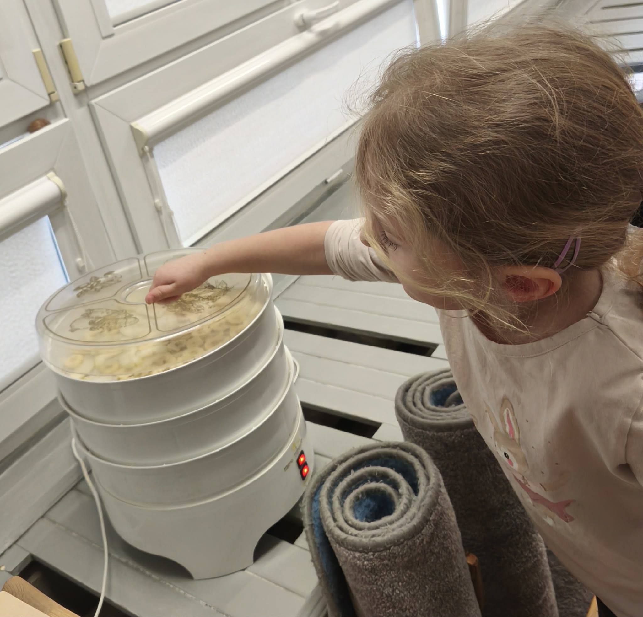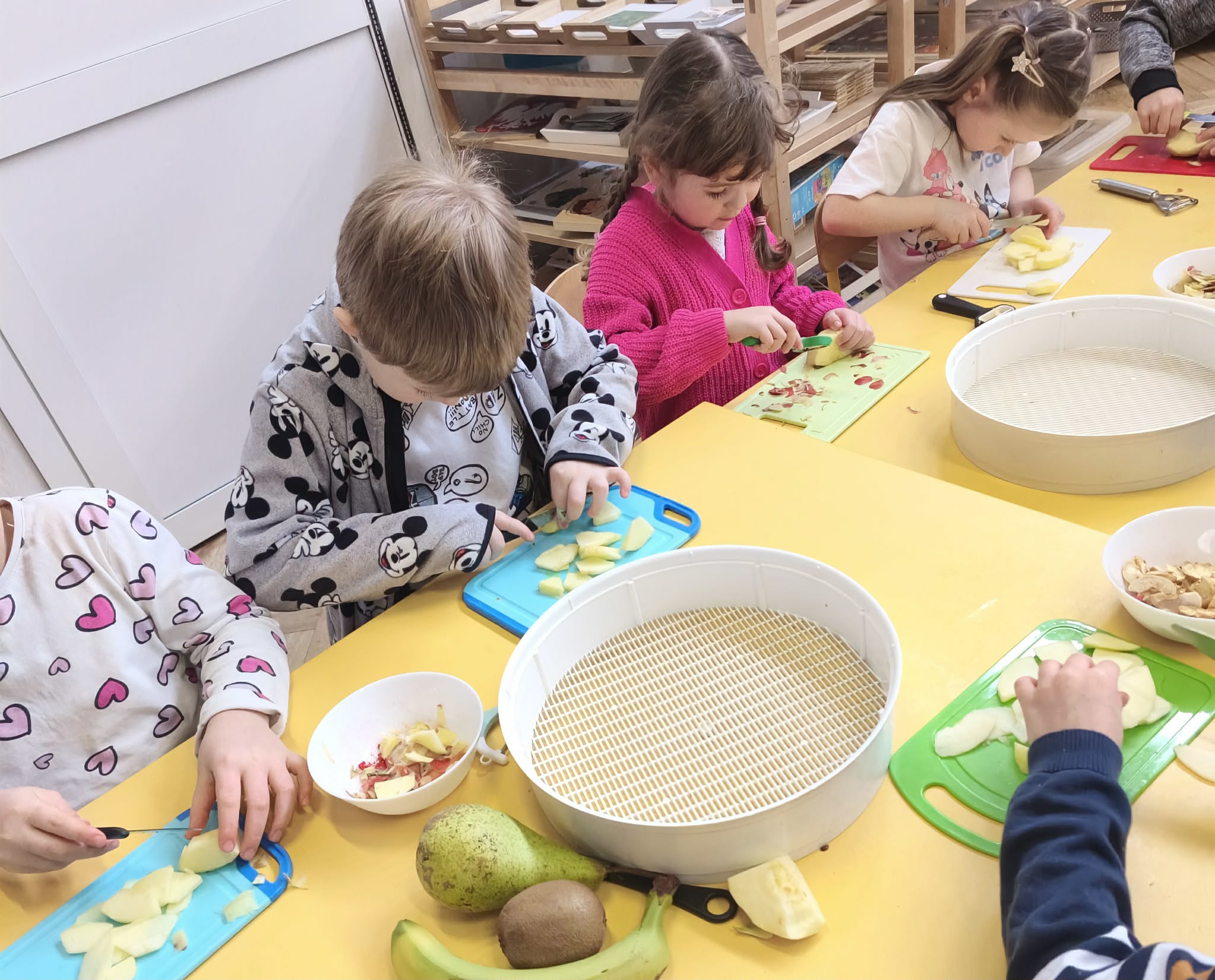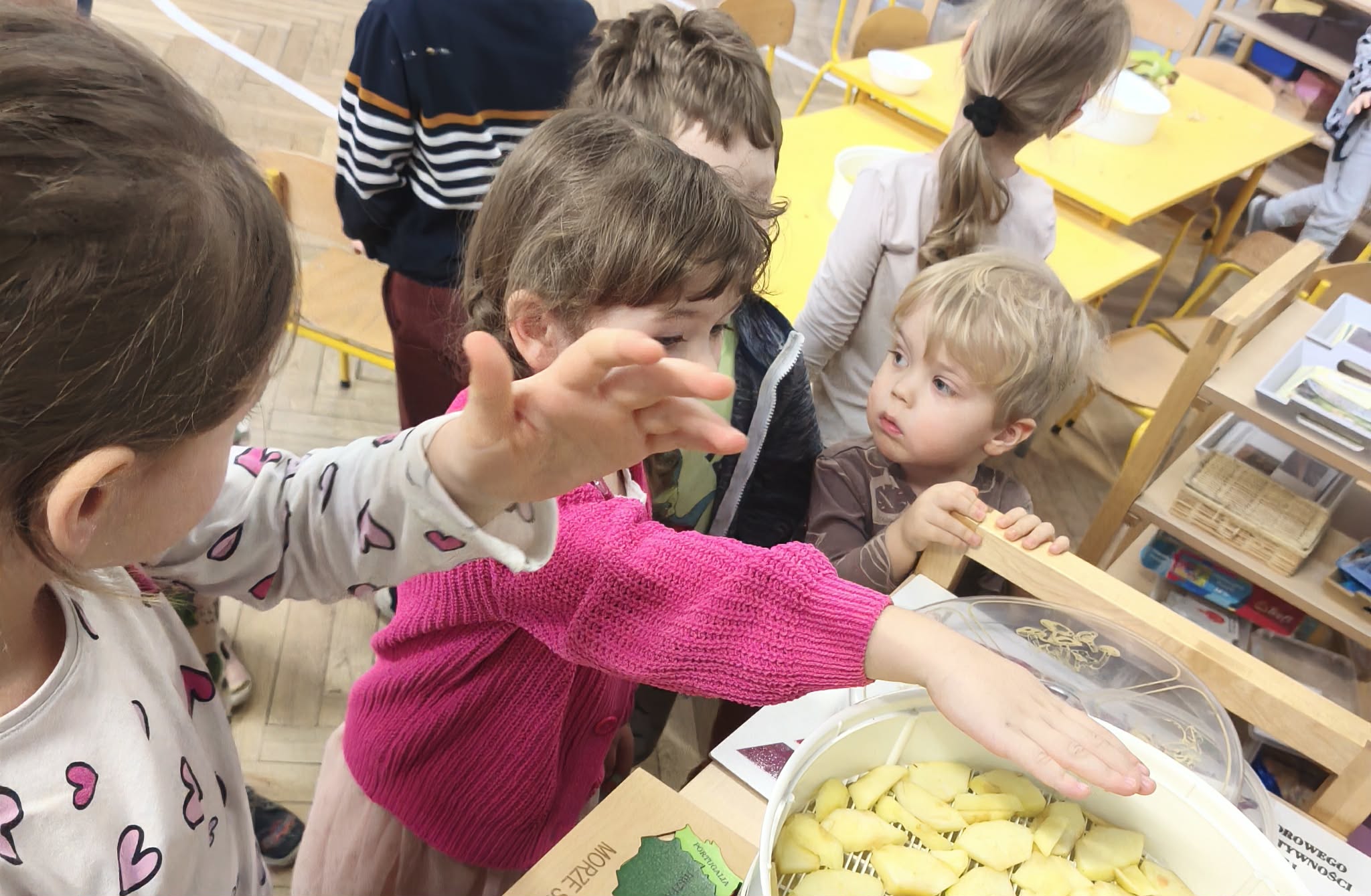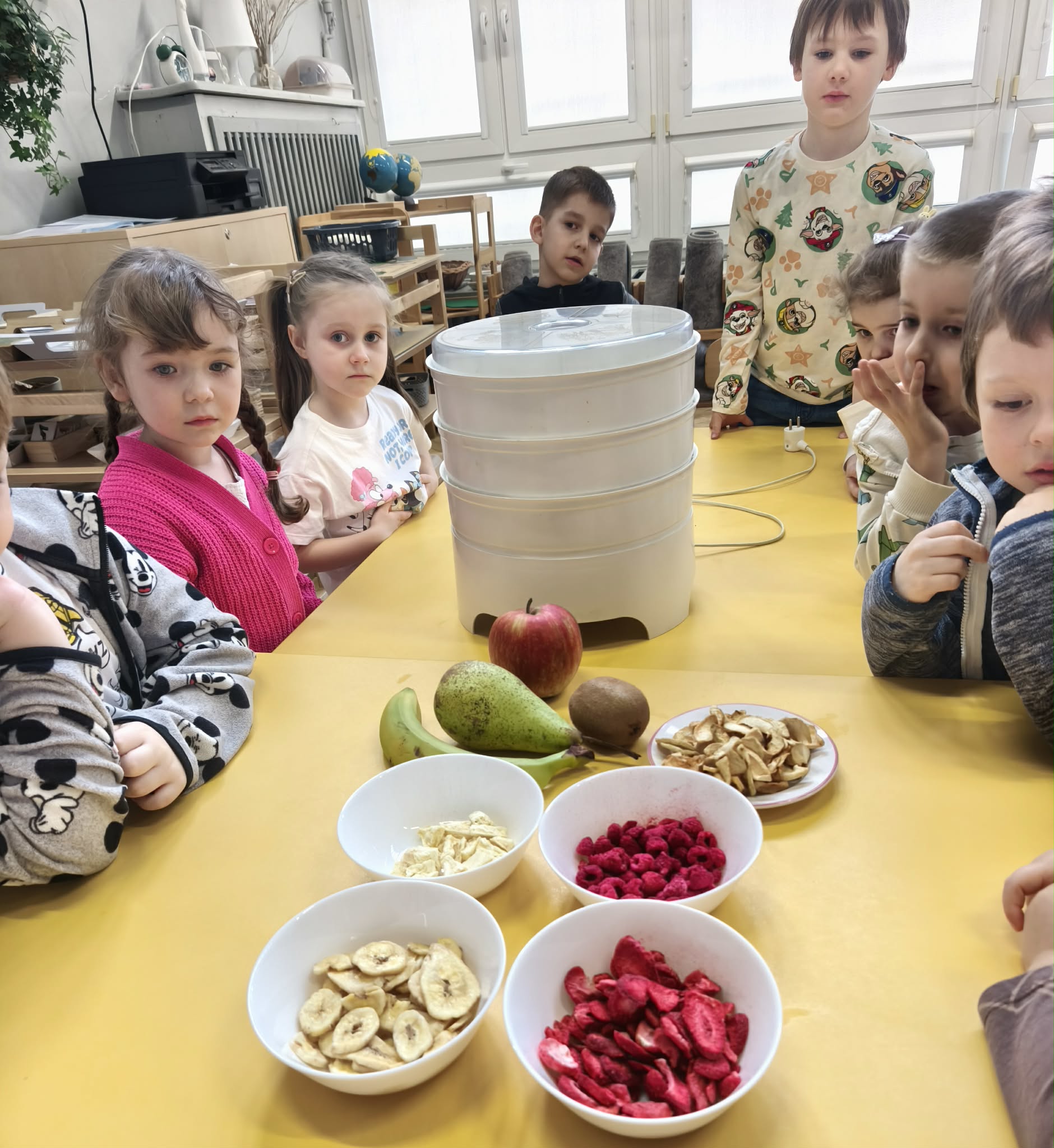 Suszenie owoców w przedszkolu to świetna, edukacyjna zabawa kulinarna ucząca zdrowych nawyków (zdrowe przekąski) i cierpliwości. W naszym działaniu sprawdziła się elektryczna suszarka do żywności. Dzieci poznały zasady jej działania i po obraniu owoców i przygotowaniu ich, układały je na poszczególnych piętrach suszarki. Nie obyło się również bez degustacji (w oczekiwaniu na nasze przekąski) suszonych, truskawek, mali, ananasa i jabłek. Nowe smaki - nowe doświadczenia. Kilka jabłek zostało nawleczone na sznurek do wysuszenia, metodą tradycyjną. Po obserwacji naszych owoców jak się zmieniają, w kolejnym dniu odbyła się degustacja.