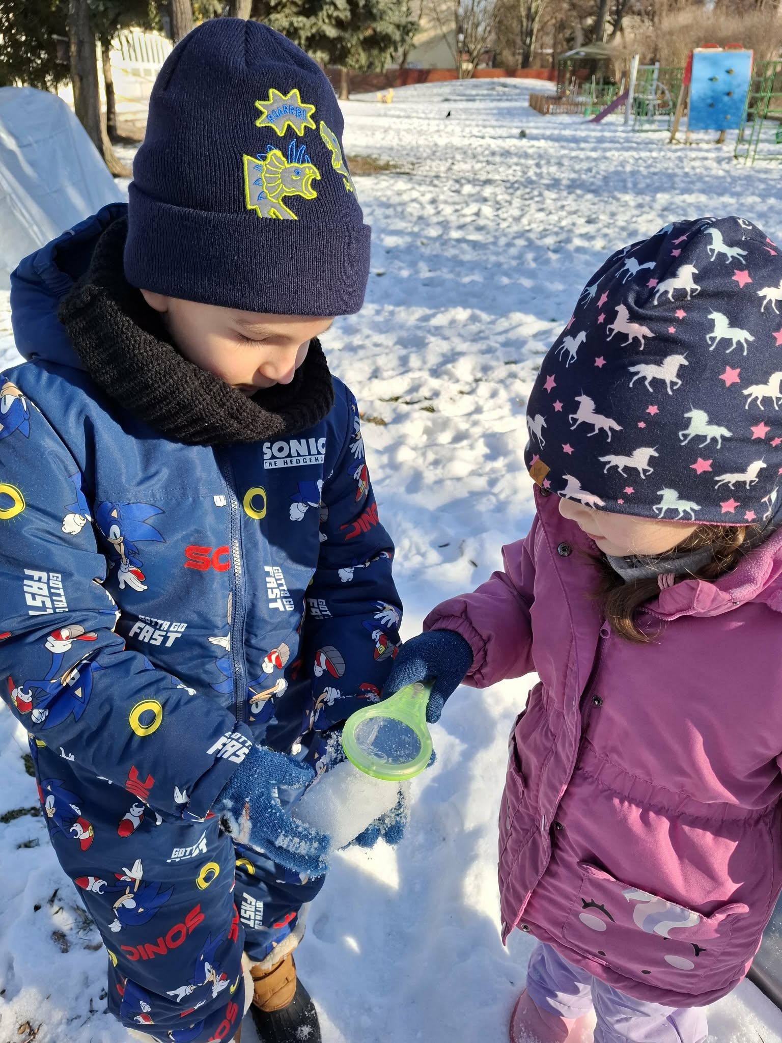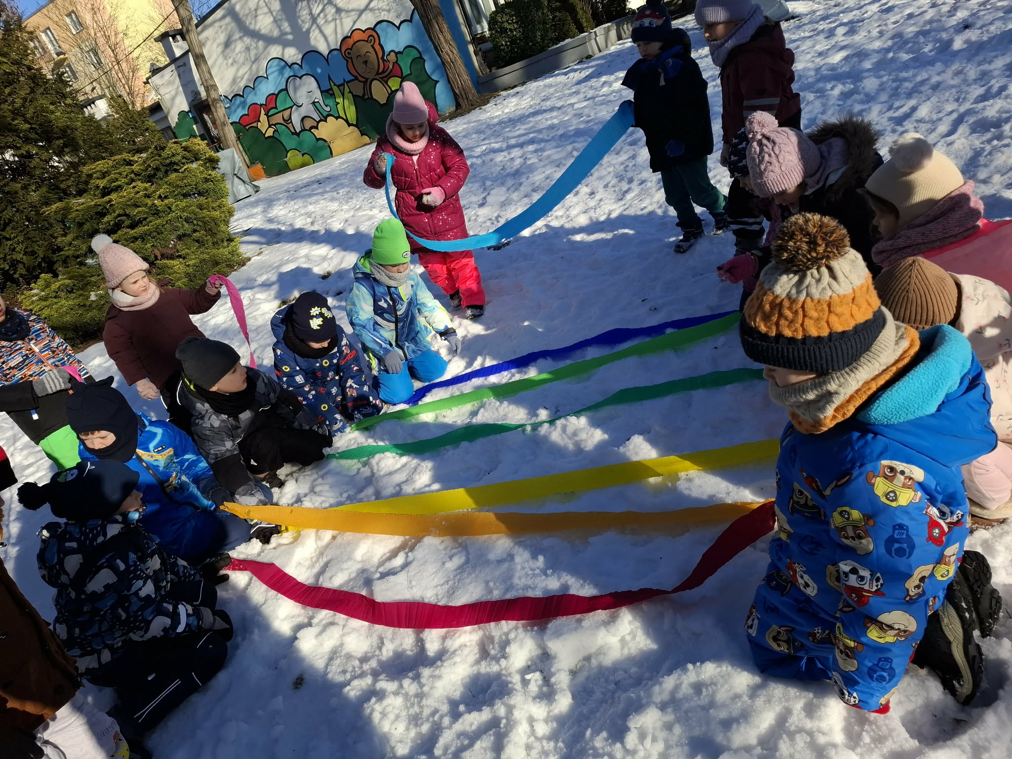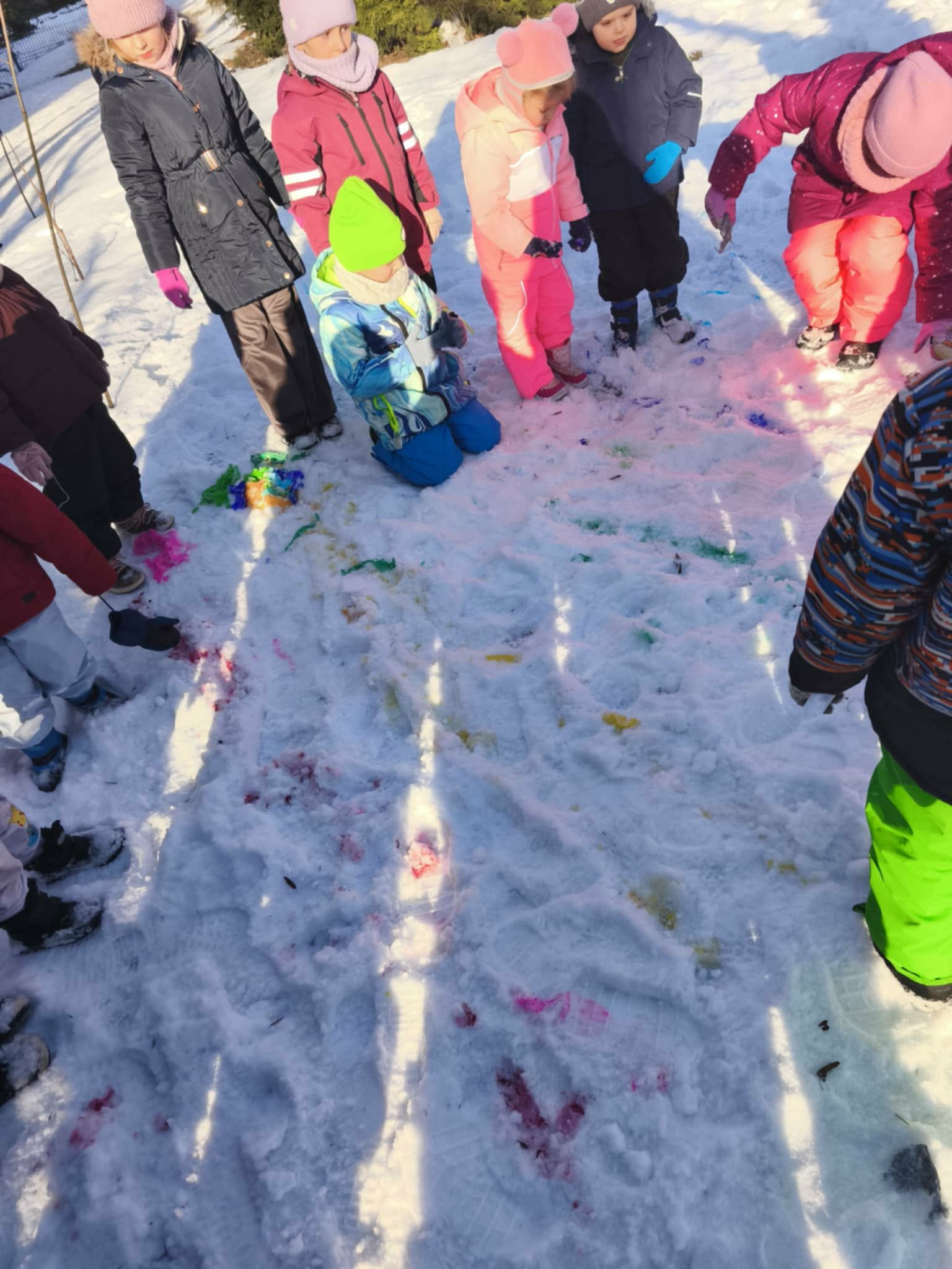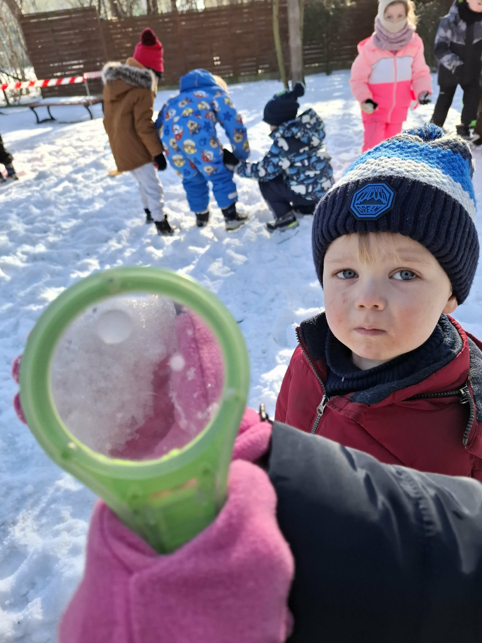 Nasze ostanie wyjście do ogrodu oprócz super zabawy dało dzieciom możliwość poznawanie świata poprzez bezpośrednią obserwację, zadania do wykonania i doświadczanie. Dzieci pracowały w parach i za pomocą lup obserwowały śnieg. Opisywały to, co widzą – kształty, kolory i strukturę płatków. Następnie wspólnie farbowaliśmy śnieg przy użyciu bibuły, tworząc tęczę. Zajęcia sprawiły dzieciom dużo radości i były okazją do rozwijania spostrzegawczości oraz ciekawości świata. Nie zabrakło również swobodnej zabawy na śniegu.