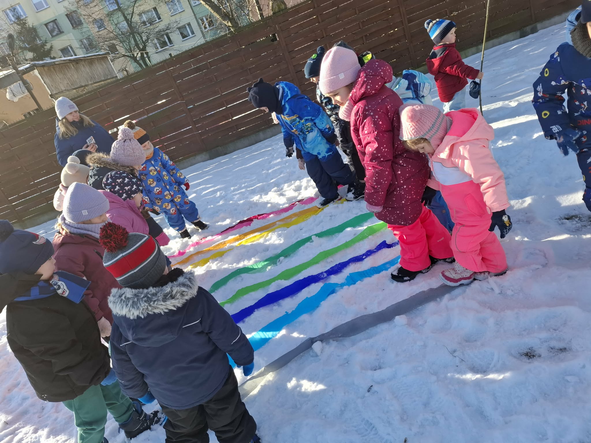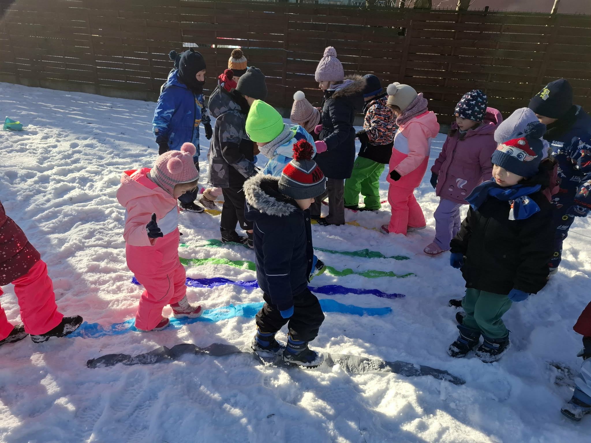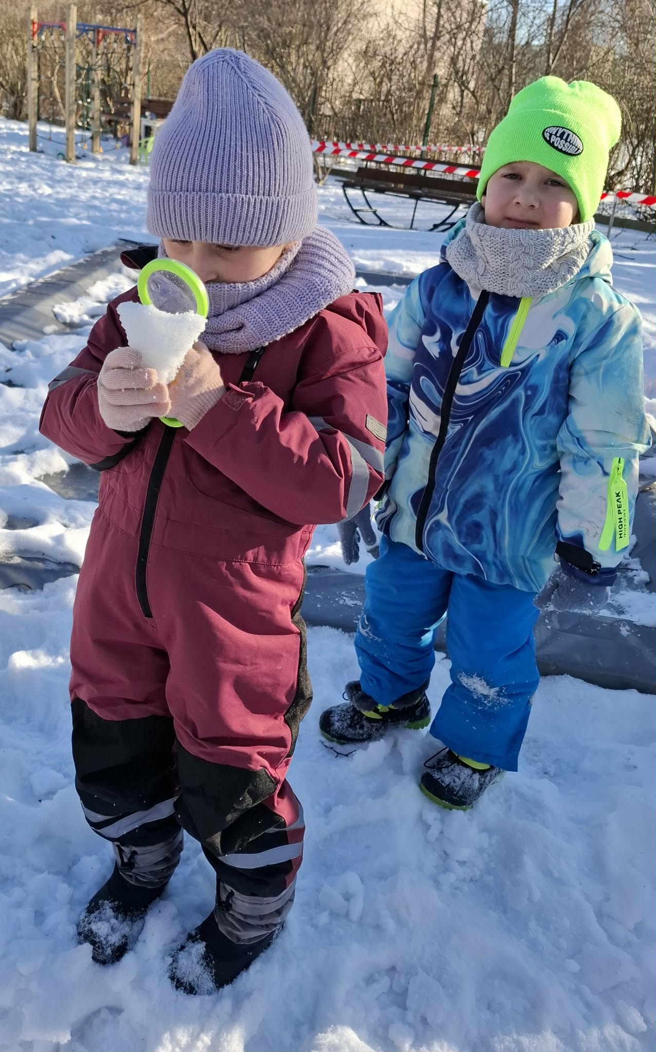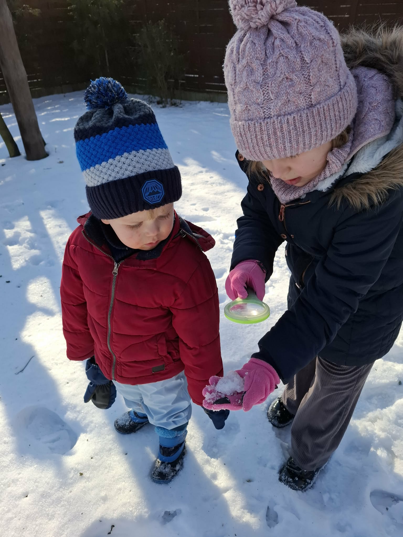 Nasze ostanie wyjście do ogrodu oprócz super zabawy dało dzieciom możliwość poznawanie świata poprzez bezpośrednią obserwację, zadania do wykonania i doświadczanie. Dzieci pracowały w parach i za pomocą lup obserwowały śnieg. Opisywały to, co widzą – kształty, kolory i strukturę płatków. Następnie wspólnie farbowaliśmy śnieg przy użyciu bibuły, tworząc tęczę. Zajęcia sprawiły dzieciom dużo radości i były okazją do rozwijania spostrzegawczości oraz ciekawości świata. Nie zabrakło również swobodnej zabawy na śniegu.