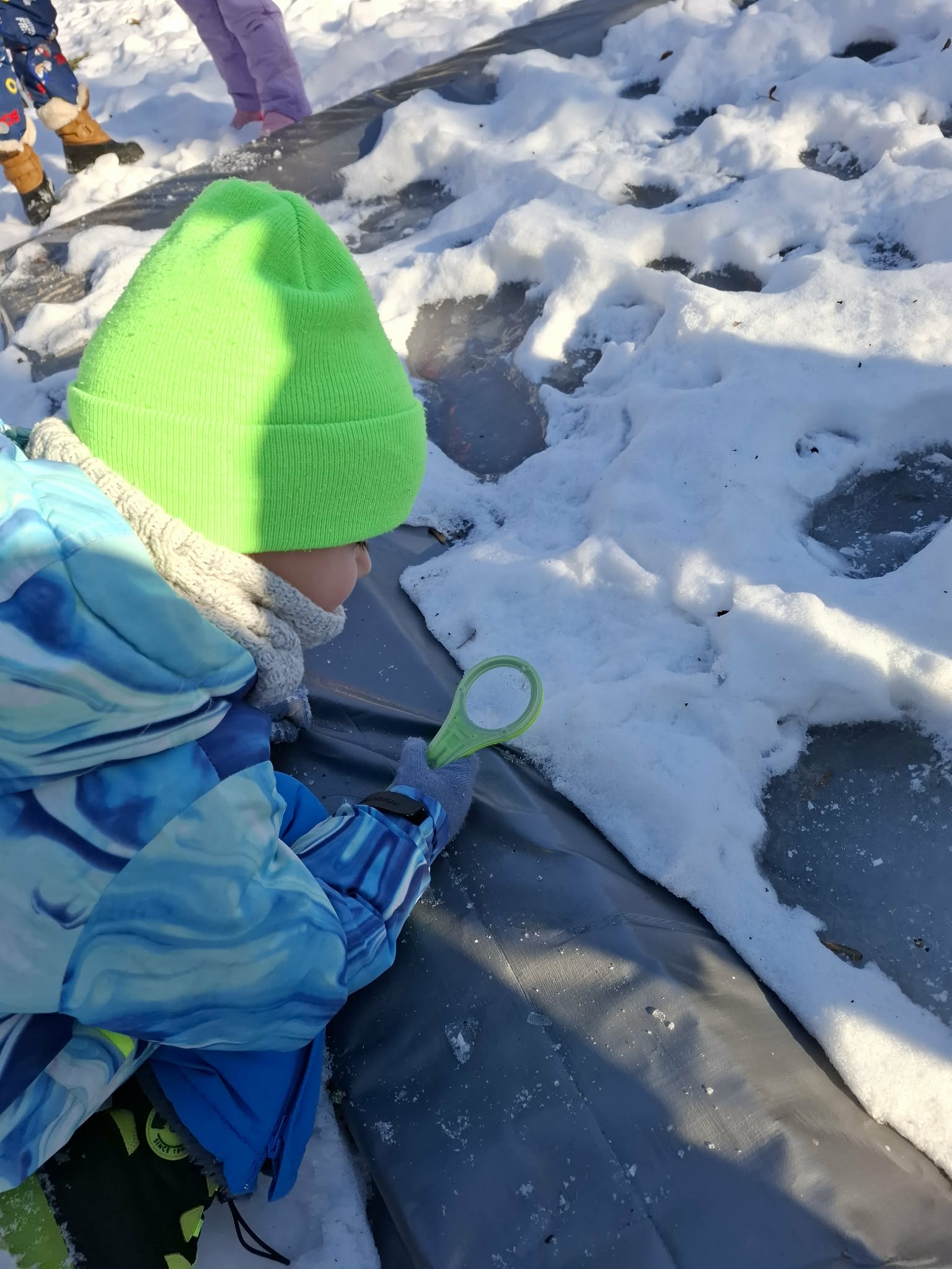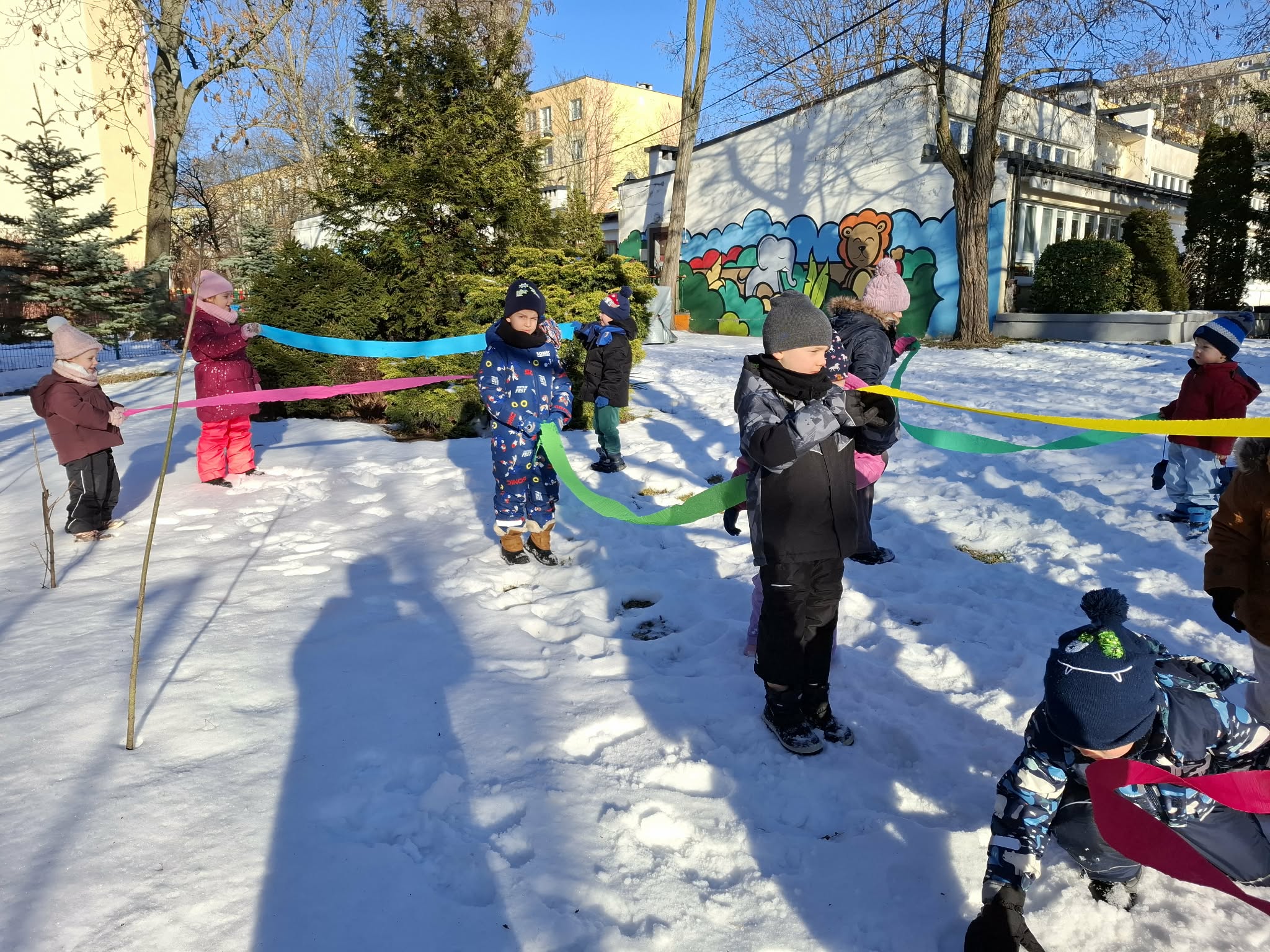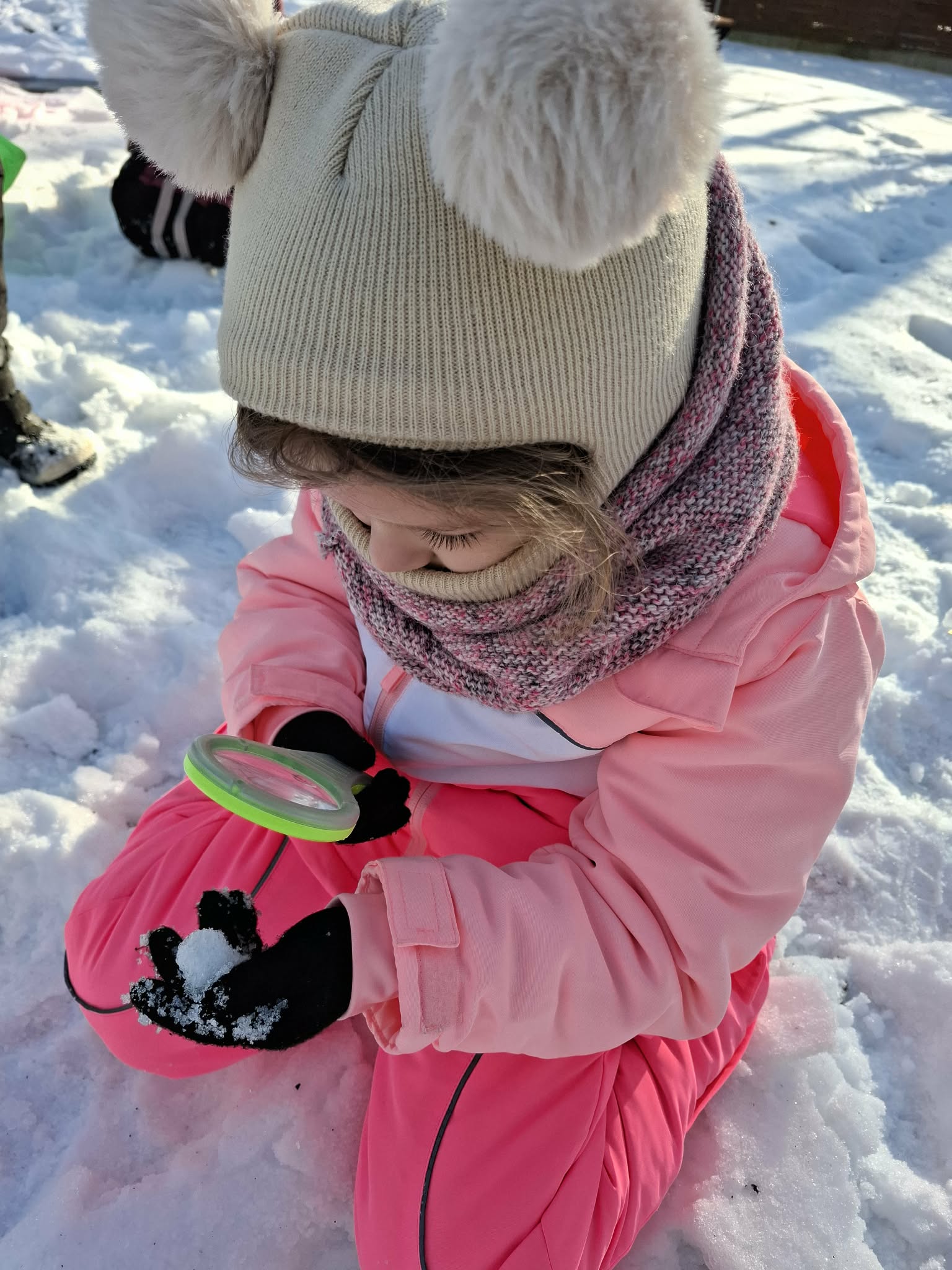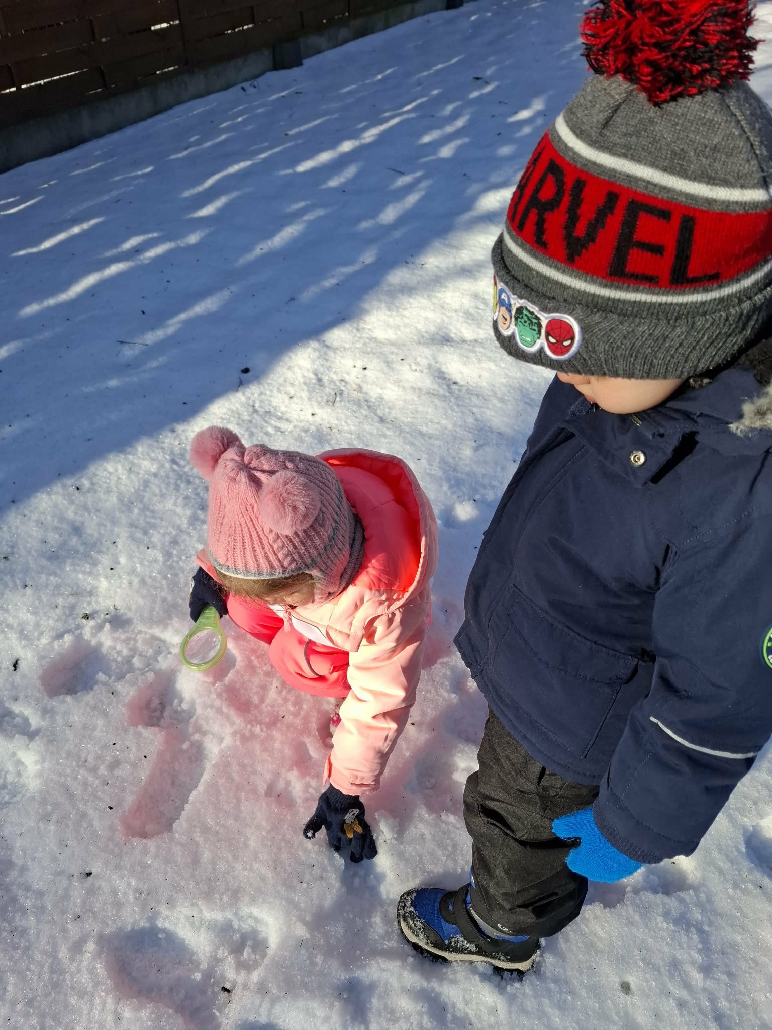 Nasze ostanie wyjście do ogrodu oprócz super zabawy dało dzieciom możliwość poznawanie świata poprzez bezpośrednią obserwację, zadania do wykonania i doświadczanie. Dzieci pracowały w parach i za pomocą lup obserwowały śnieg. Opisywały to, co widzą – kształty, kolory i strukturę płatków. Następnie wspólnie farbowaliśmy śnieg przy użyciu bibuły, tworząc tęczę. Zajęcia sprawiły dzieciom dużo radości i były okazją do rozwijania spostrzegawczości oraz ciekawości świata. Nie zabrakło również swobodnej zabawy na śniegu.