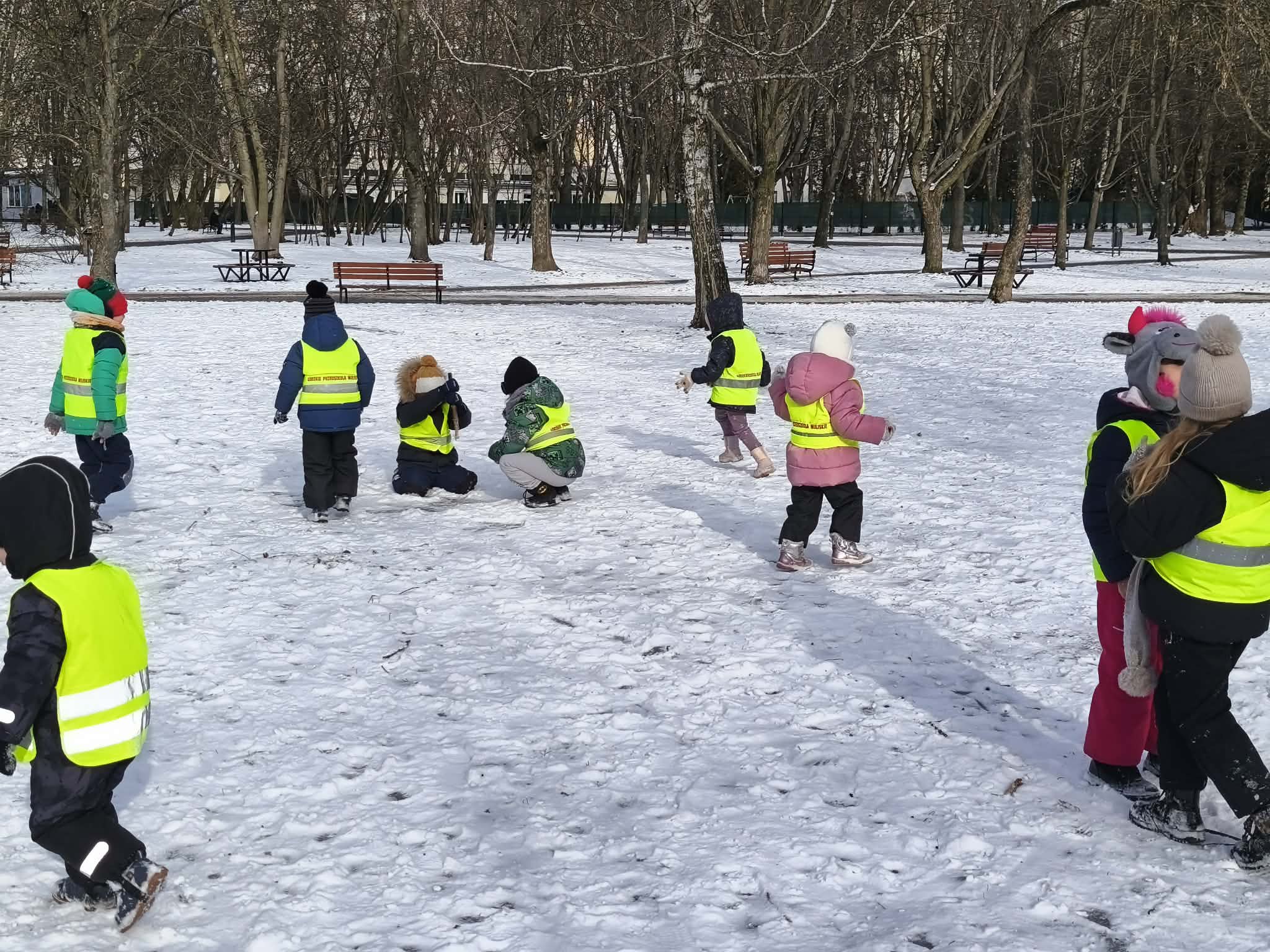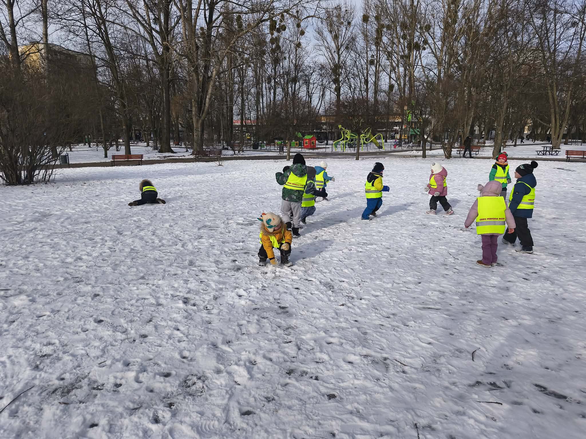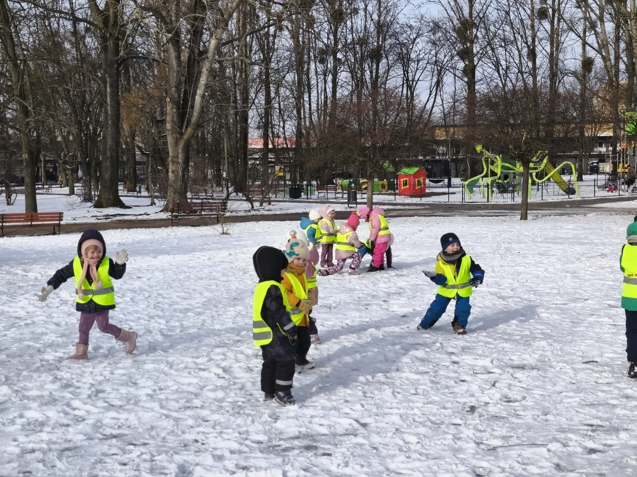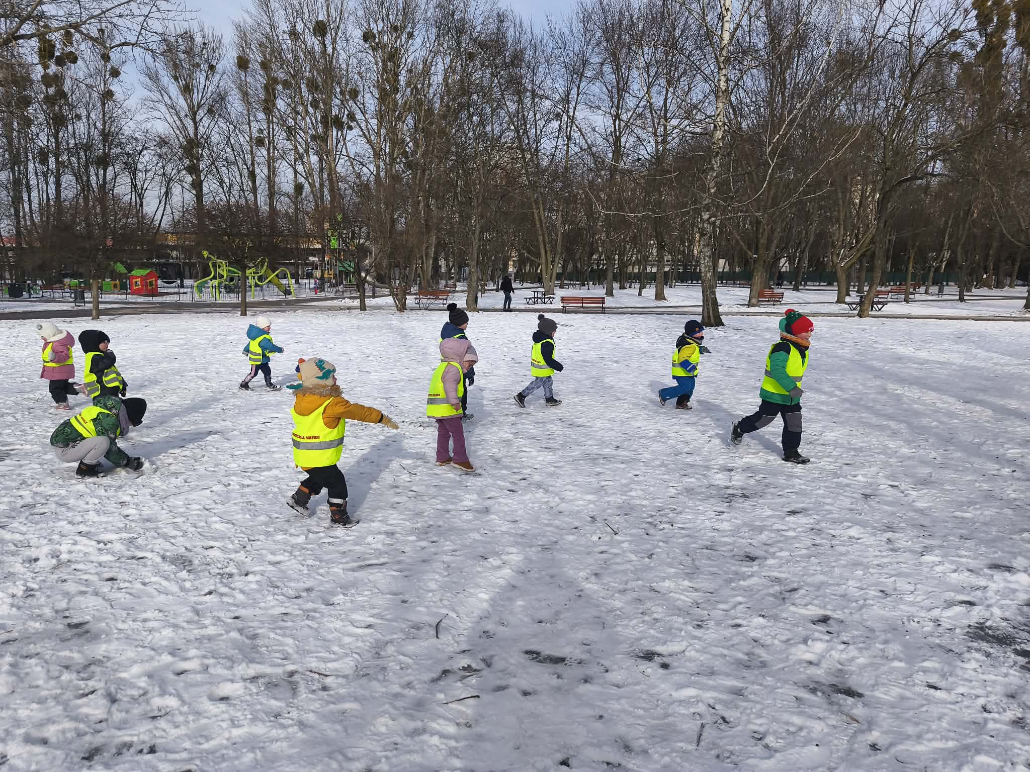 W piątek dzieci wybrały się na zimowy spacer na pobliski Skwer Św. Maksymiliana Kolbego. Leżący śnieg na trawie stał się idealnym placem zabaw – dzieci z radością rzucały się śnieżkami i „czarowały” na ziemi śnieżne aniołki. Poza beztroską zabawą był to też czas ważnych obserwacji przyrodniczych. Małym odkrywcom udało się wypatrzeć na drzewie opuszczone gniazdo oraz gęste kępy zielonej jemioły, która pięknie wyróżniała się na tle zimowego krajobrazu. Pełni wrażeń i rześkiego powietrza wróciliśmy do przedszkola z uśmiechami na twarzach.