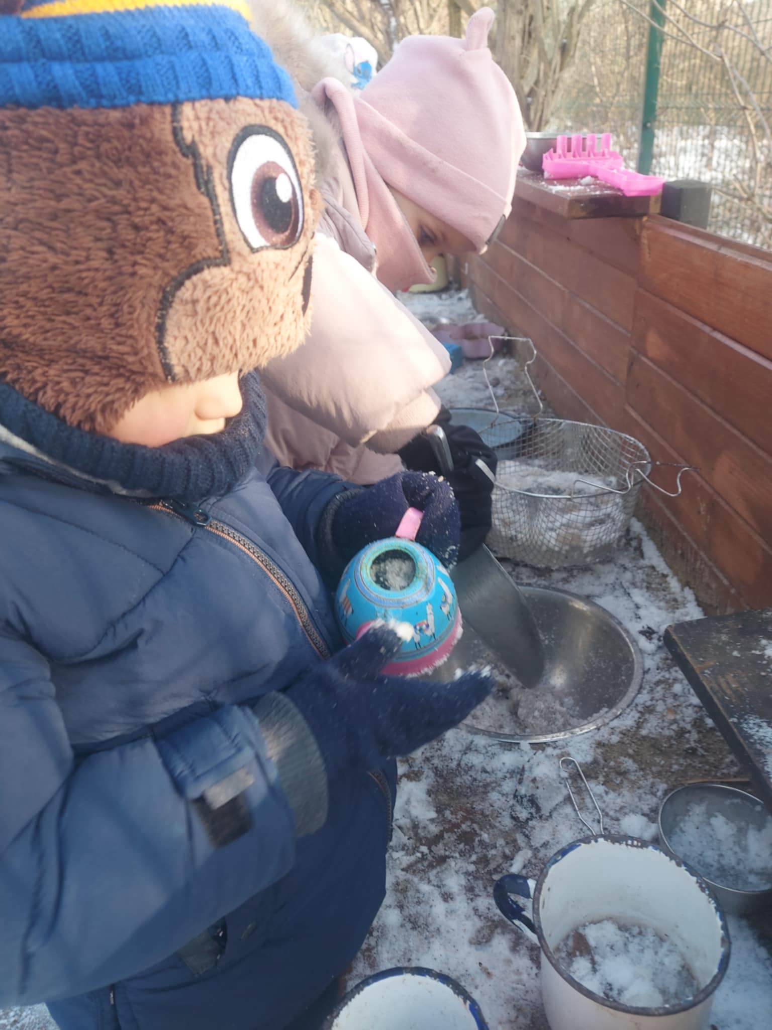 Korzystając z zimowej aury, dzieci wybrały się do ogrodu przedszkolnego, gdzie czekało na nie mnóstwo radości i wspaniałej zabawy. Dużą atrakcją były zjazdy z górki na sankach, które dostarczyły dzieciom wiele emocji, śmiechu i wrażeń. Nie zabrakło również twórczych zabaw w kuchni błotnej , czy tworzenia budowli ze śniegu i brył lodowych.