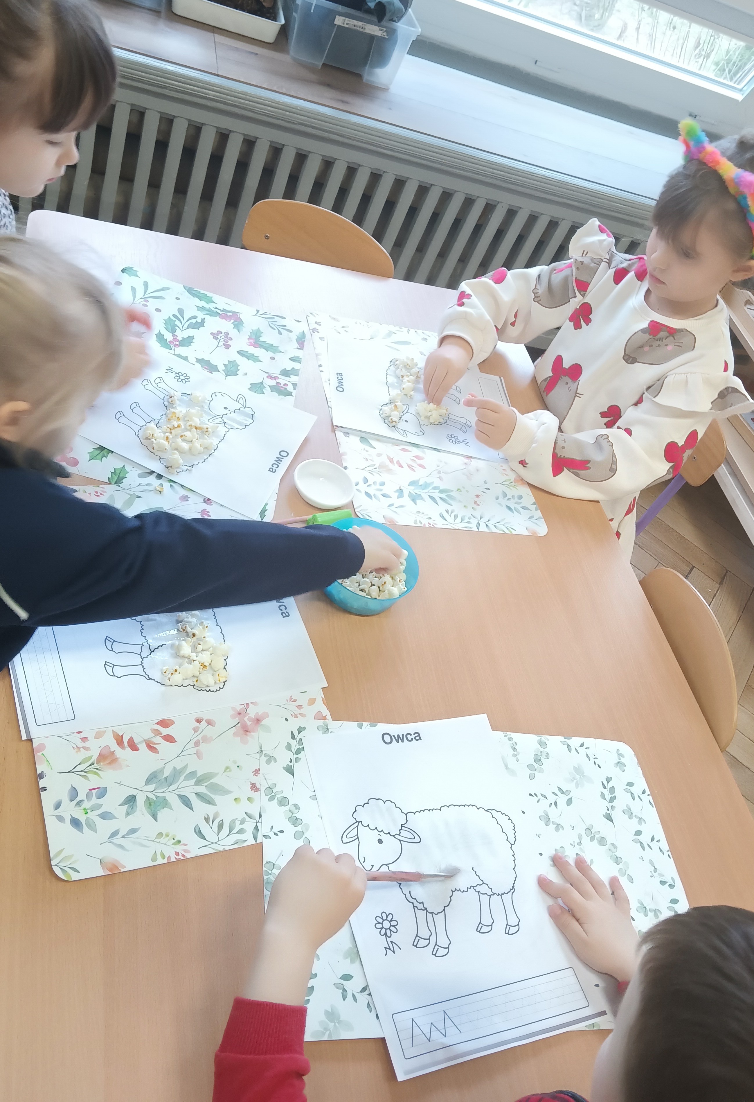 W czwartek poznawaliśmy zwierzęta z wiejskiej zagrody i ich nazwy w języku angielskim. Później dzieci ozdabiały owce popcornem.